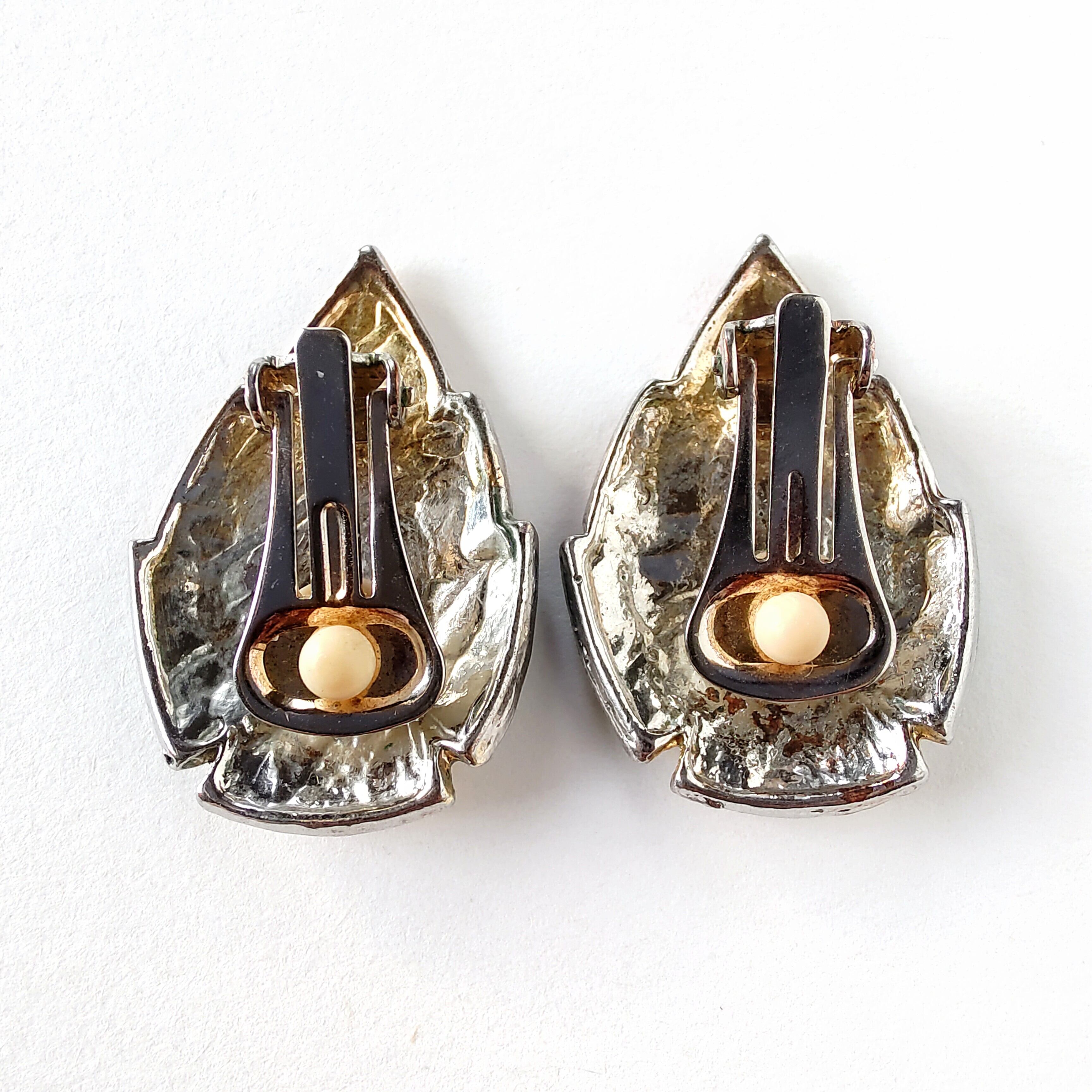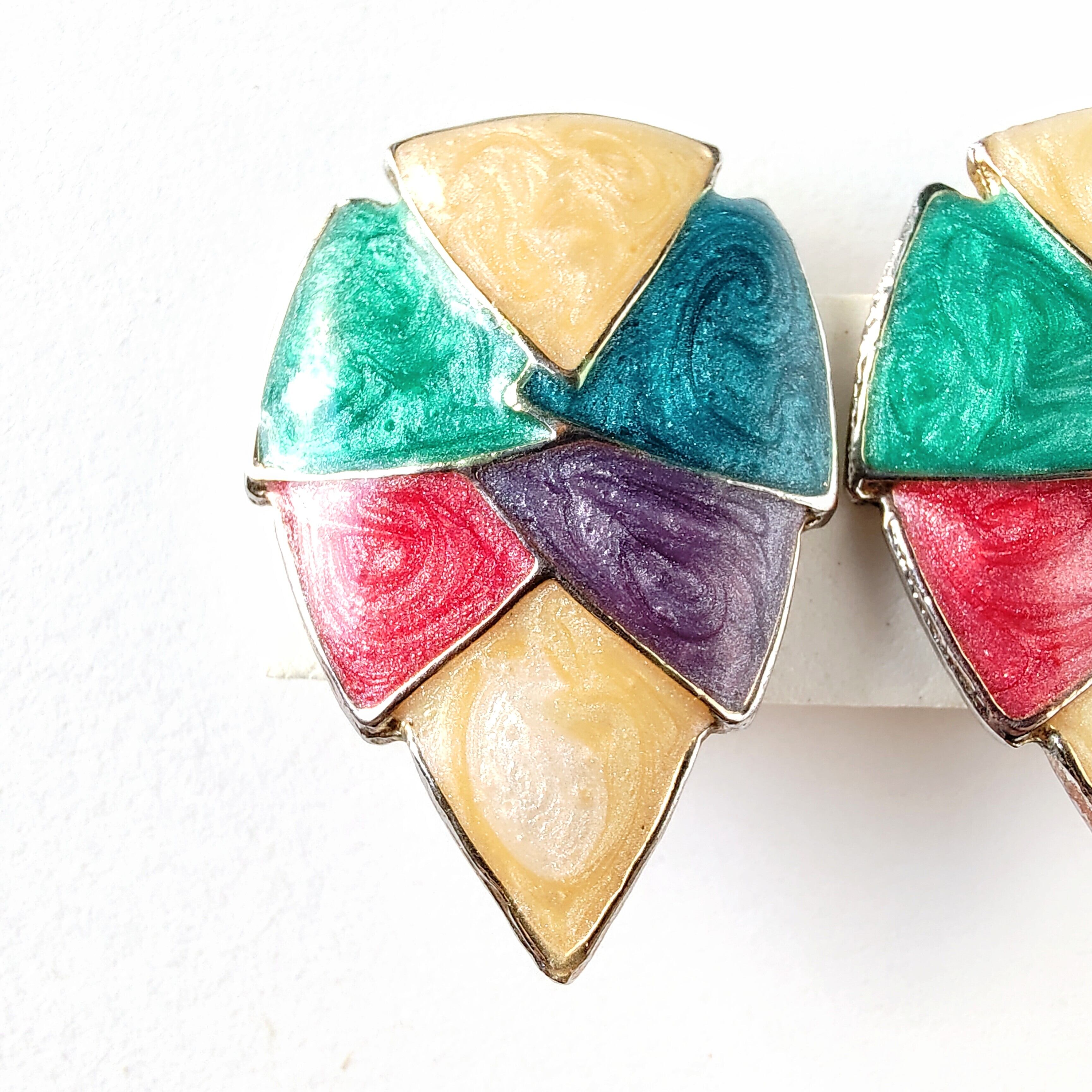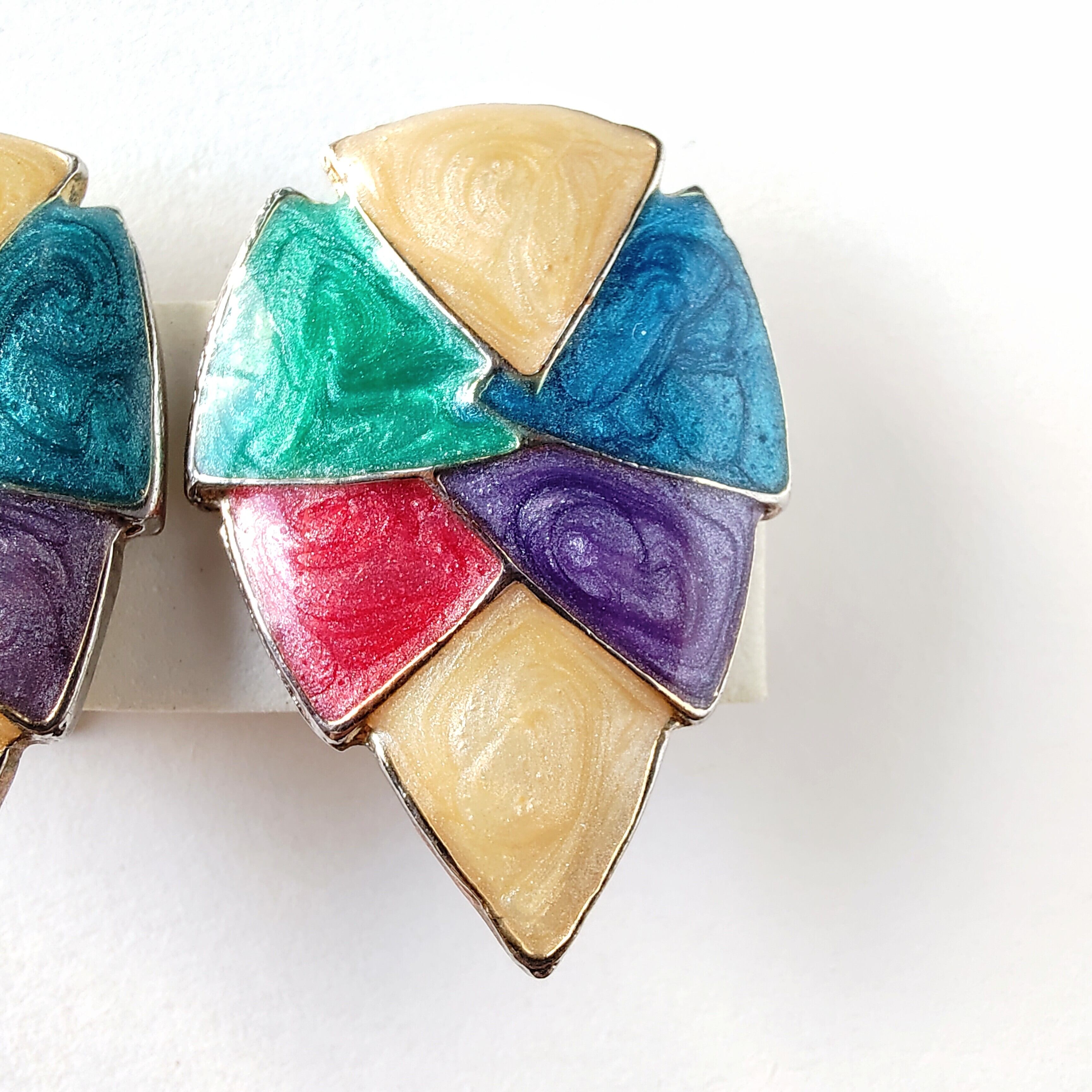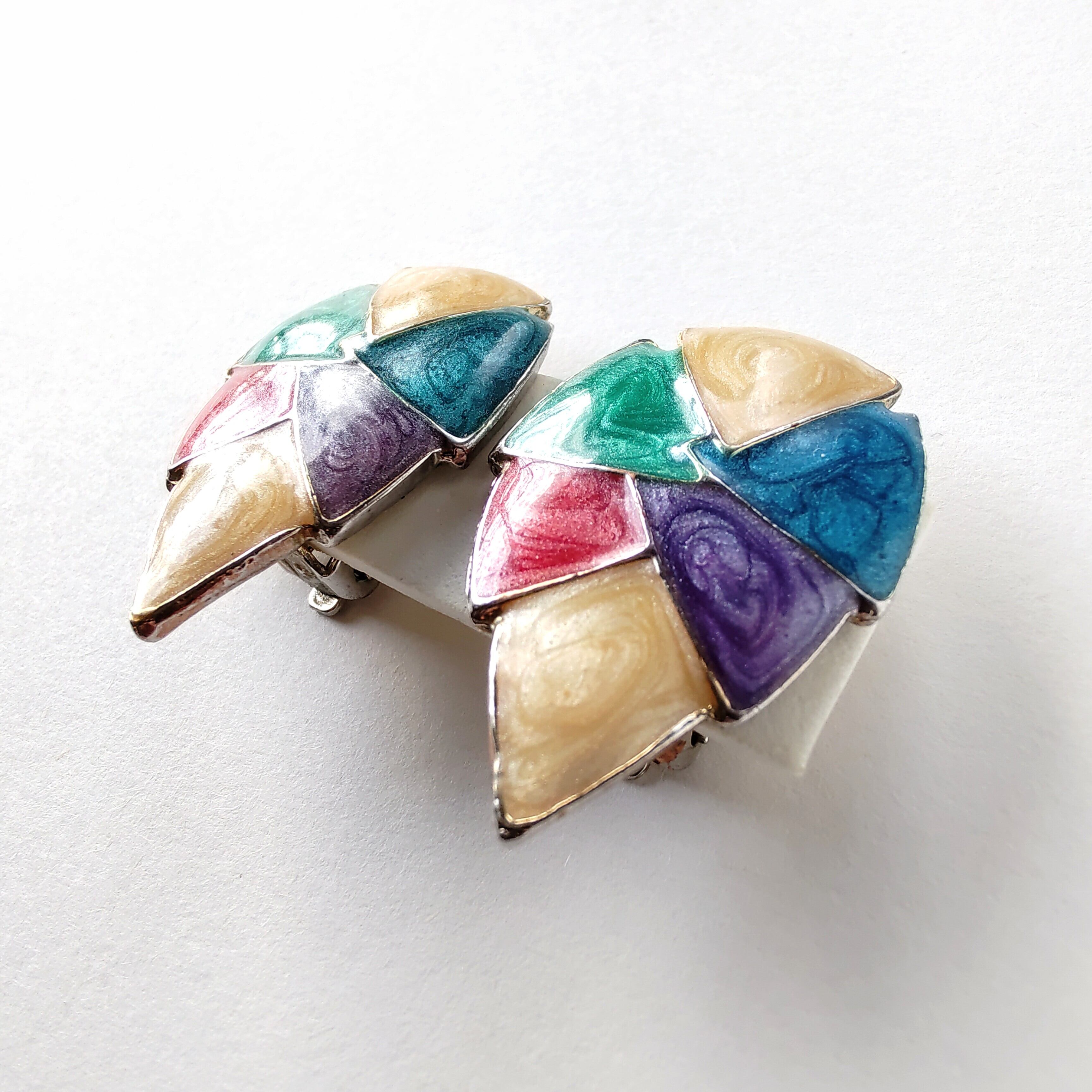 ブルー、グリーン、パープル、ピンク、ベージュのエナメルで色付けされた三角が重なってドロップ型にデザインされたヴィンテージイヤリングです。