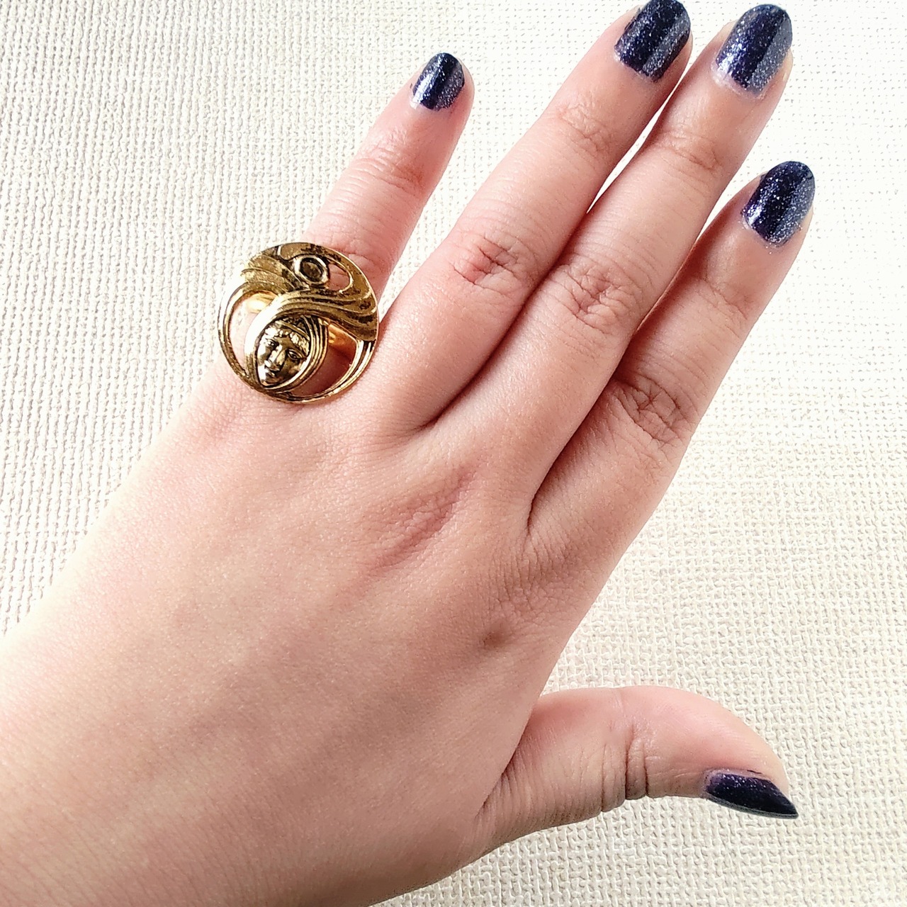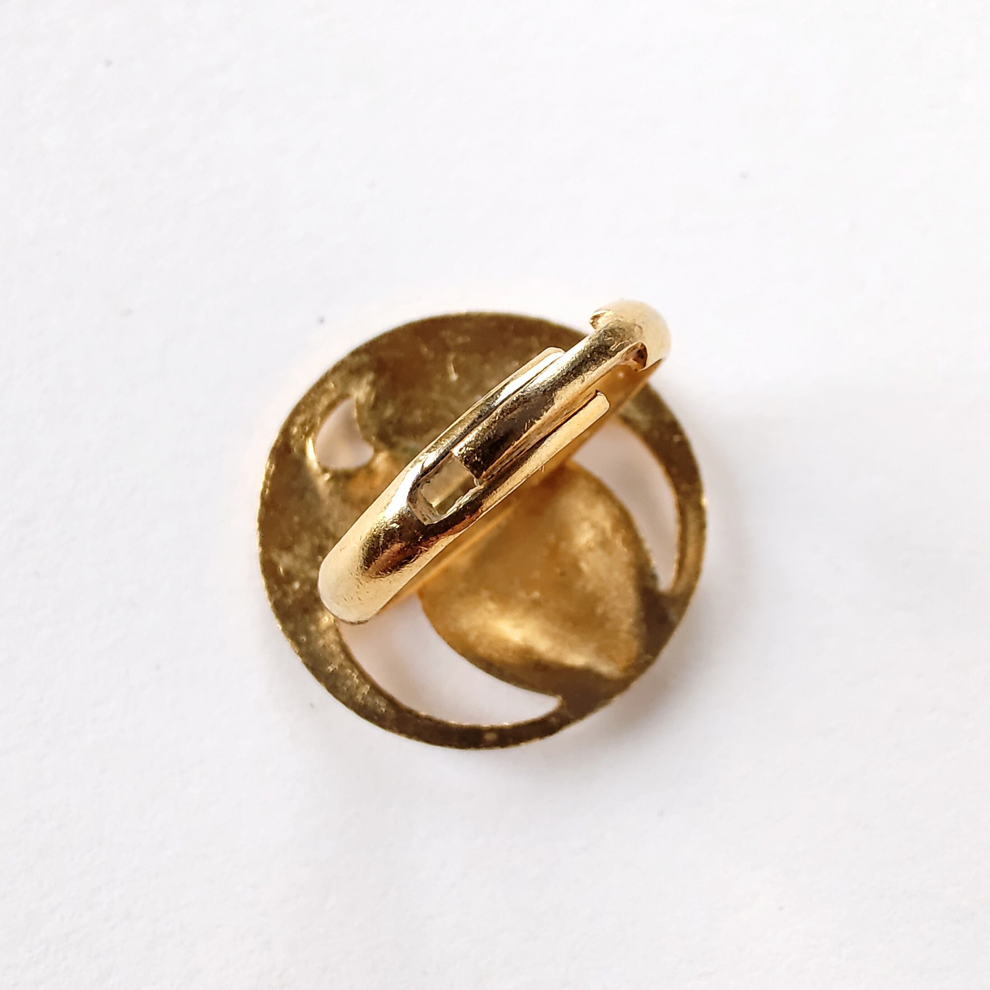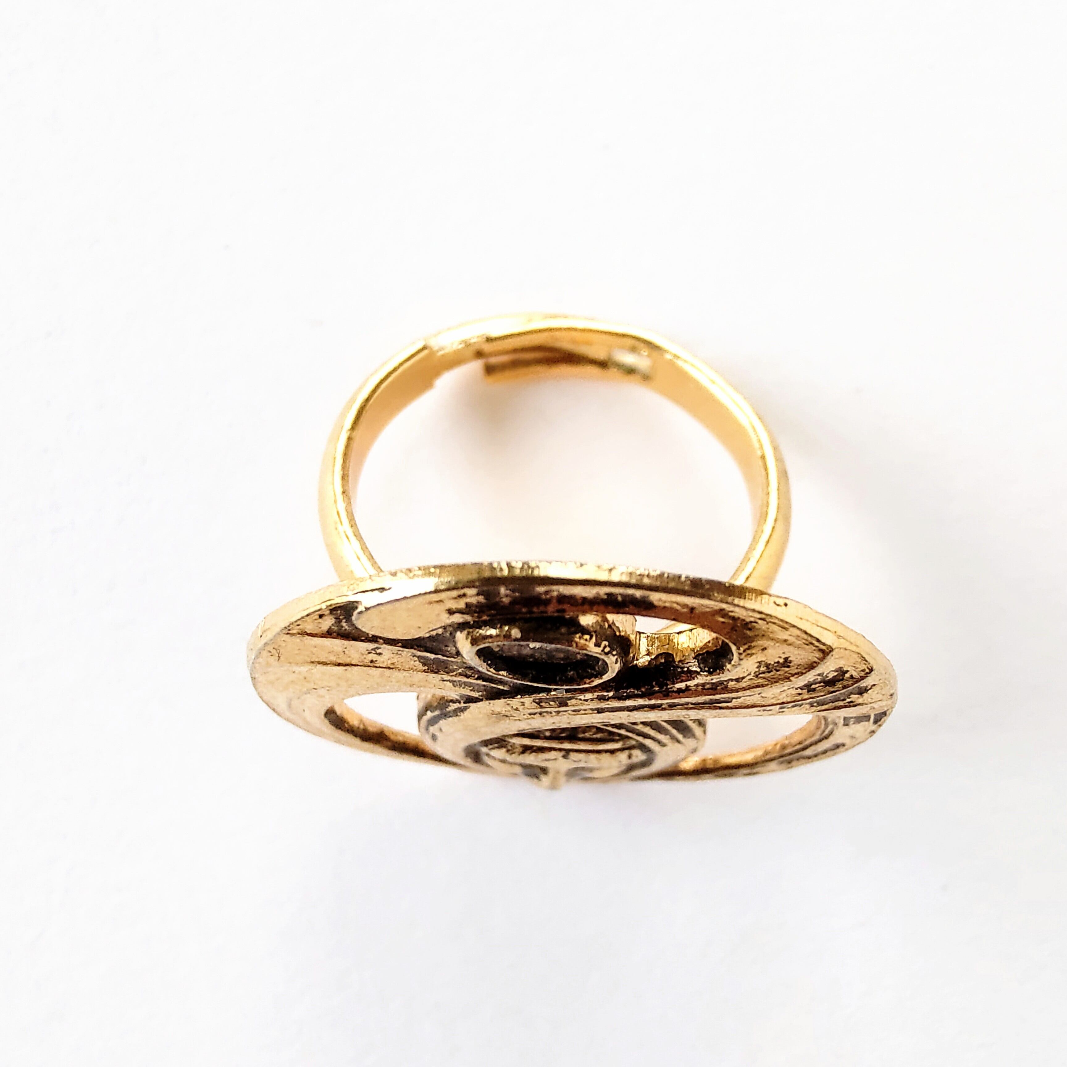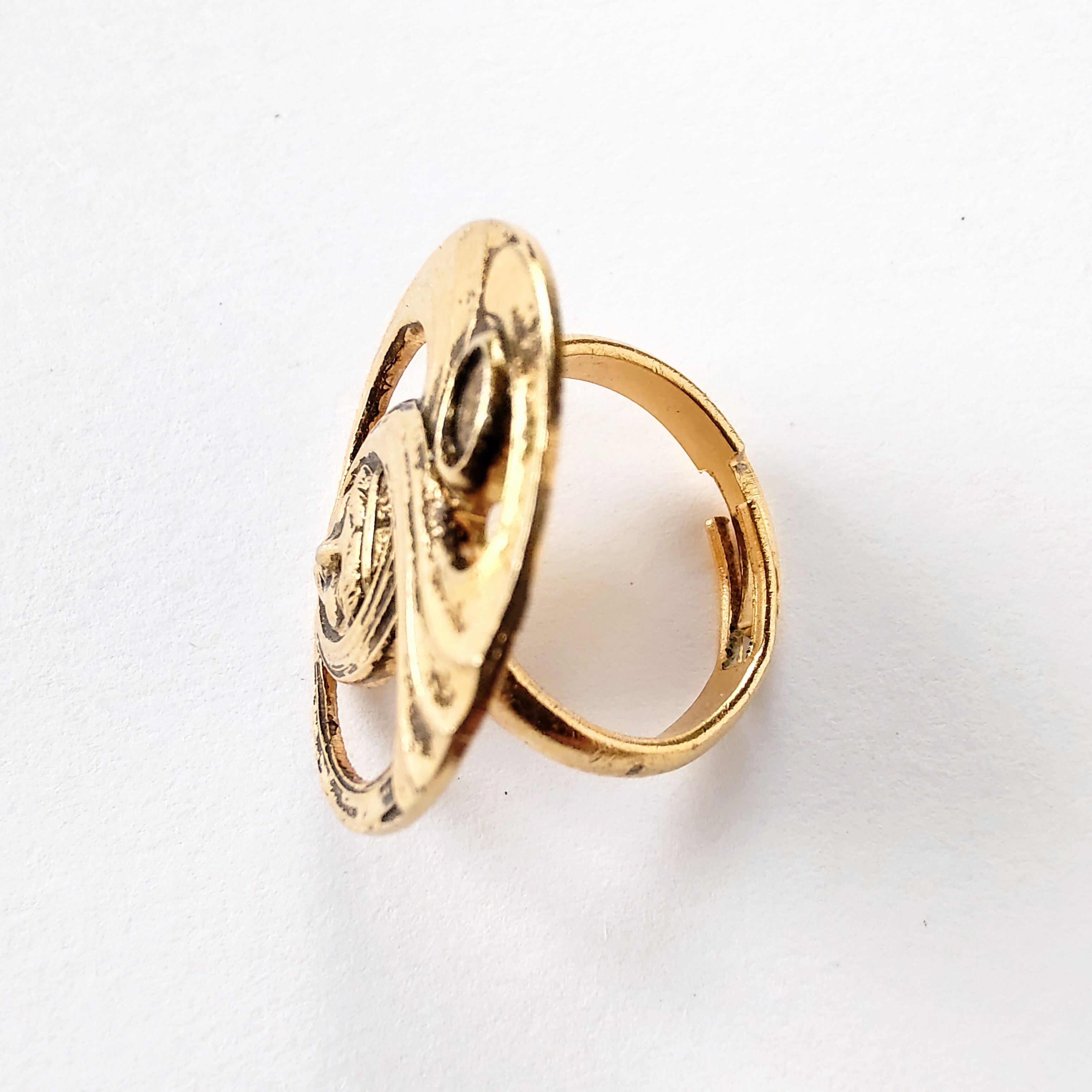 古代ギリシャ人の纏った布が円を描く様にデザインされた黒ずみ加工が施されたオープンワークゴールドメタルのヴィンテージリングです。