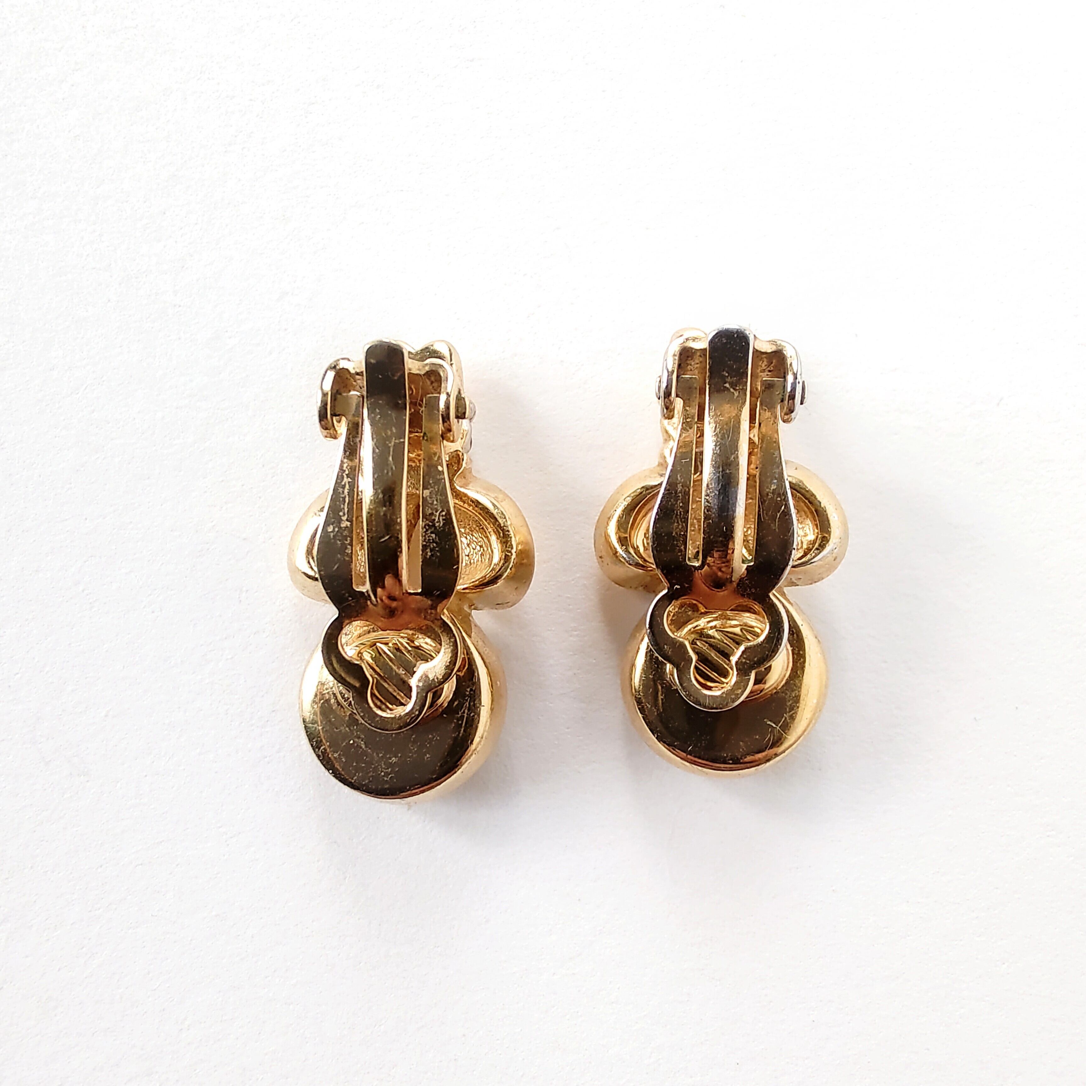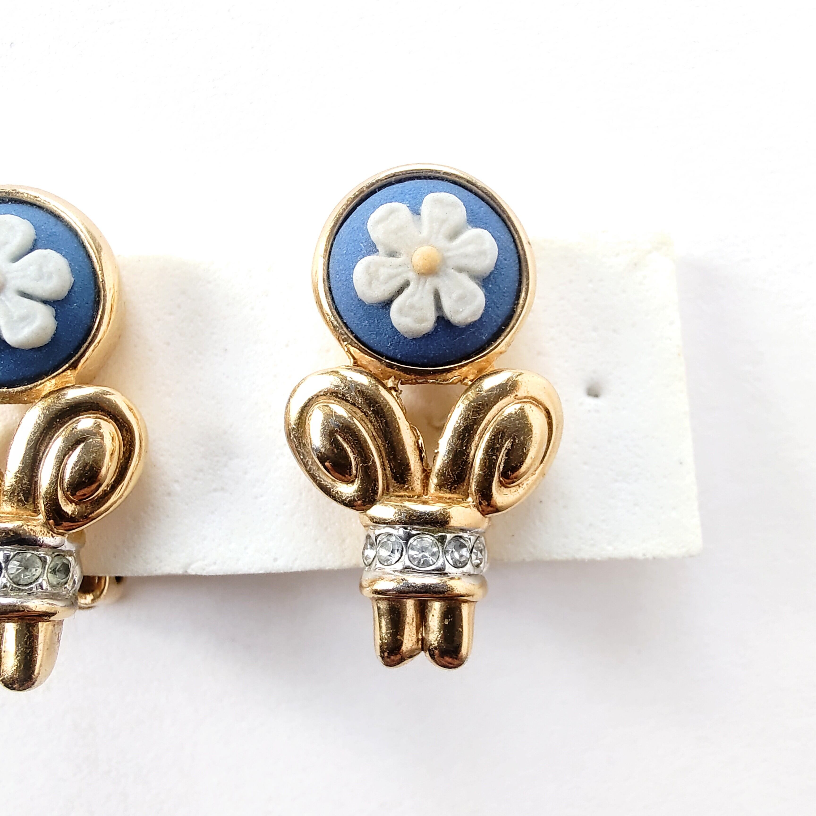 ゴールドメタルにブルーベースのデイジーのカボションがあしらわれたフラワーをクリアラインストーンで束ねた1輪ブーケの様なデザインのヴィンテージイヤリングです。