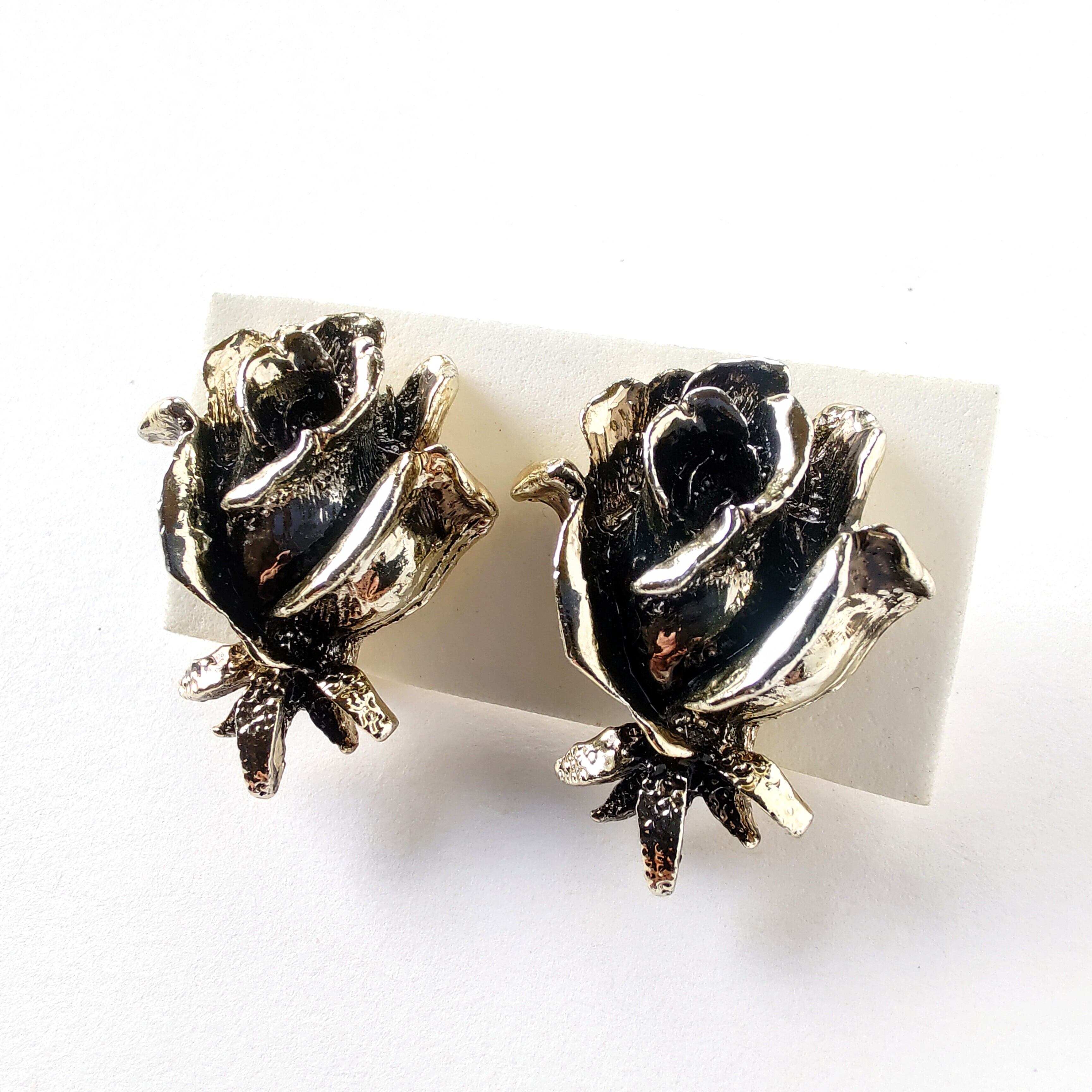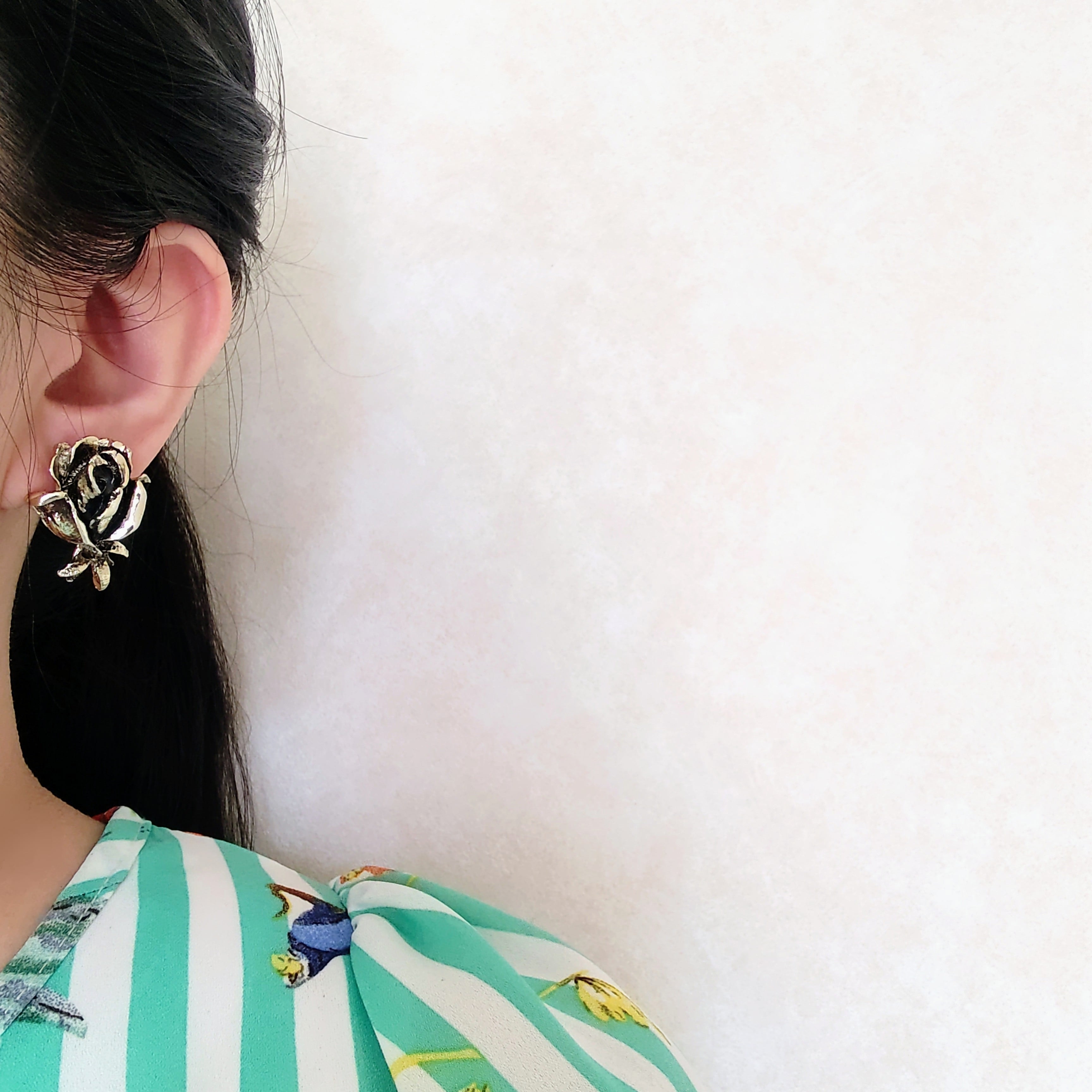 薄い色味のゴールドメタルに黒ずみ加工が施された花びらやガクが立体的にデザインされた薔薇のヴィンテージイヤリングです。