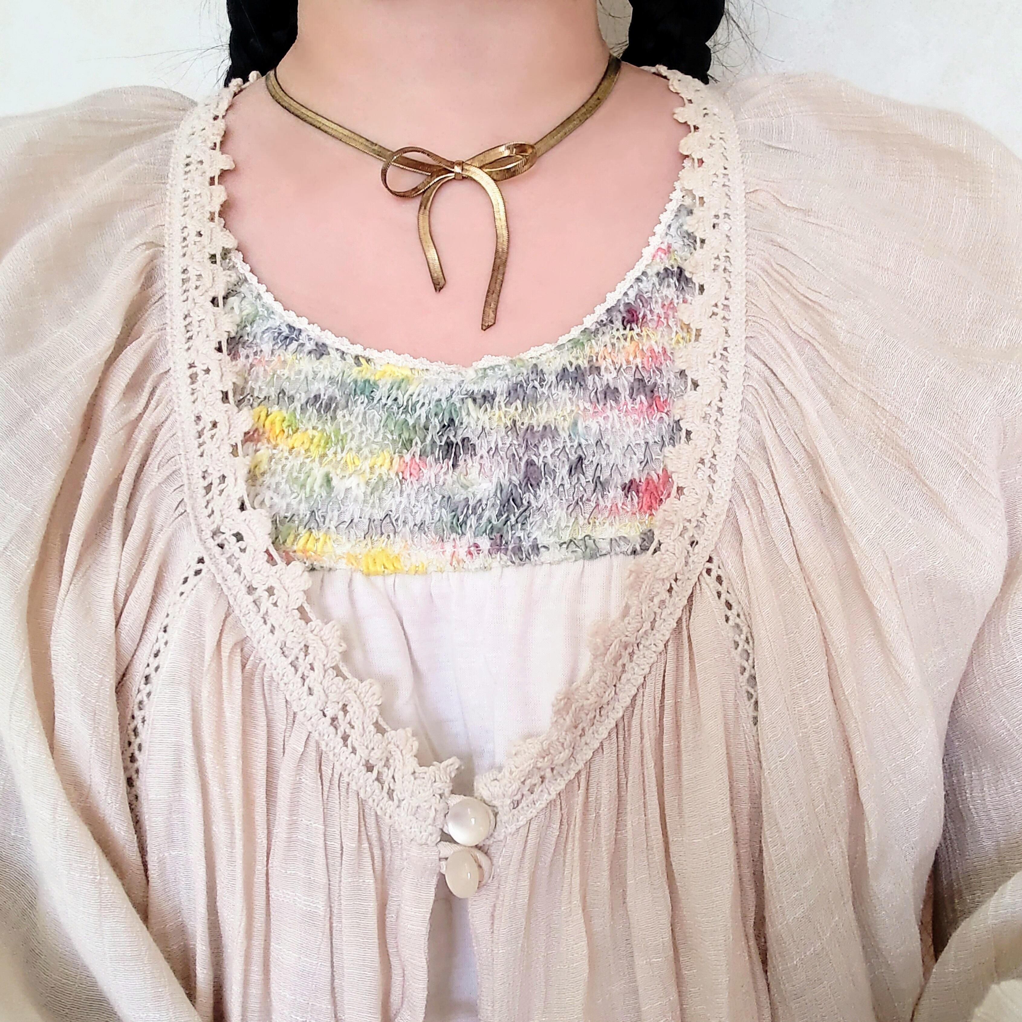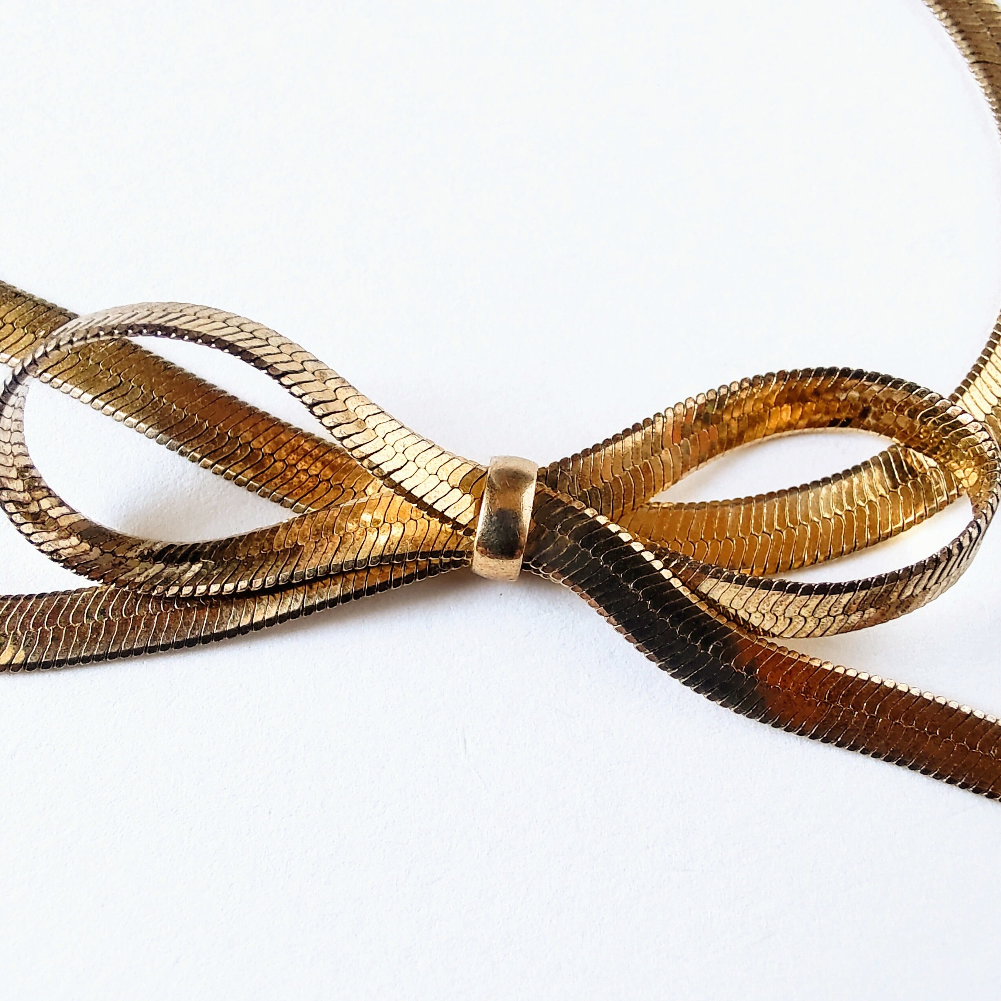 1886年アメリカのニューヨークにて小さな香水会社を創業、1971年に本格的にコスチュームジュエリーの製作を開始したAvon(エイボン)のゴールドのヘリンボーンチェーンが結ばれてリボンになったデザインのヴィンテージネックレスです。
