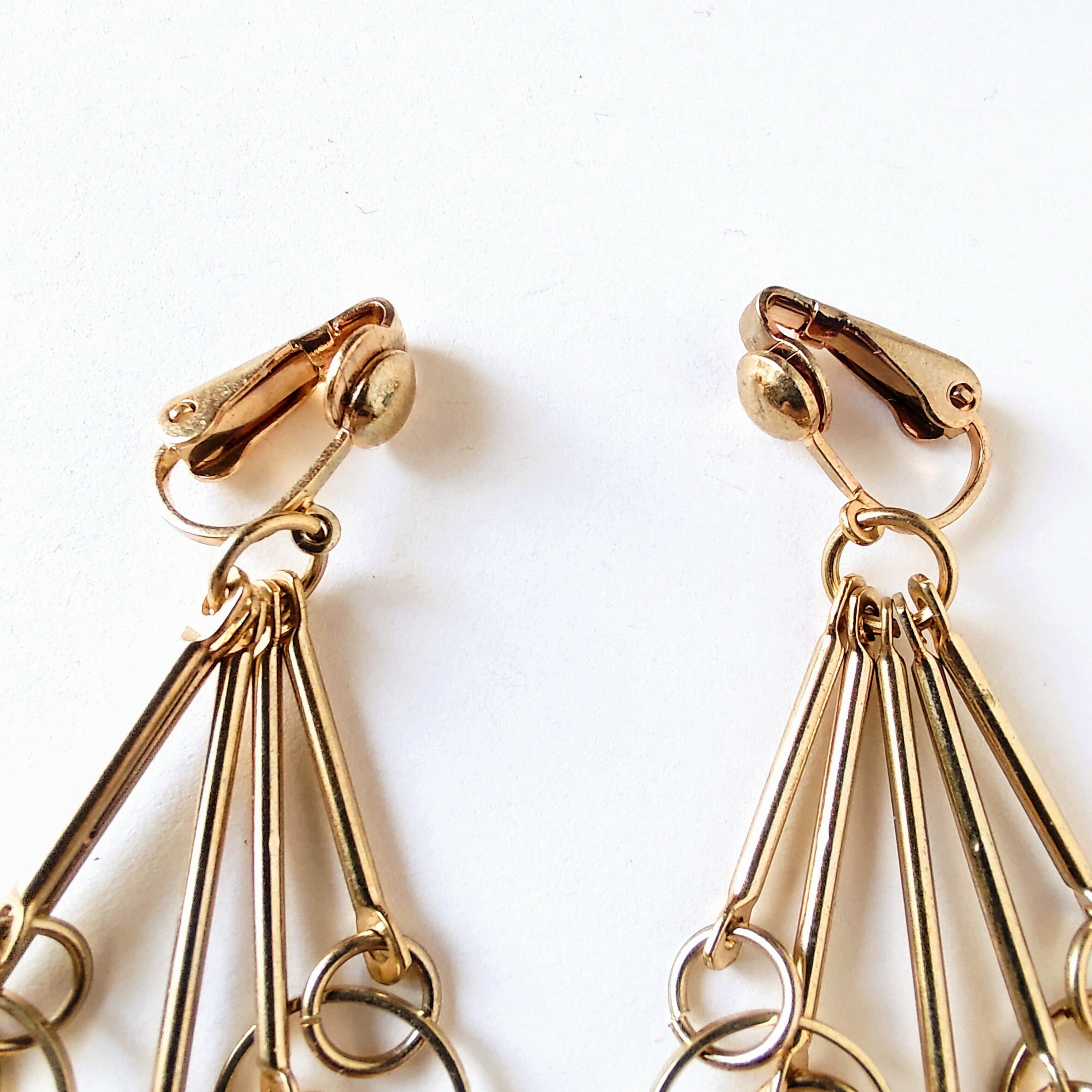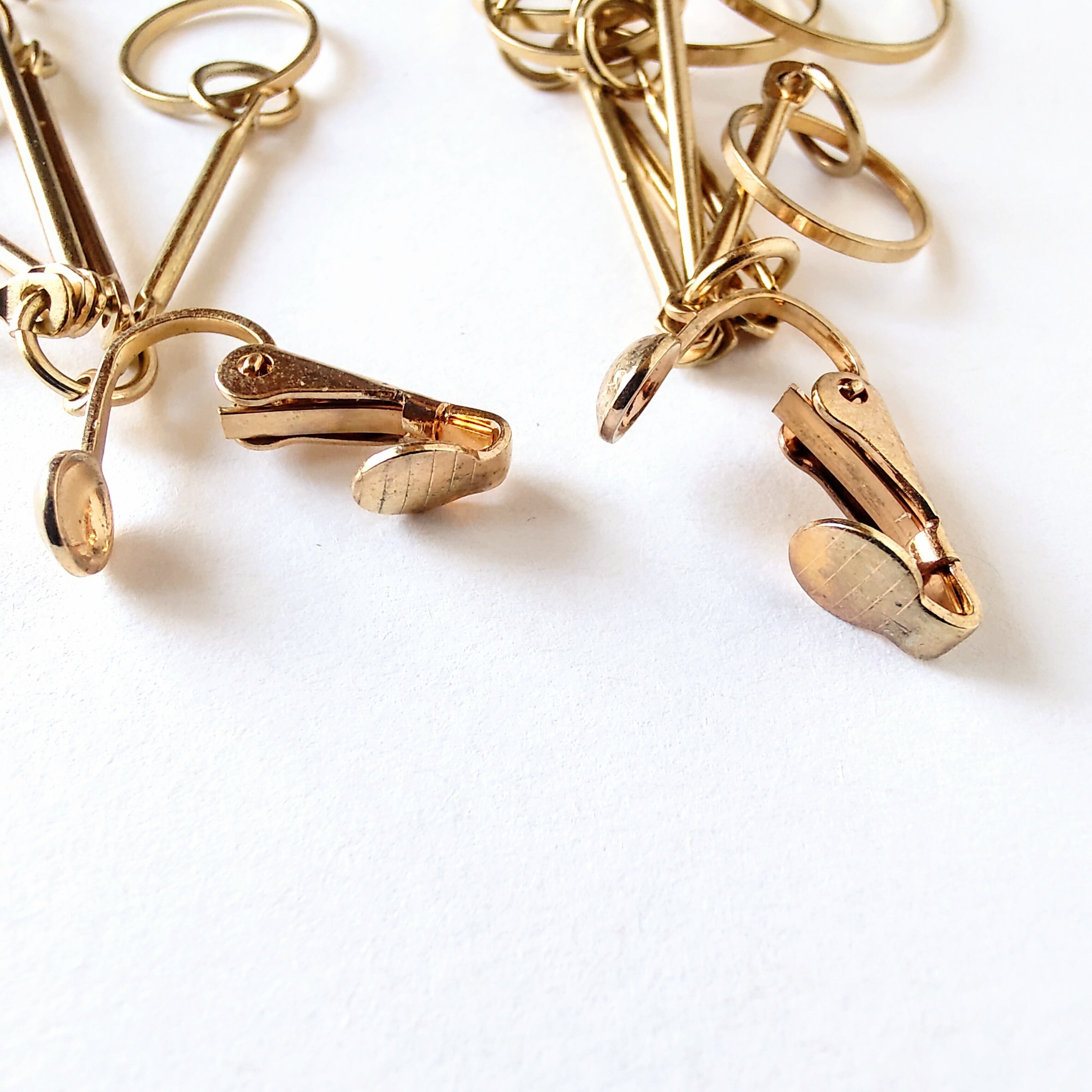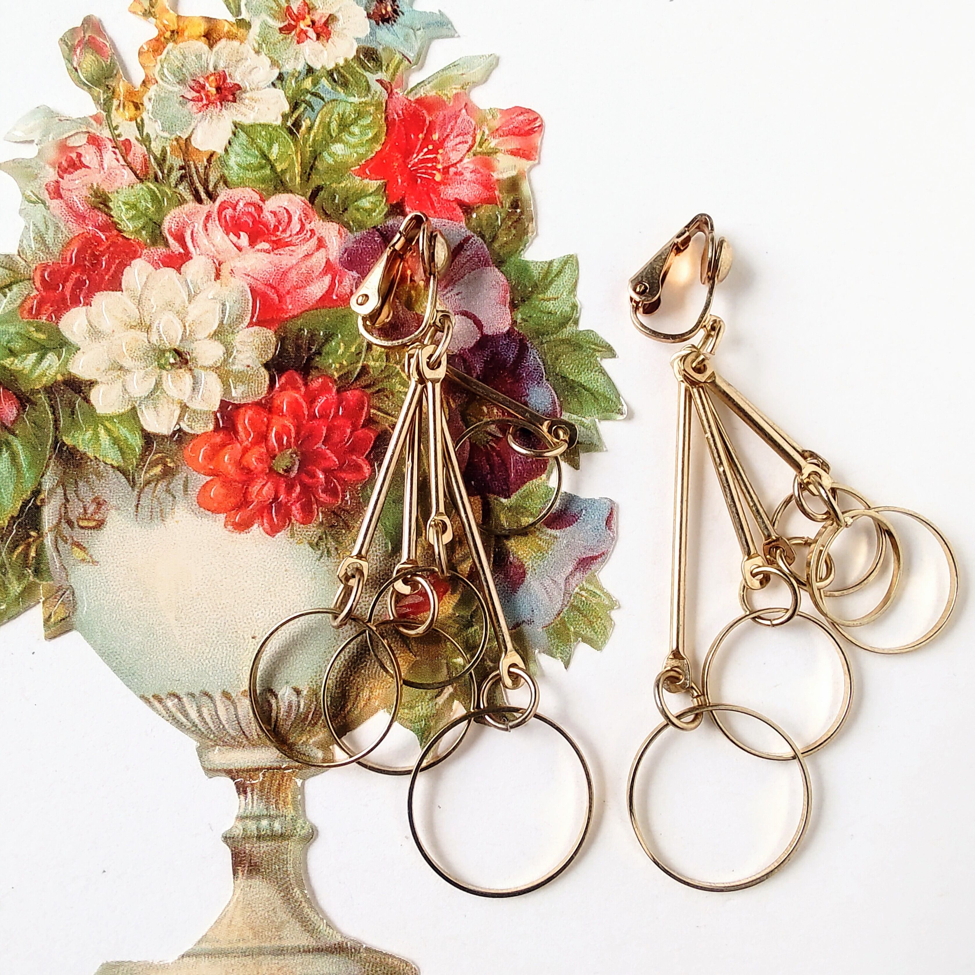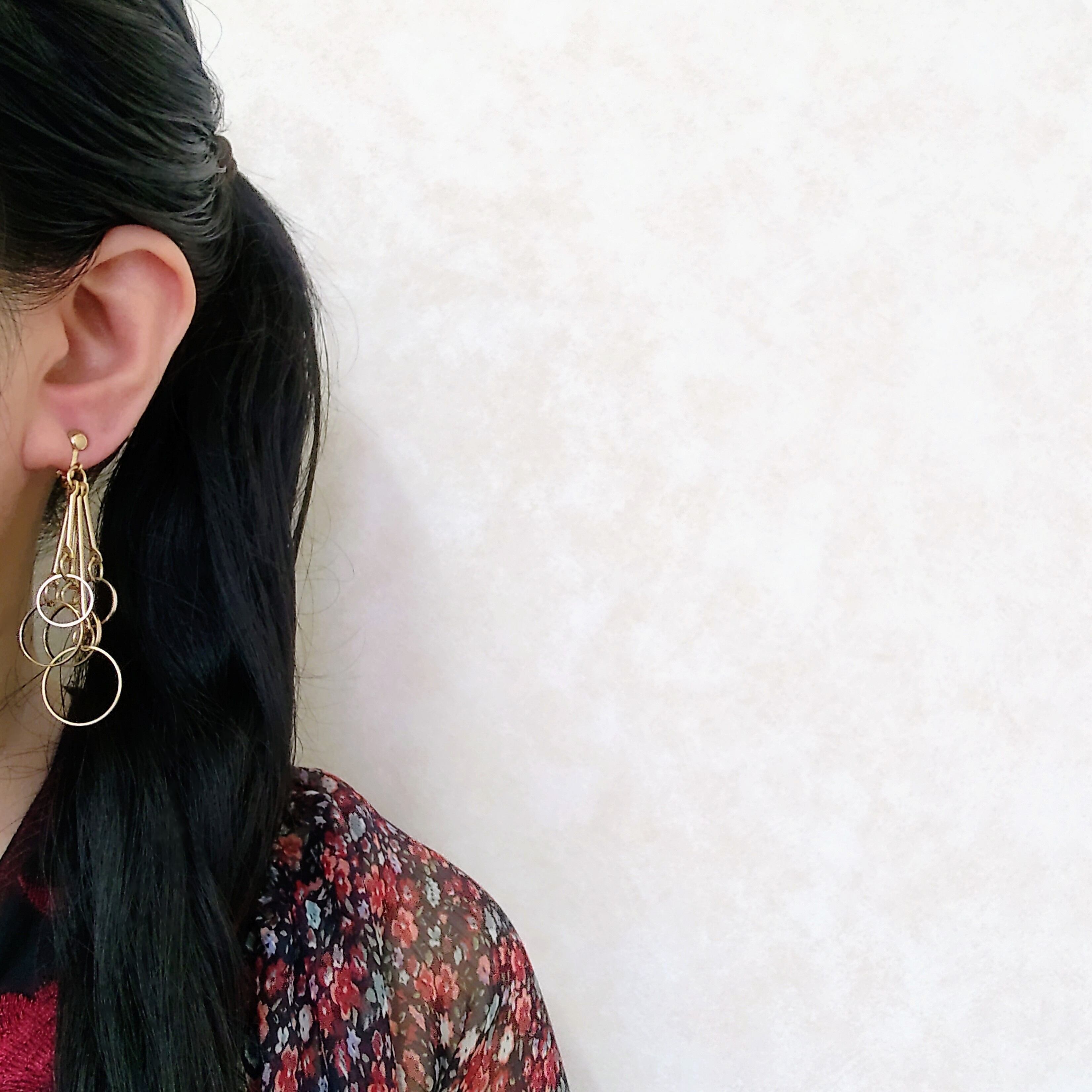 棒状のゴールドメタルの先に大きさの異なるフープがぶら下がった揺れるデザインのヴィンテージイヤリングです。