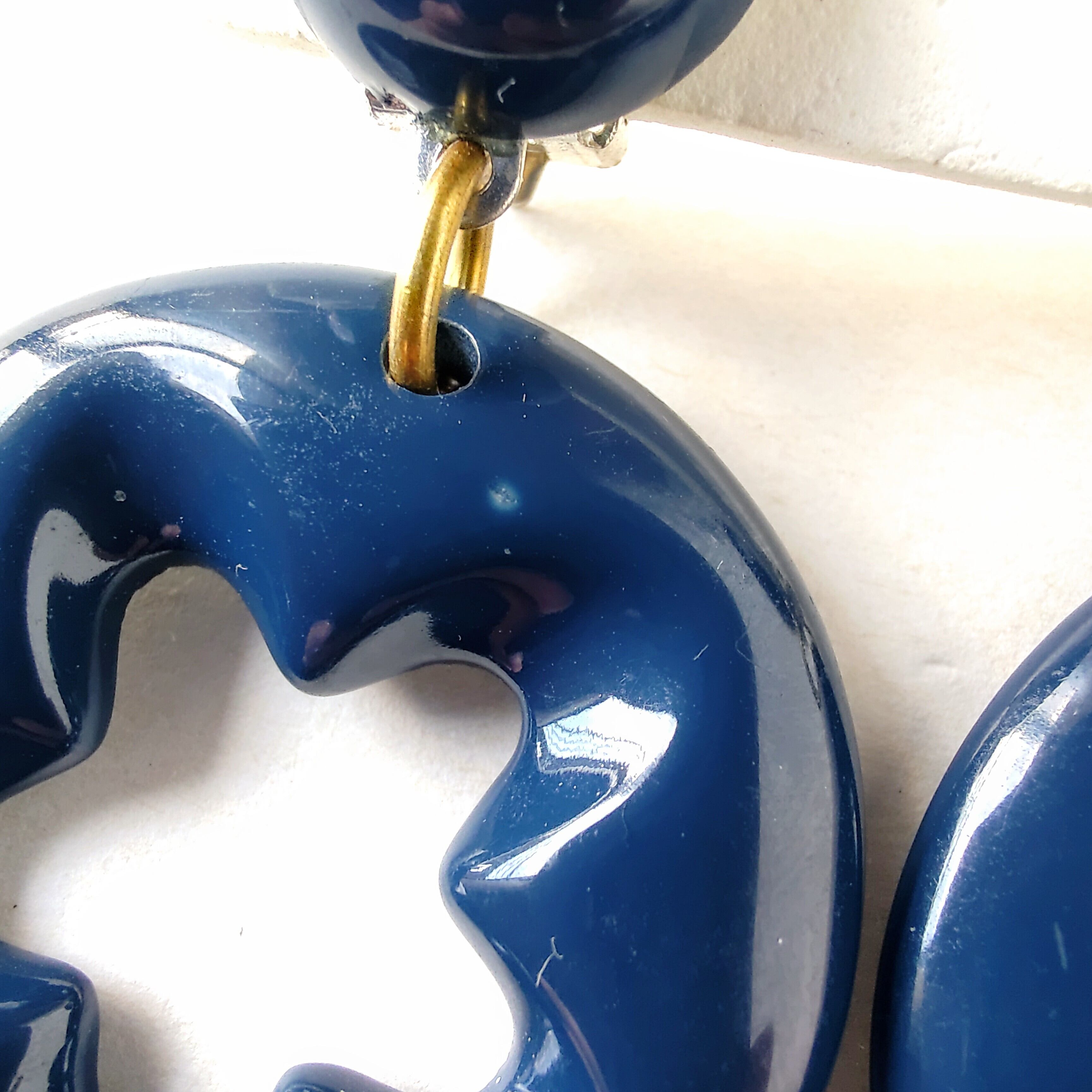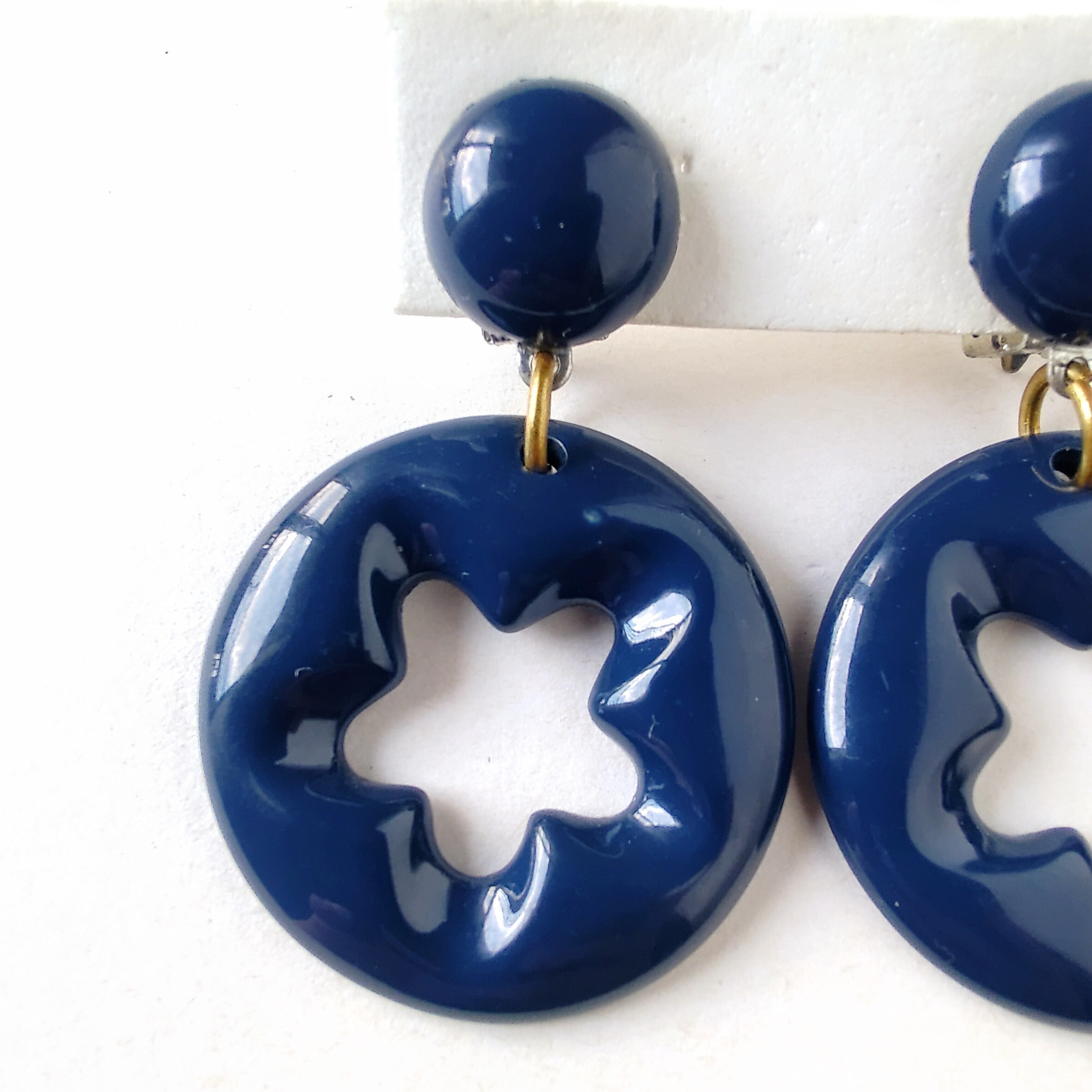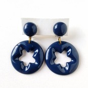 星型にくり抜かれたネイビーのラウンド型のプラスチックが揺れるデザインのヴィンテージイヤリングです。