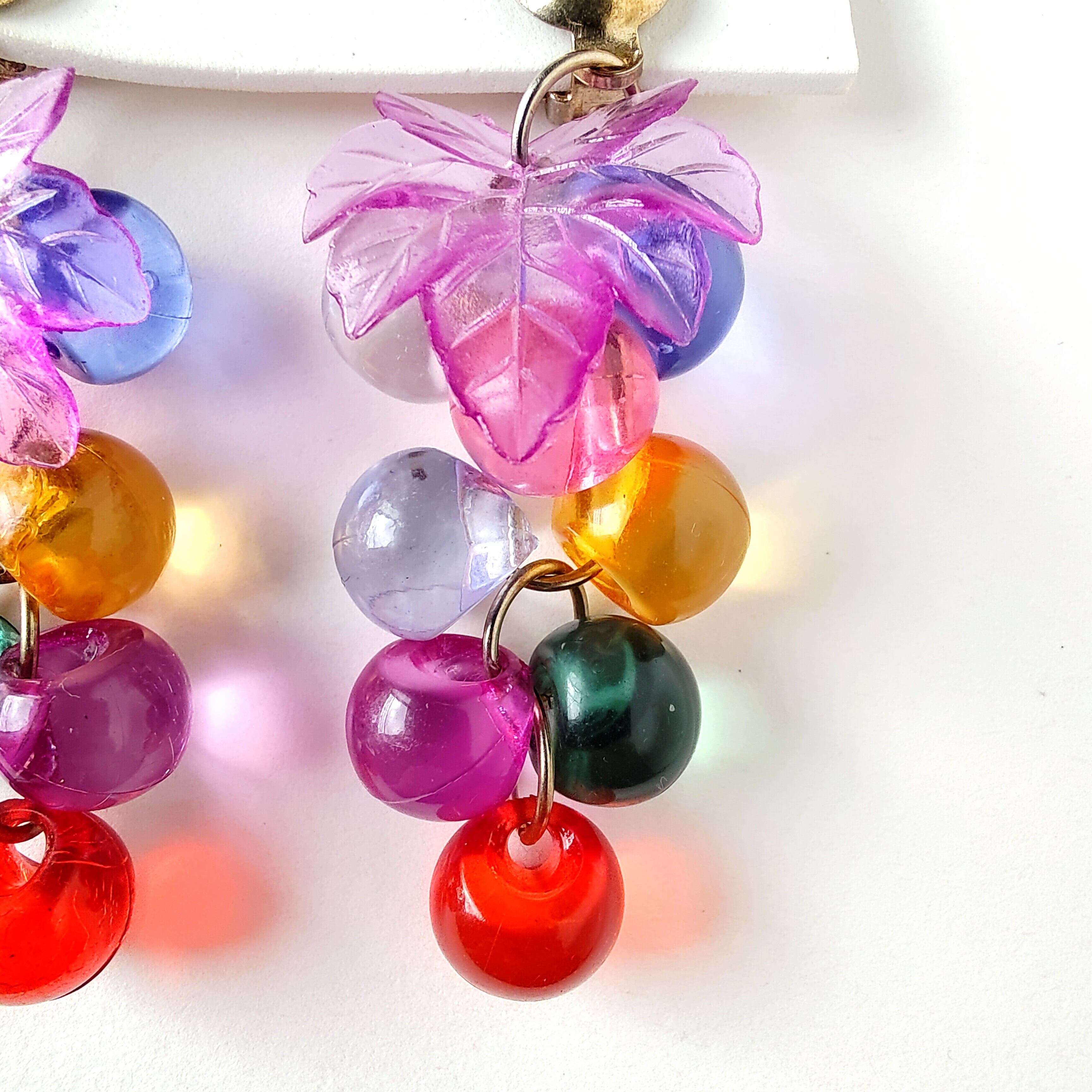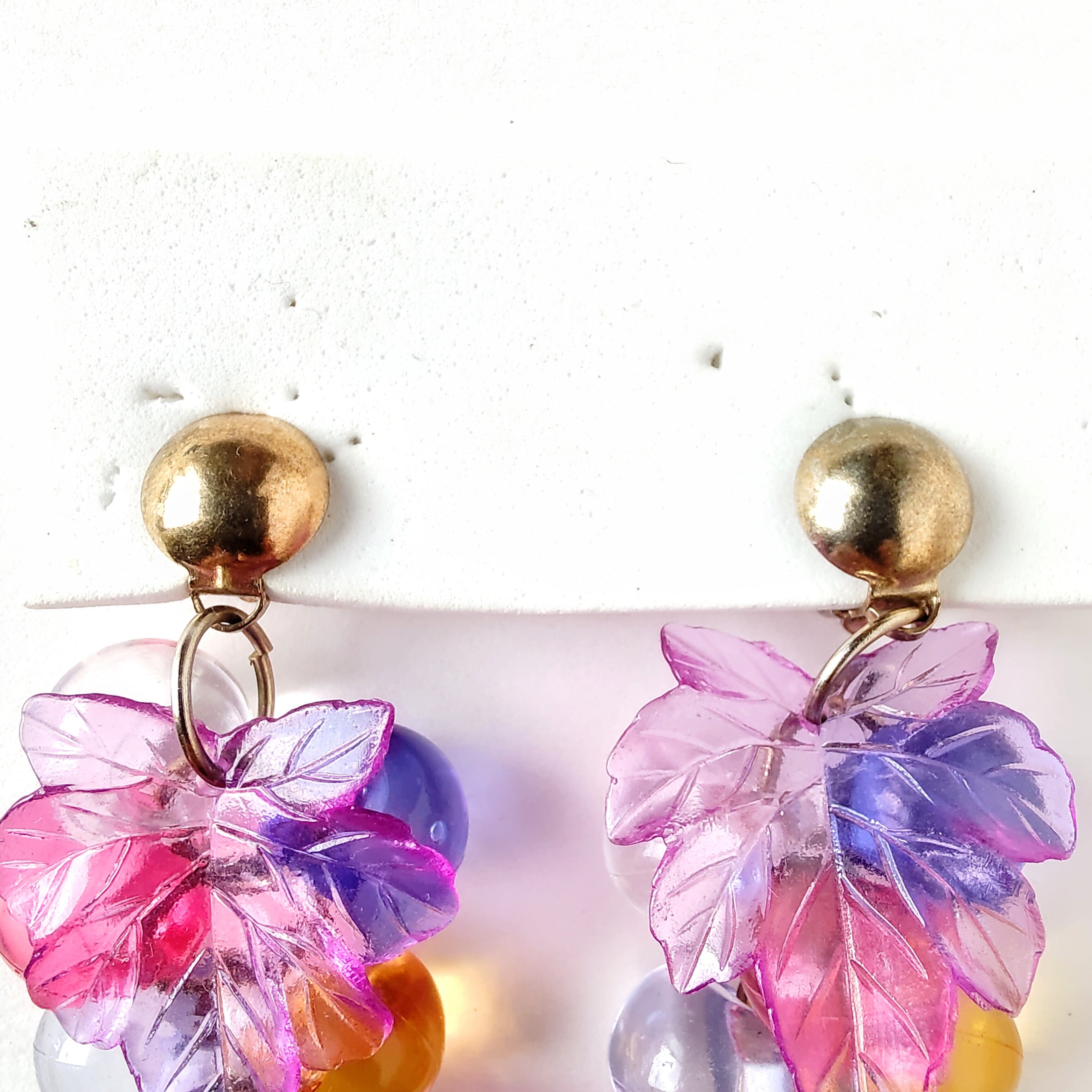 8色の透明感のあるボールプラスチックとパープルのリーフが揺れるデザインの葡萄のヴィンテージイヤリングです。