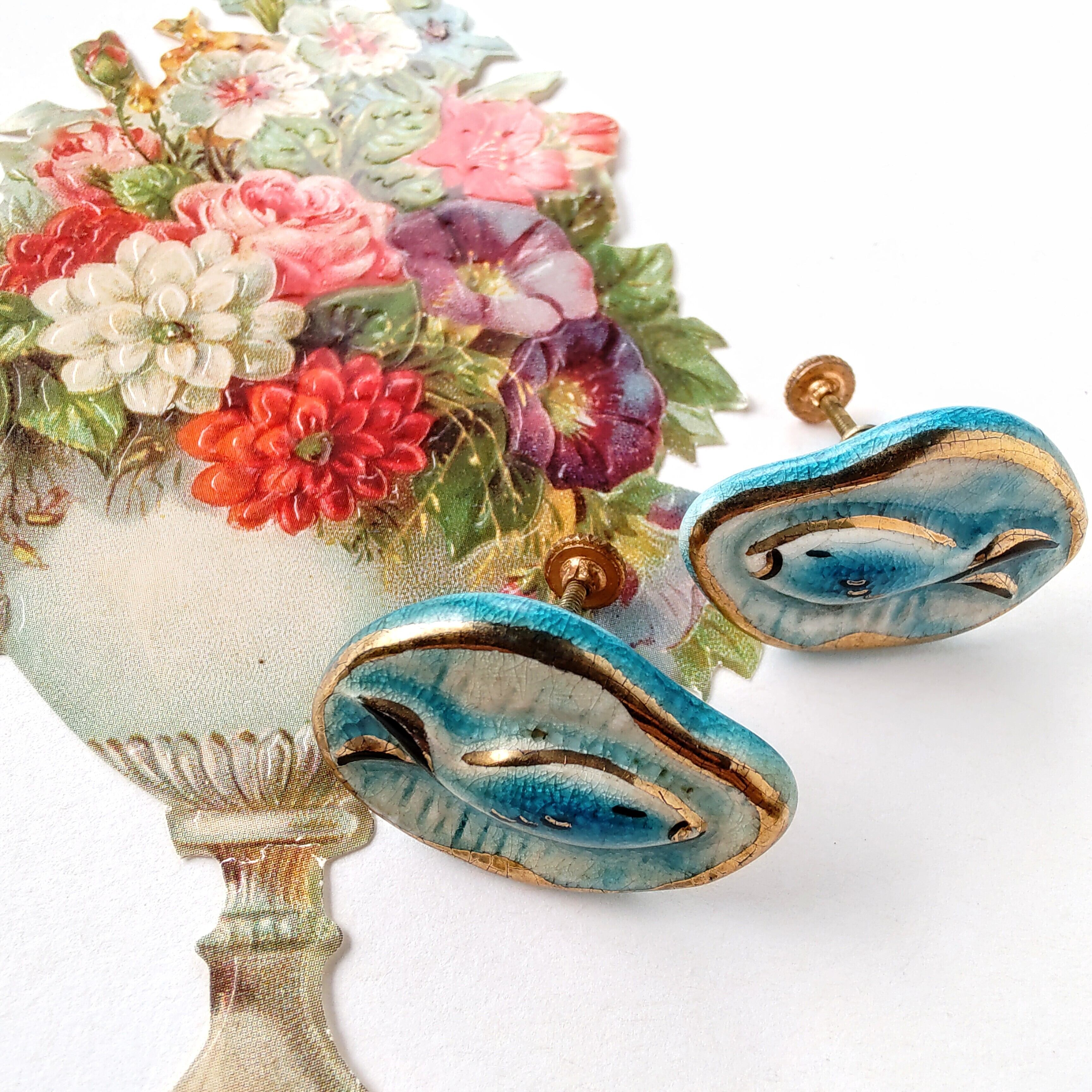 水の中を泳いでいるお魚がデザインされたハンドメイドで作られたポーセリンのヴィンテージイヤリングです。