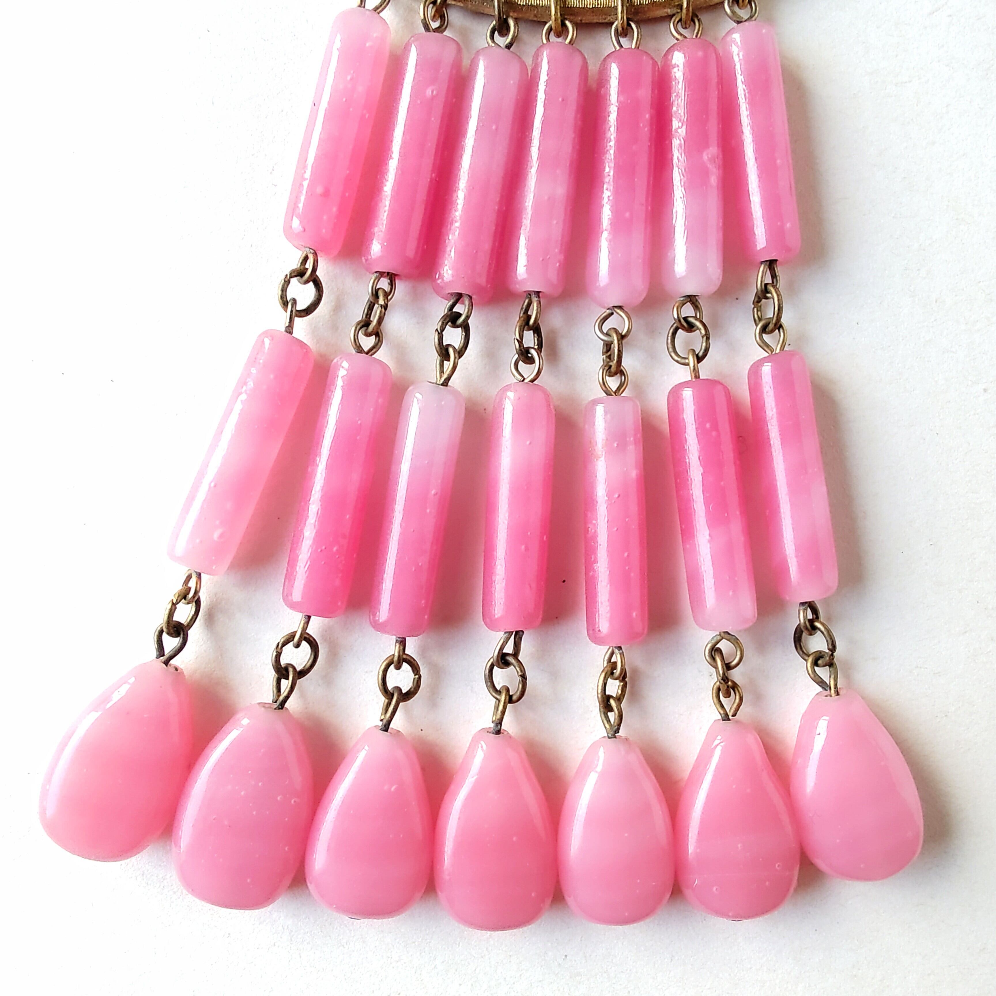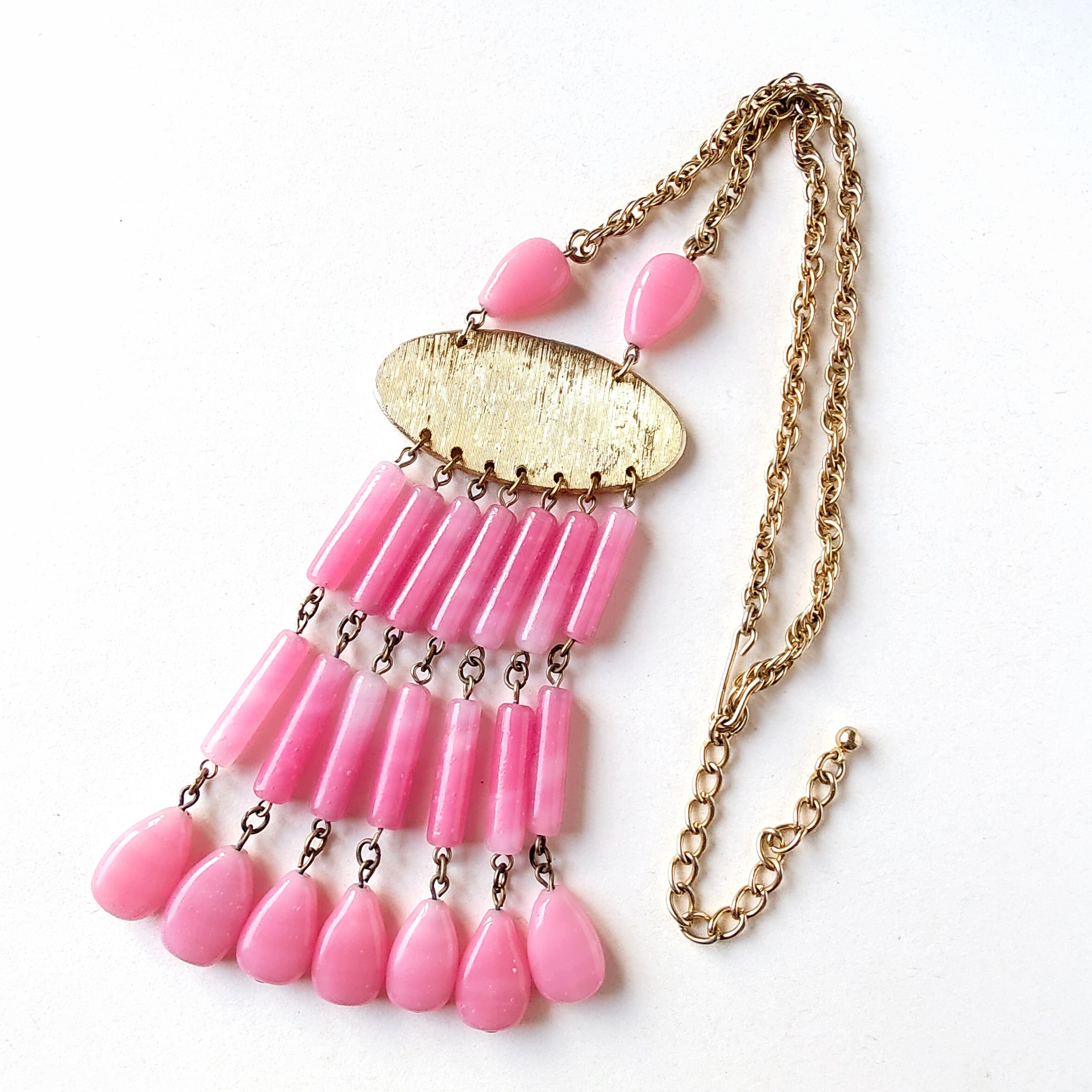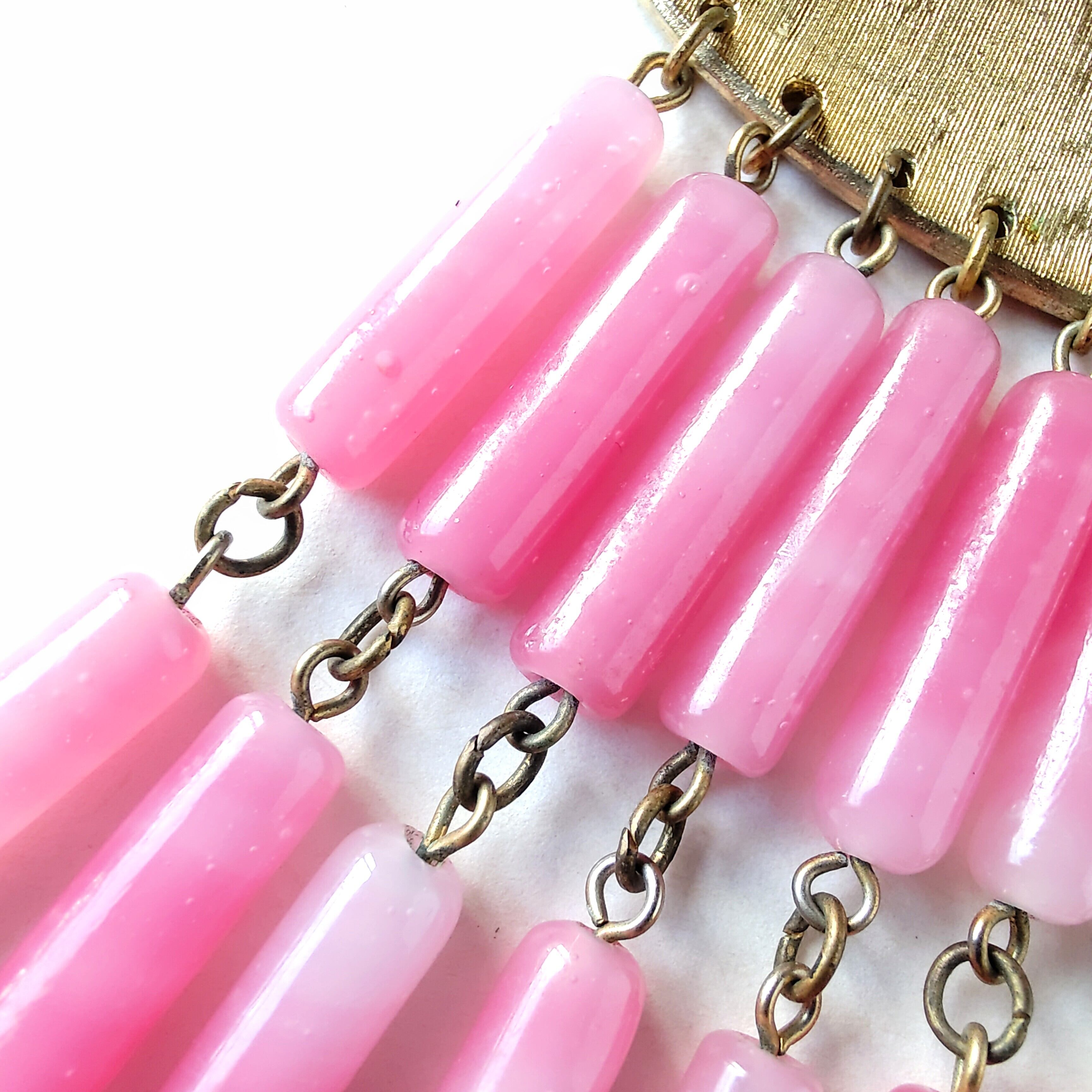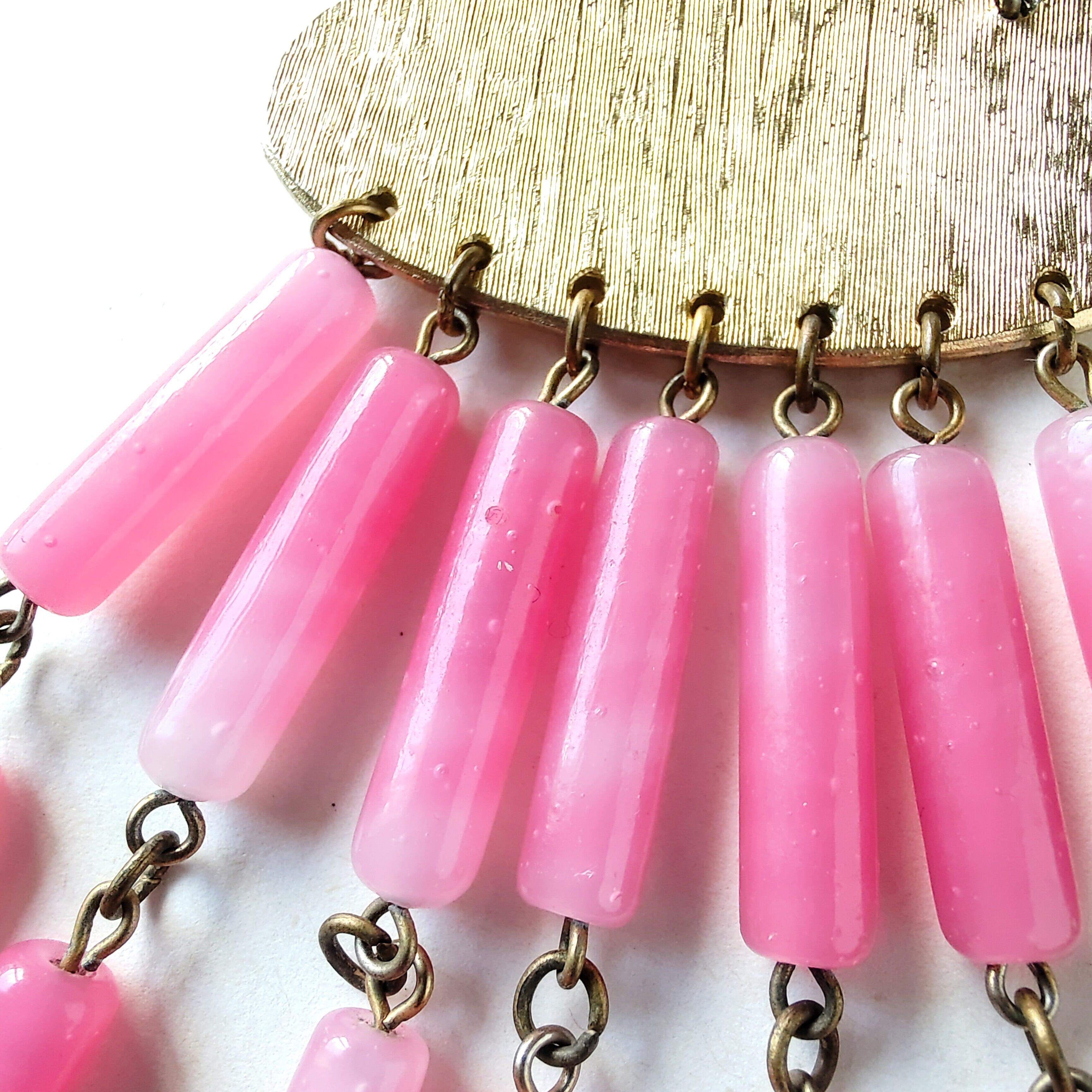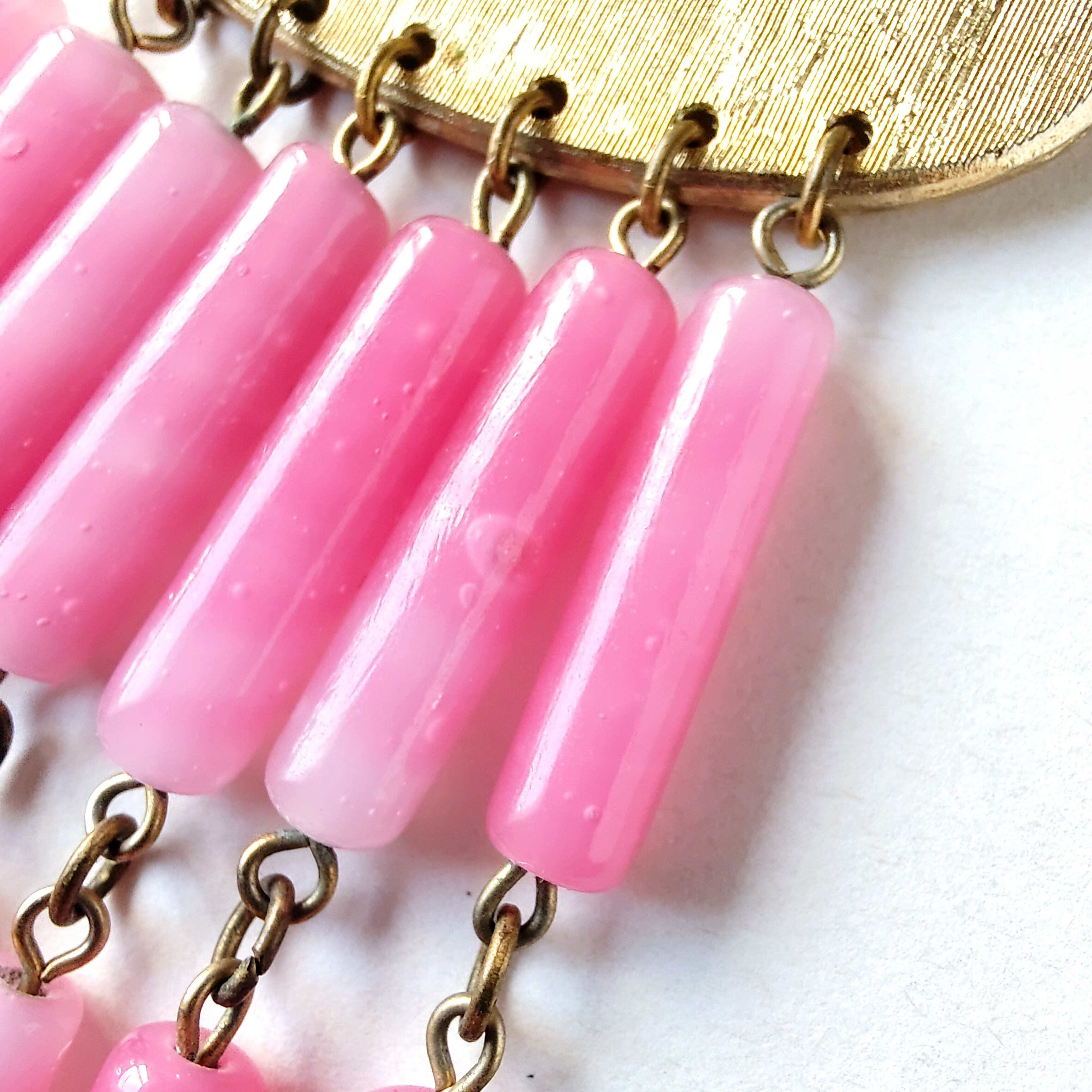 楕円型のゴールドメタルにホワイトとピンクのマーブルチェコガラスが垂れ下がったデザインのヴィンテージネックレスです。