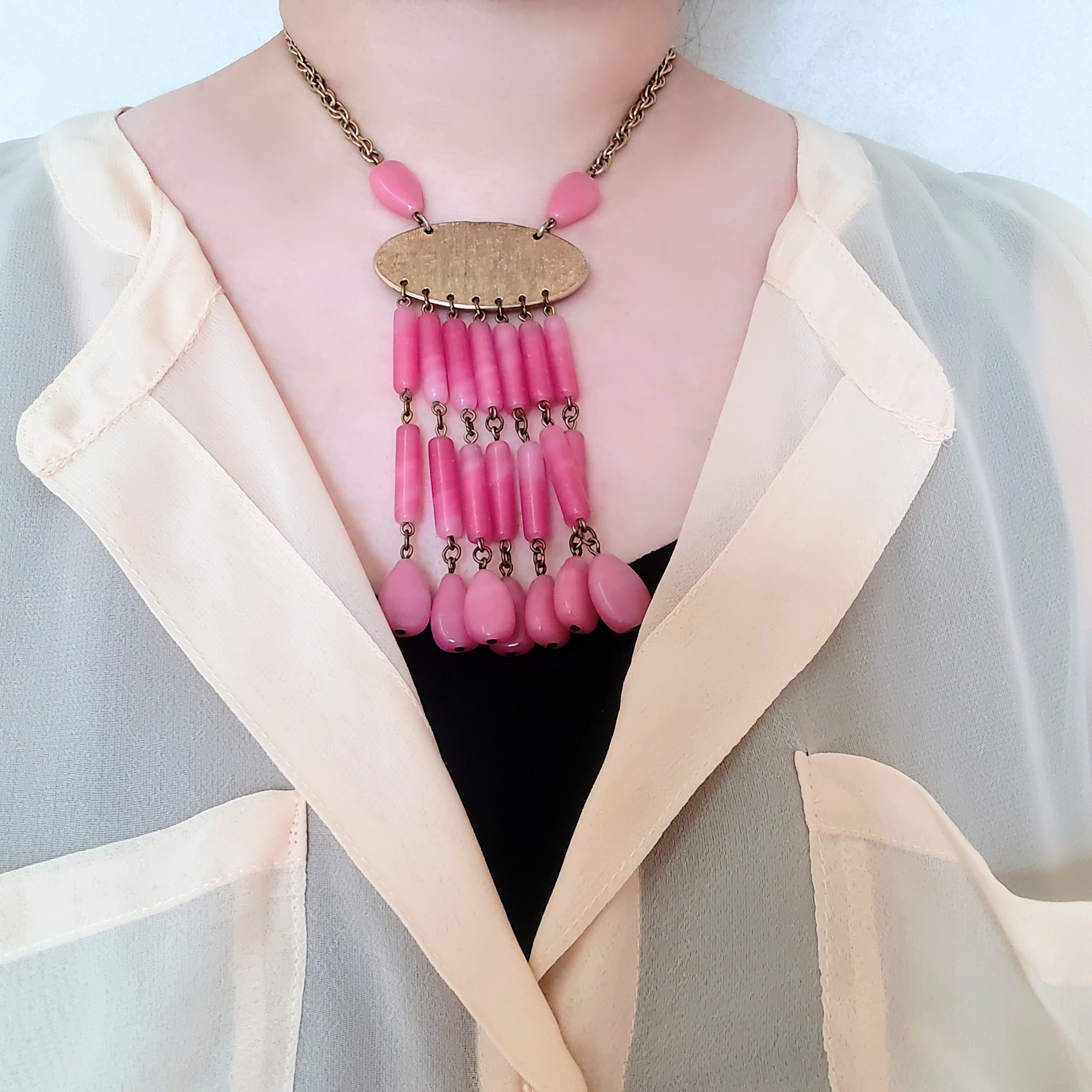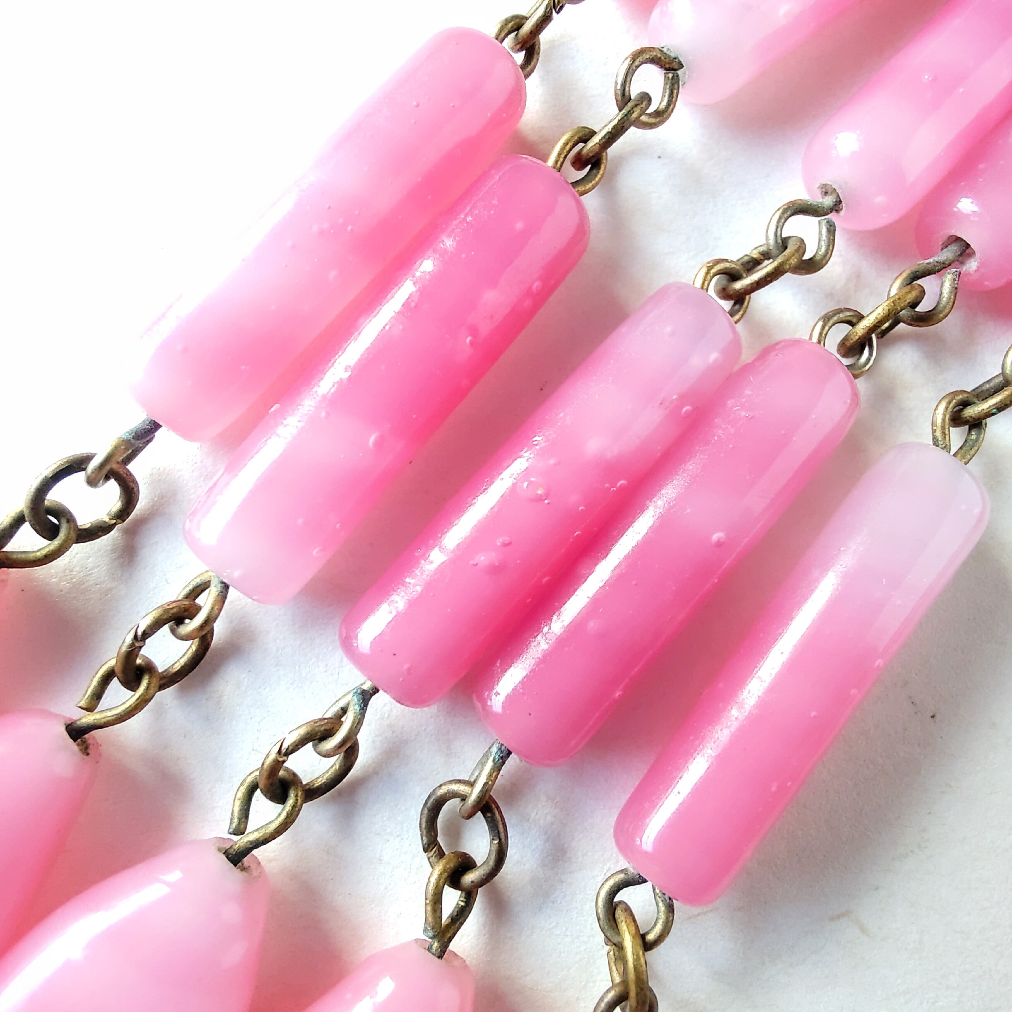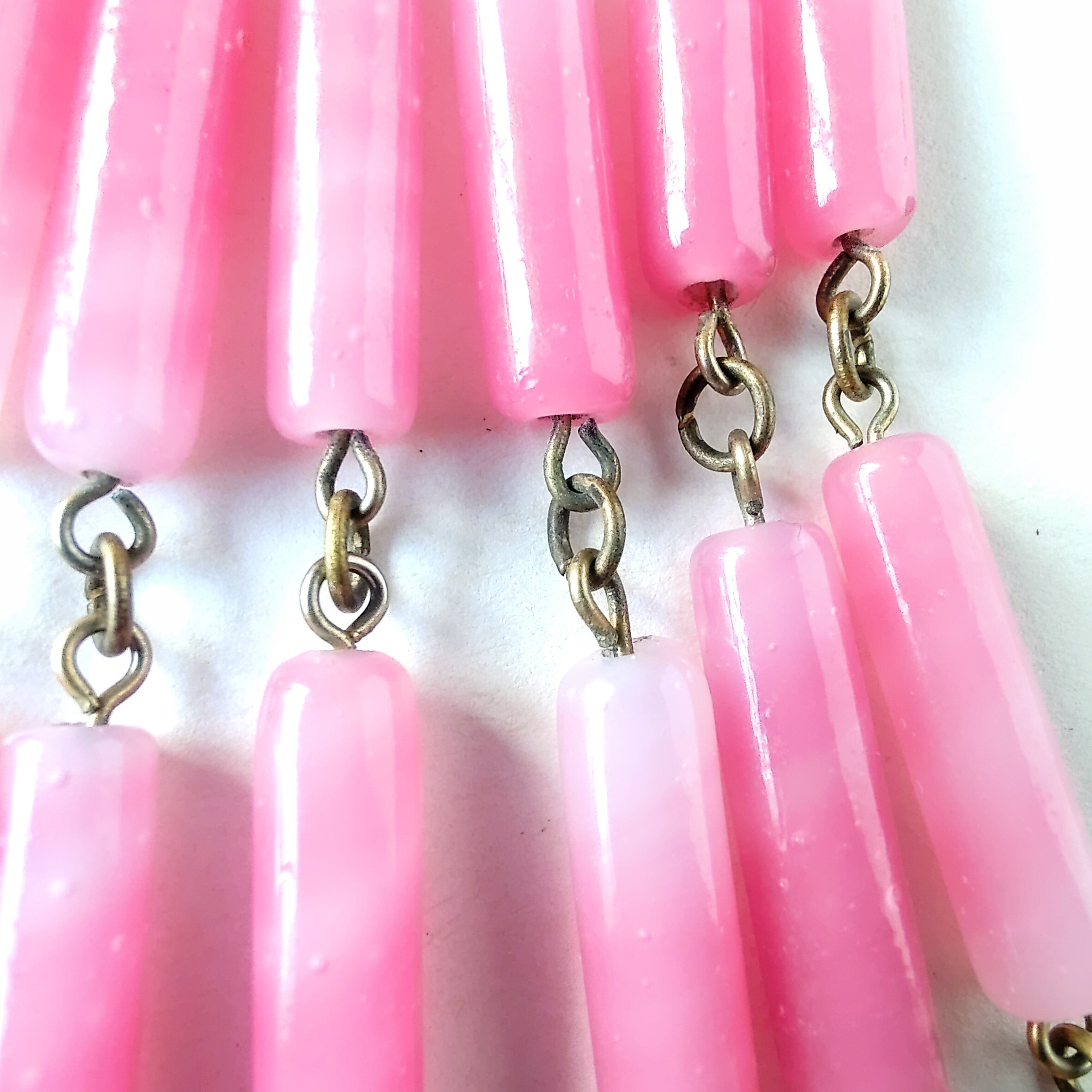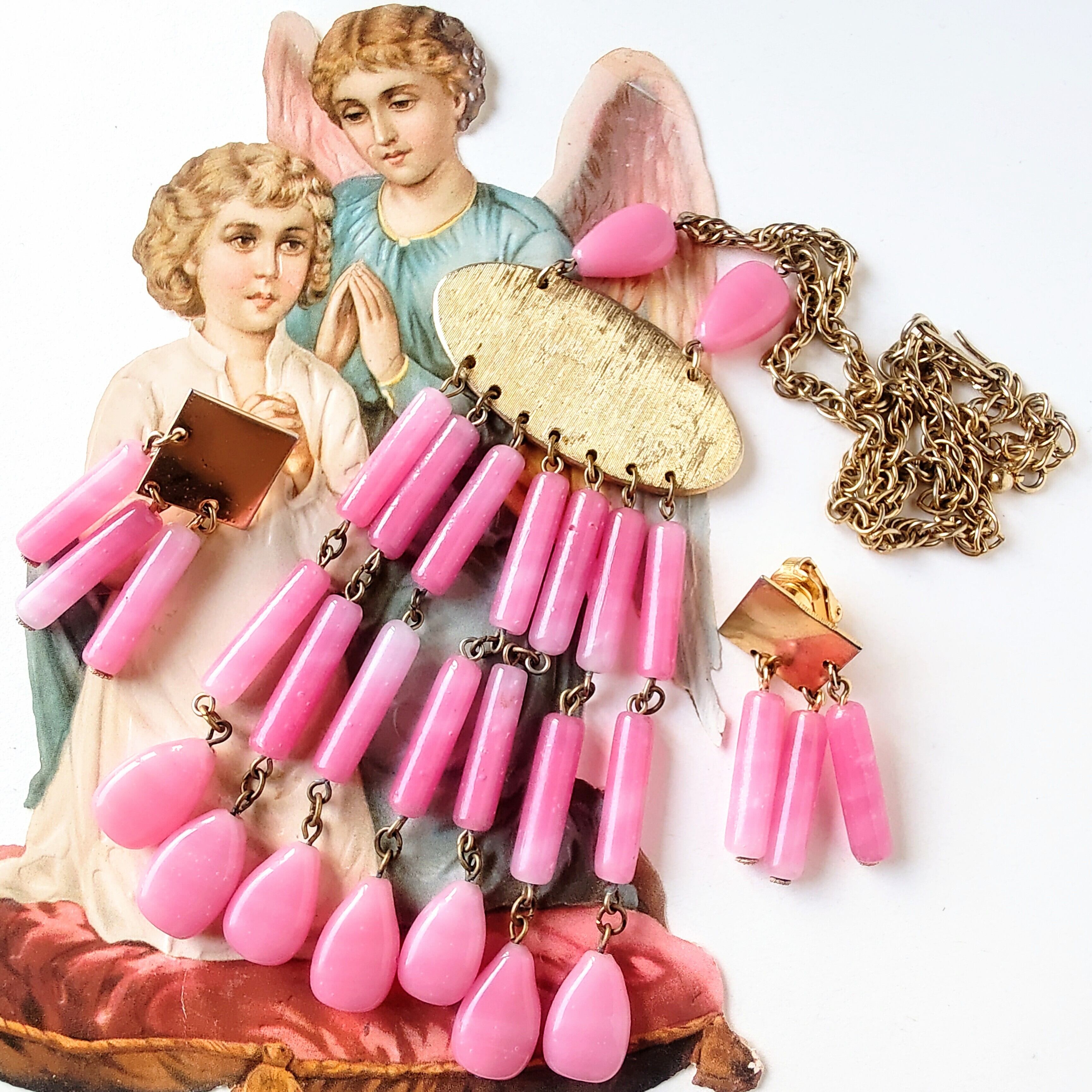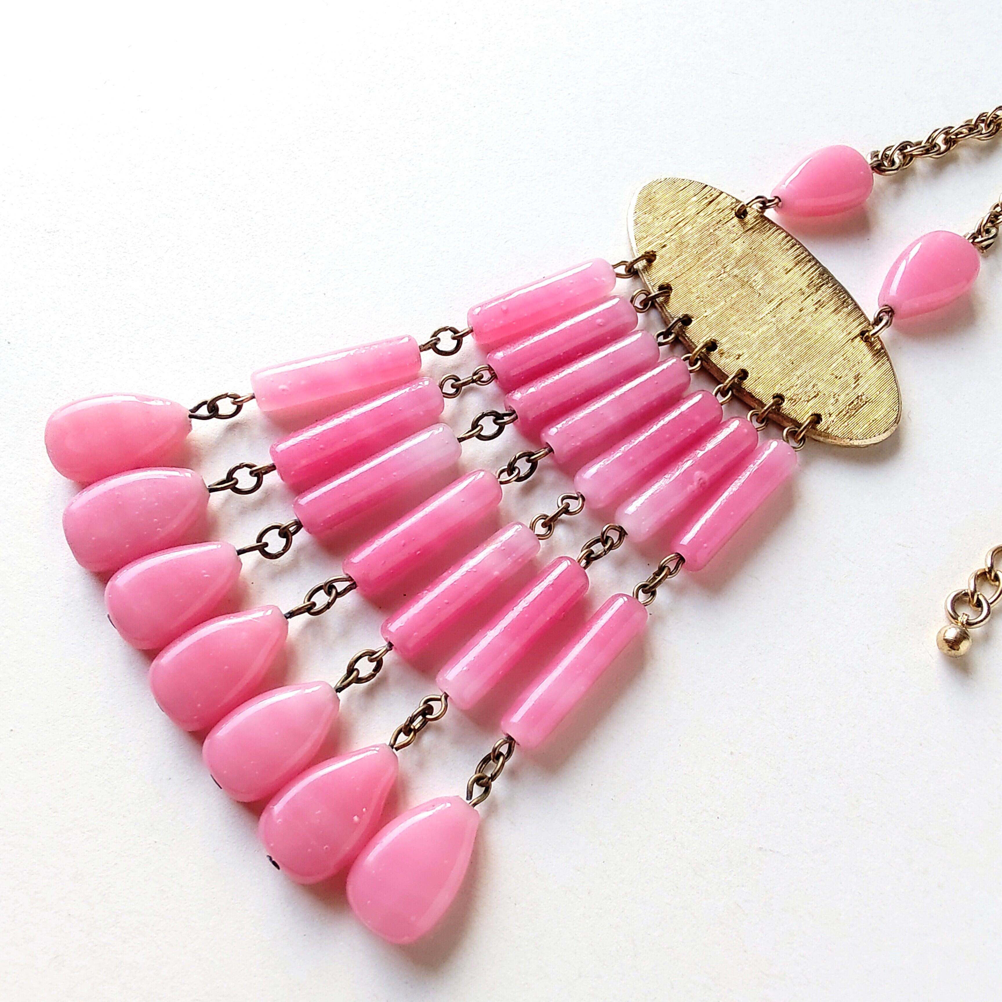 楕円型のゴールドメタルにホワイトとピンクのマーブルチェコガラスが垂れ下がったデザインのヴィンテージネックレスです。