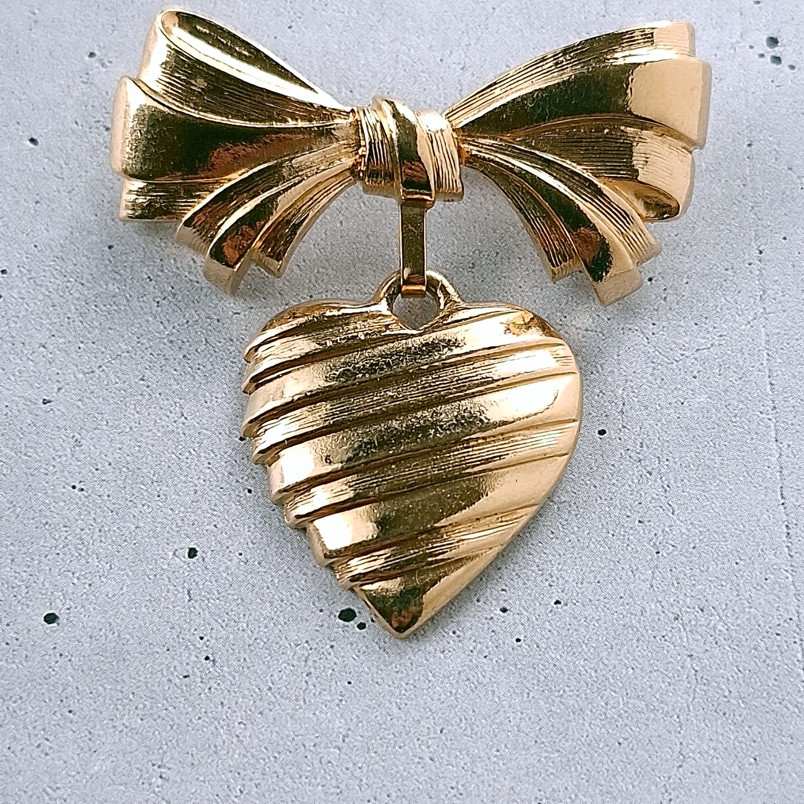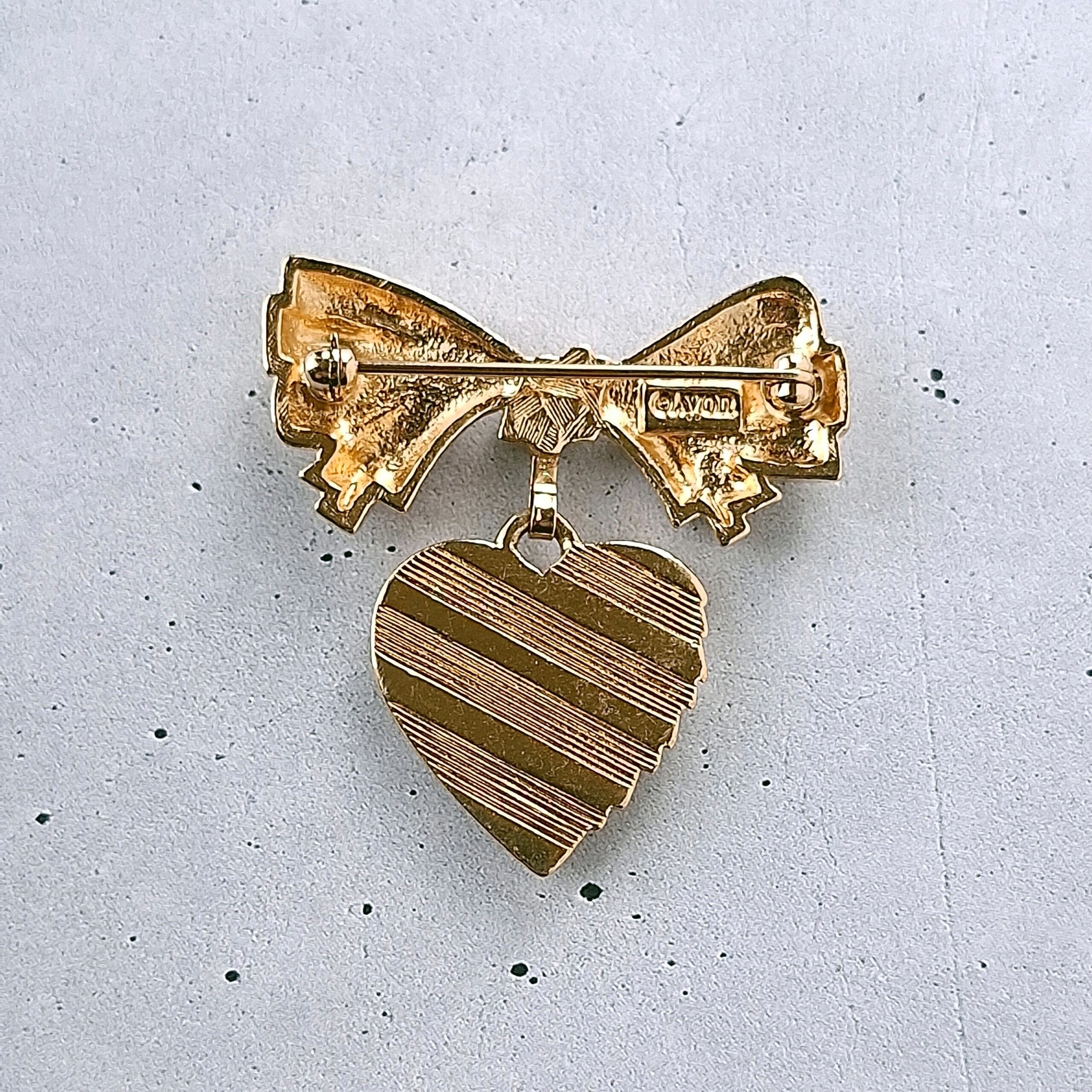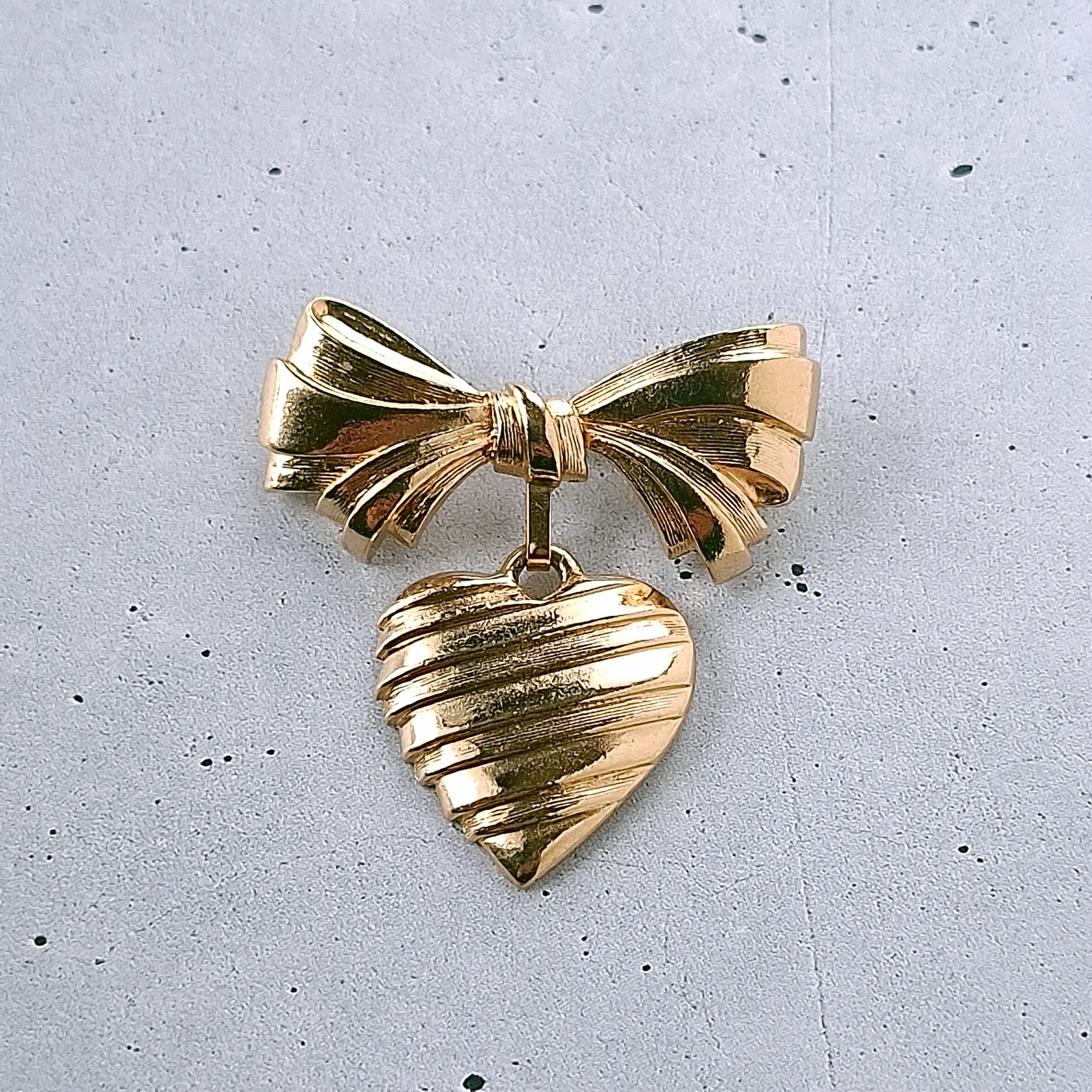 1886年アメリカのニューヨークにて小さな香水会社を創業、1971年に本格的にコスチュームジュエリーの製作を開始したAvon(エイボン)の1986年に販売された“sentiment pin”のゴールドメタルのリボンの下でハートが揺れるデザインのヴィンテージブローチです。