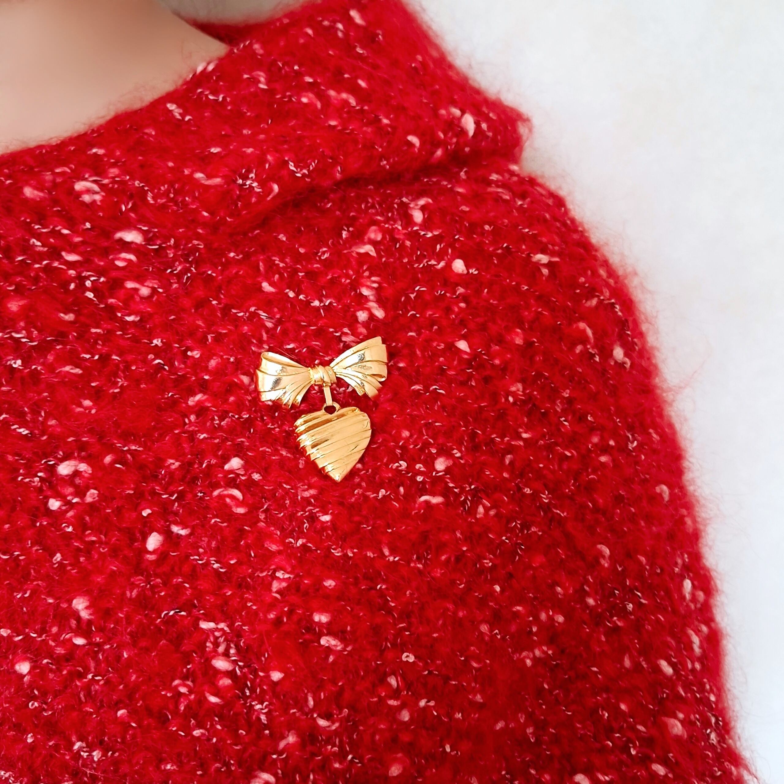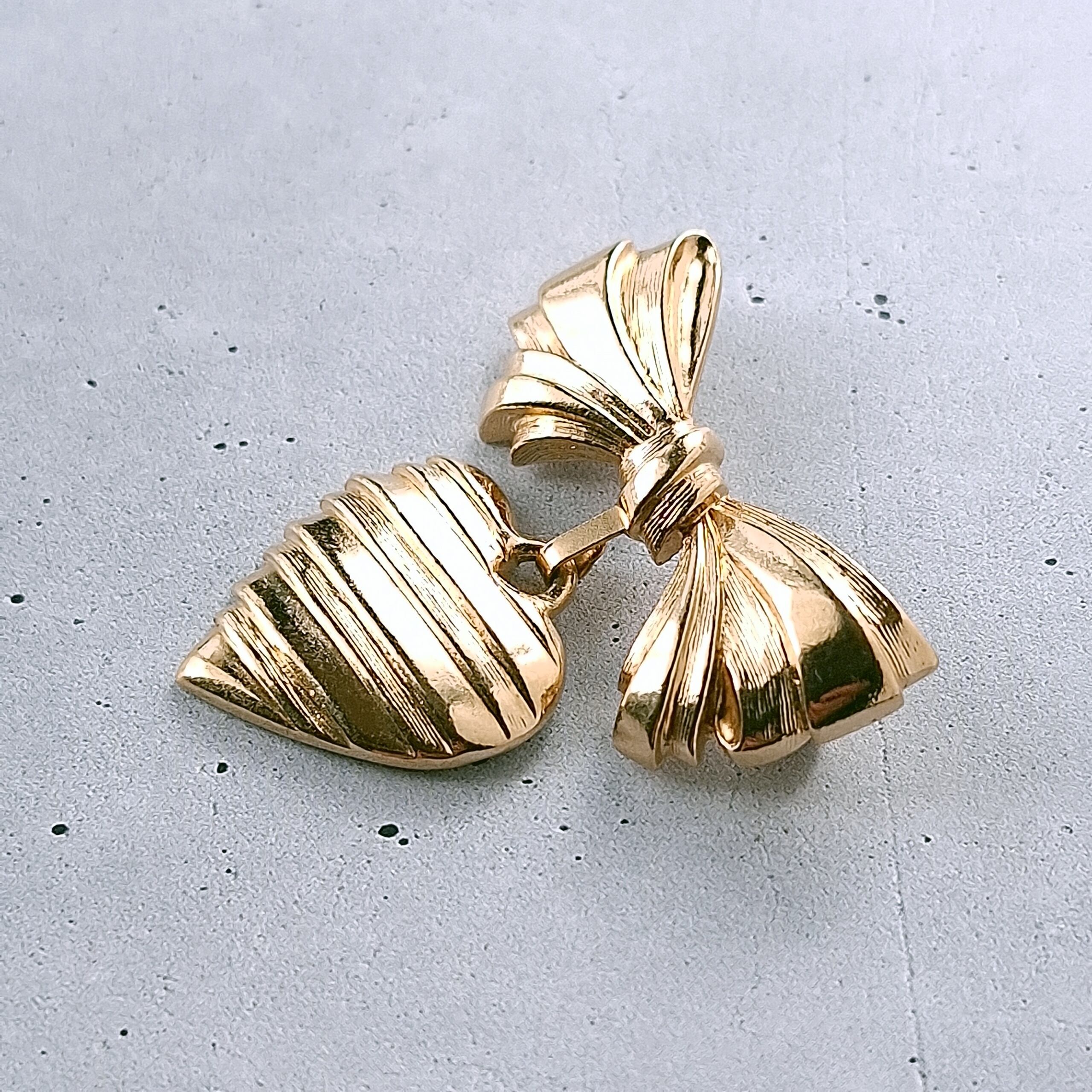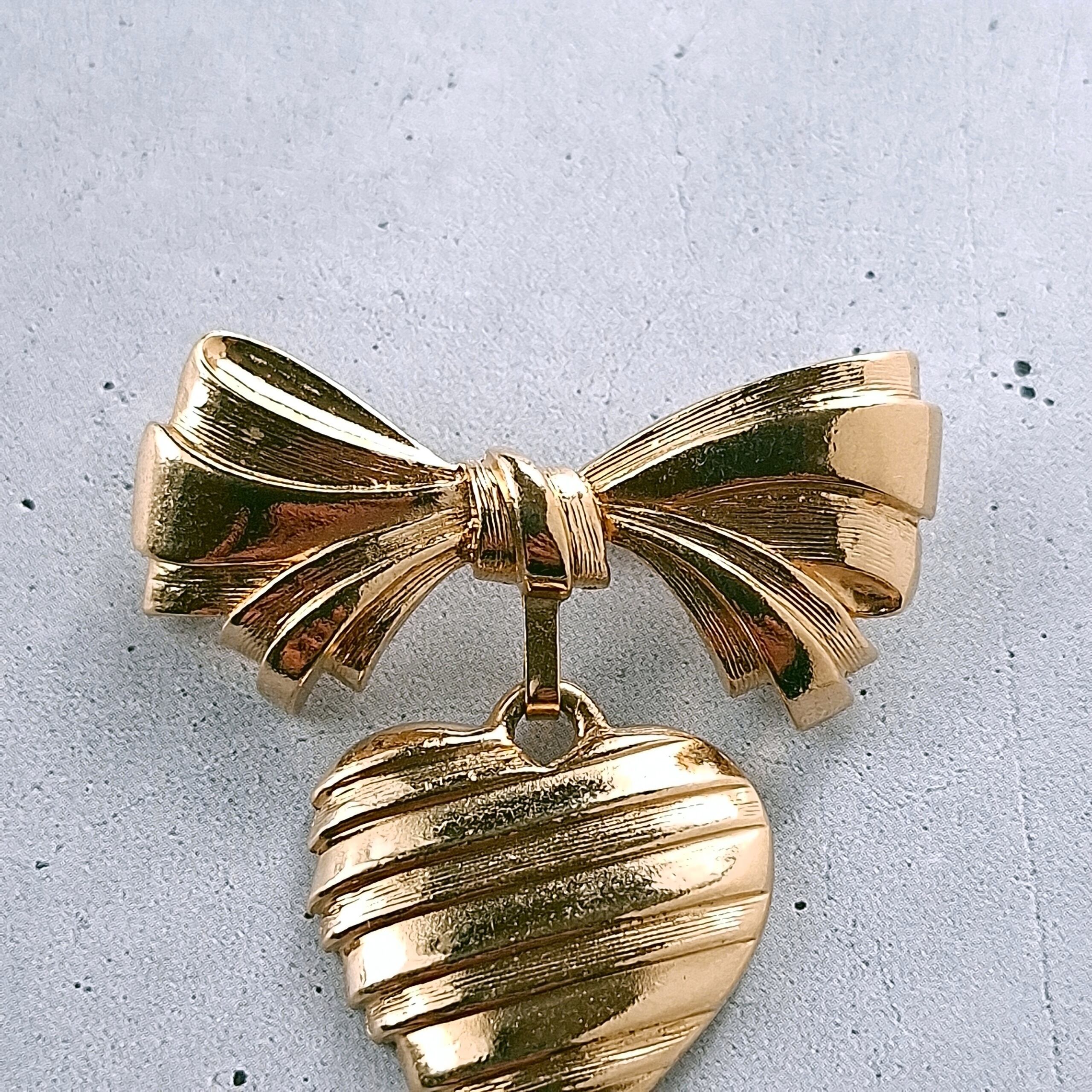 1886年アメリカのニューヨークにて小さな香水会社を創業、1971年に本格的にコスチュームジュエリーの製作を開始したAvon(エイボン)の1986年に販売された“sentiment pin”のゴールドメタルのリボンの下でハートが揺れるデザインのヴィンテージブローチです。