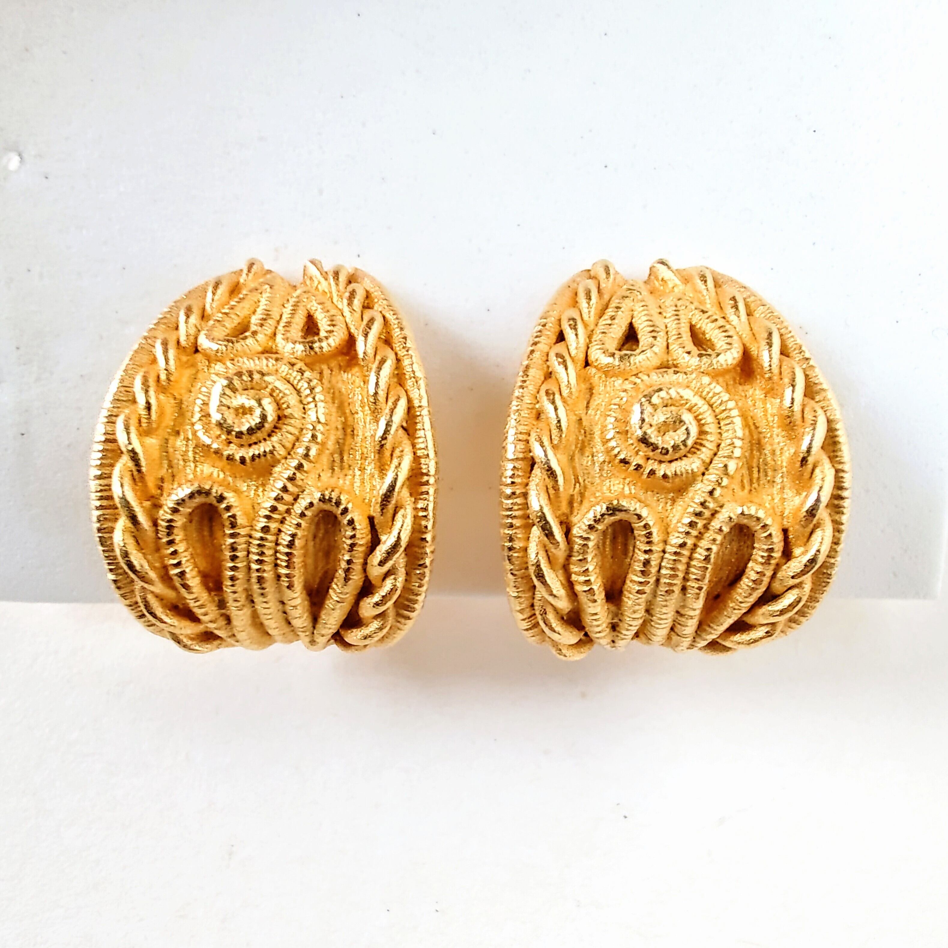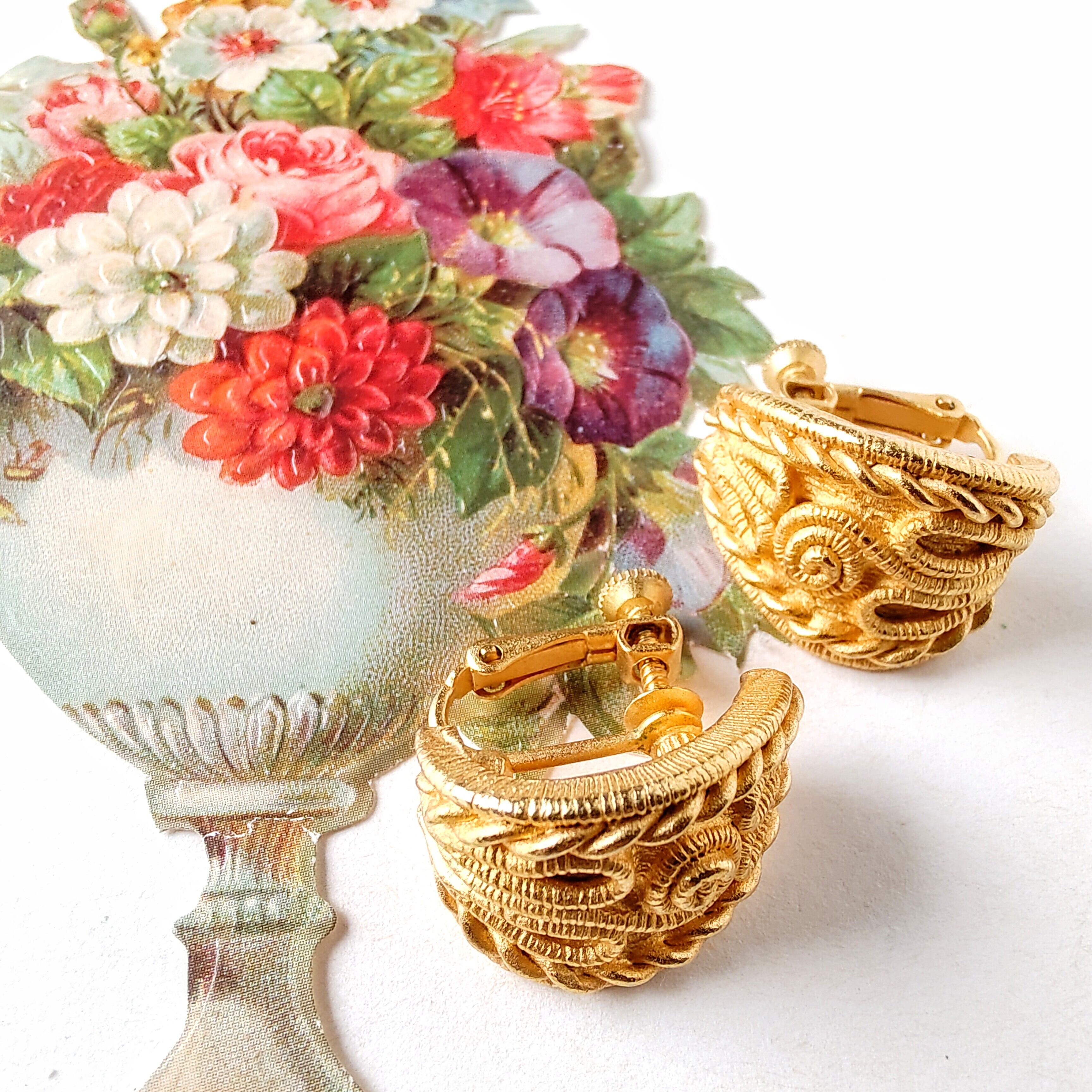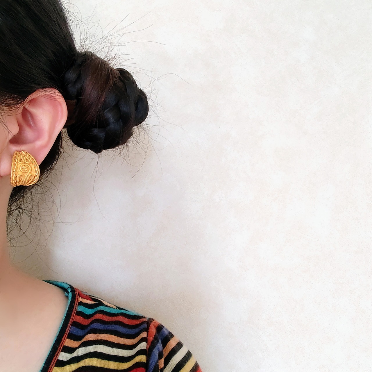 ロープ状のゴールドメタルでエキゾチックな模様が描かれたハーフフープのヴィンテージイヤリングです。