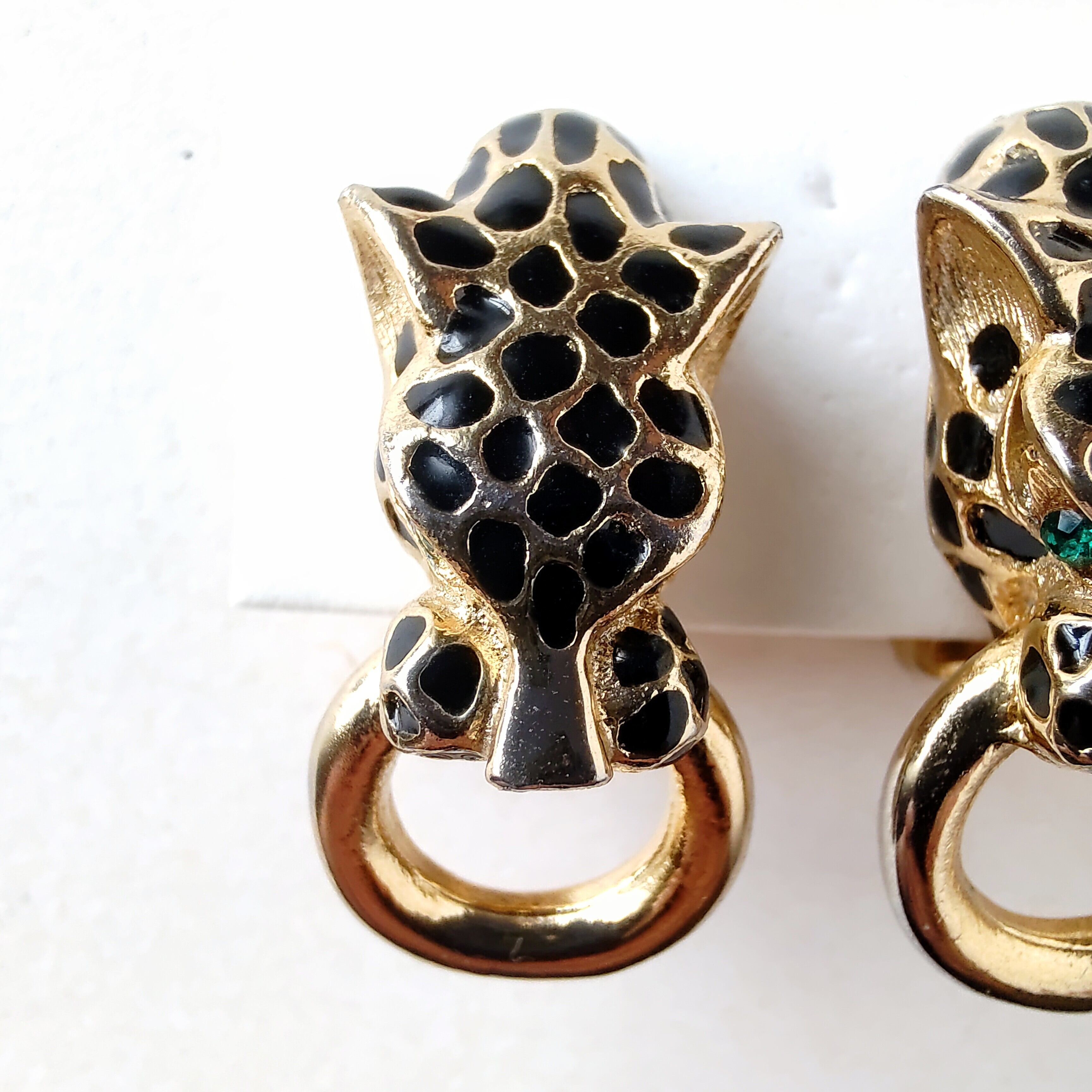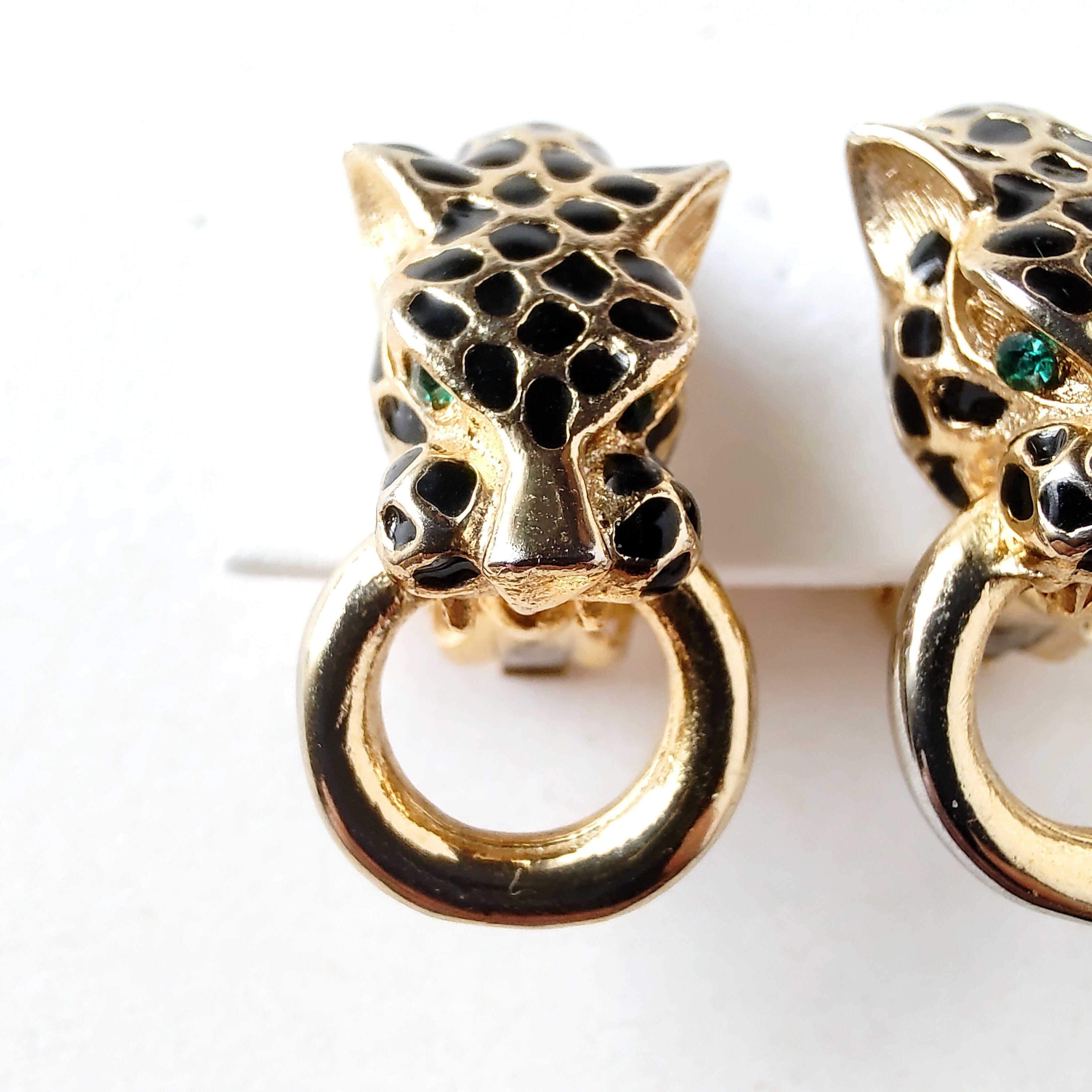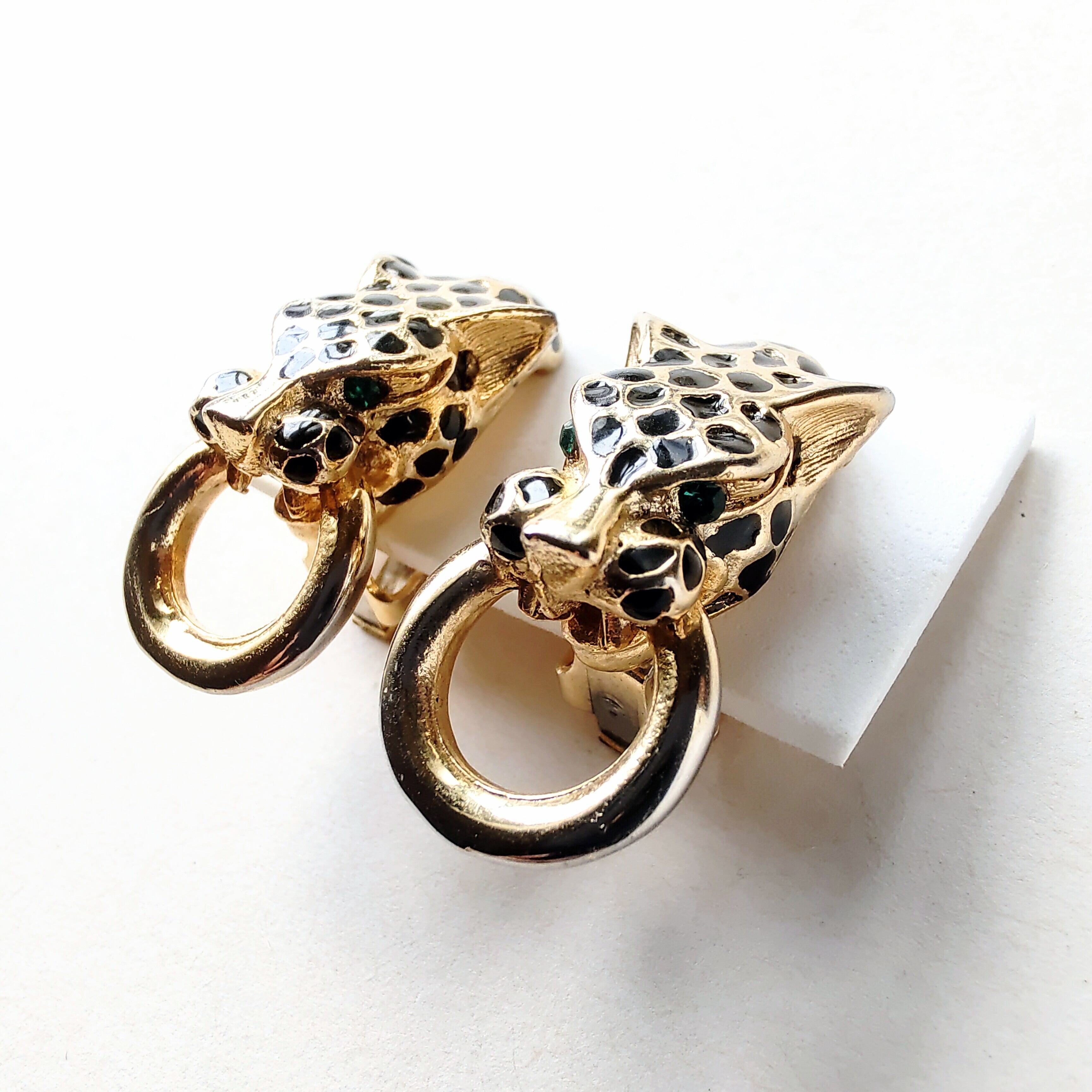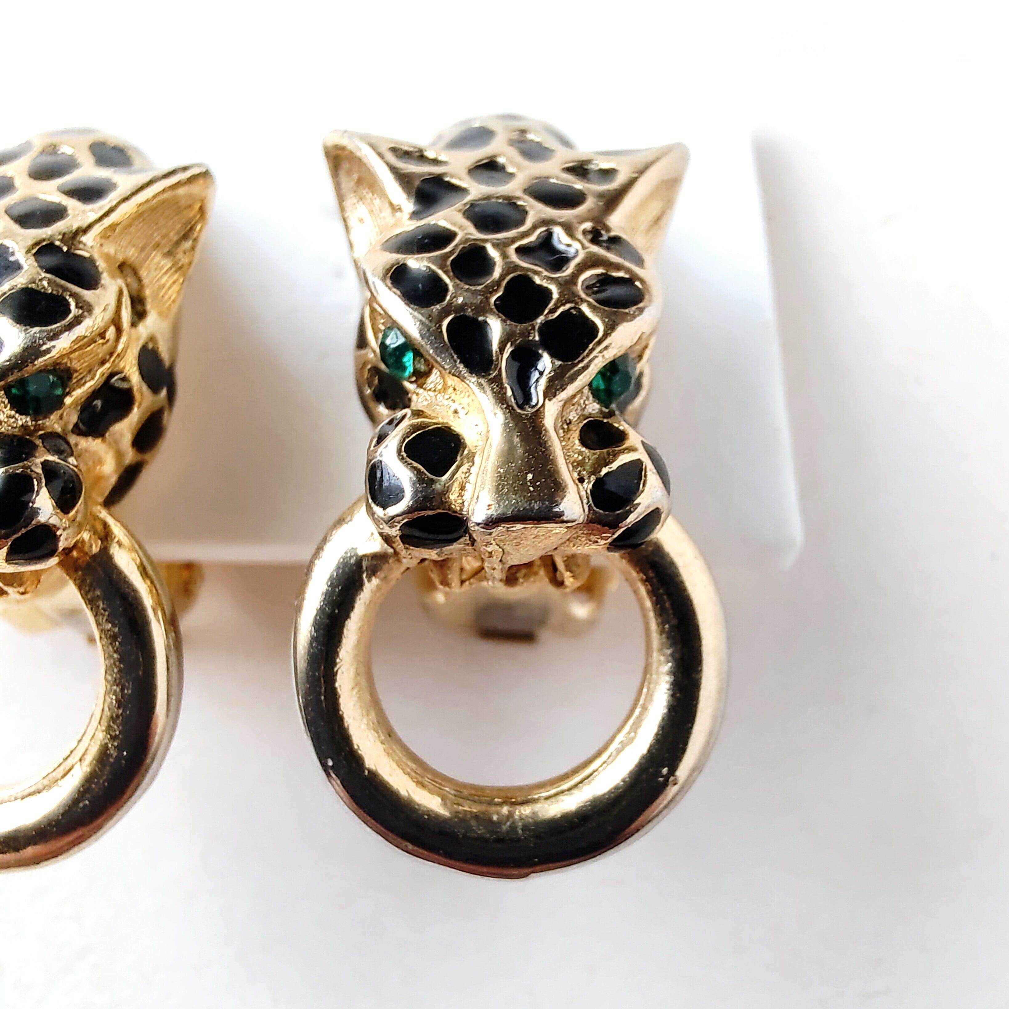 グリーンのラインストーンの瞳のゴールドメタルのヒョウが輪っかを咥えたドアノッカーデザインのヴィンテージイヤリングです。