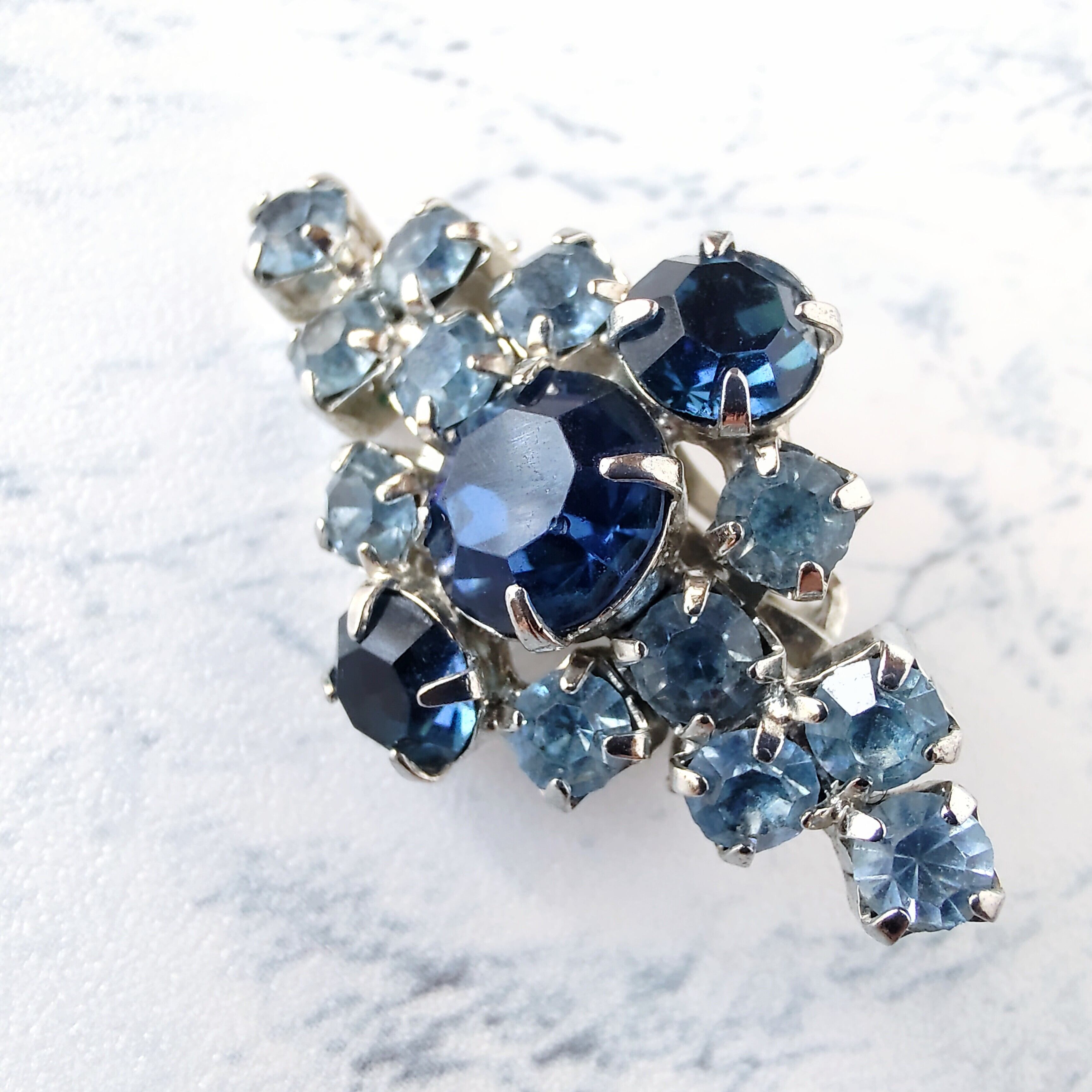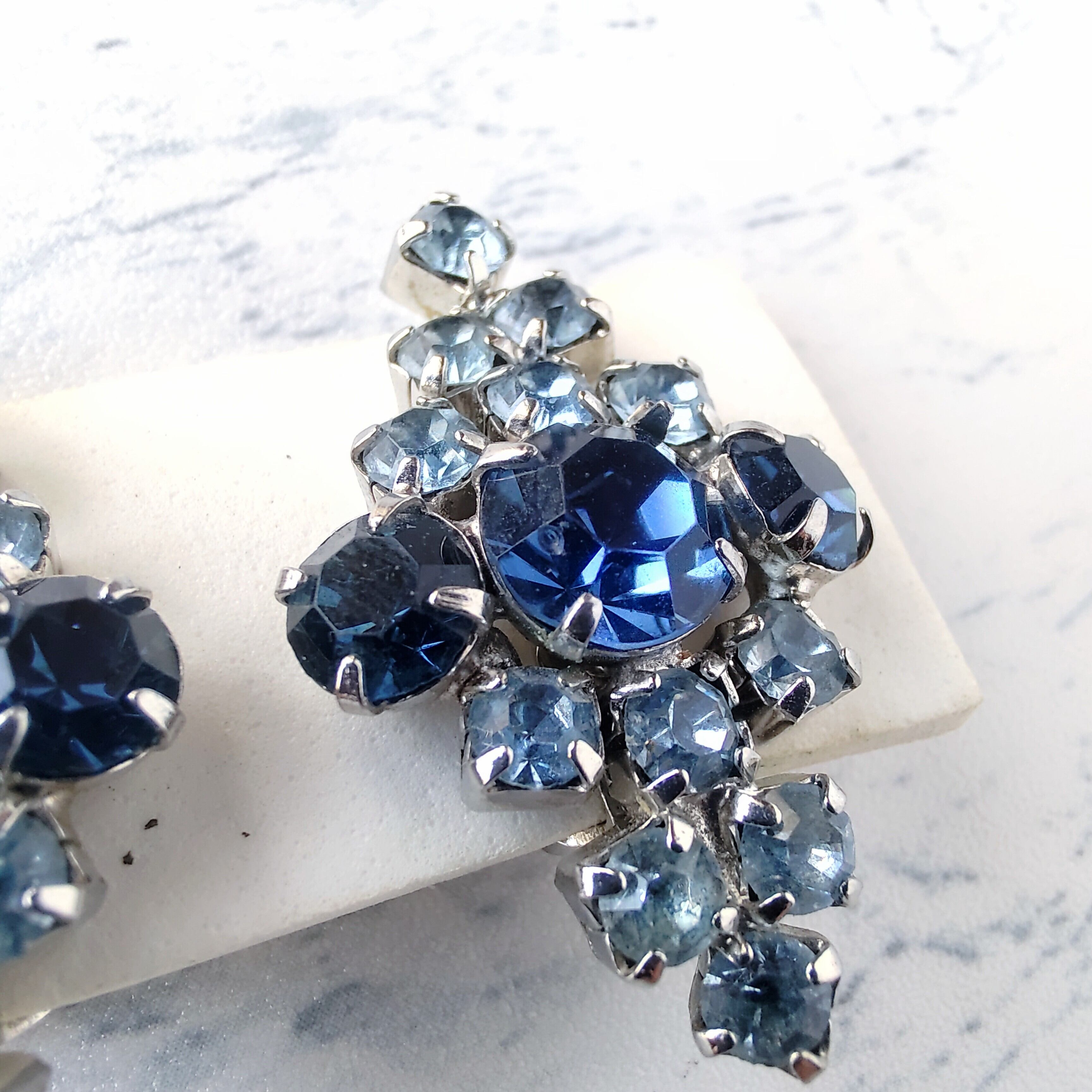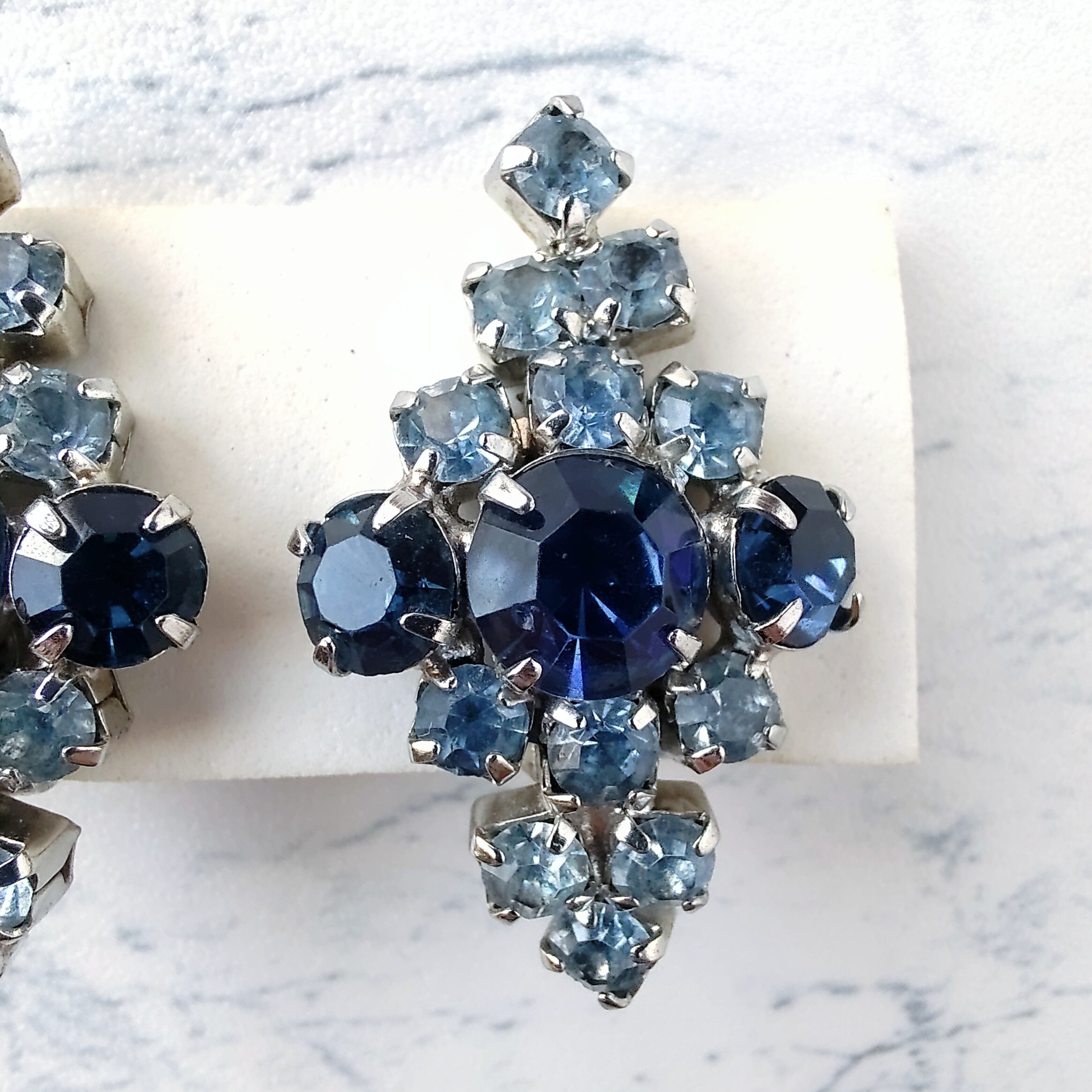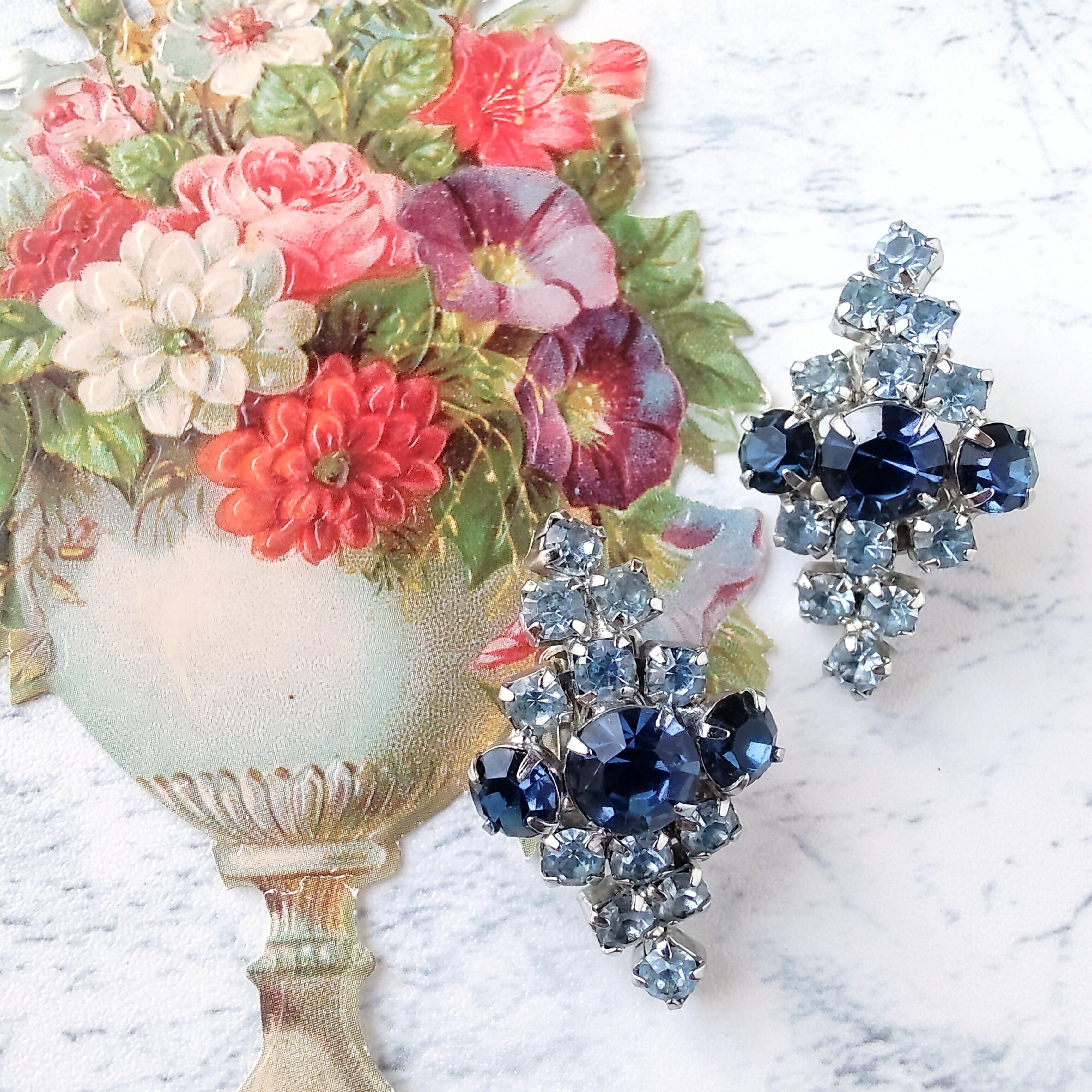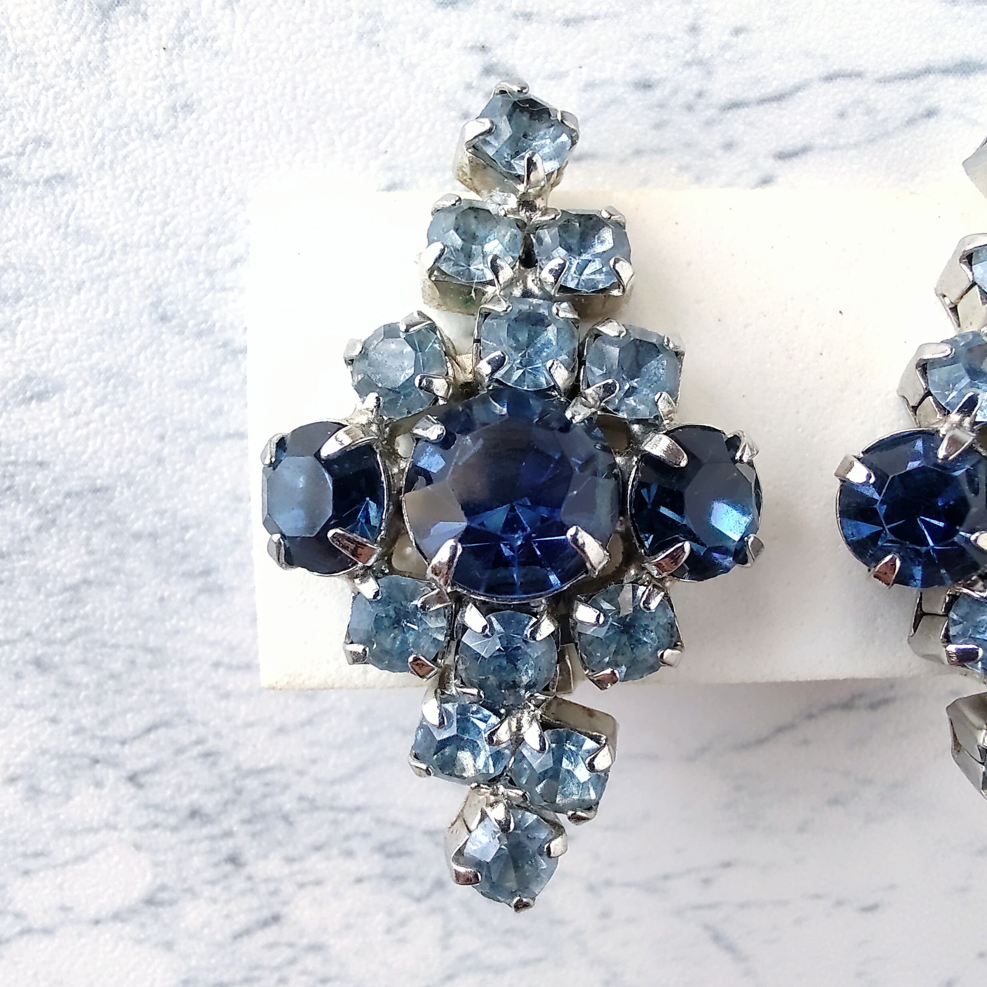 ブルーとライトブルーのラインストーンが菱形になったデザインのヴィンテージイヤリングです。