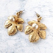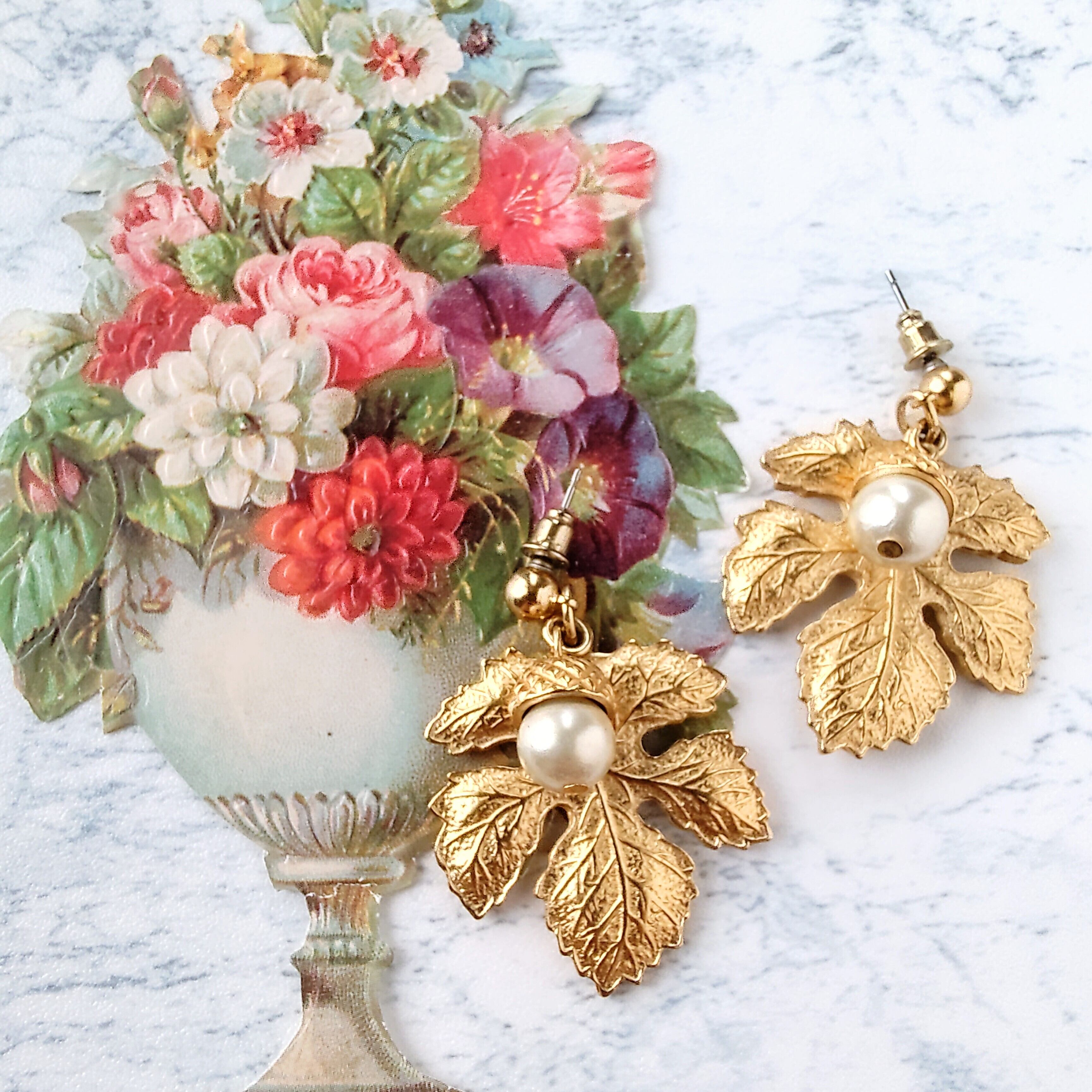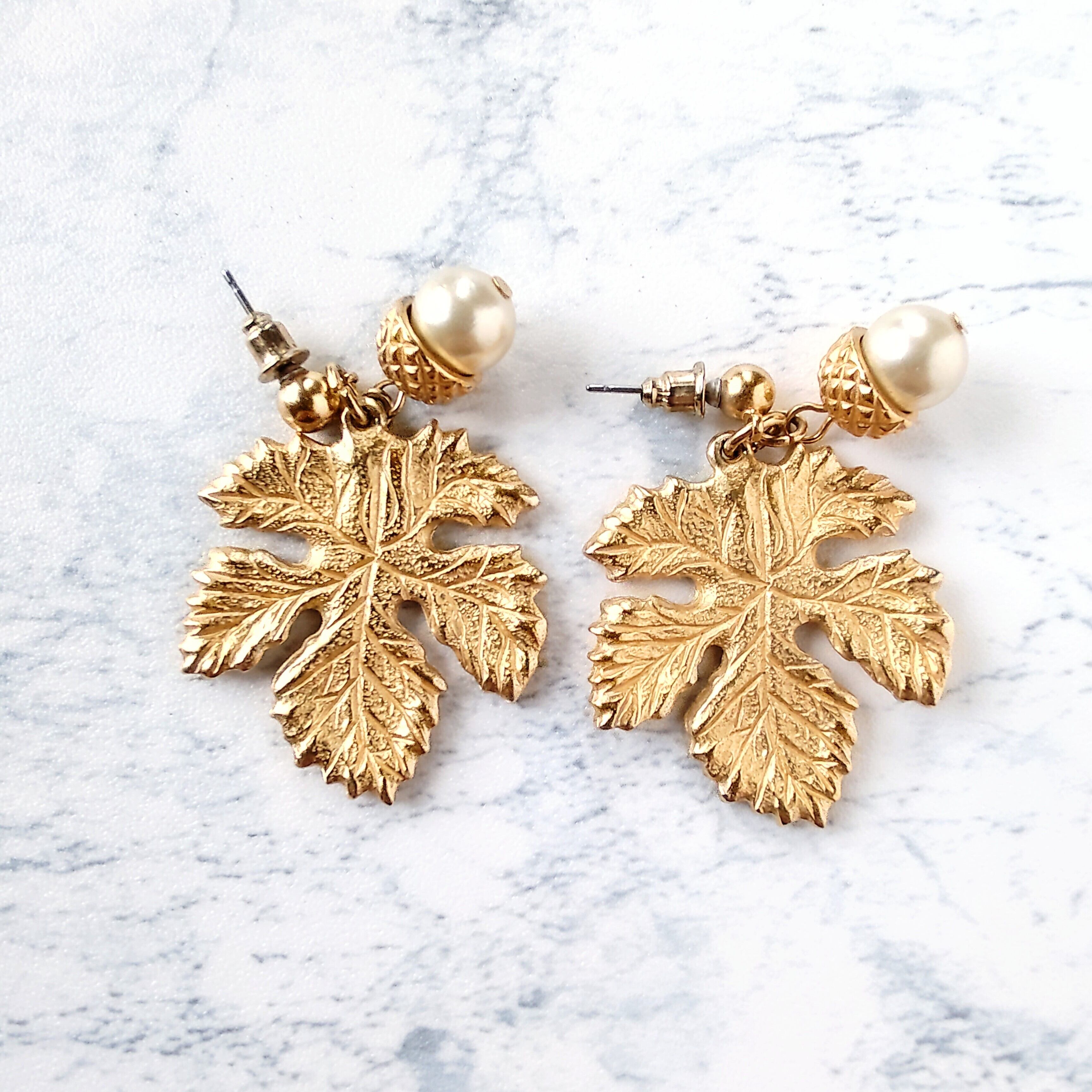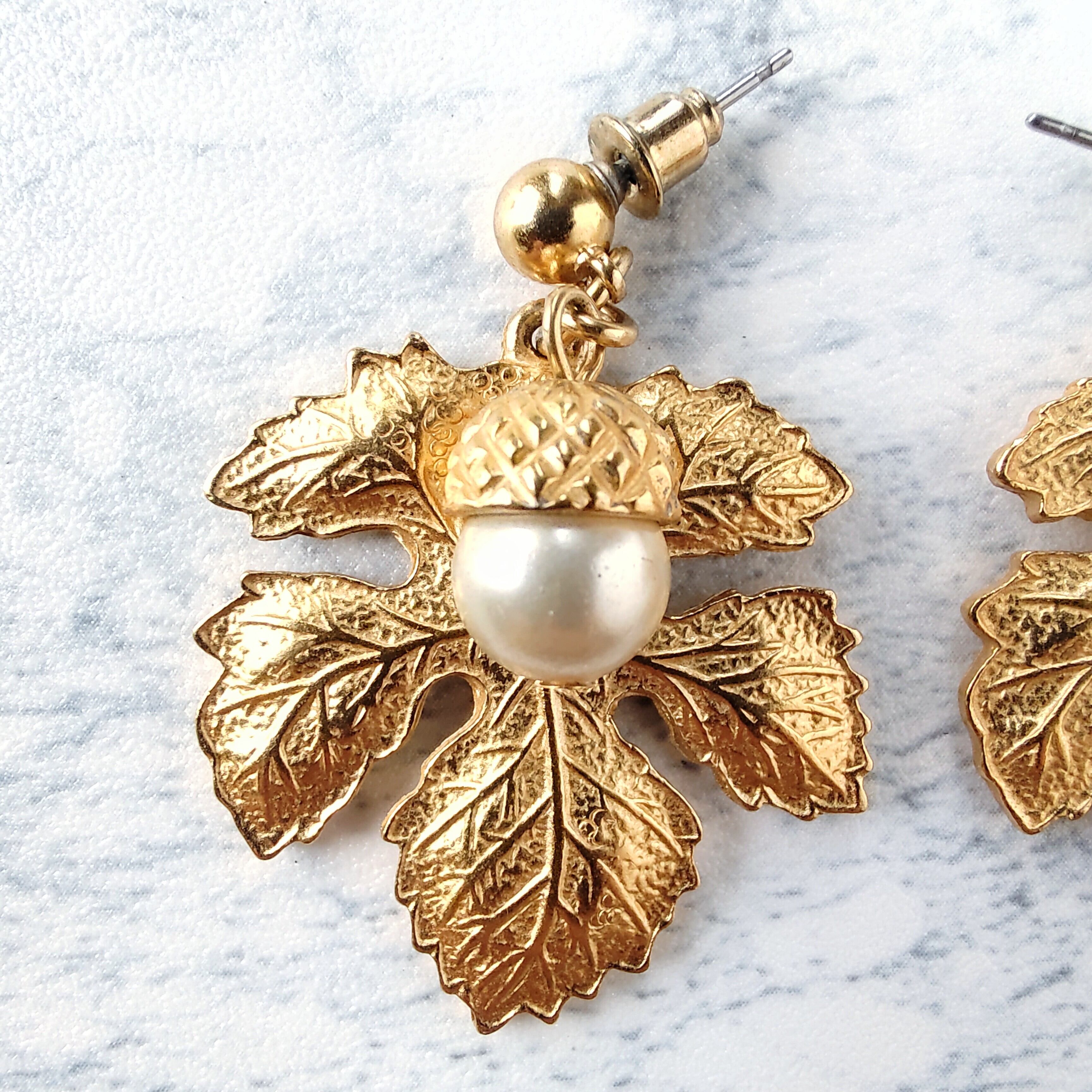 ゴールドメタルのメープルリーフとフェイクパールのどんぐりが揺れるデザインのヴィンテージピアスです。