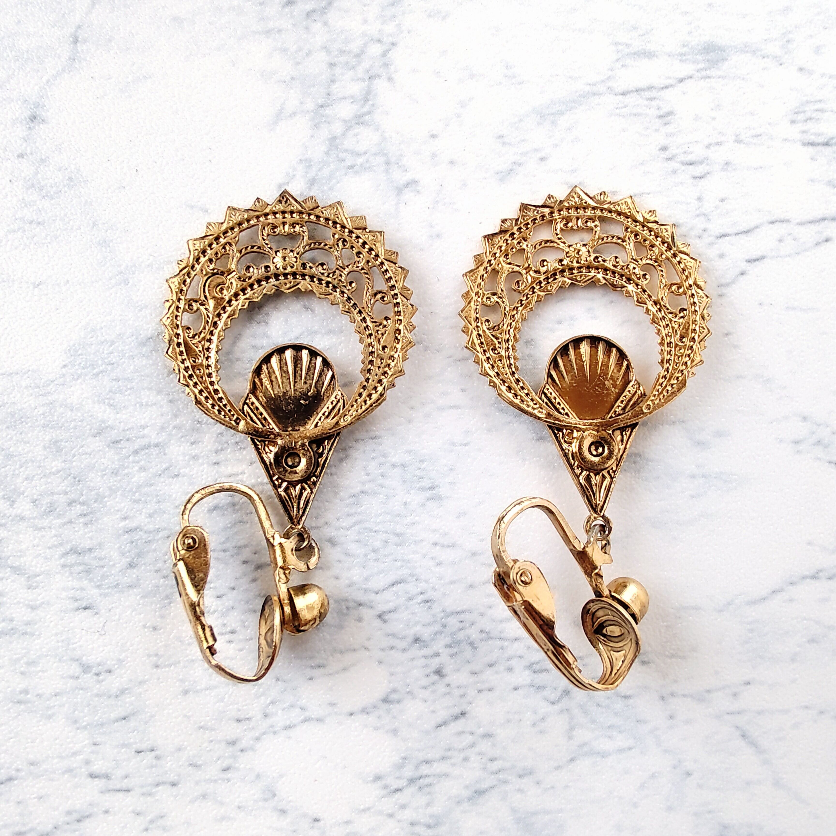 オリエンタルな透かしのゴールドメタルが揺れるデザインのヴィンテージイヤリングです。