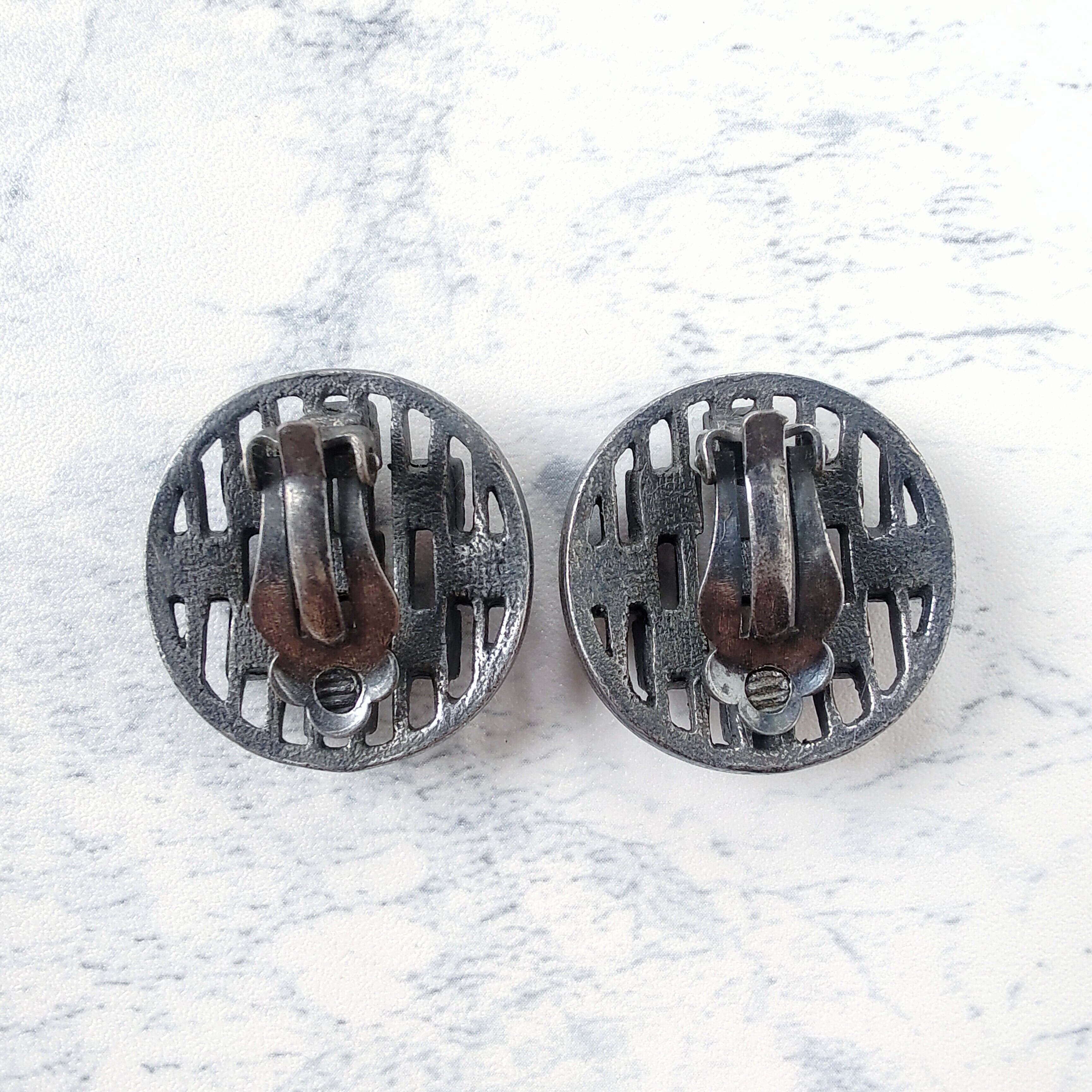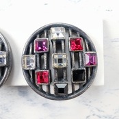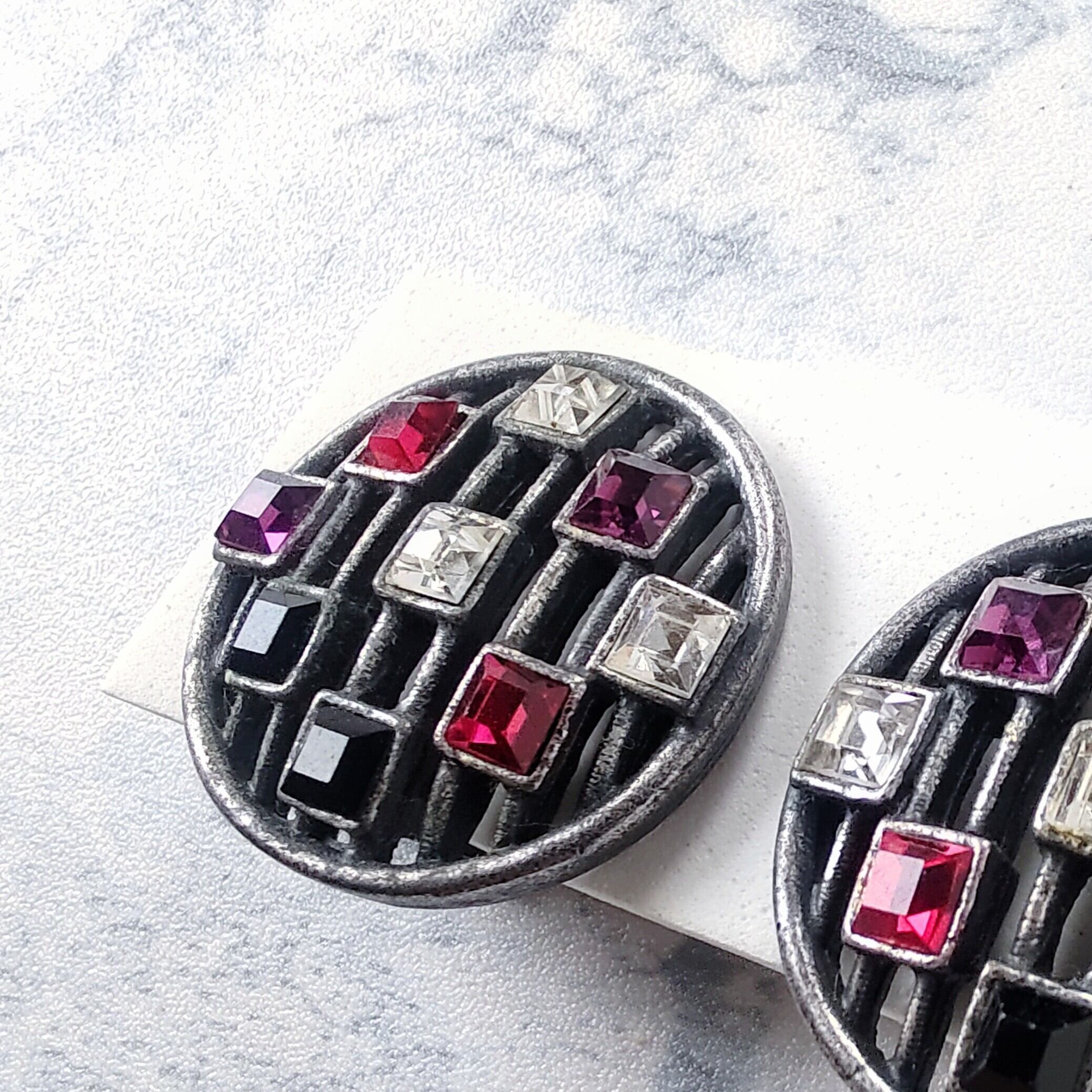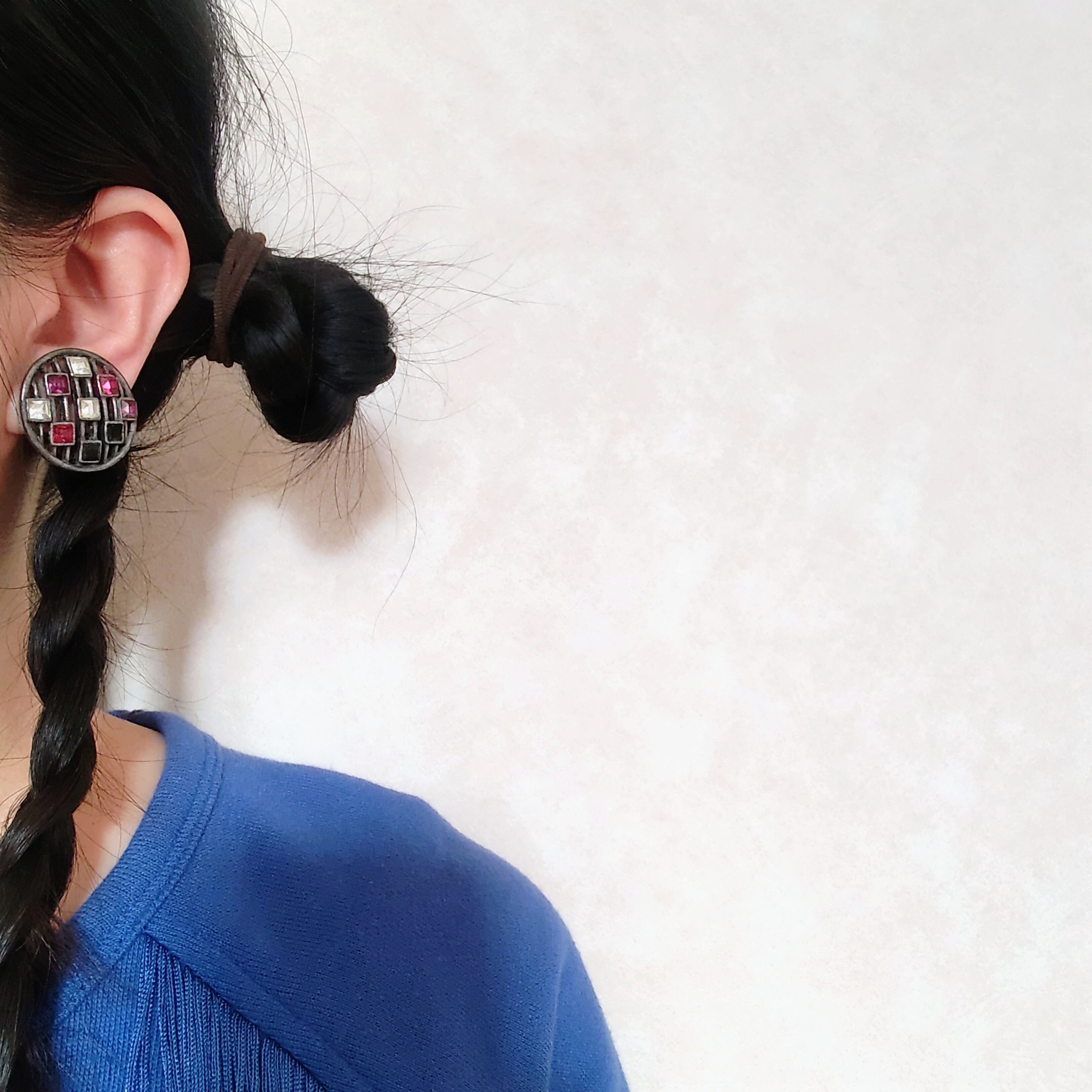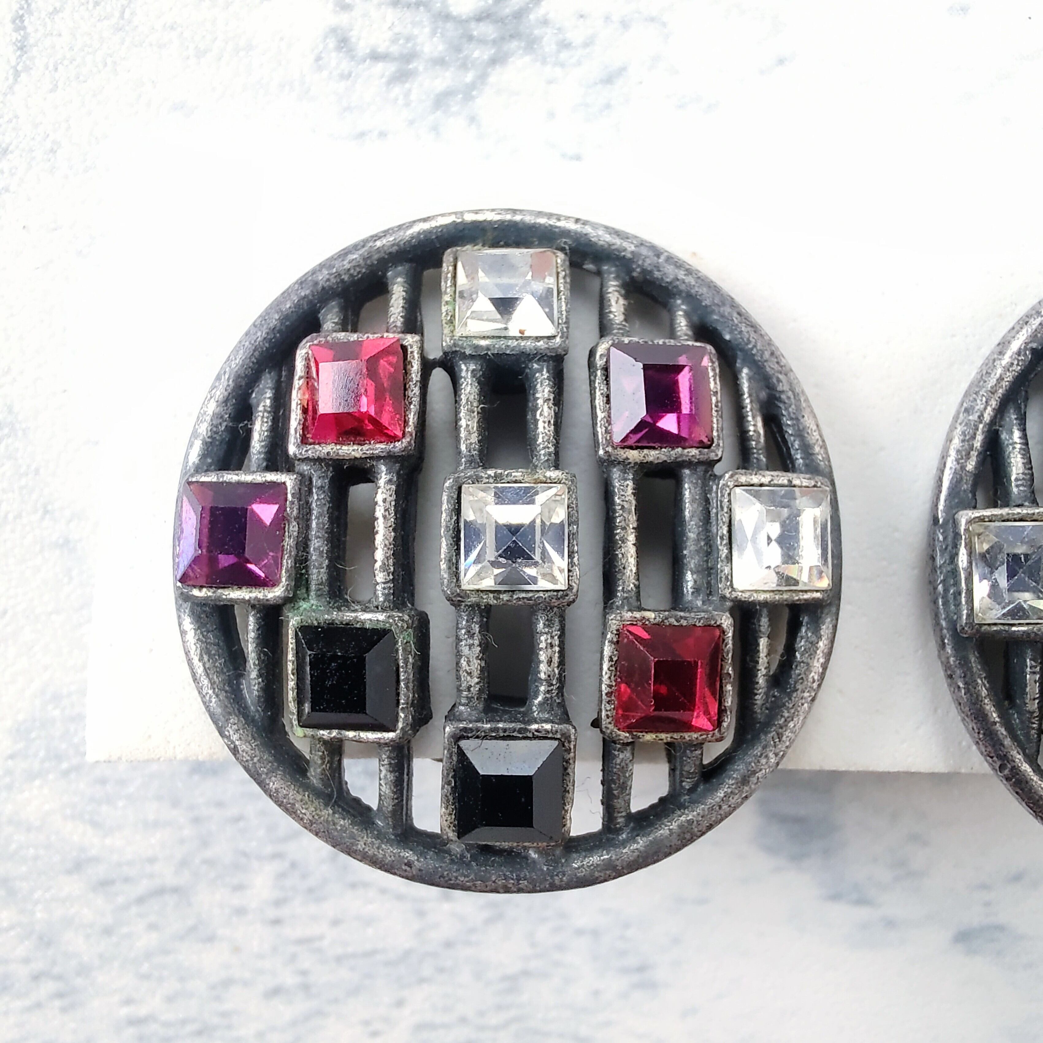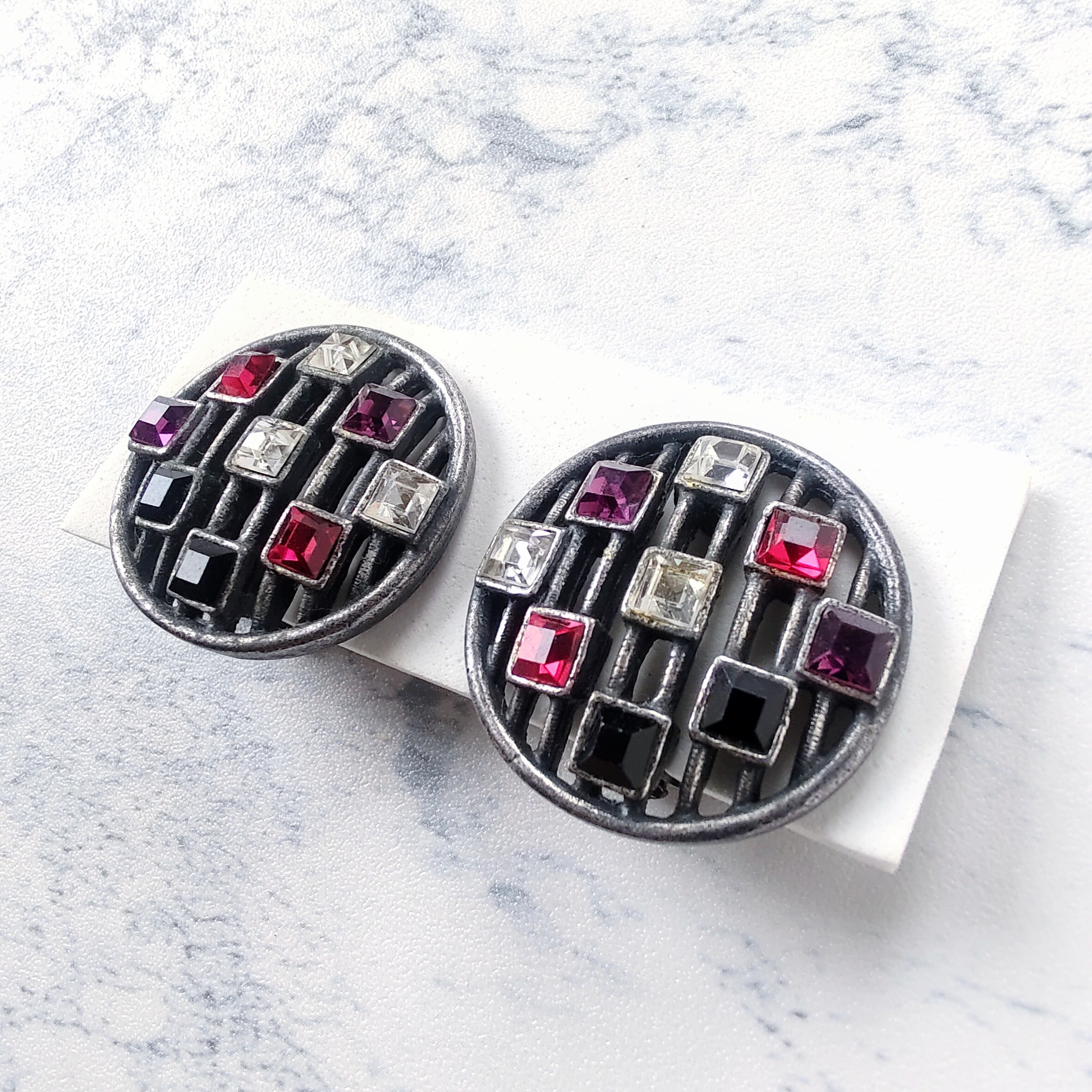 黒ずんだアンティーク調の格子デザインのラウンド型のシルバーメタルにクリア、レッドベリル、パープル、ジェットブラックのスクエア型のラインストーンがあしらわれたヴィンテージイヤリングです。