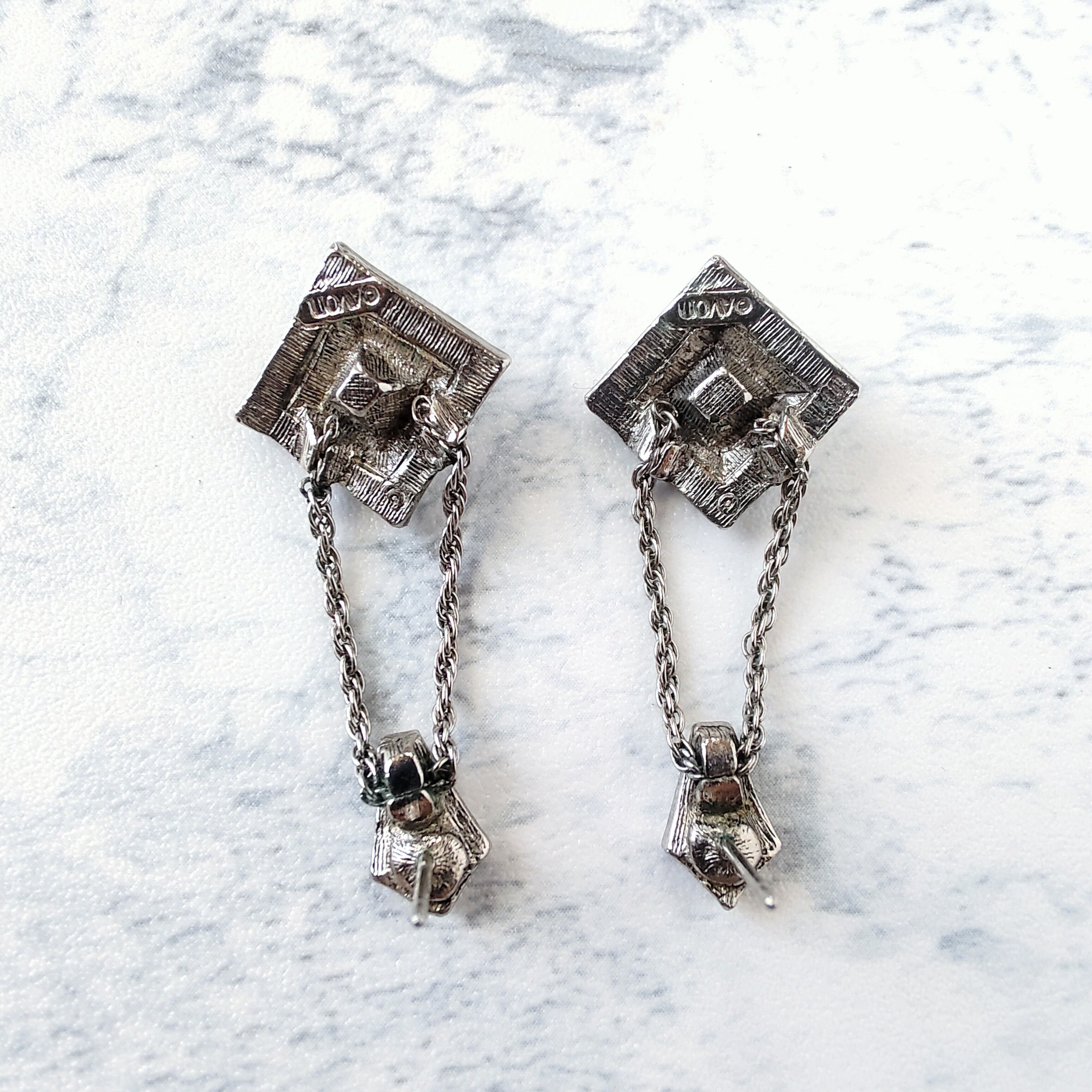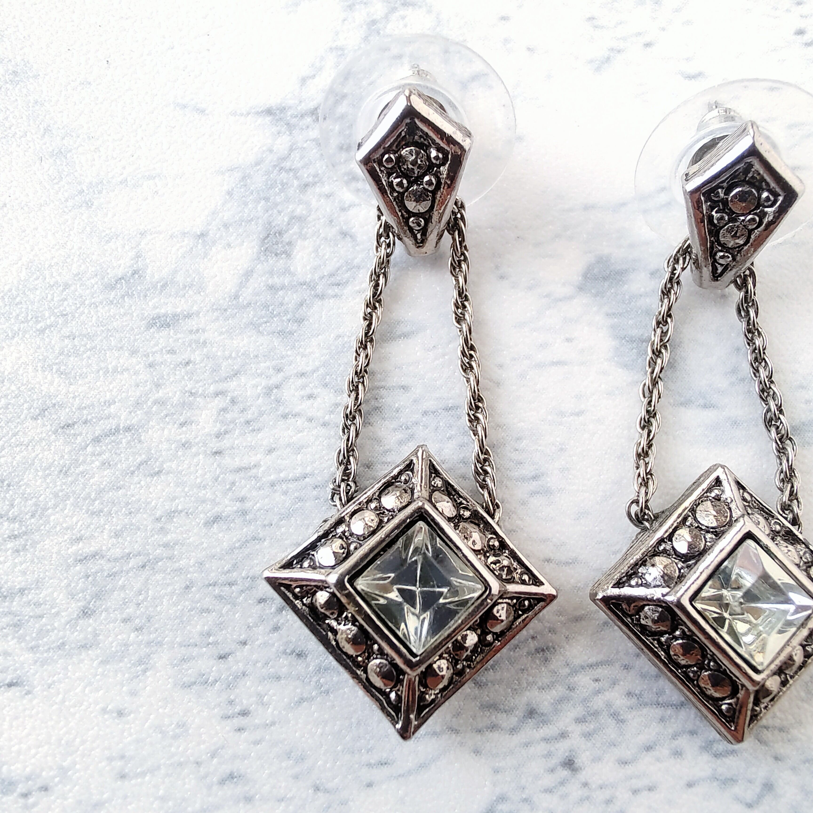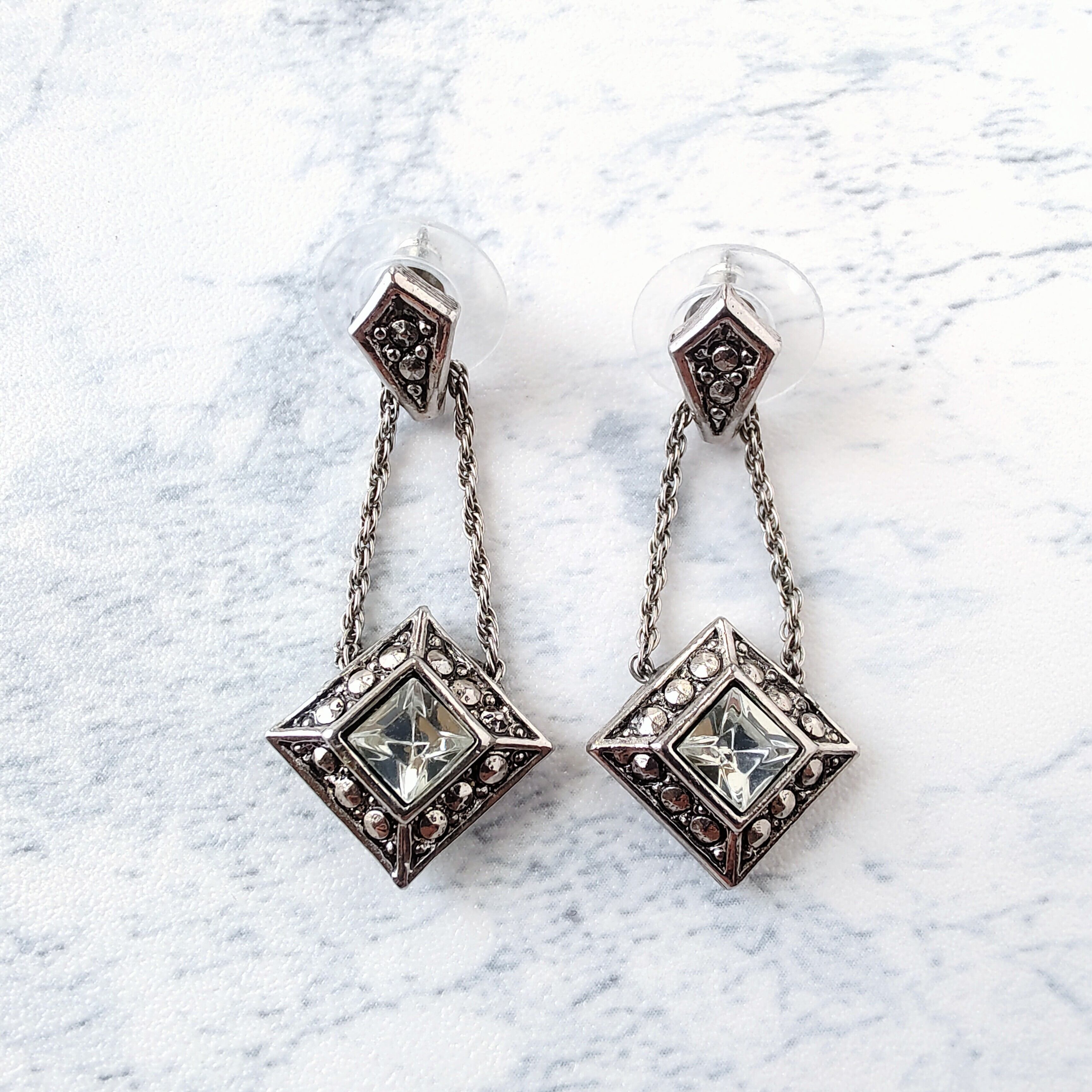 1886年アメリカのニューヨークにて小さな香水会社を創業、1971年に本格的にコスチュームジュエリーの製作を開始したAvon(エイボン)の1992年に販売された“Sleek Drop”のクリアラインストーンがあしらわれたマーカサイトを模したシルバーメタルが揺れるデザインのヴィンテージピアスです。