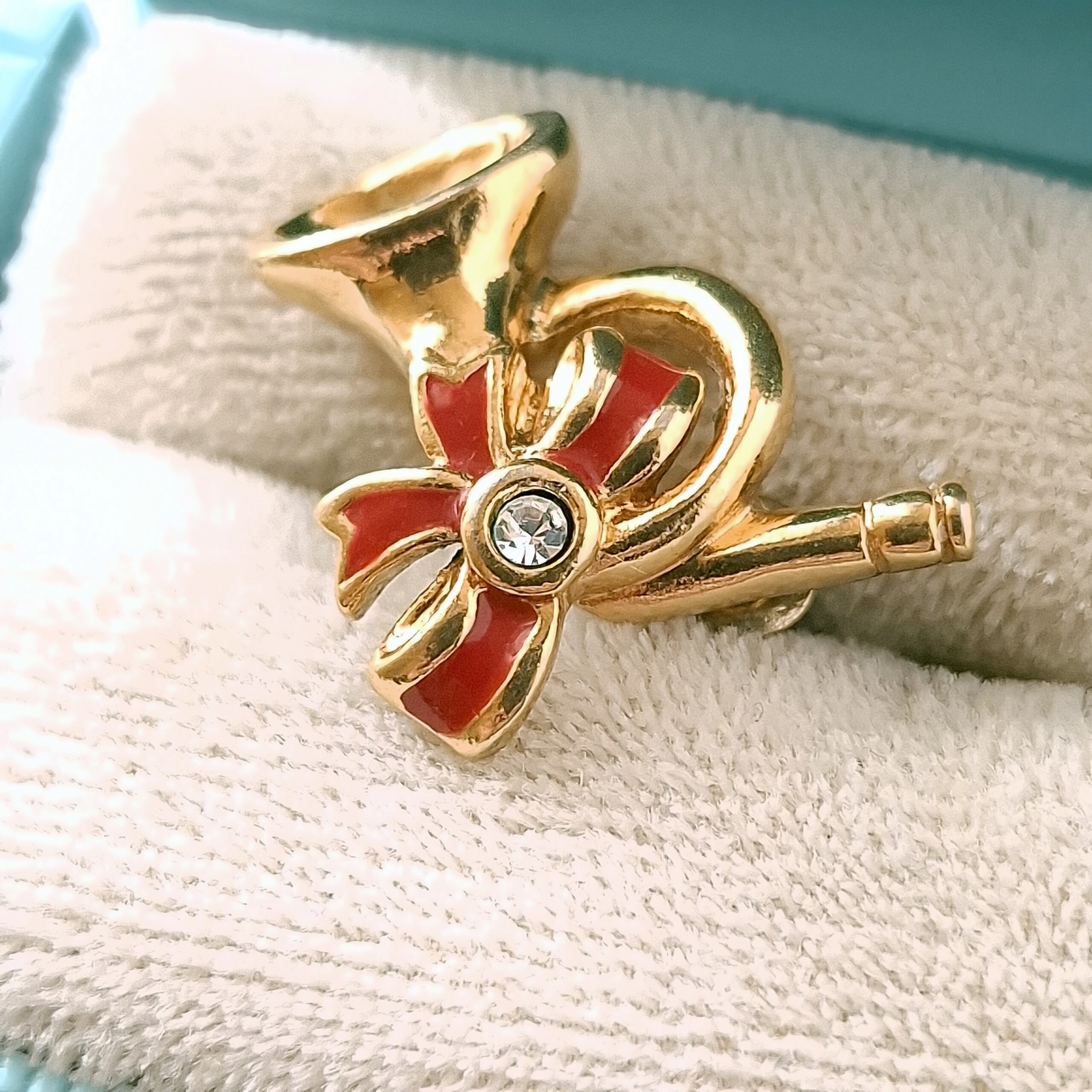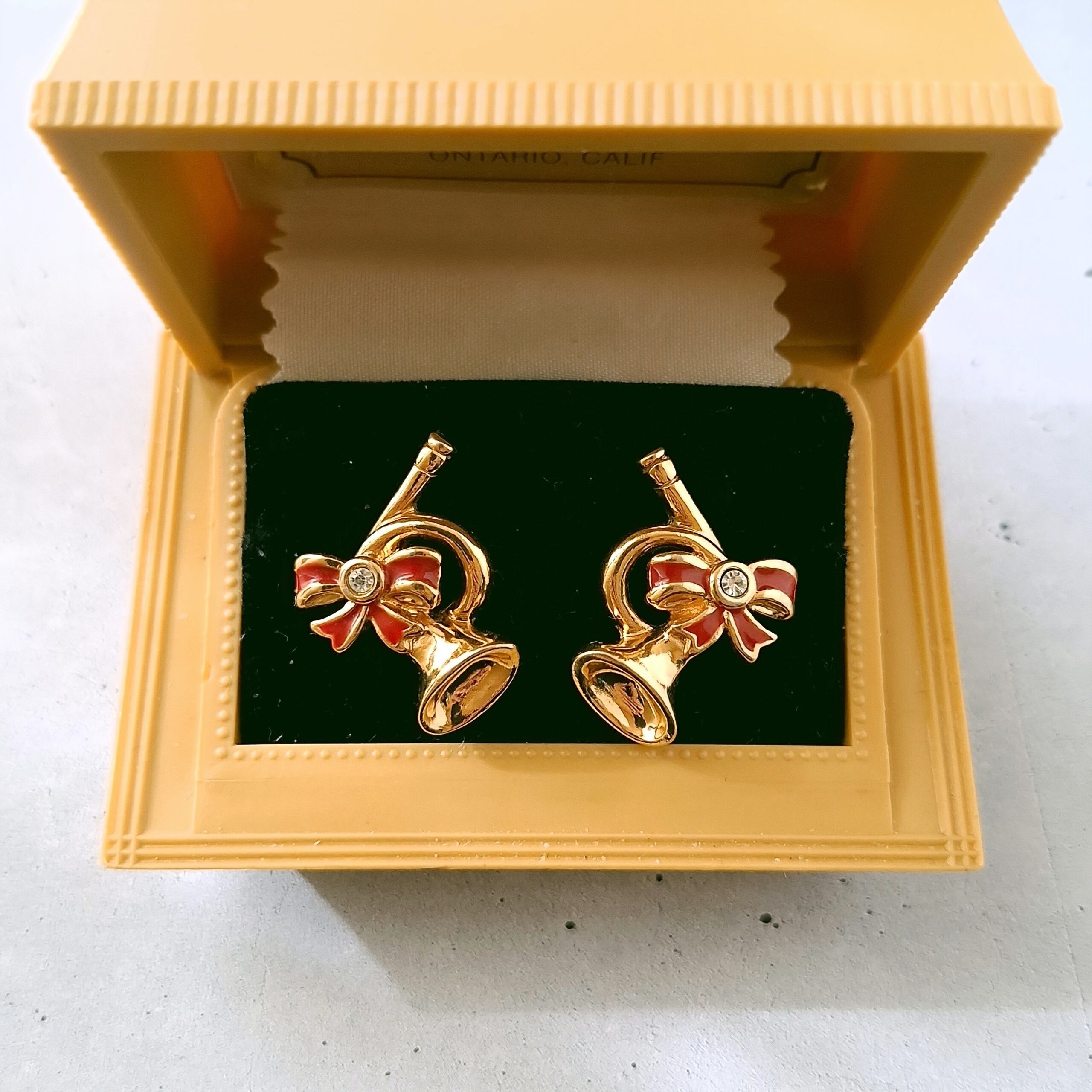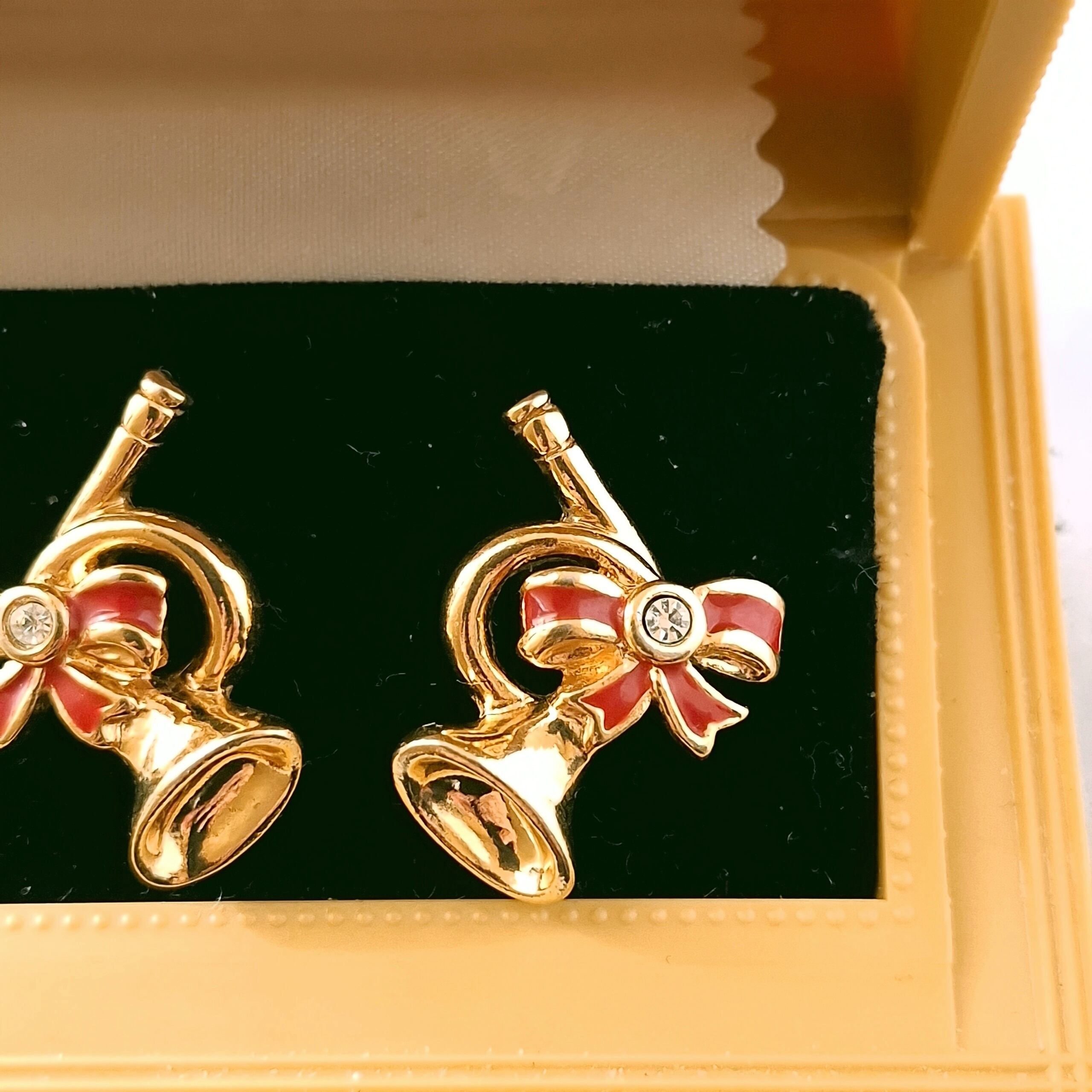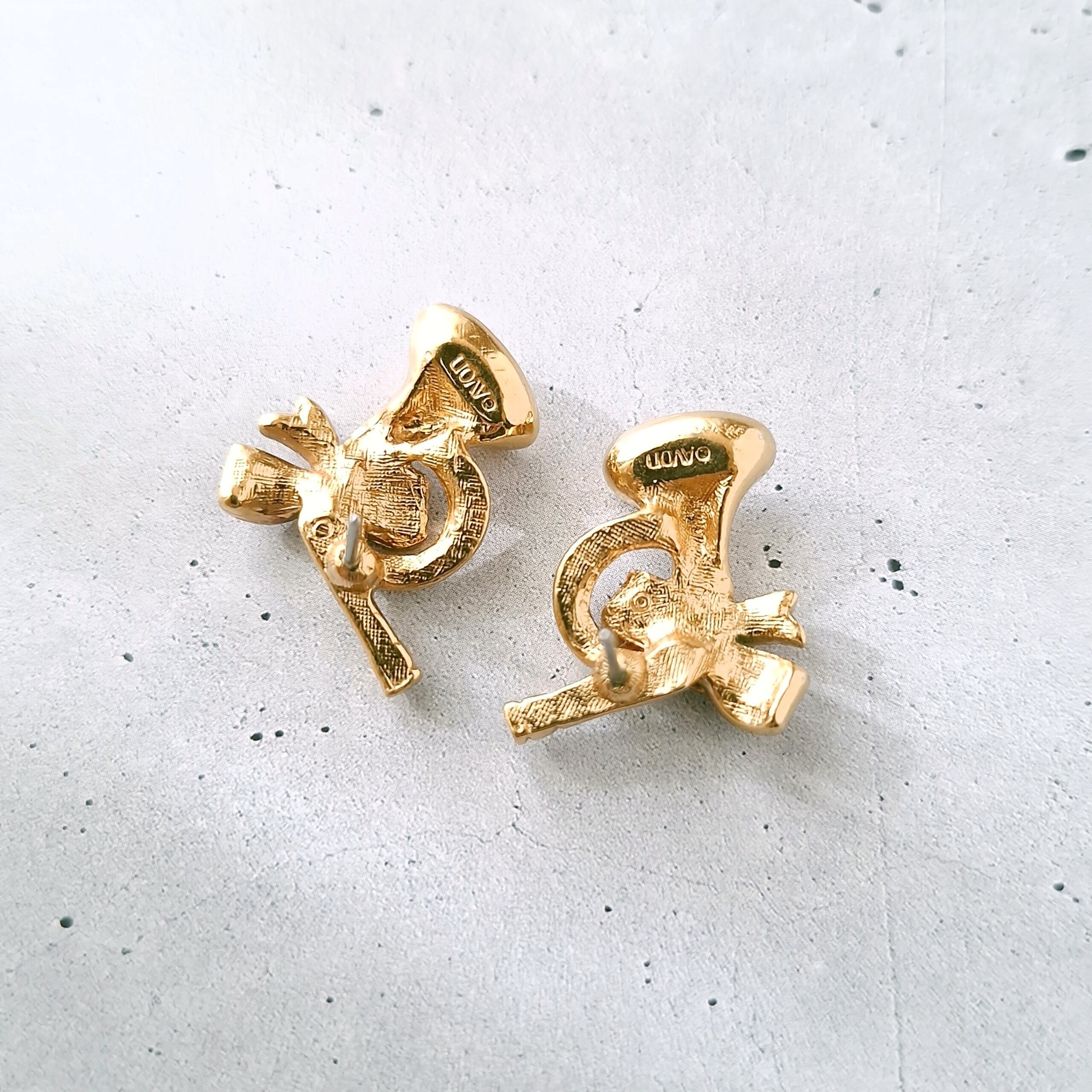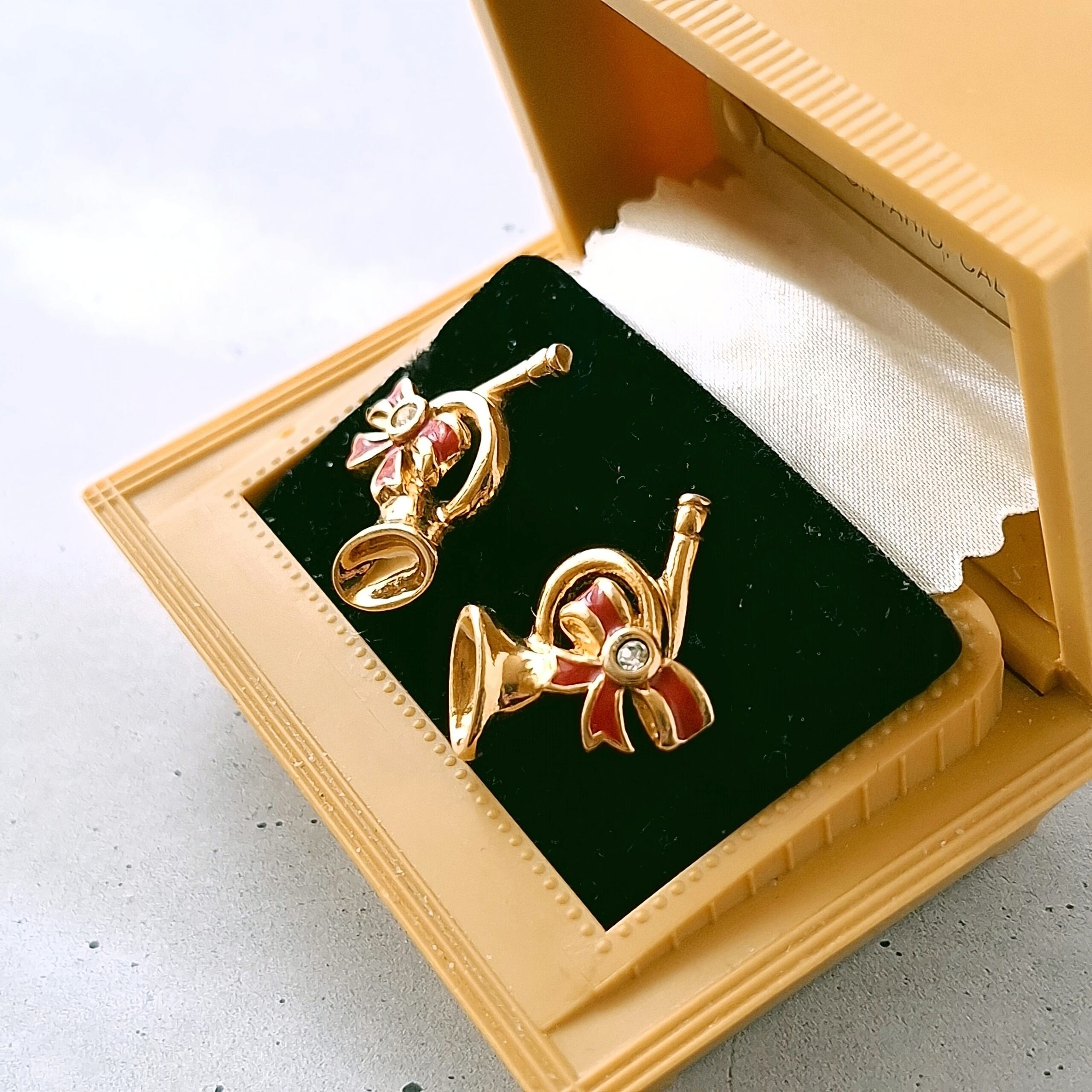 1886年アメリカのニューヨークにて小さな香水会社を創業、1971年に本格的にコスチュームジュエリーの製作を開始したAvon(エイボン)の1996年に販売された“FRENCH HORN”のレッドのエナメルで色付けされたクリアラインストーンがあしらわれたリボンが結ばれたゴールドメタルのフレンチホルンのヴィンテージピアスです。