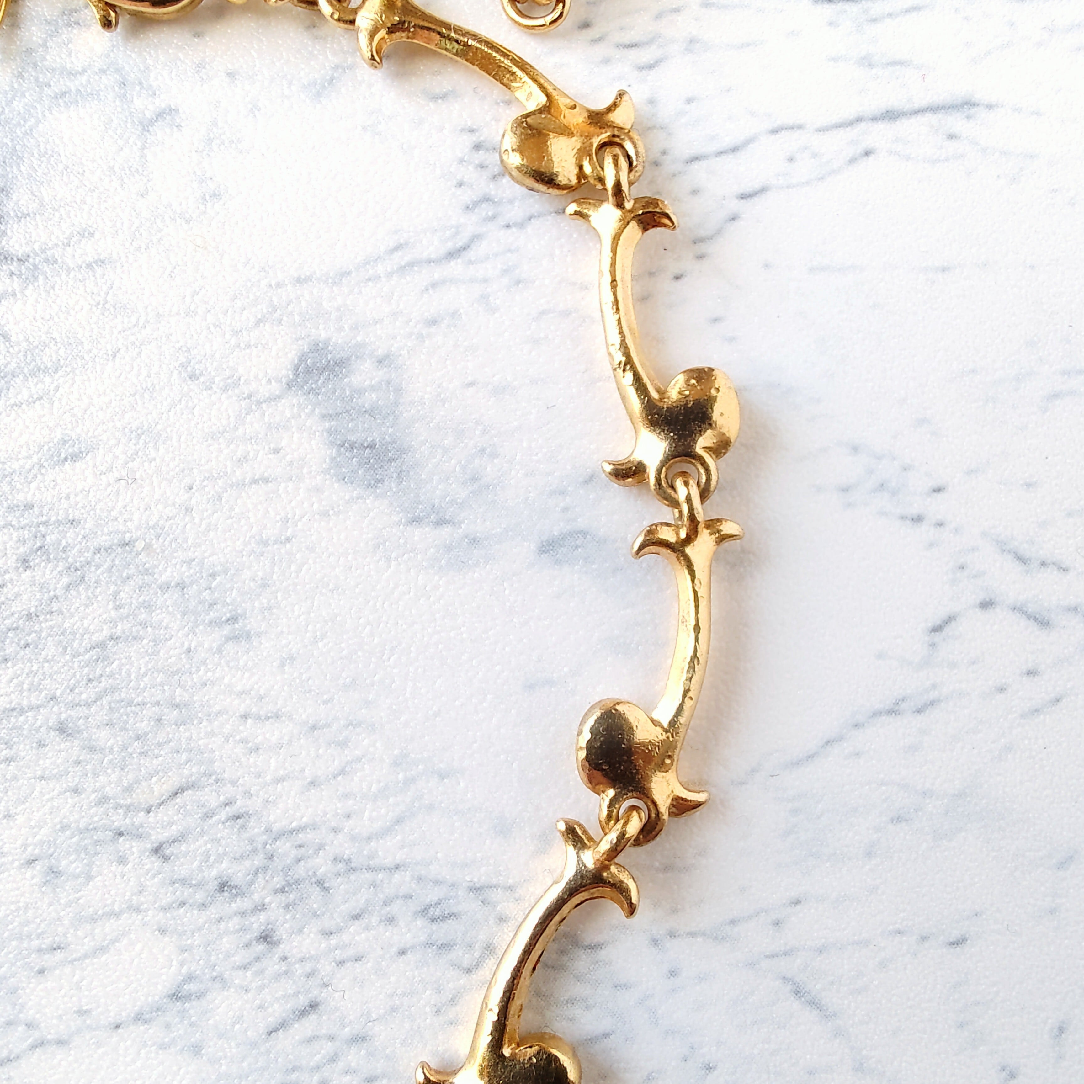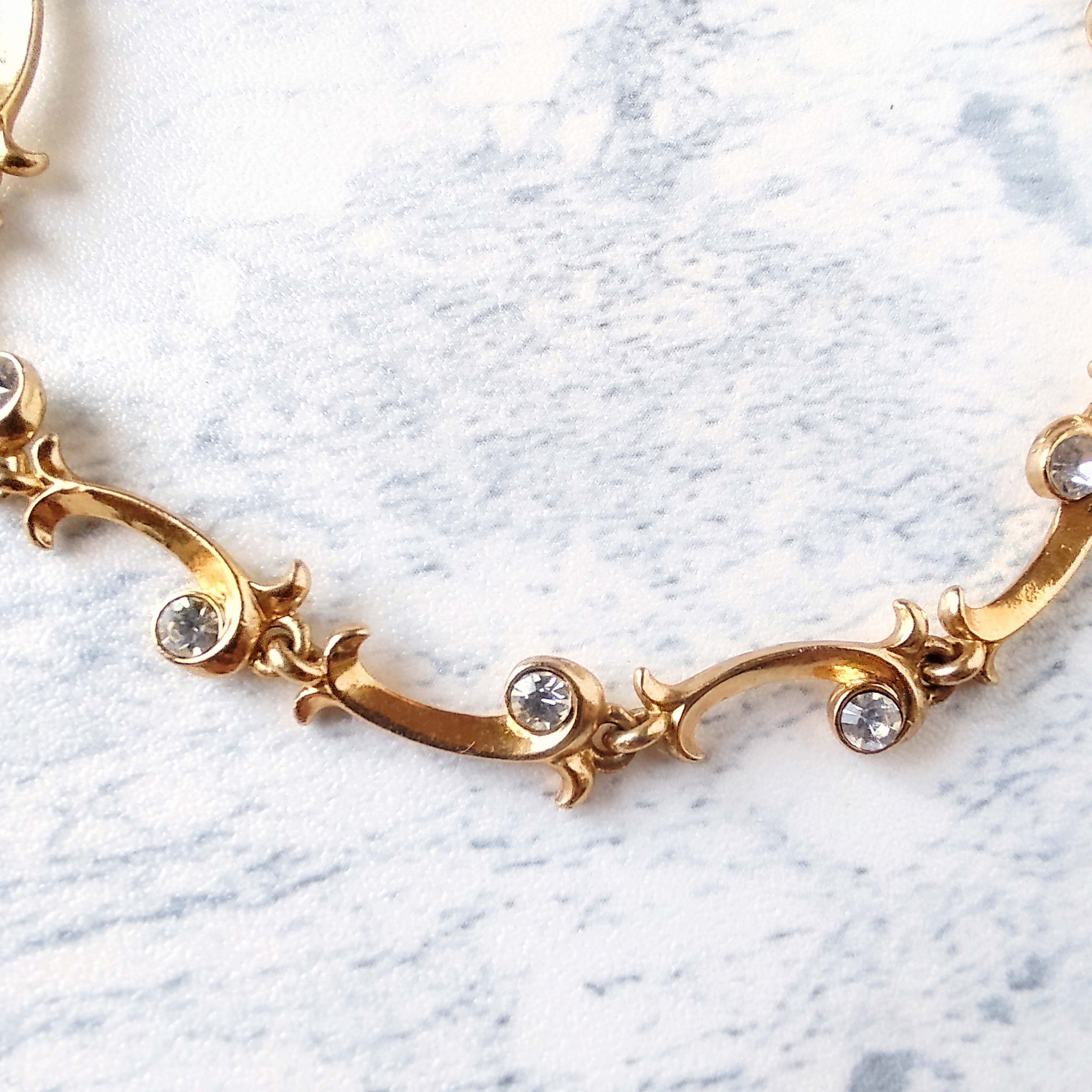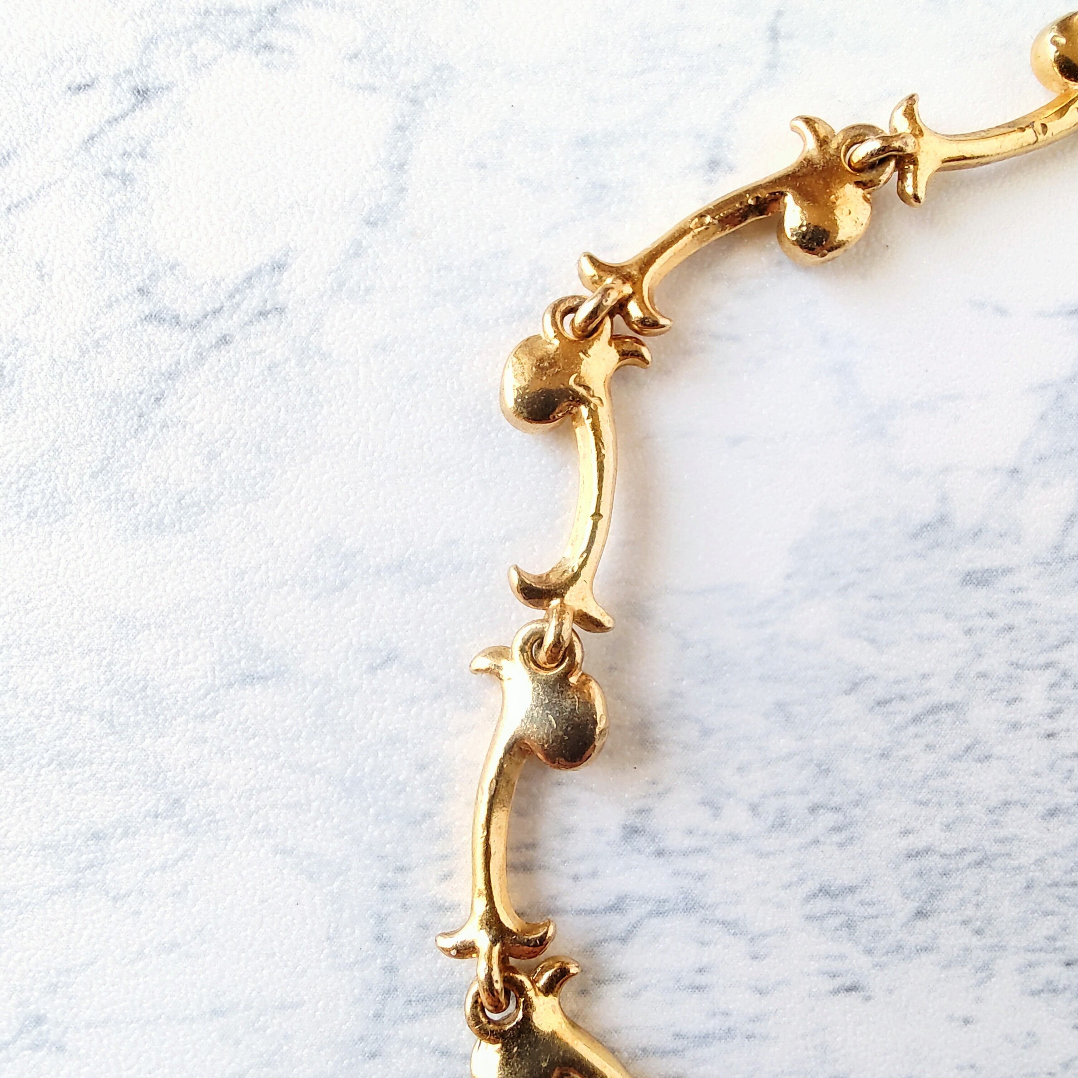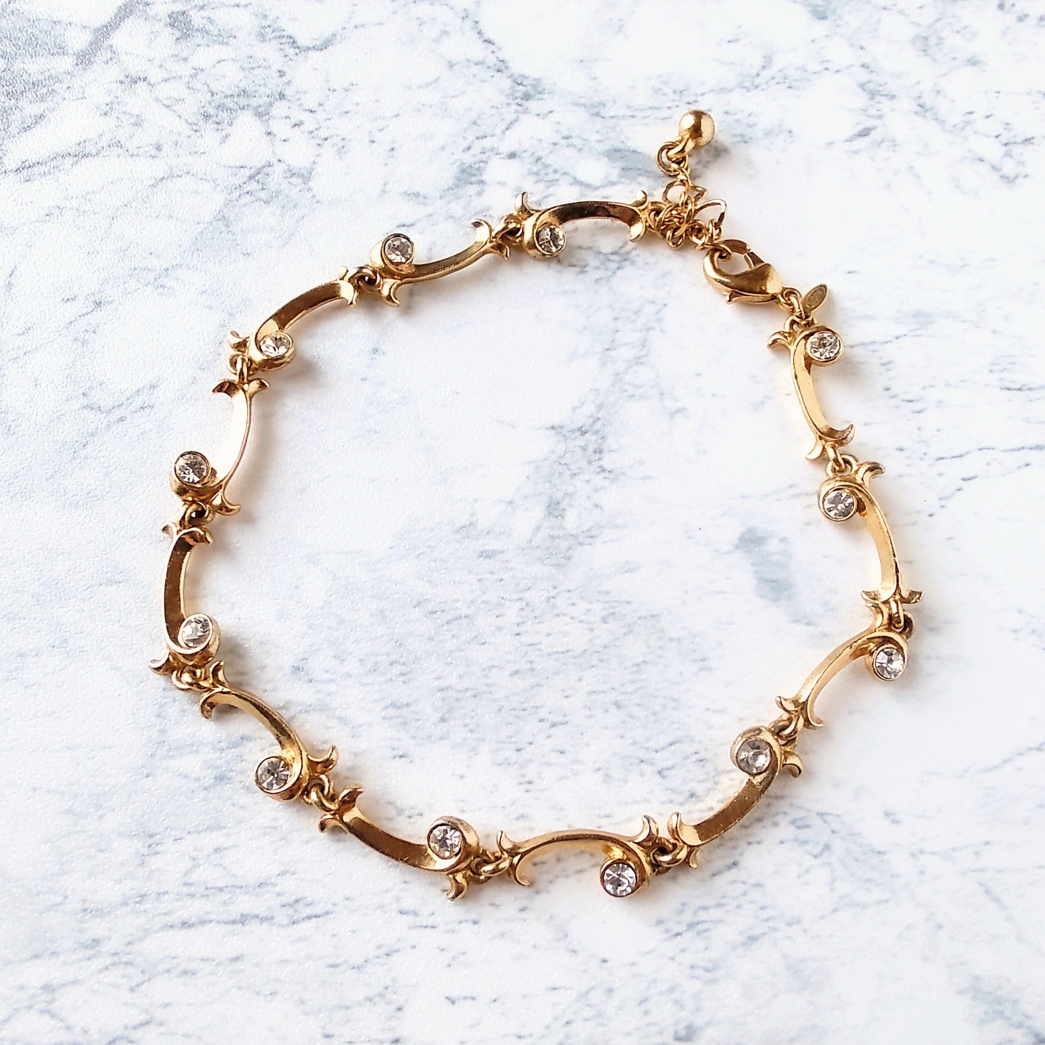 1886年アメリカのニューヨークにて小さな香水会社を創業、1971年に本格的にコスチュームジュエリーの製作を開始したAvon(エイボン)の2005年に販売された“EXTRAORDINARY VINE”のクリアラインストーンがあしらわれたゴールドメタルの植物の蔓がデザインされたヴィンテージアンクレットです。