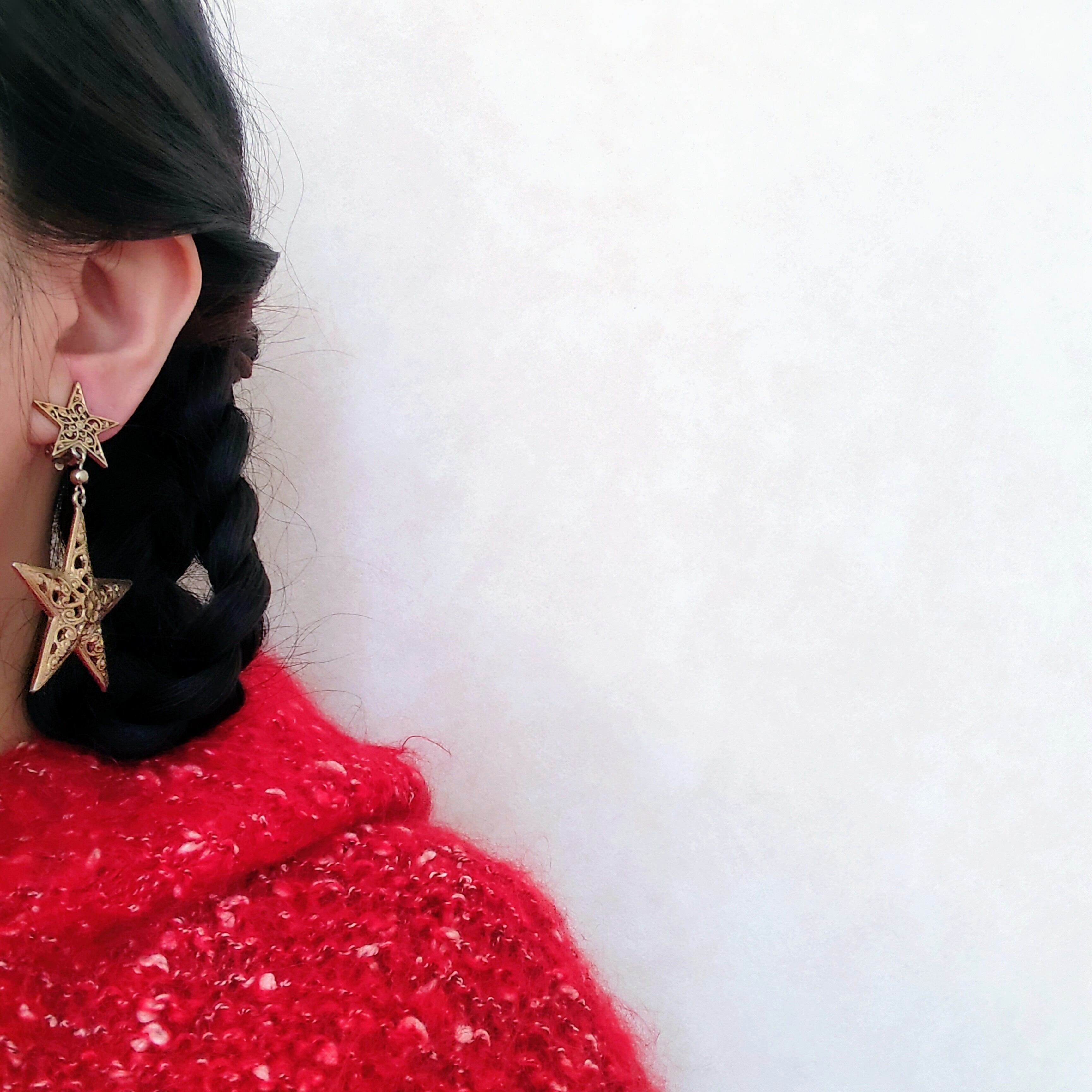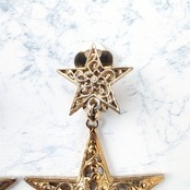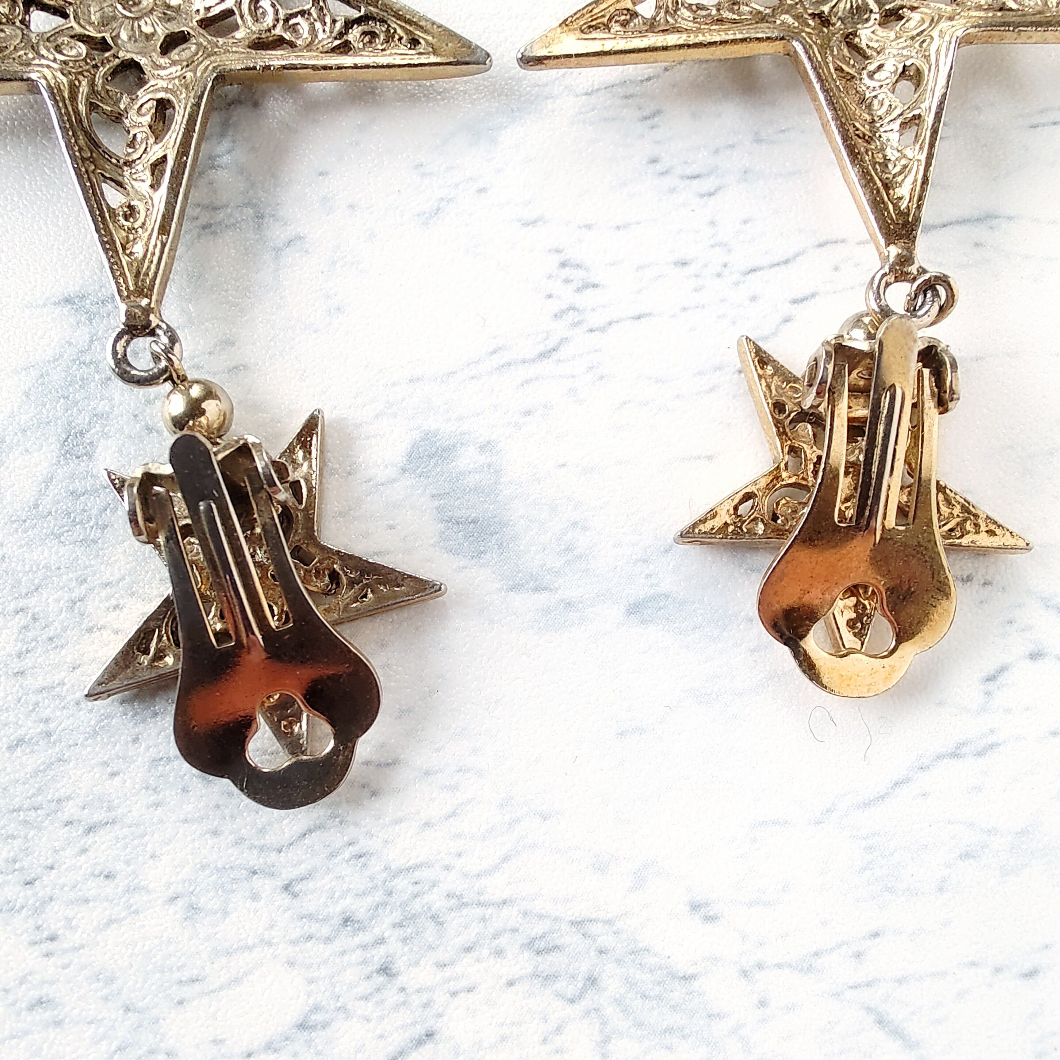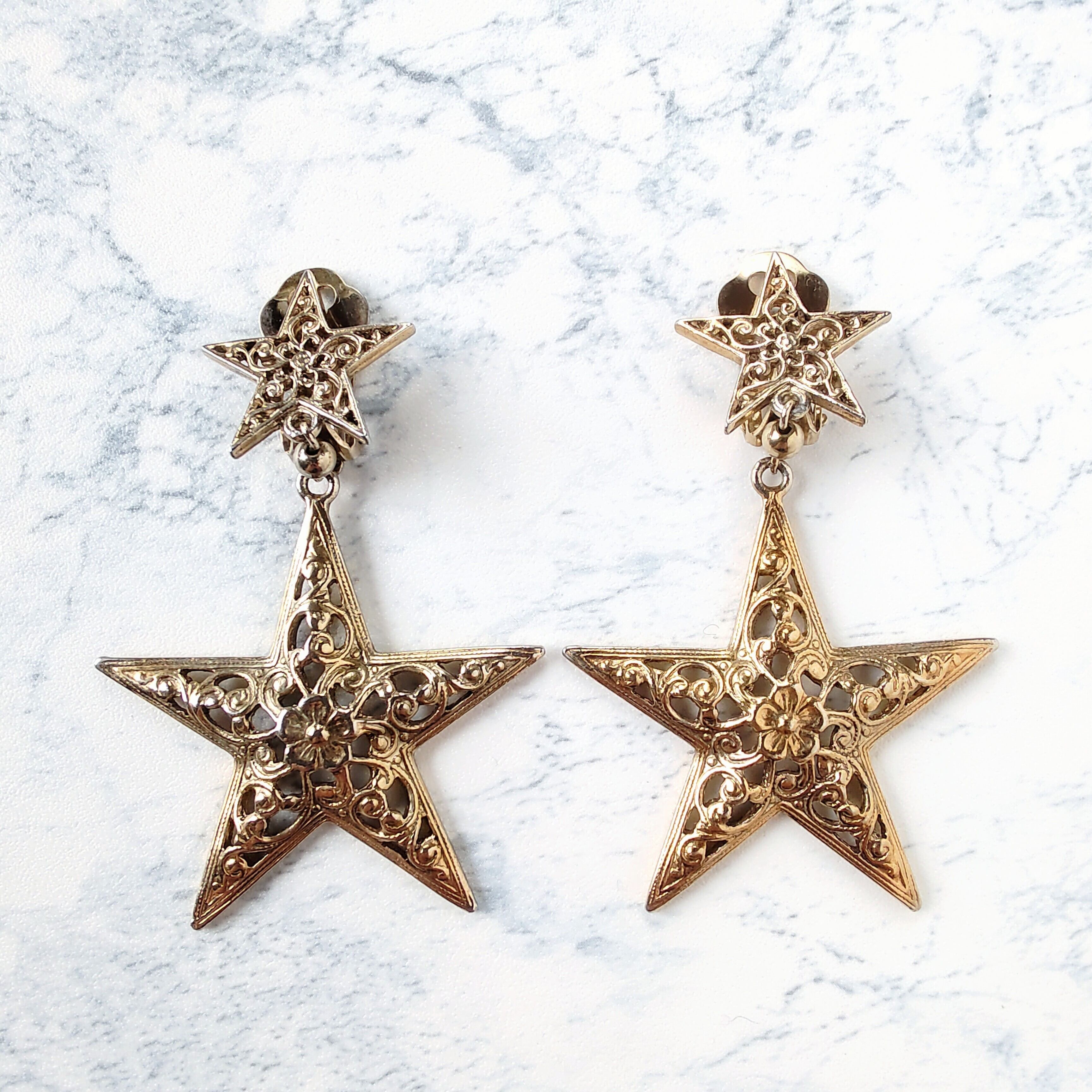 ゴールドメタルのフラワーとスワールが施された小さなスターに大きなスターがぶら下がったデザインの大ぶりなヴィンテージイヤリングです。