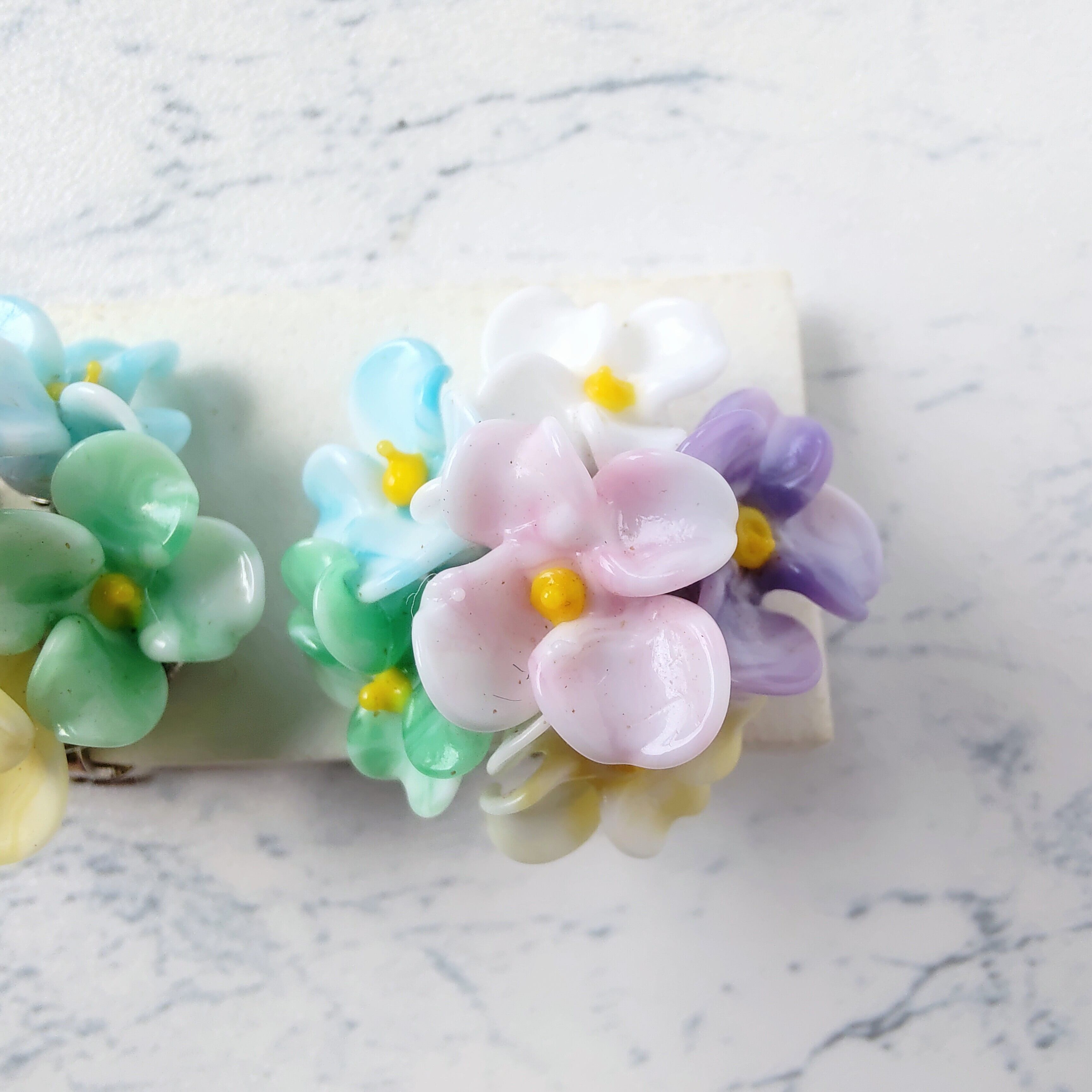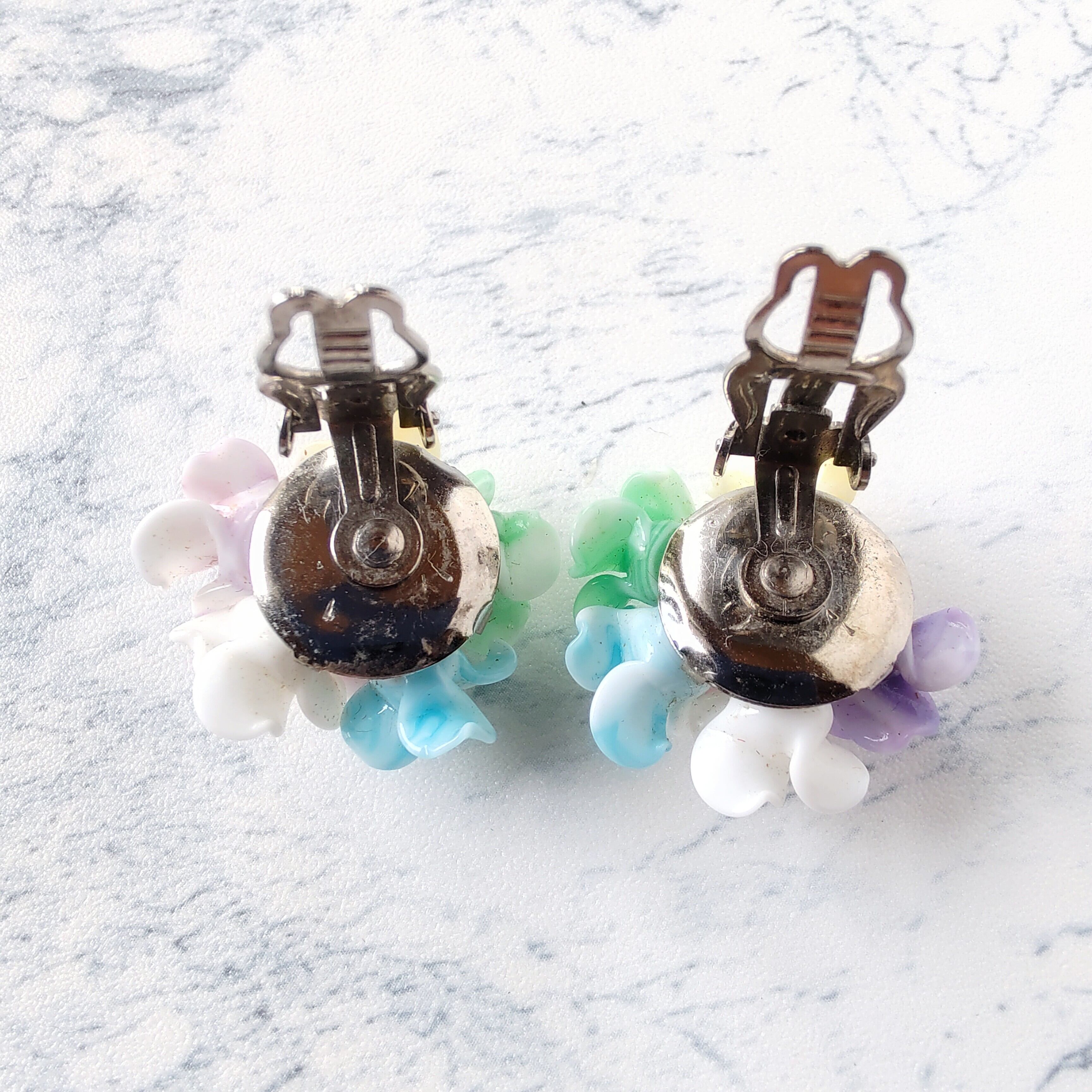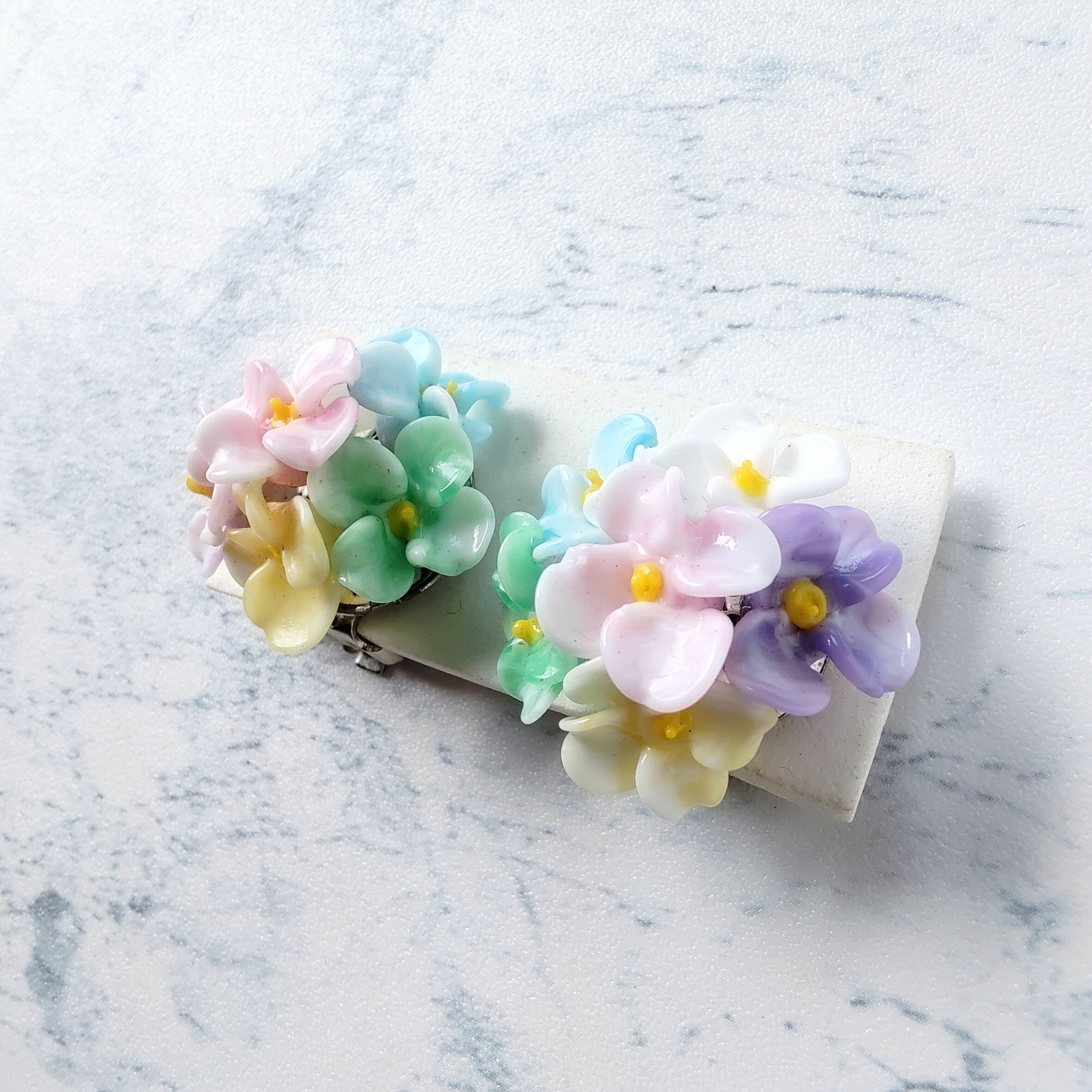 ホワイトをベースにピンク、パープル、グリーン、ブルー、イエローのマーブル状のプラスチックのフラワーが集まったデザインのクラスターヴィンテージイヤリングです。