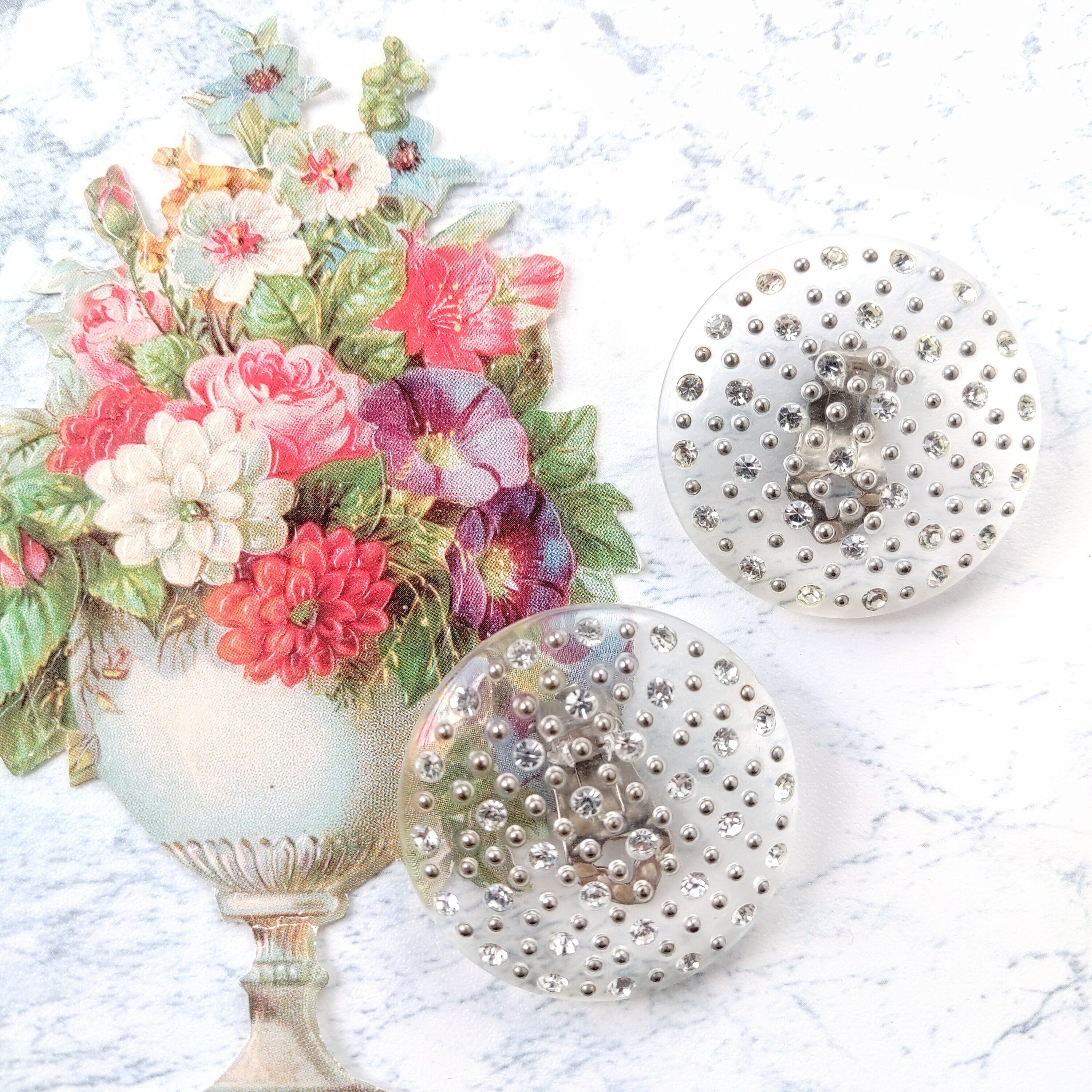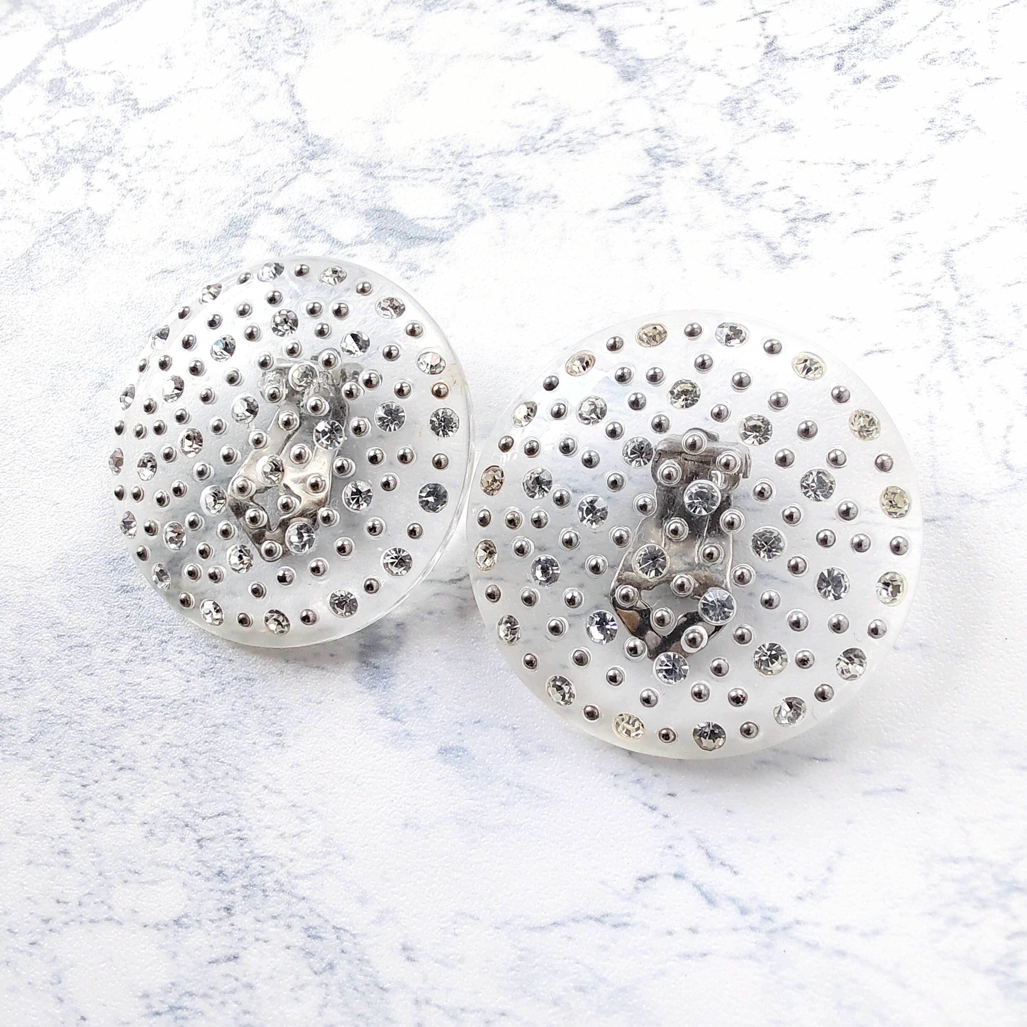 大ぶりなラウンドのクリアプラスチックにシルバーのボールメタルとクリアラインストーンが散りばめられたヴィンテージイヤリングです。