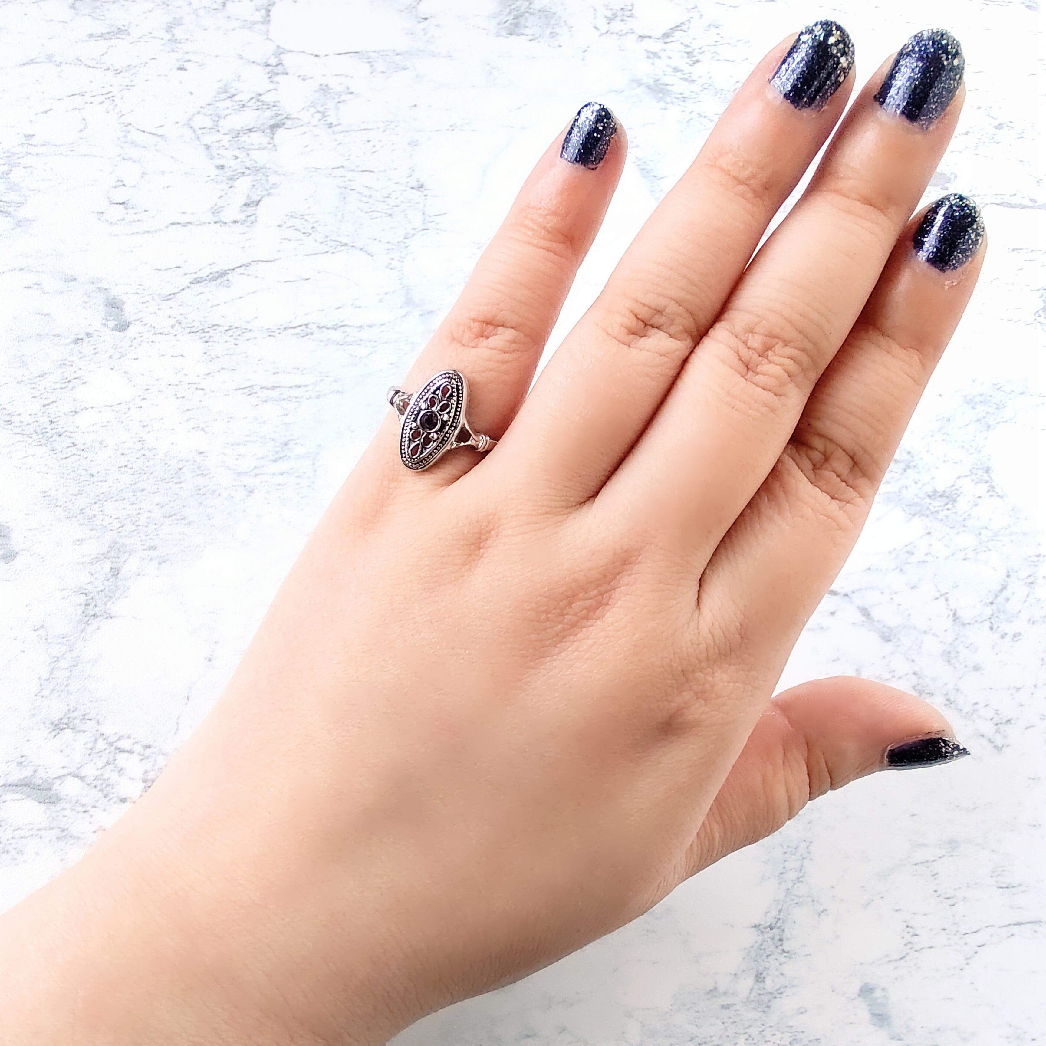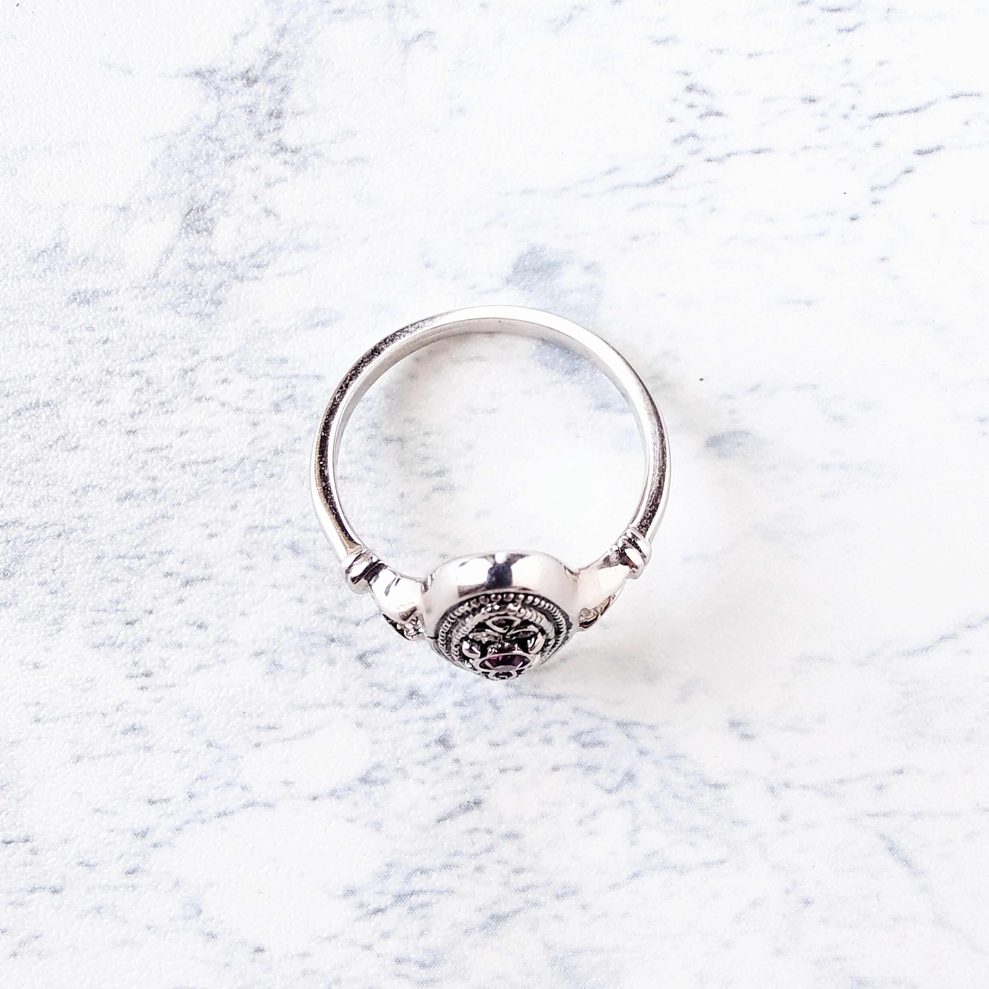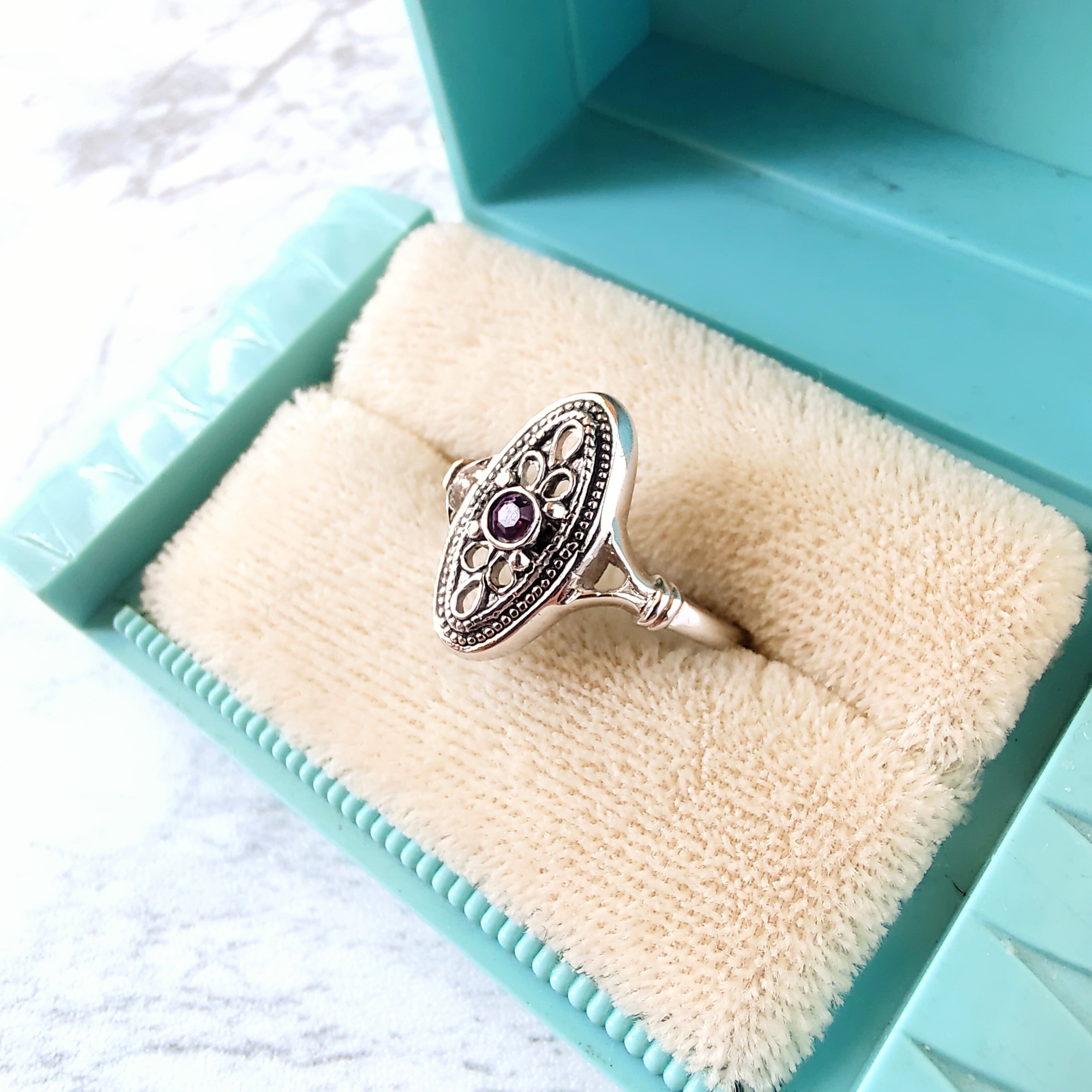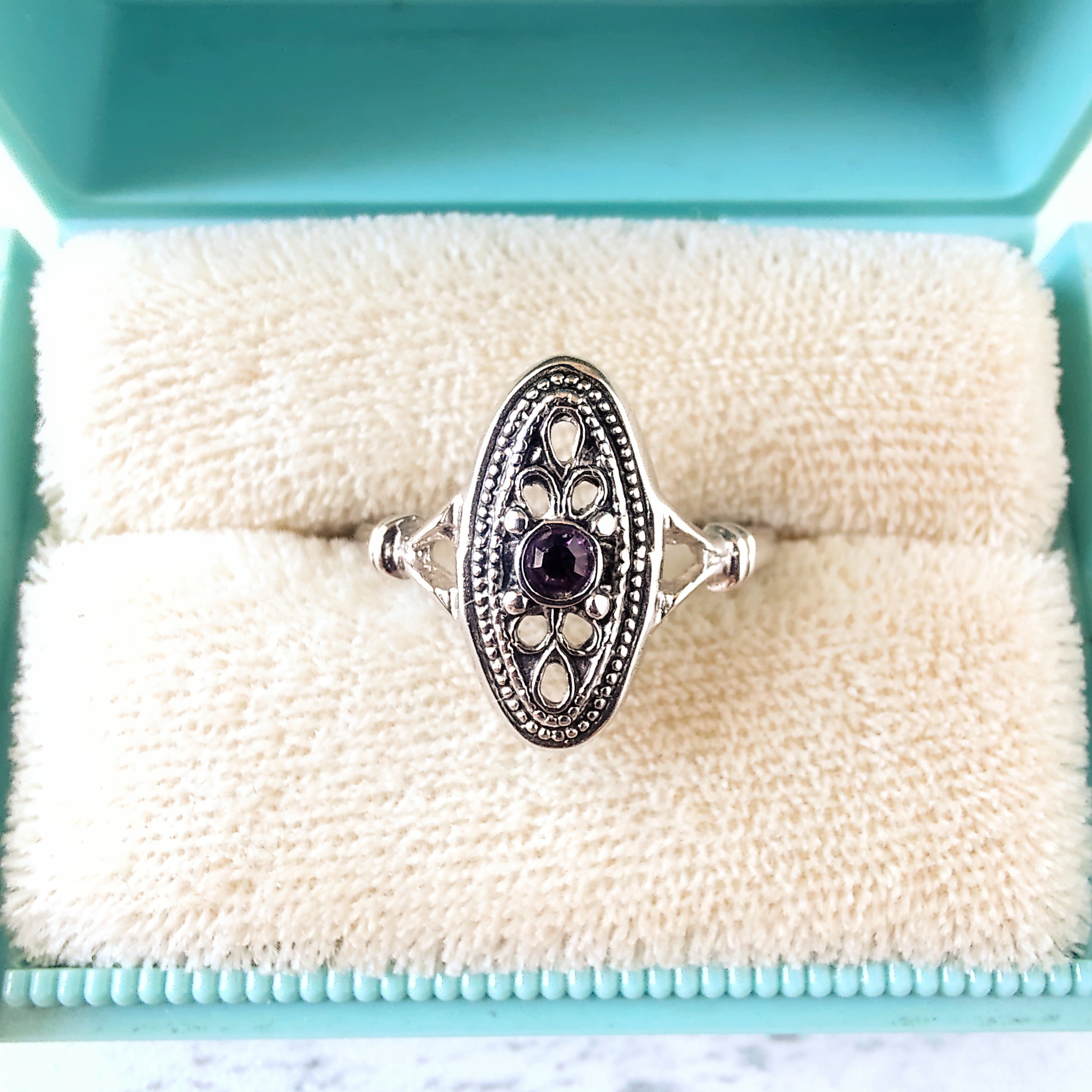 1886年アメリカのニューヨークにて小さな香水会社を創業、1971年に本格的にコスチュームジュエリーの製作を開始したAvon(エイボン)の1981年に販売された“Nostalgia”のオーバルのオープンワークシルバーメタルの中央にパープルのラインストーンが1粒あしらわれたヴィンテージリングです。