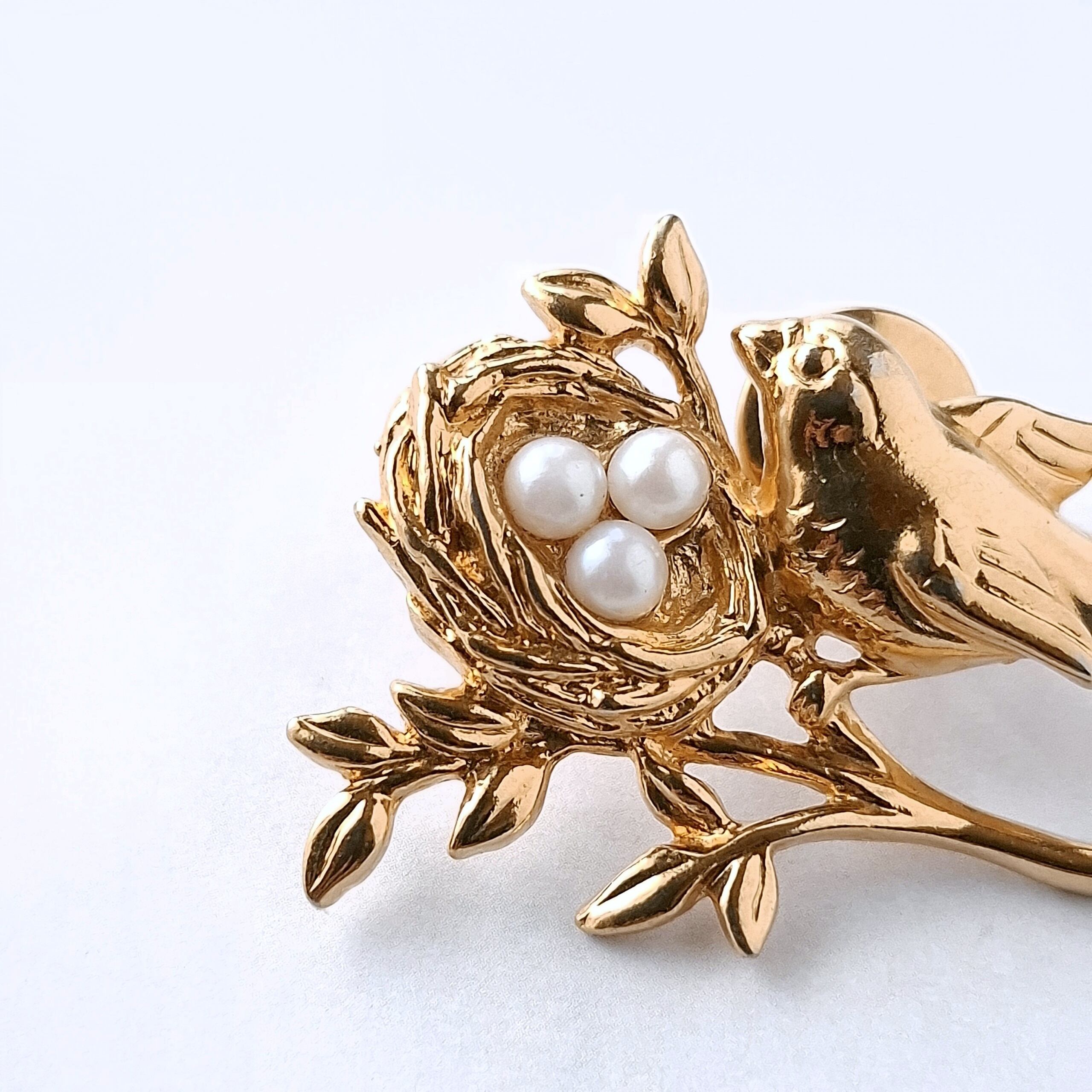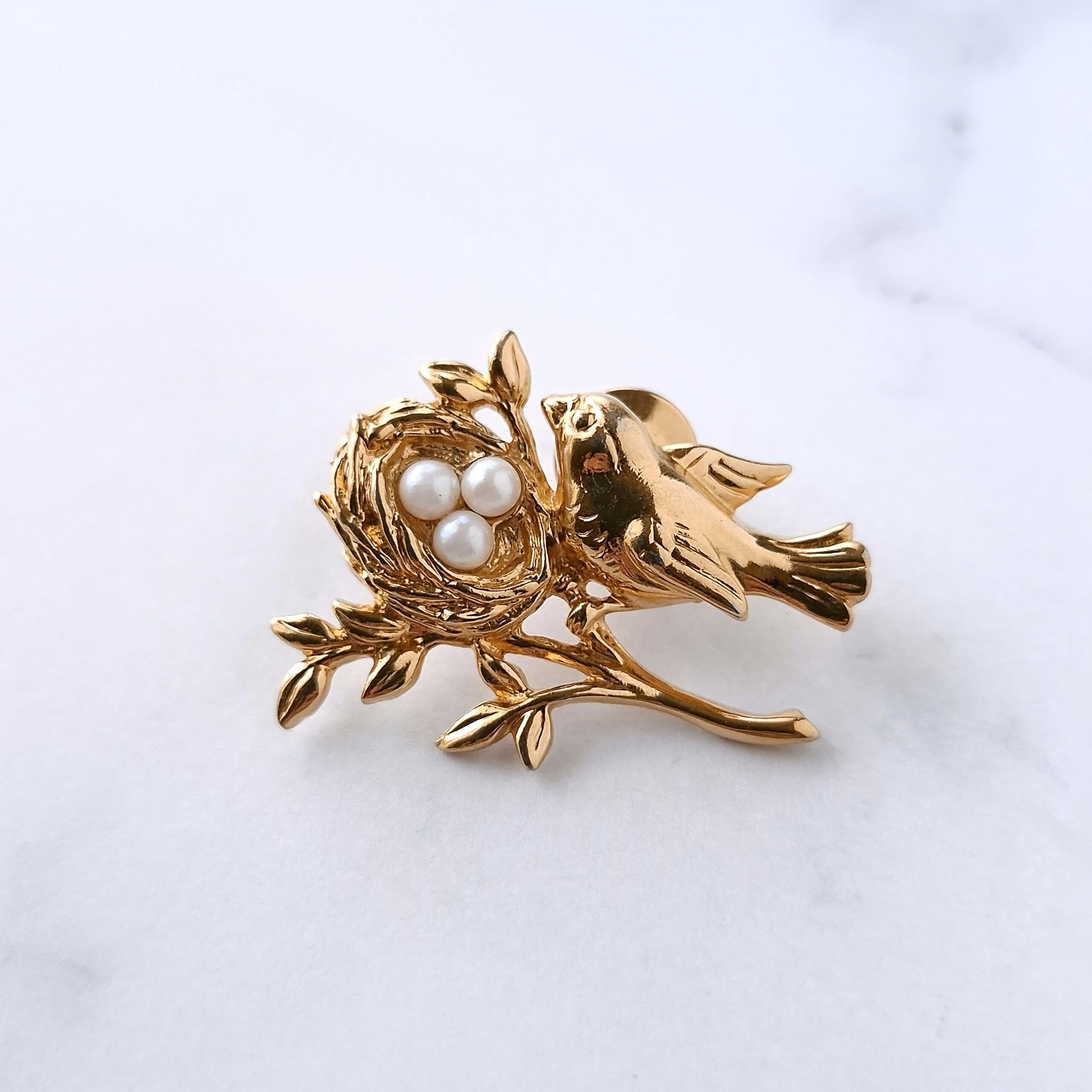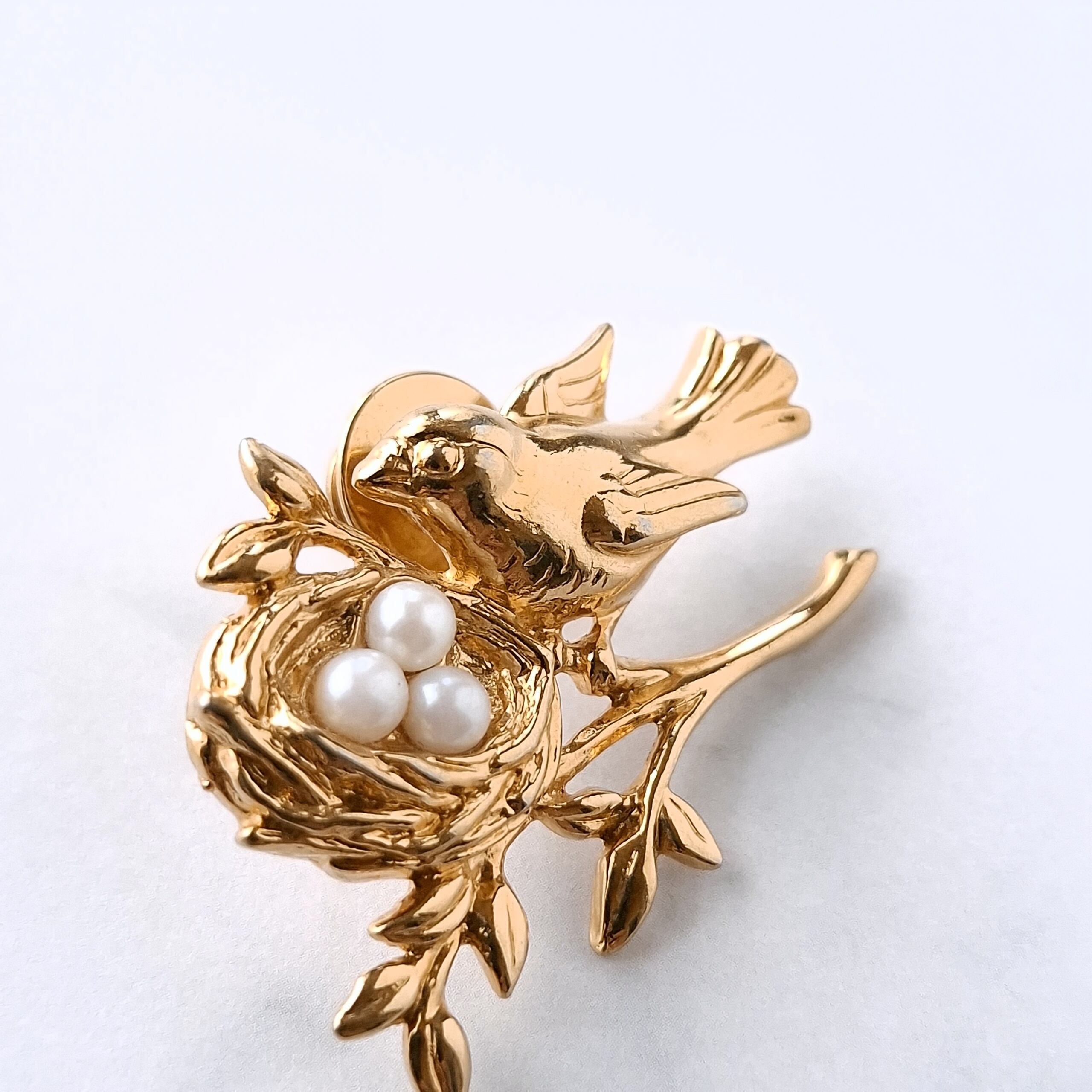1886年アメリカのニューヨークにて小さな香水会社を創業、1971年に本格的にコスチュームジュエリーの製作を開始したAvon(エイボン)の1990年に販売された“mother’s nest pin”のゴールドメタルの親鳥と卵にフェイクパールがあしらわれた鳥の巣がデザインされたヴィンテージブローチです。