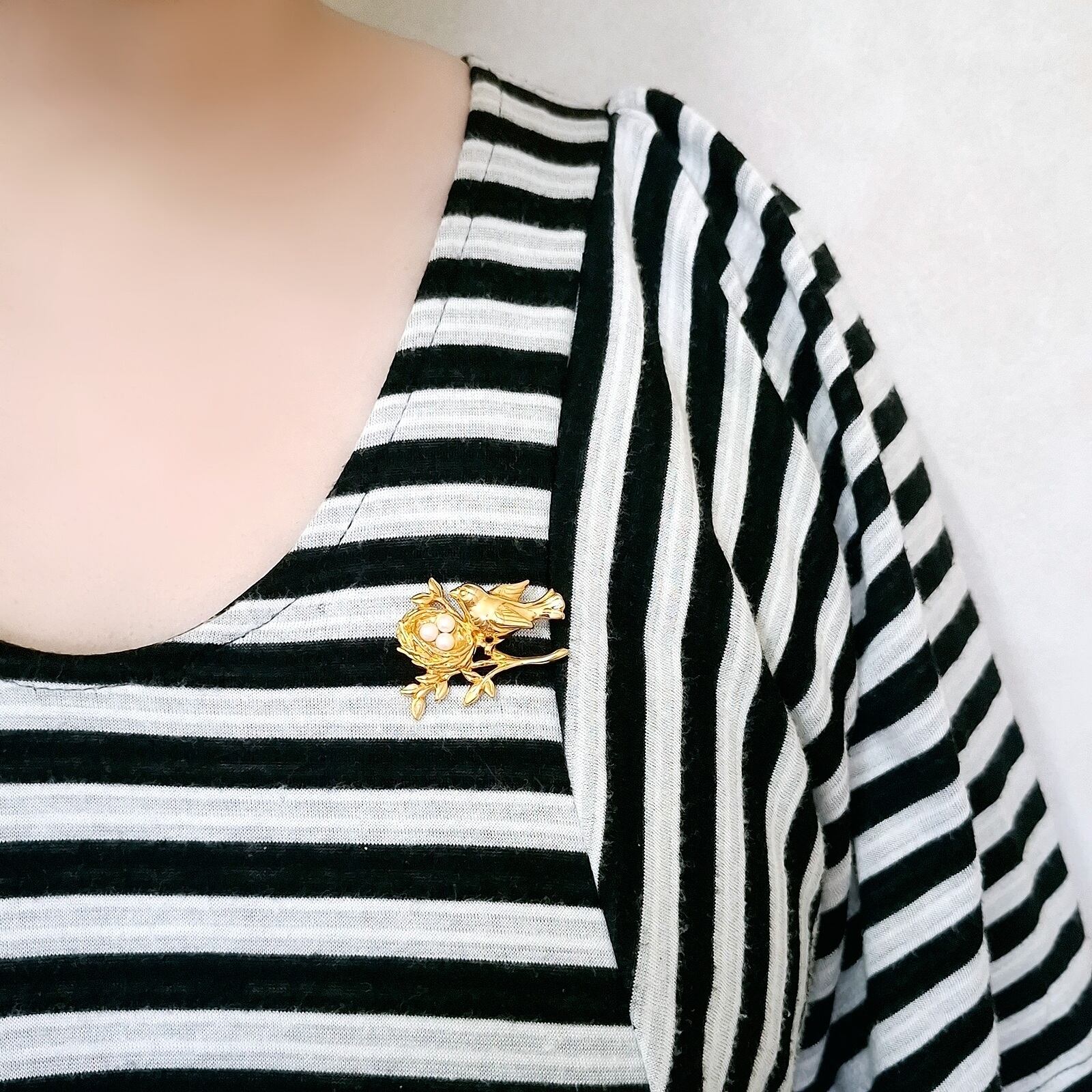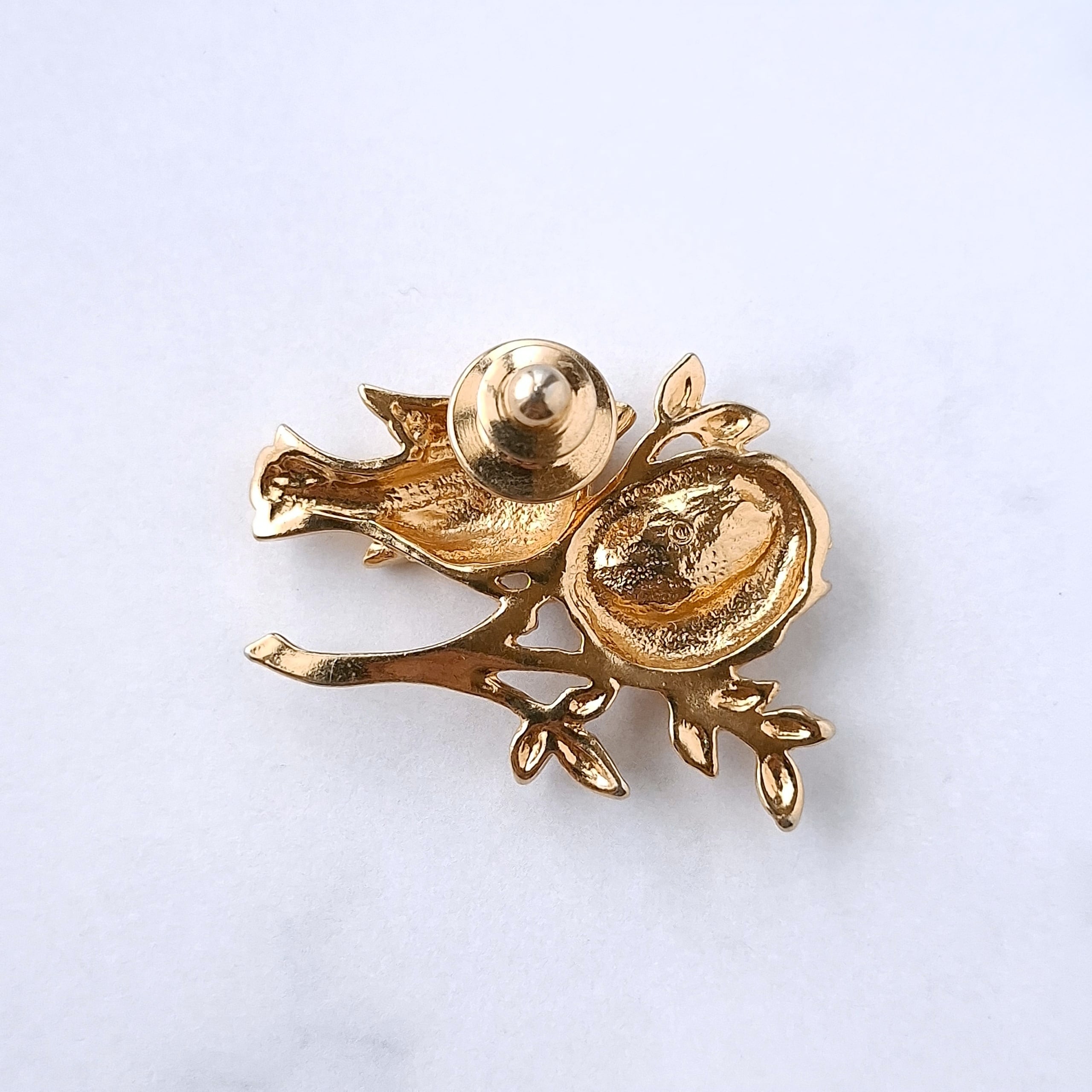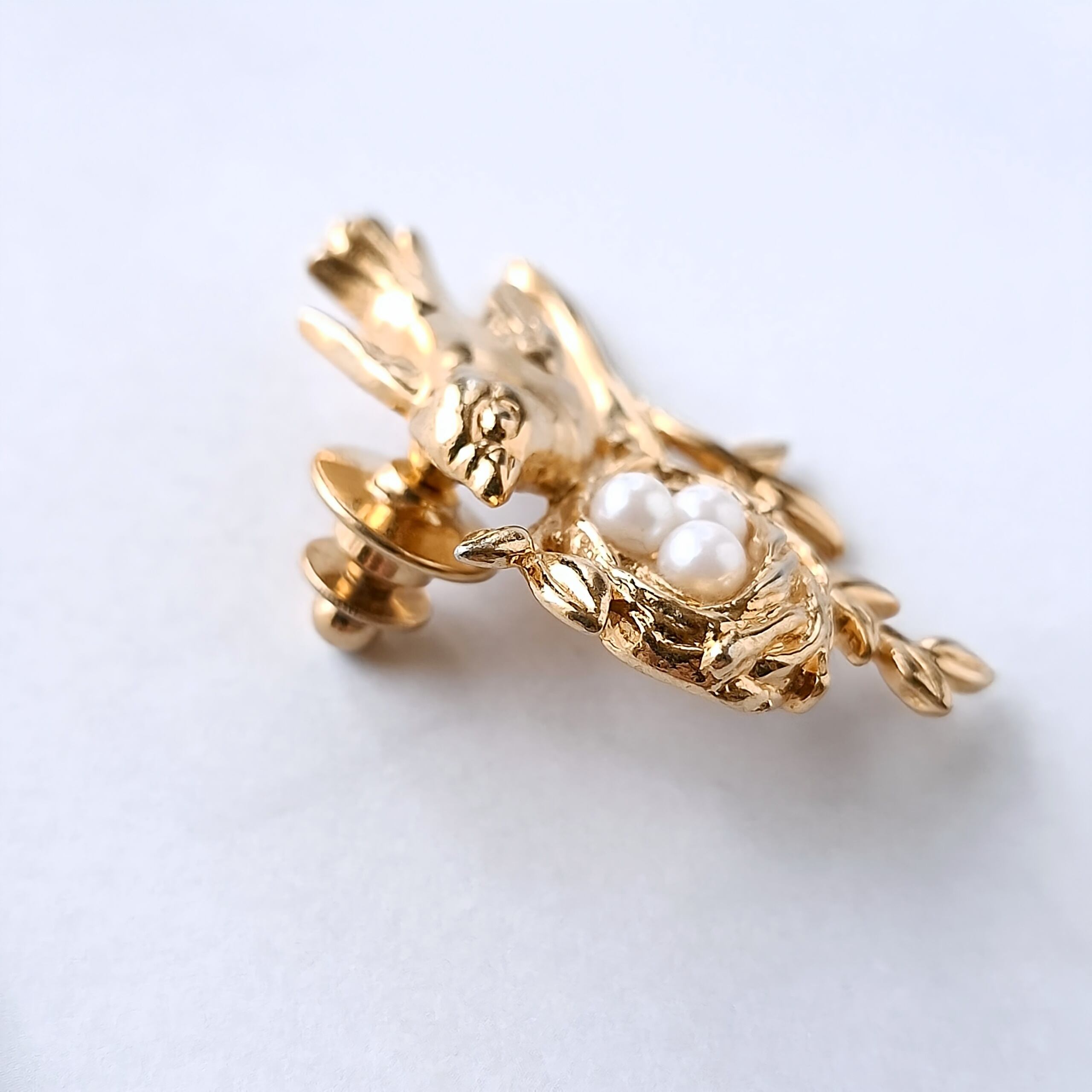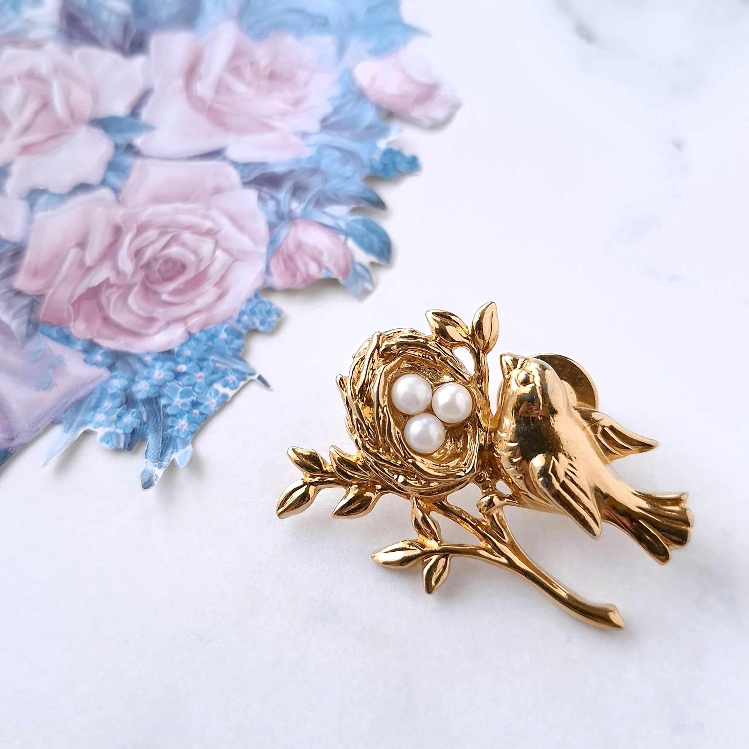 1886年アメリカのニューヨークにて小さな香水会社を創業、1971年に本格的にコスチュームジュエリーの製作を開始したAvon(エイボン)の1990年に販売された“mother’s nest pin”のゴールドメタルの親鳥と卵にフェイクパールがあしらわれた鳥の巣がデザインされたヴィンテージブローチです。
