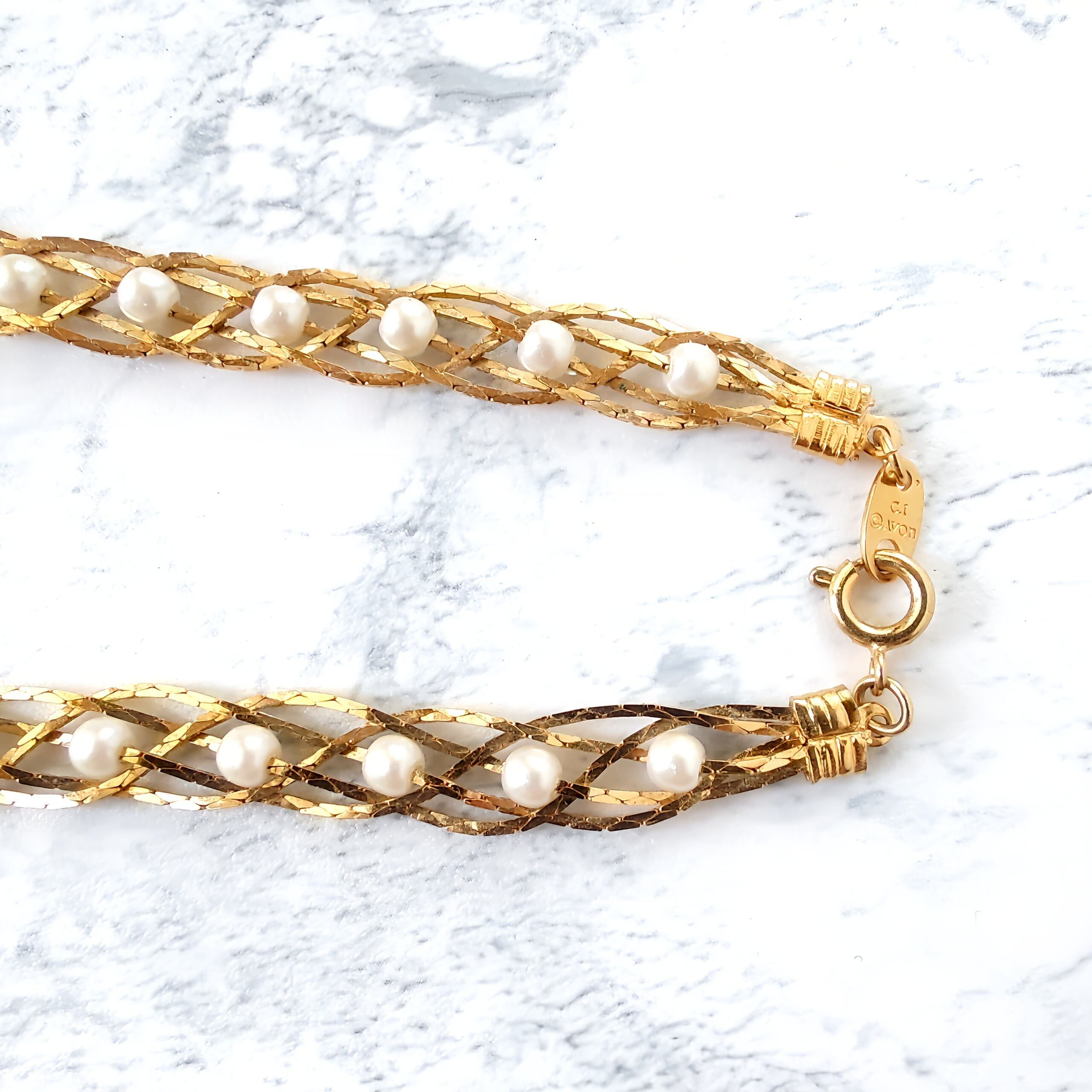 1886年アメリカのニューヨークにて小さな香水会社を創業、1971年に本格的にコスチュームジュエリーの製作を開始したAvon(エイボン)の1994年に販売された“Pearlesque Treasures”の編み込まれた5本のゴールドメタルチェーンにフェイクパールがあしらわれたヴィンテージネックレスです。