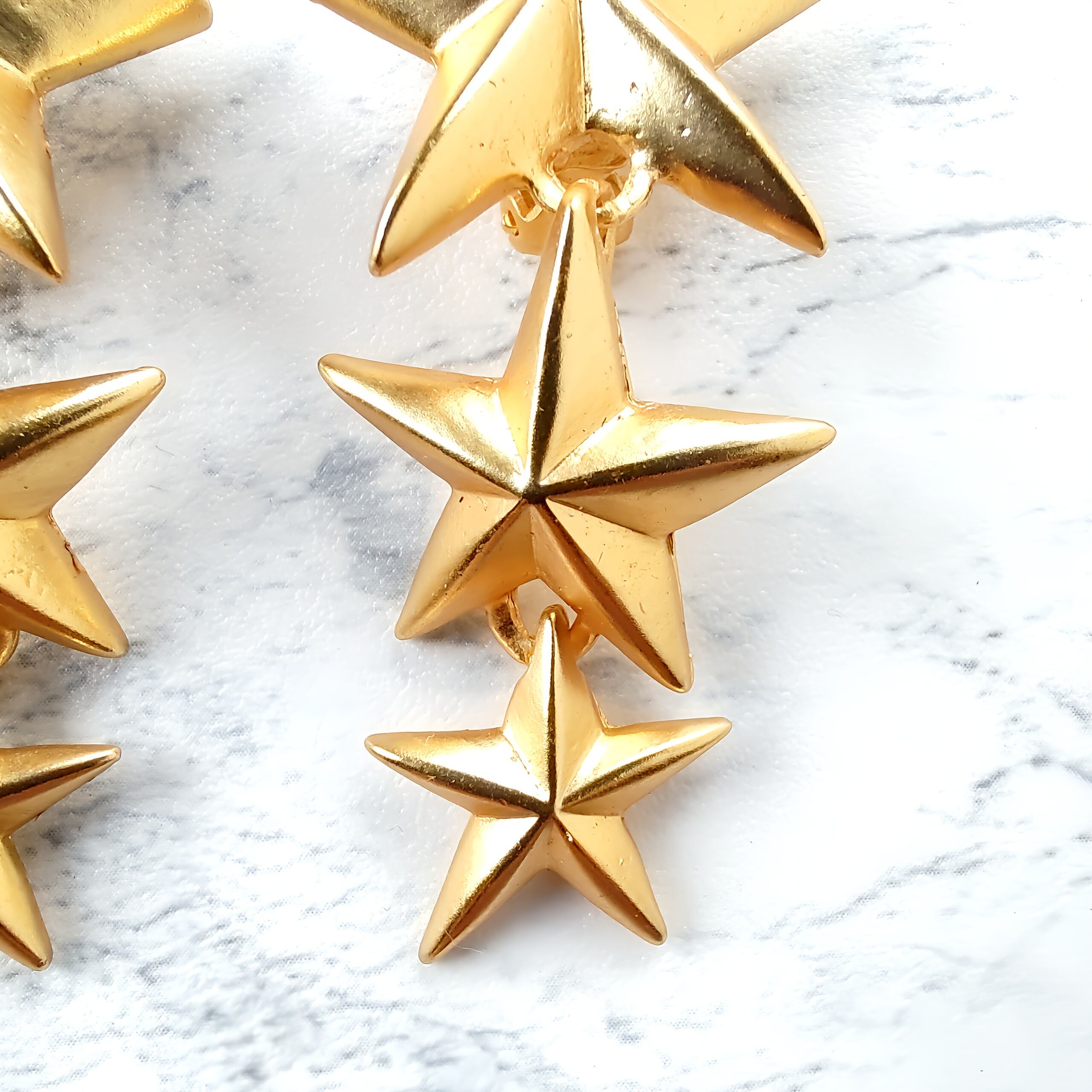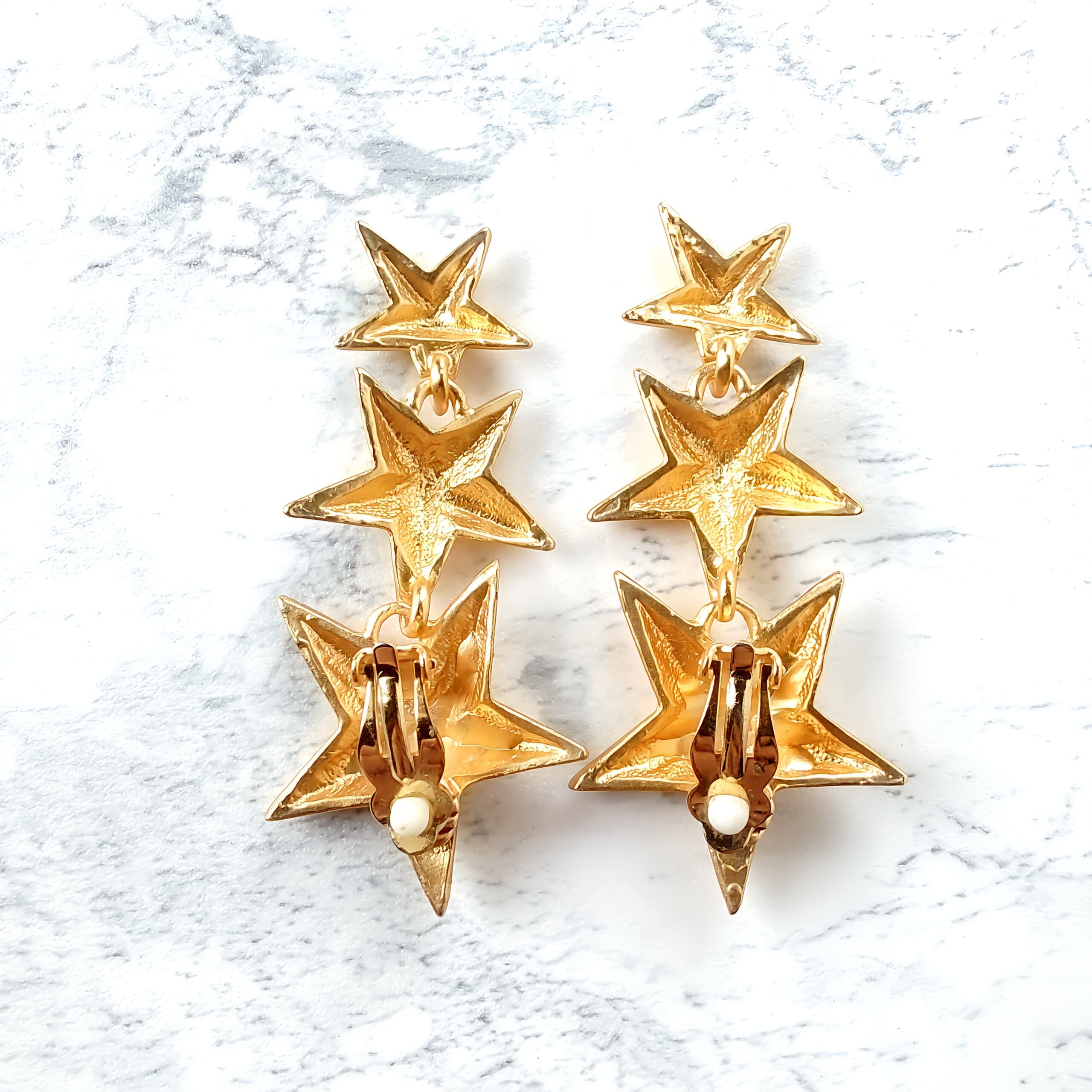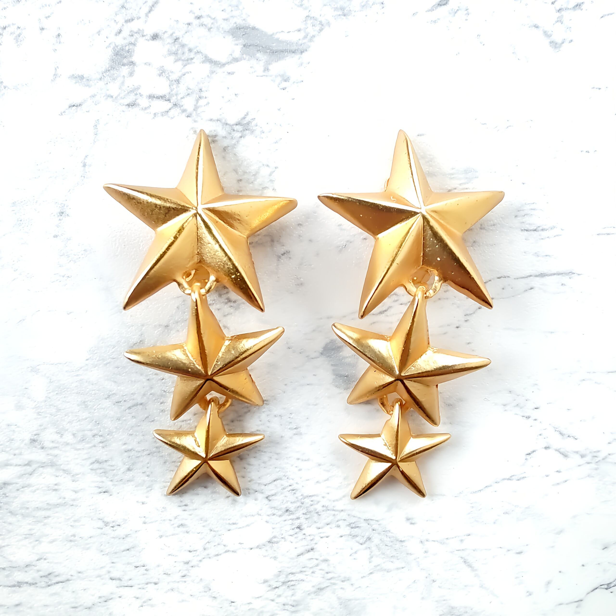 縦に連なったマットゴールドメタルの大、中、小の星が揺れるデザインのヴィンテージイヤリングです。