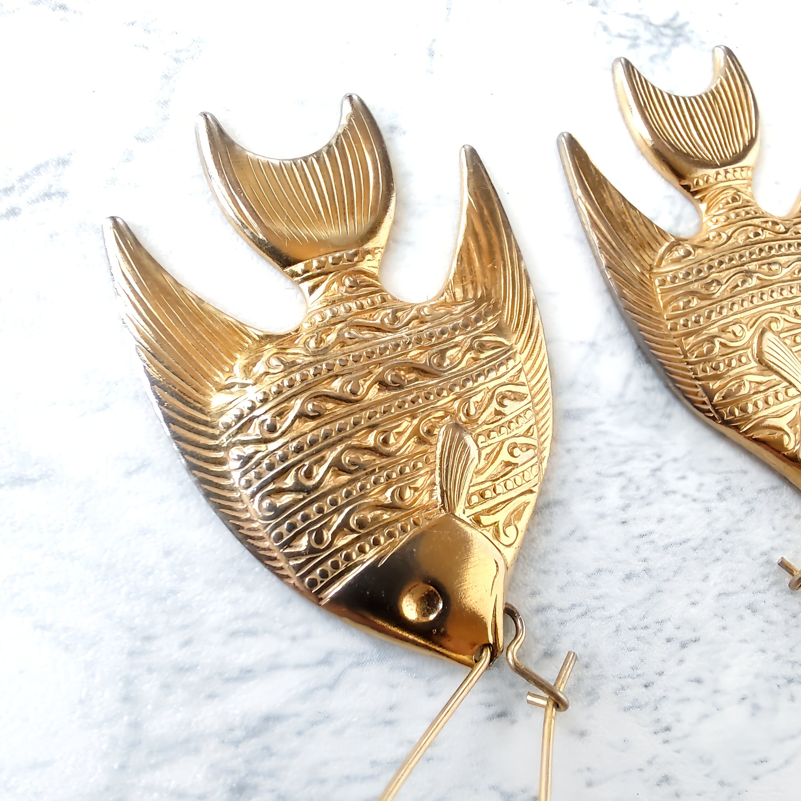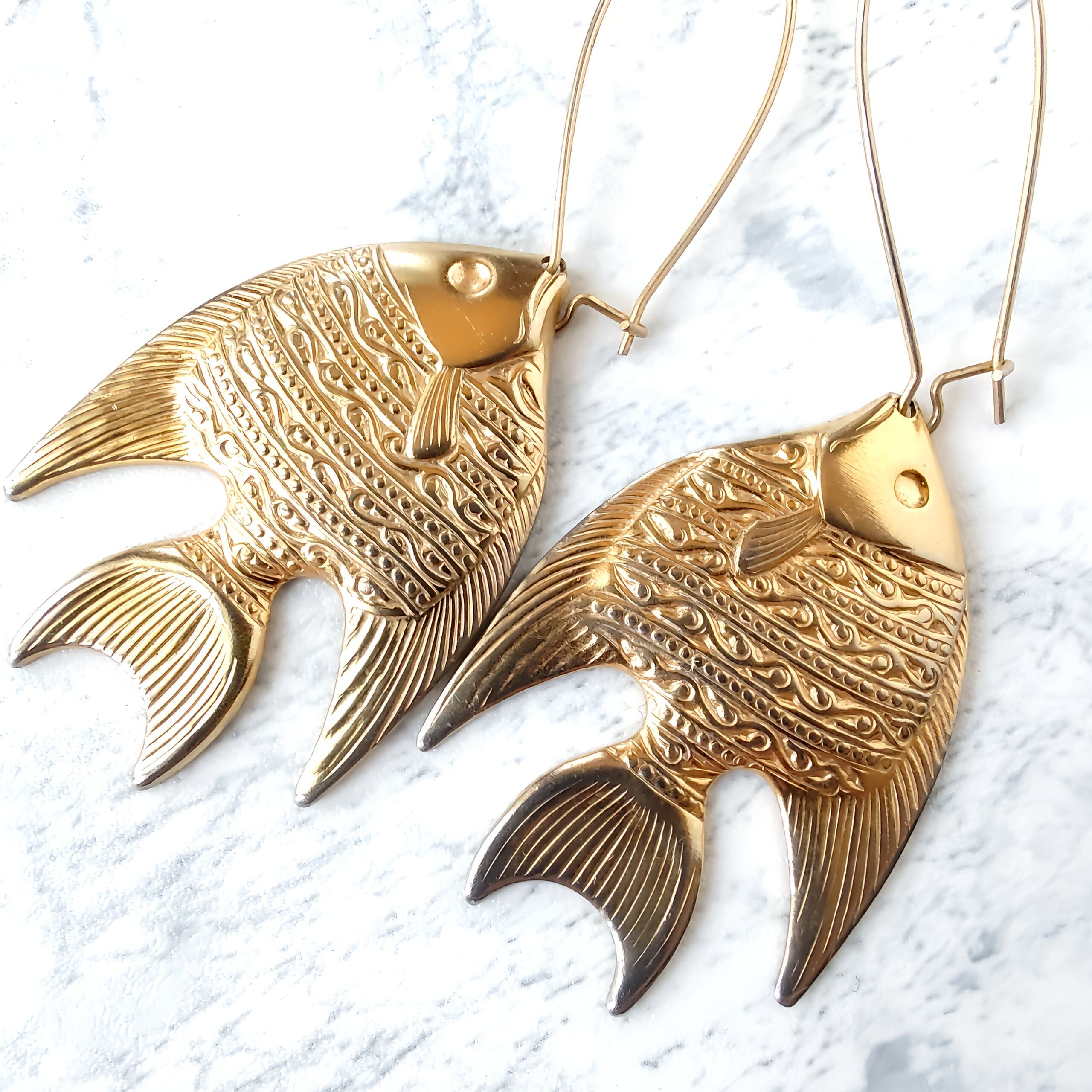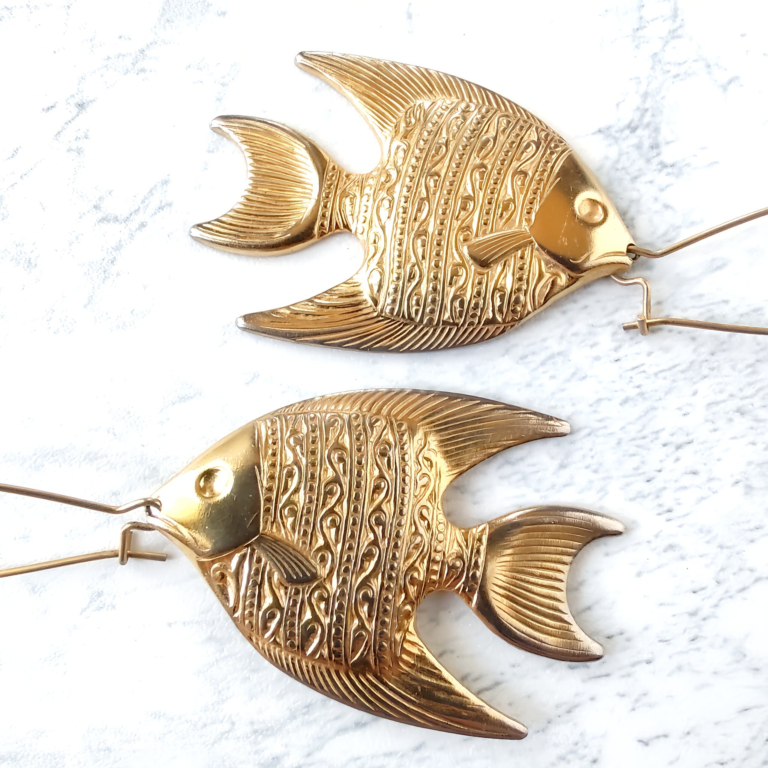 ロングフープにゴールドメタルプレートのエンゼルフィッシュがぶら下がったデザインのヴィンテージピアスです。