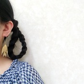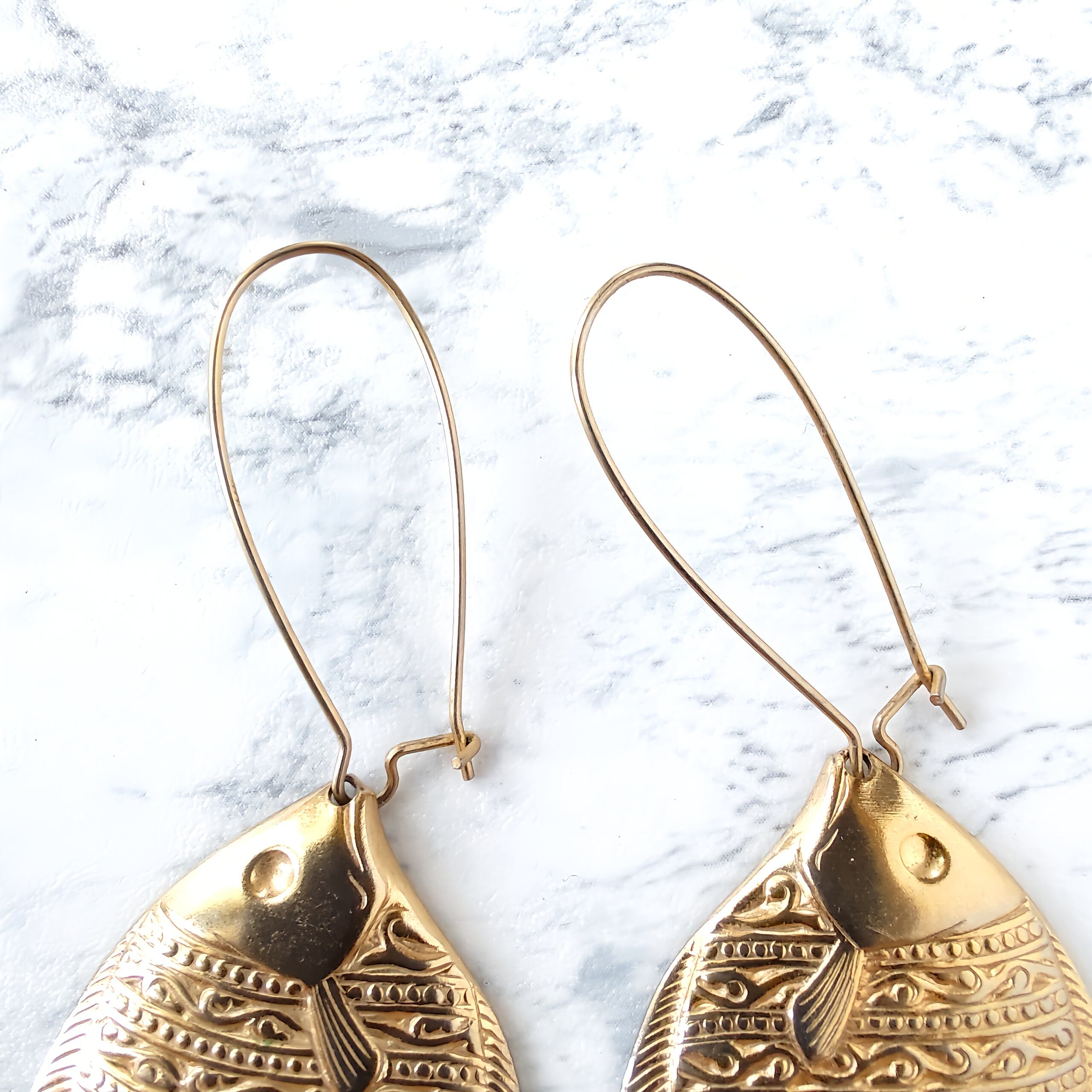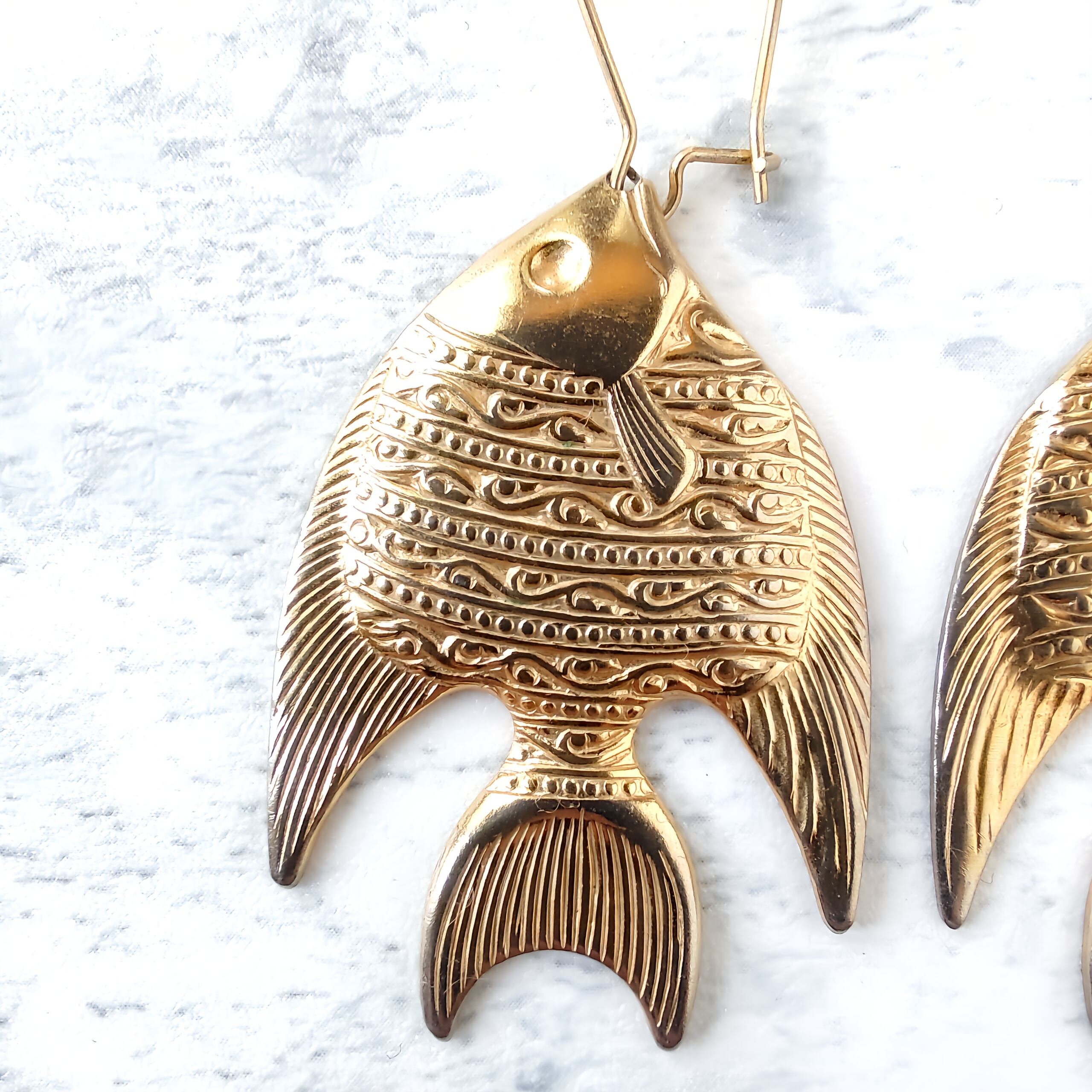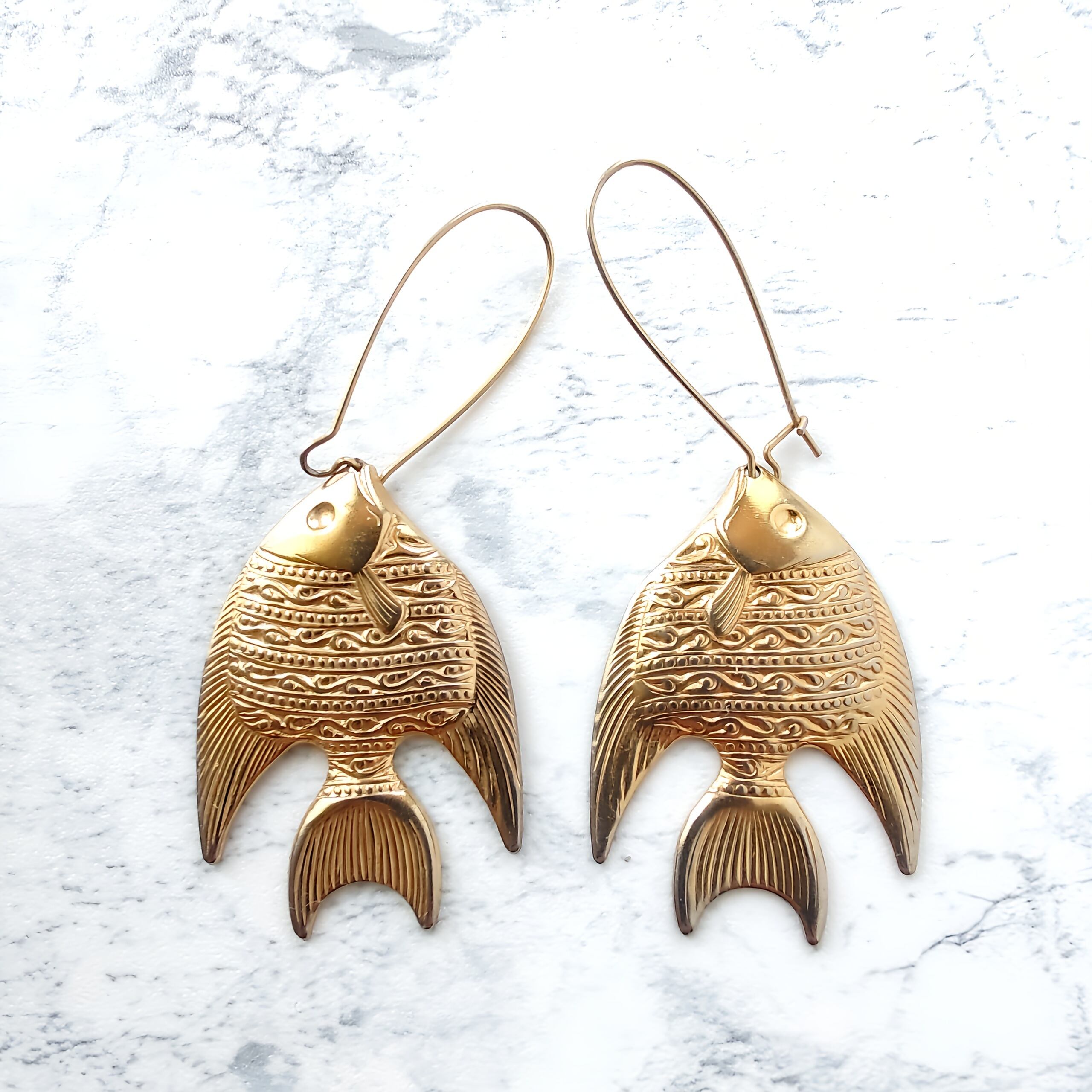ロングフープにゴールドメタルプレートのエンゼルフィッシュがぶら下がったデザインのヴィンテージピアスです。
