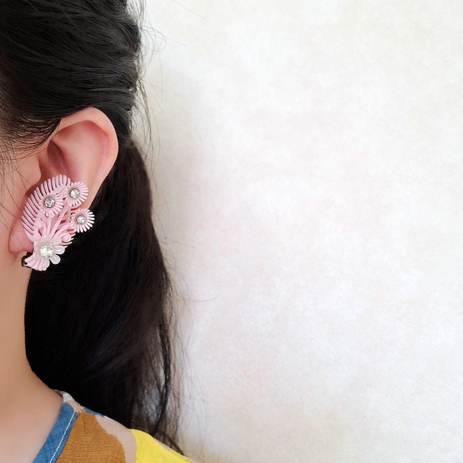 クリアラインストーンがあしらわれたフラワーがリーフの上に重なる様にデザインされた淡いピンクのソフトプラスチックのヴィンテージイヤリングです。