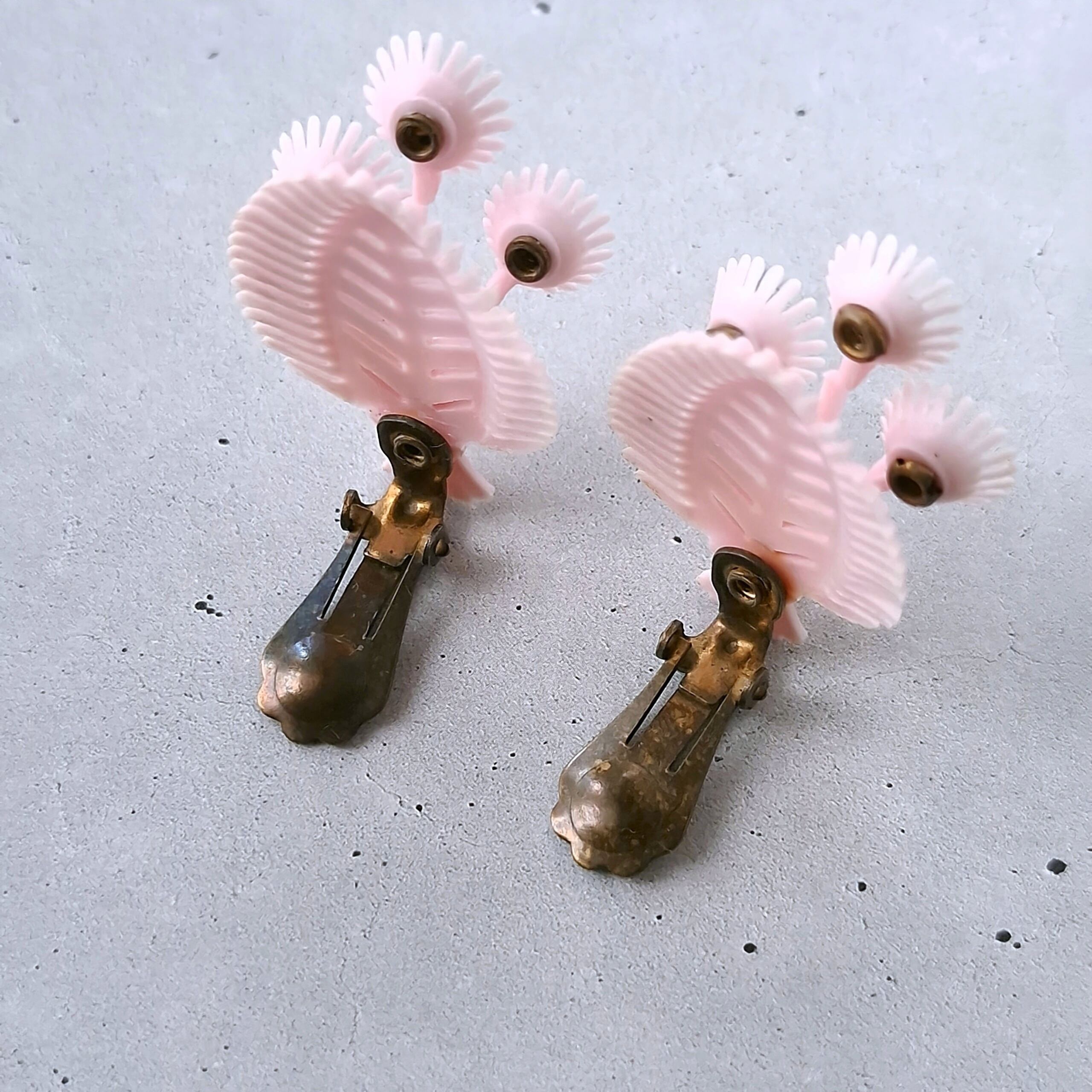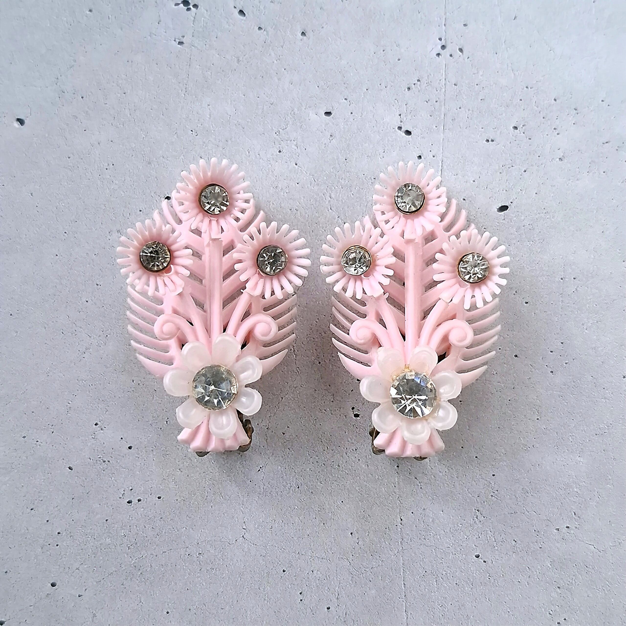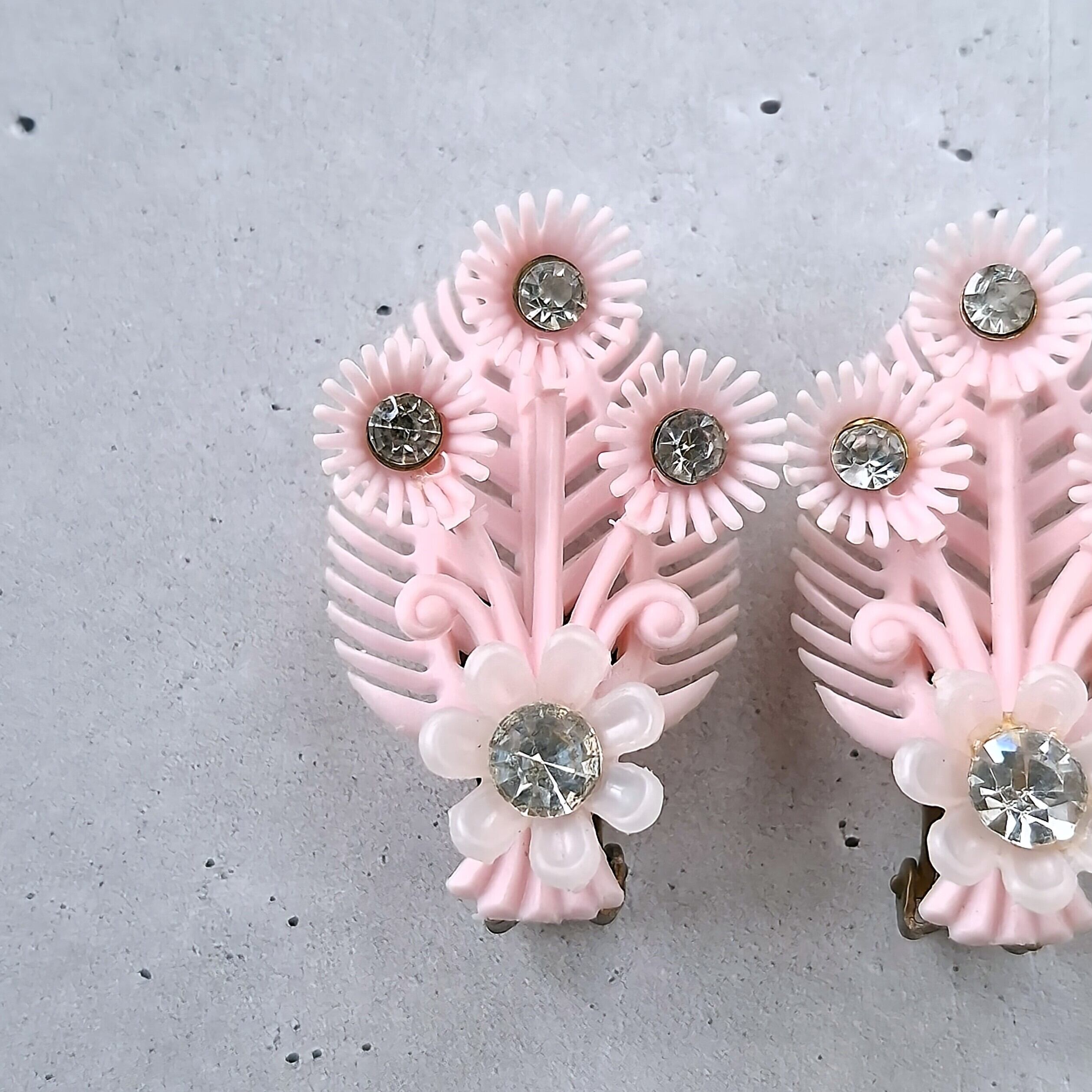 clear rhinestone pale pink softplastic flower leaf vintage earrings ヴィンテージイヤリング