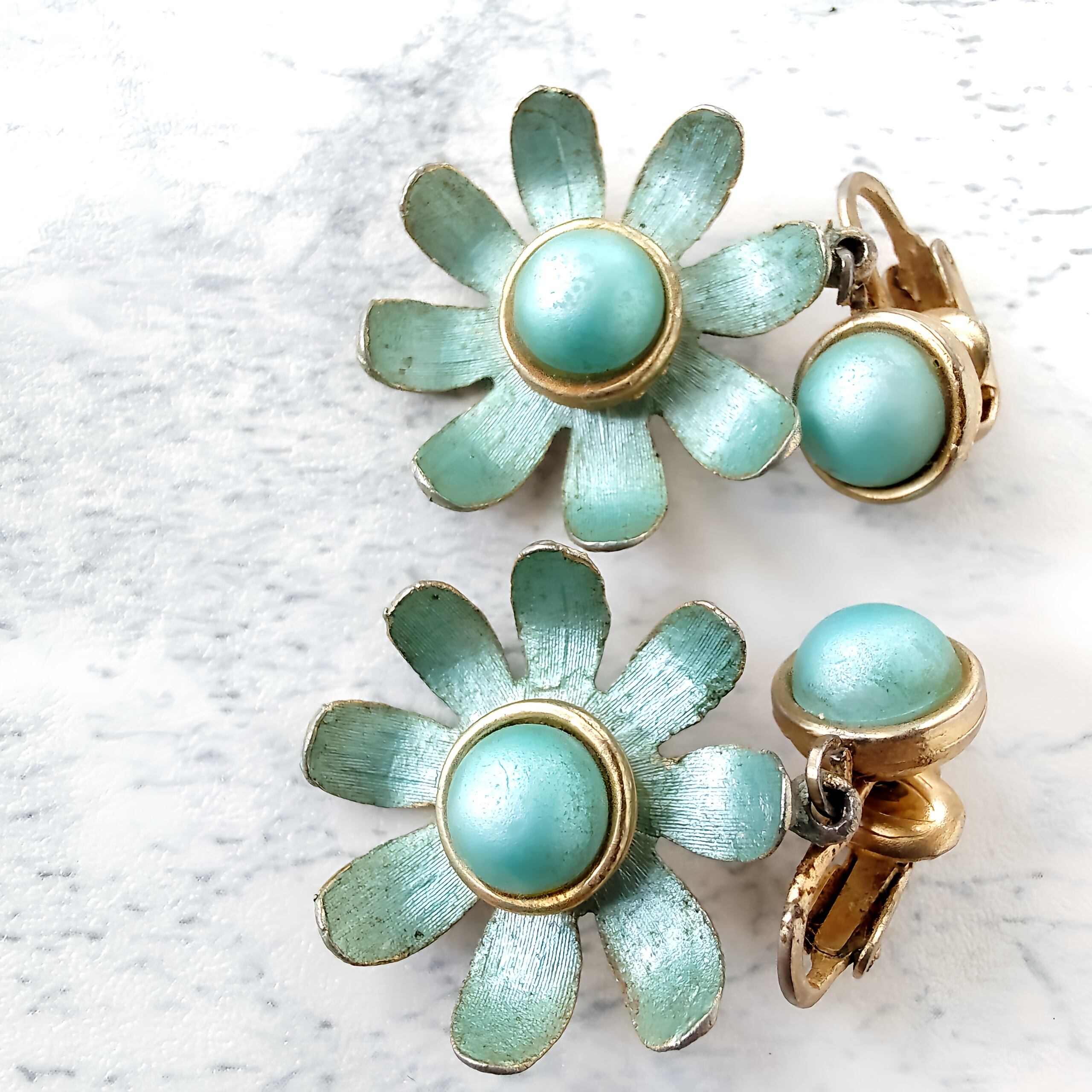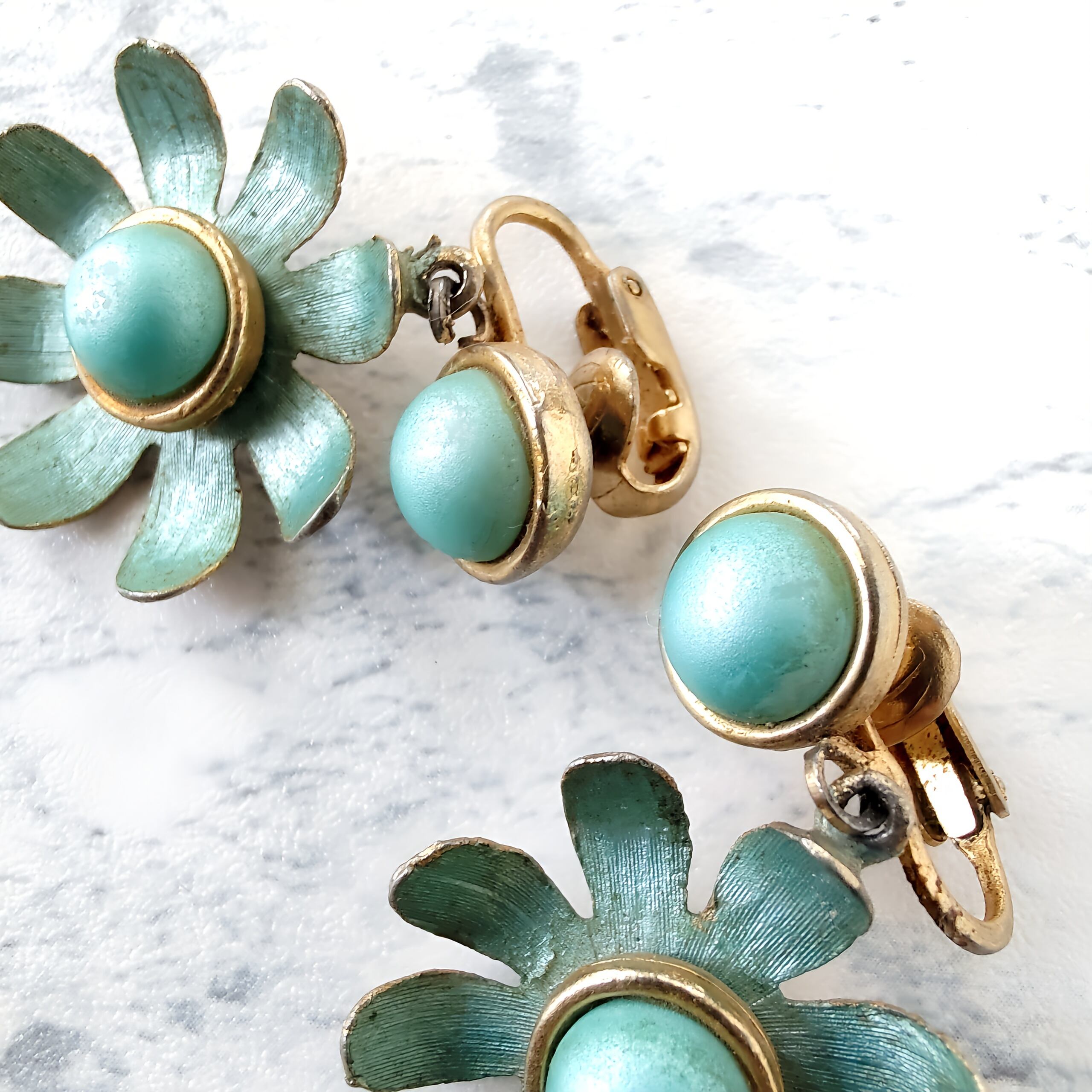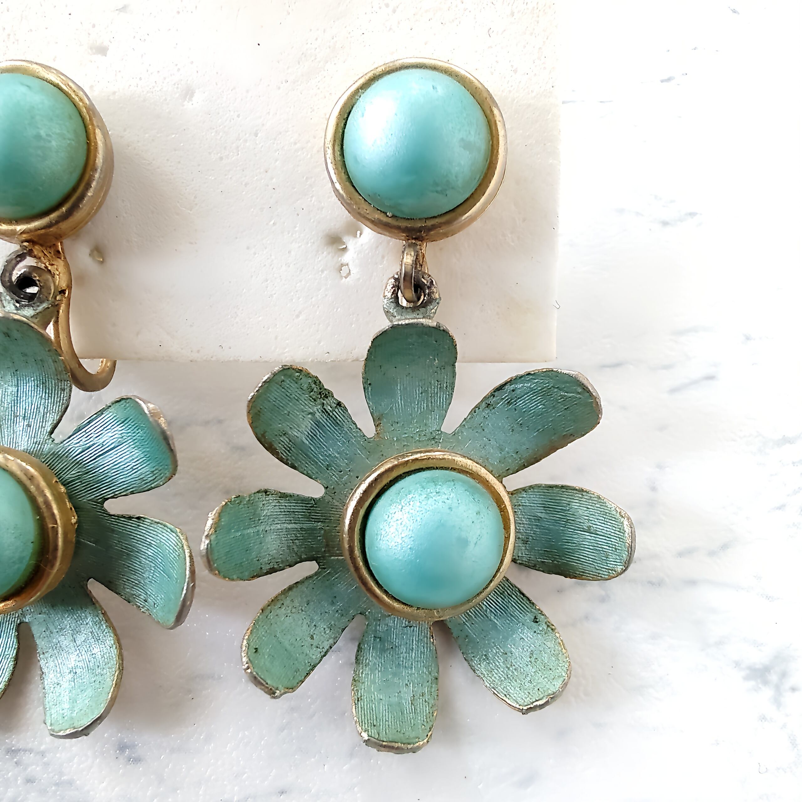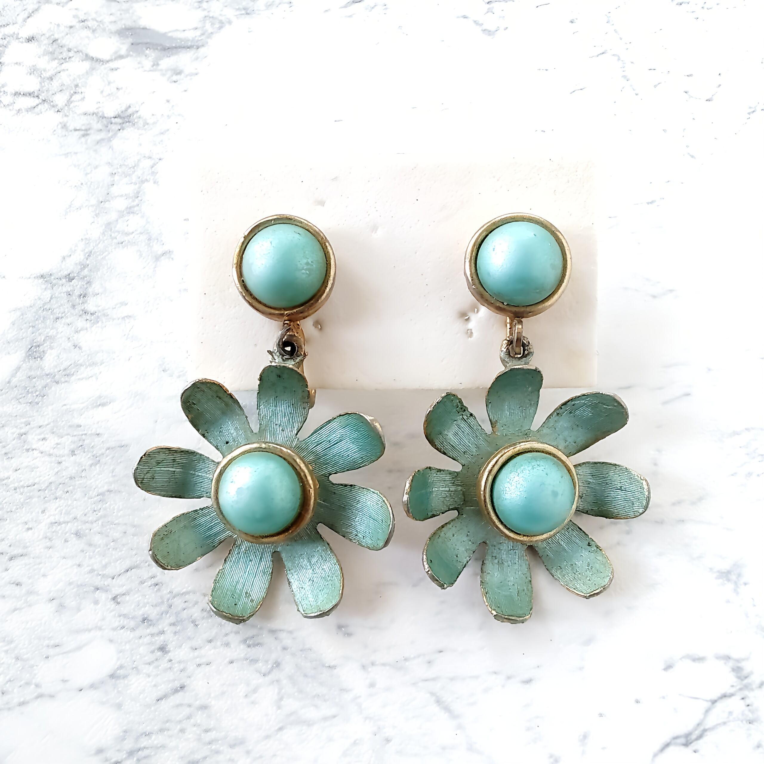 マットな水色のエナメルで色付けされたフラワーが揺れるデザインのヴィンテージイヤリングです。