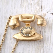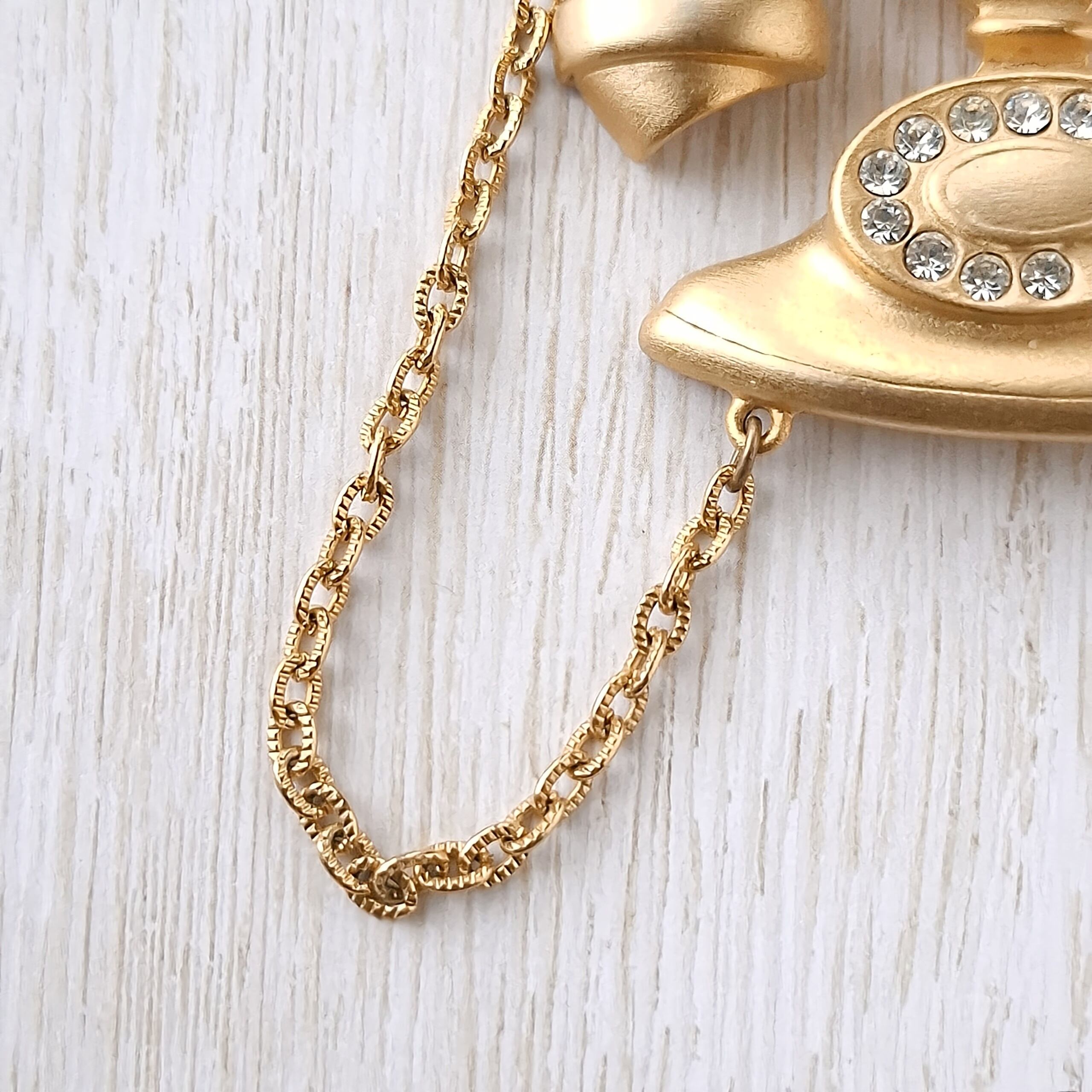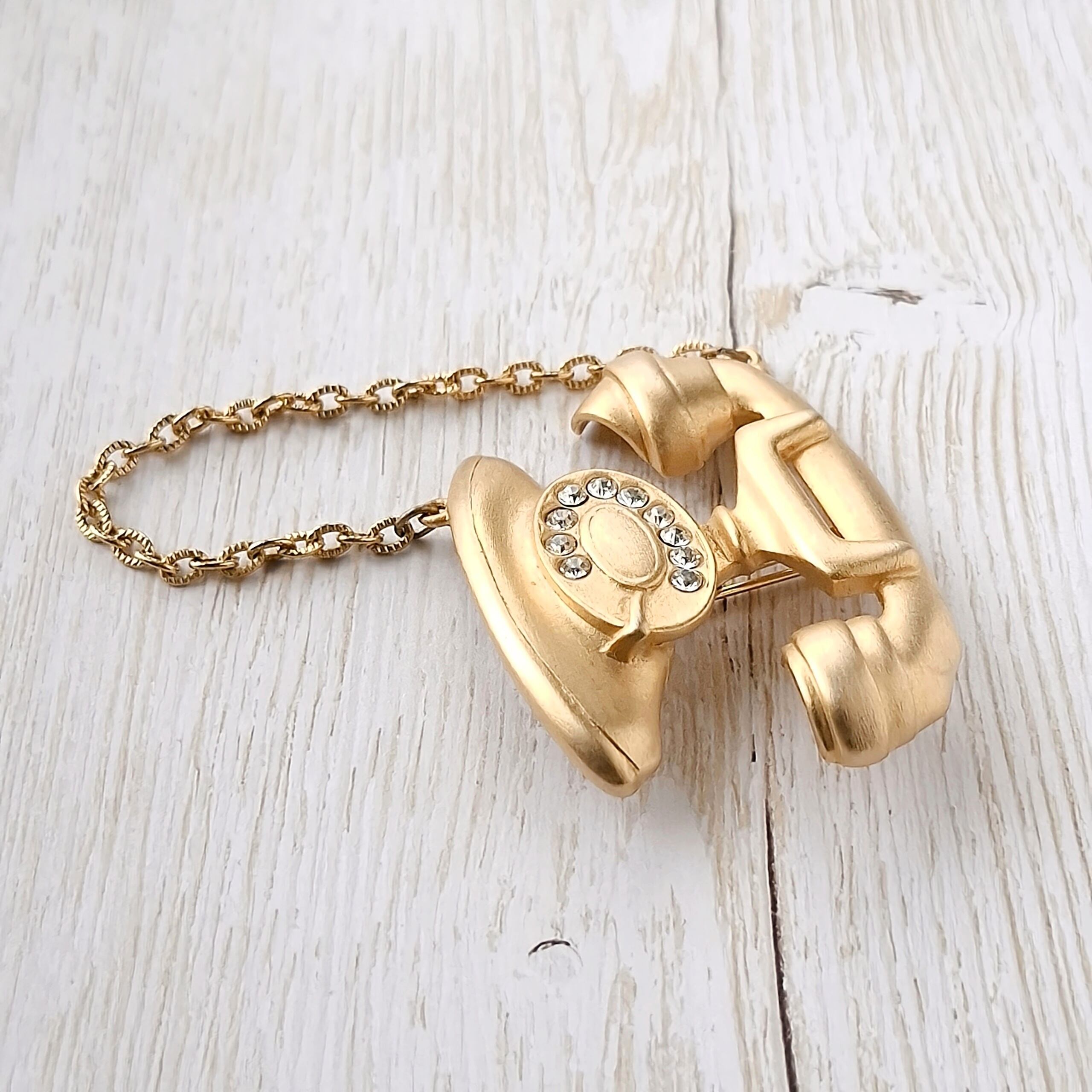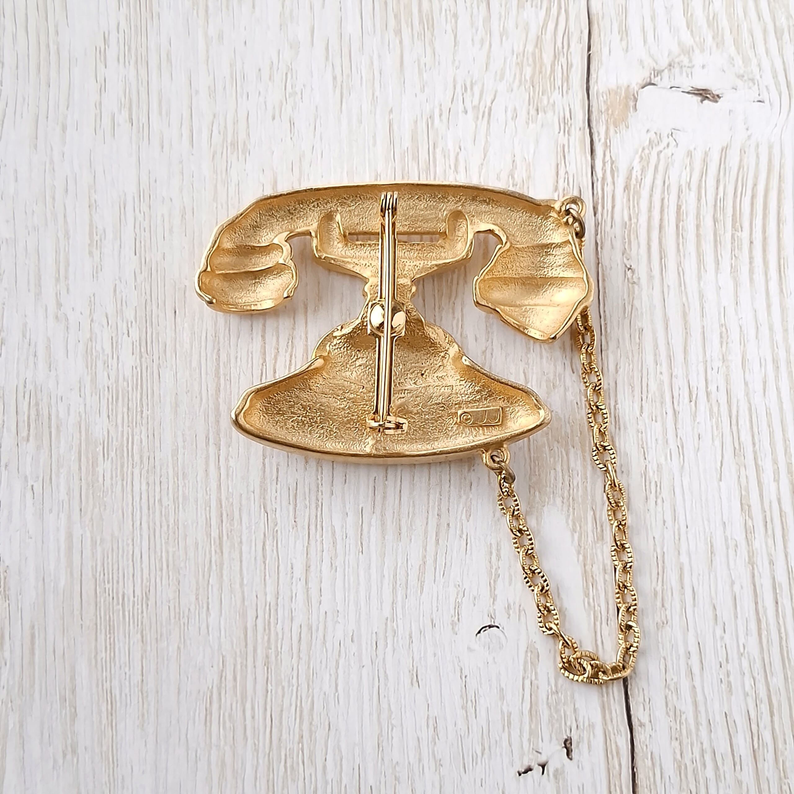 1935年にアメリカのロードアイランド州プロビデンスにて設立された「Jonette Jewelry Company」(通称J.J.、JJ)のダイヤルにクリアラインストーンがあしらわれたゴールドメタルのチェーンが付いたレトロな電話のヴィンテージブローチです。