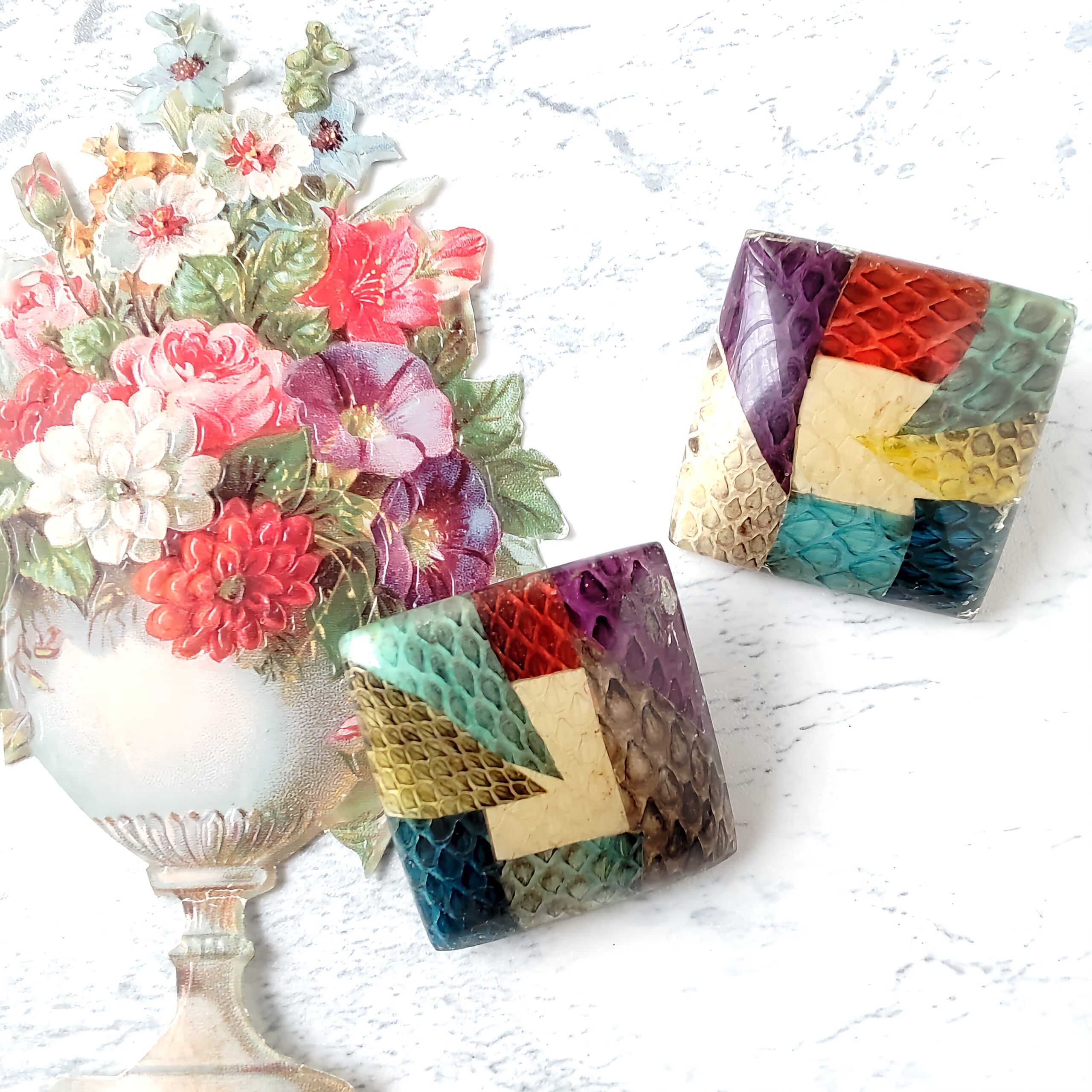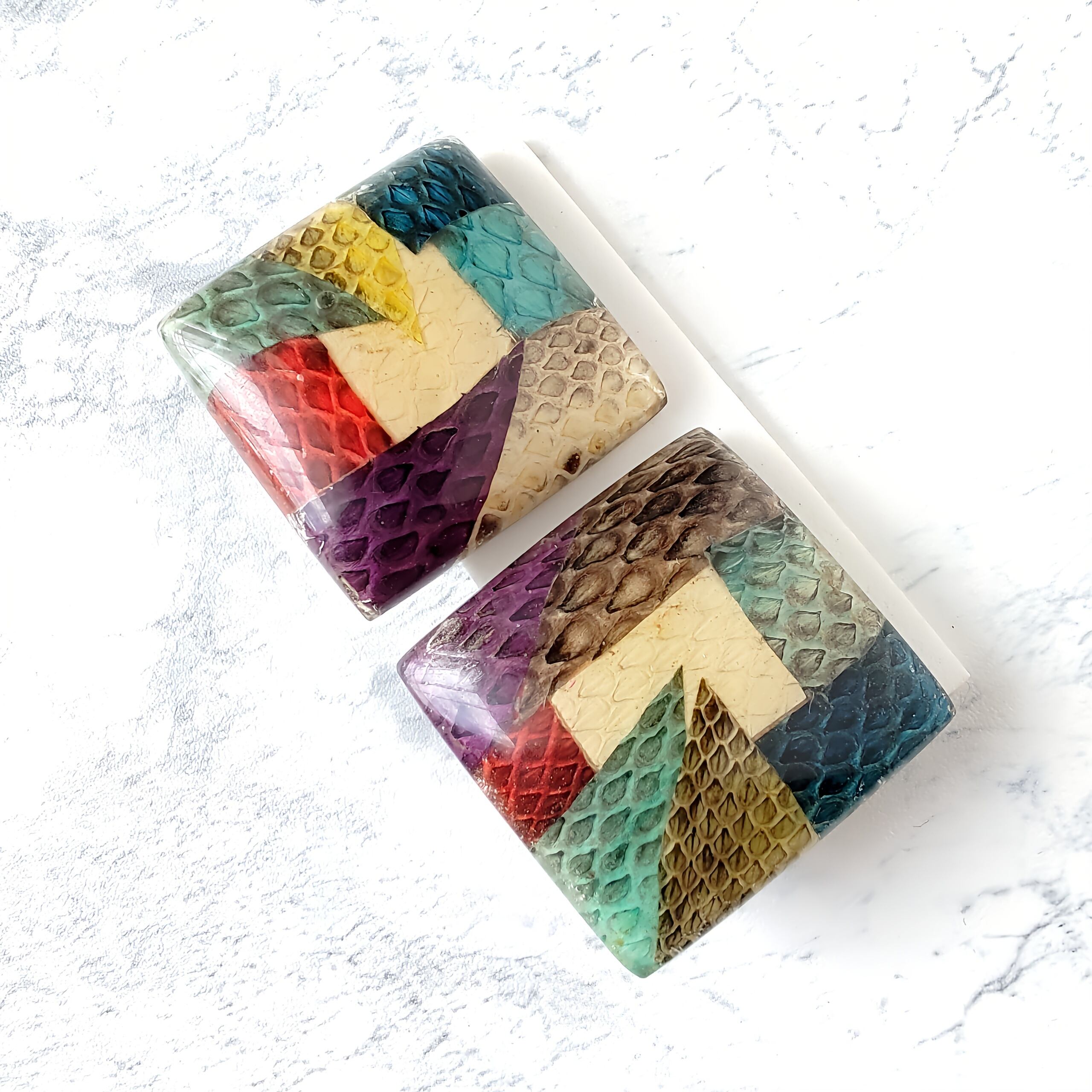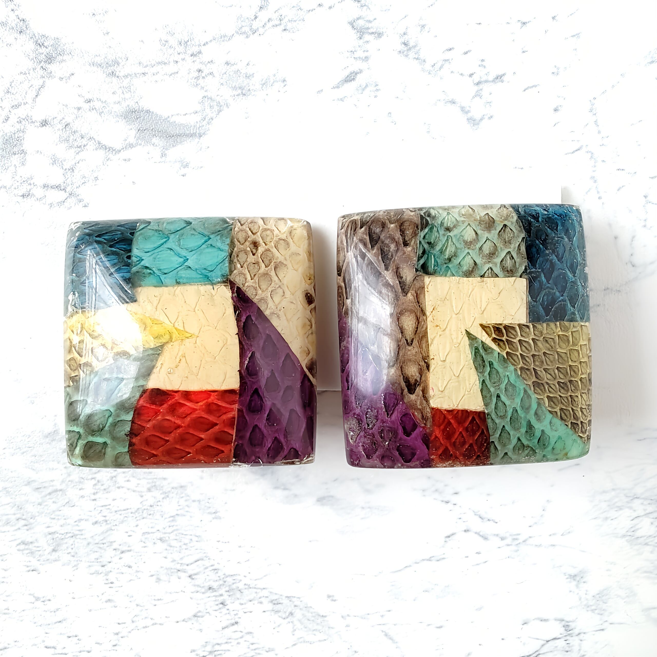 カラフルなスネークスキン柄がパッチワークになったデザインのスクエア型の大ぶりなヴィンテージイヤリングです。