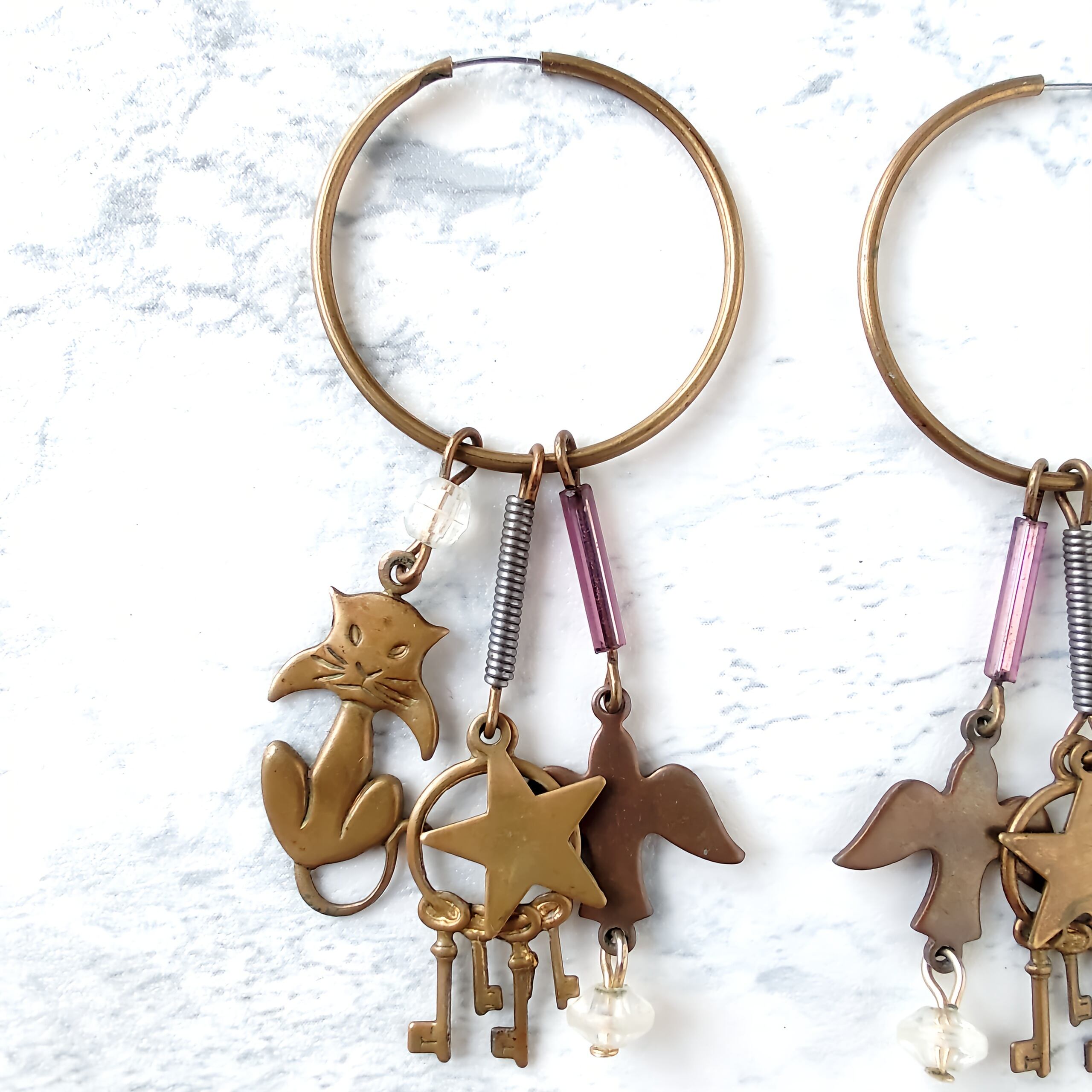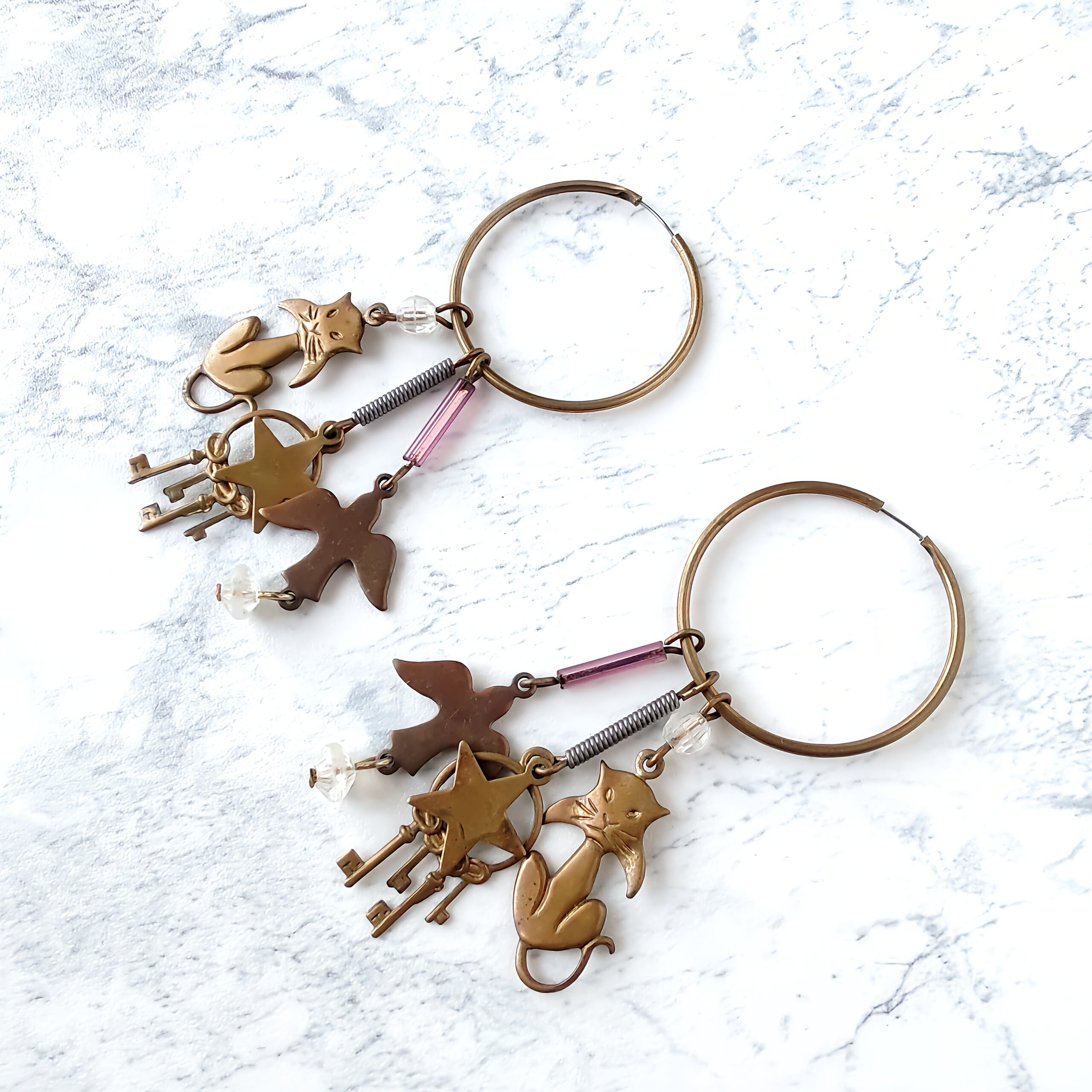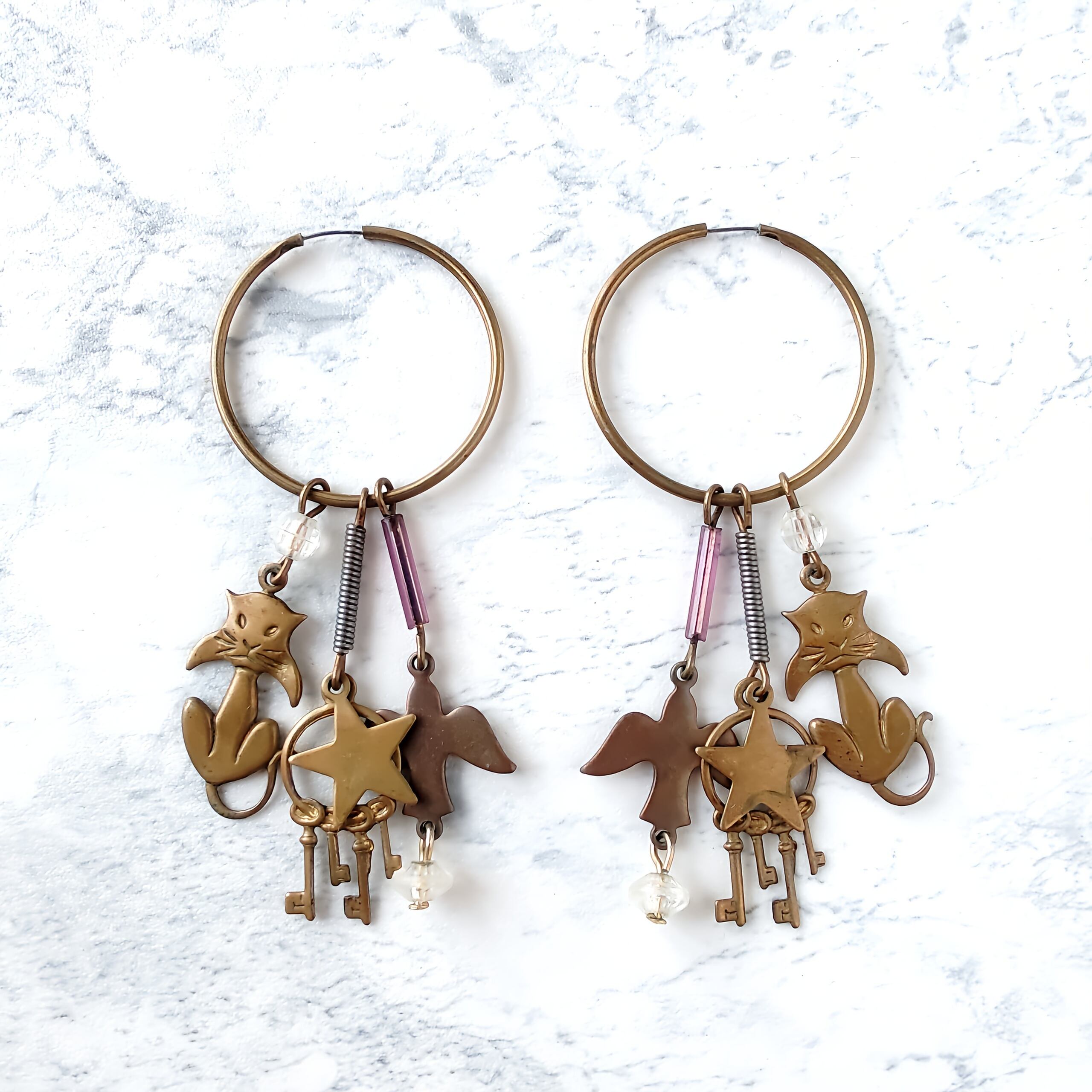 細めのフープに真鍮の猫、星が付いた鍵、鳥がぶら下がったデザインのヴィンテージピアスです。