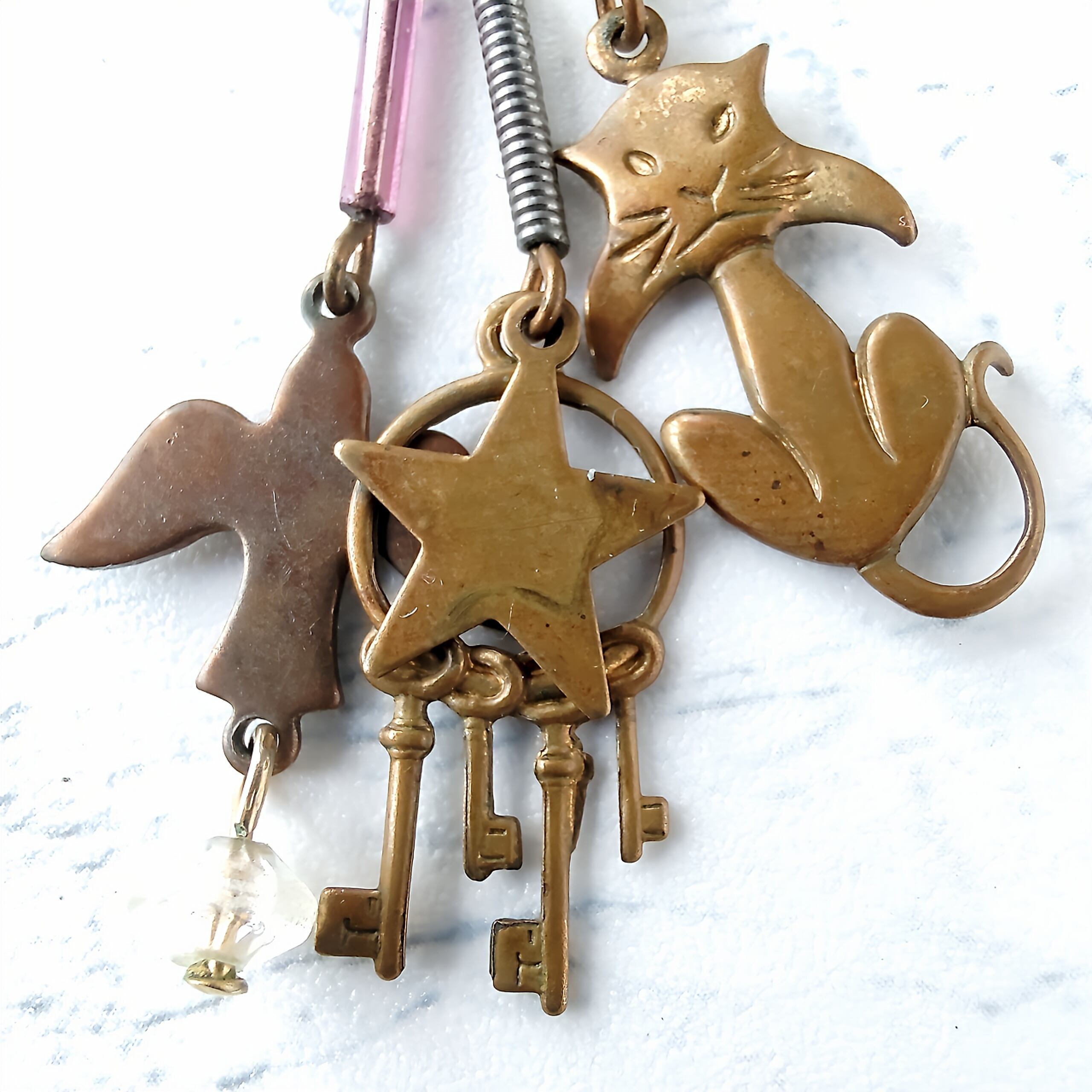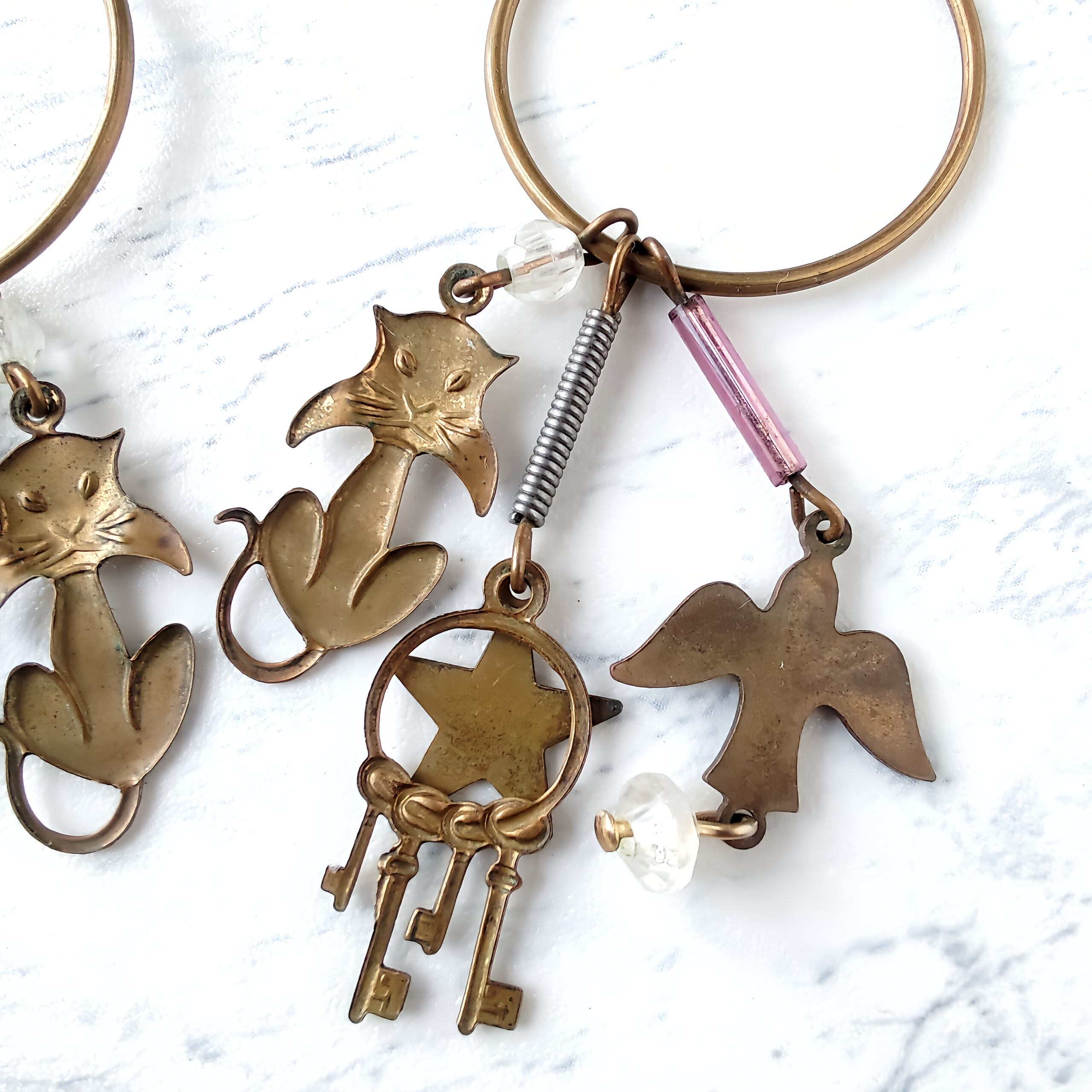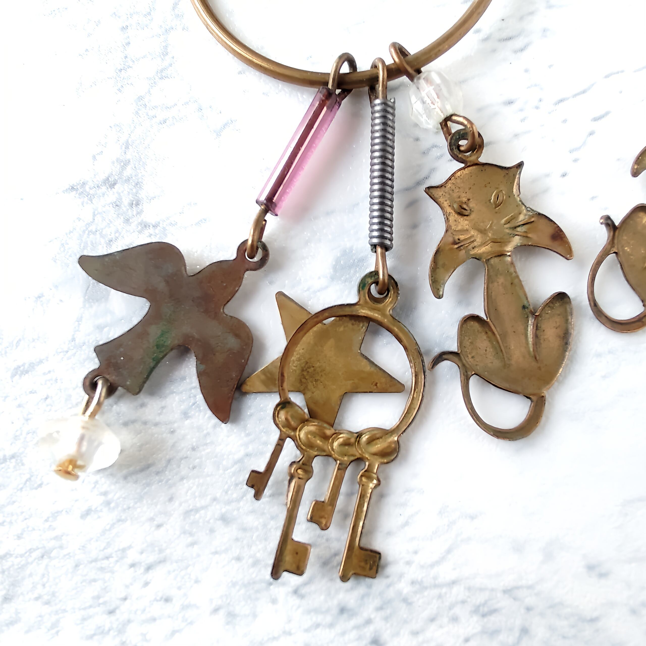 細めのフープに真鍮の猫、星が付いた鍵、鳥がぶら下がったデザインのヴィンテージピアスです。