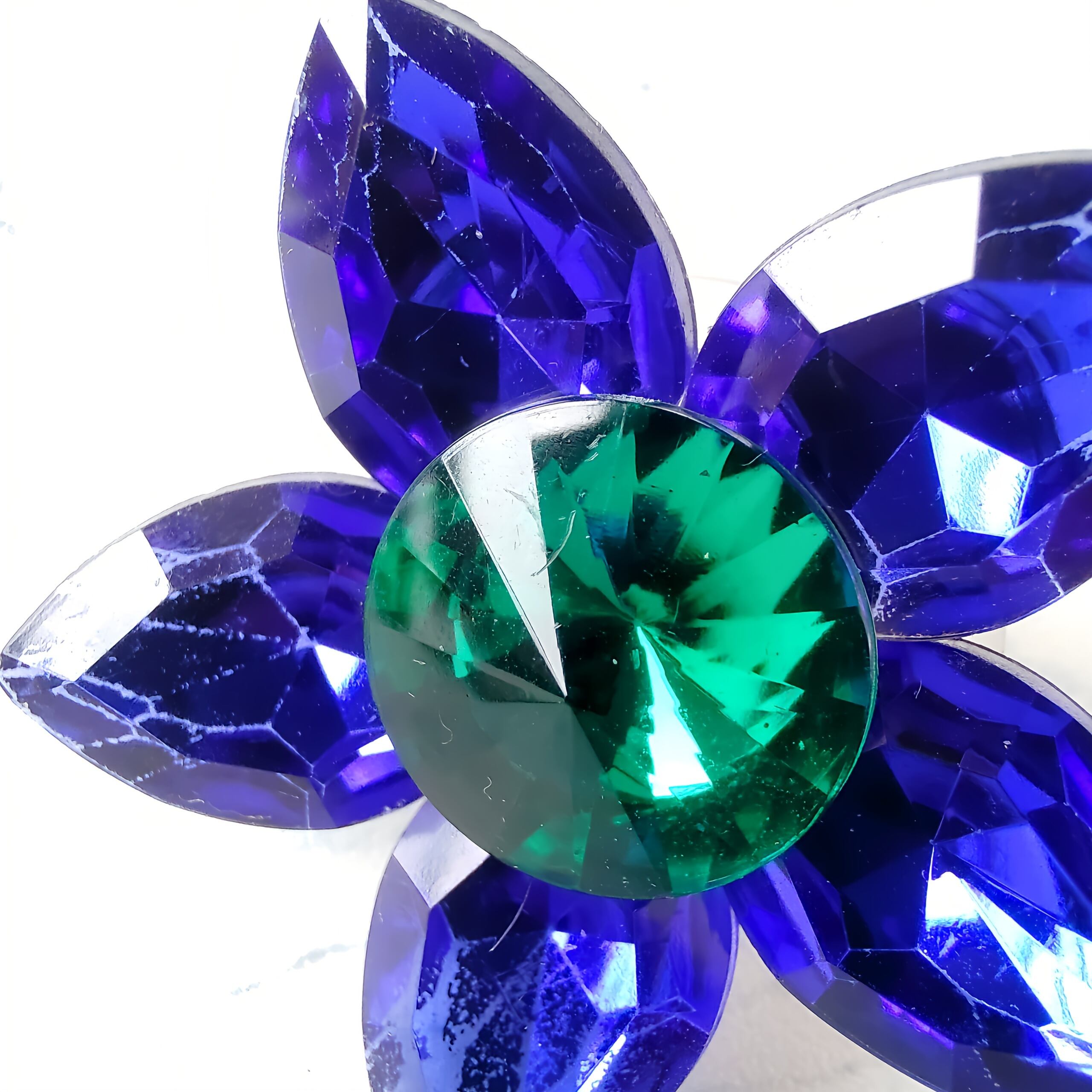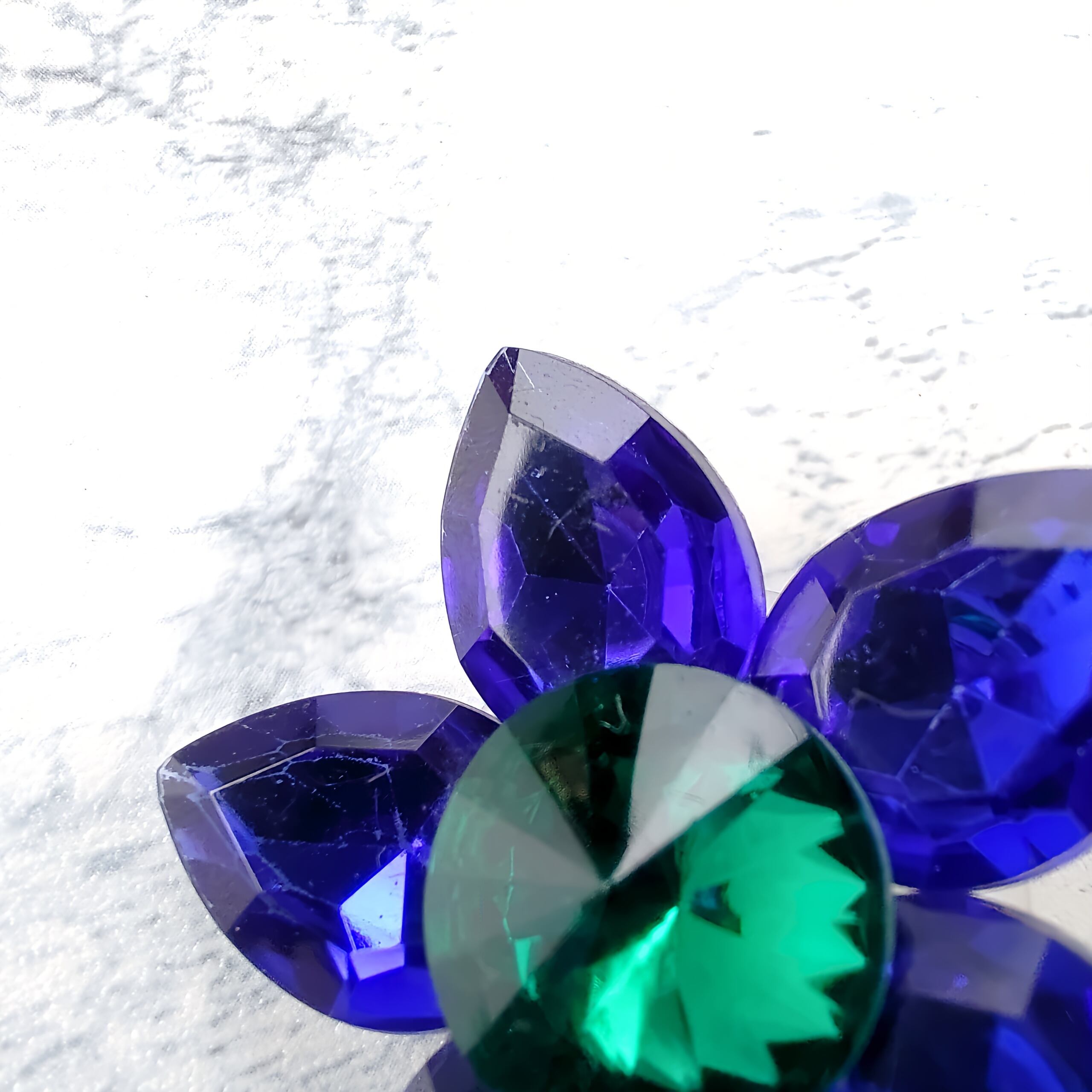 ブルーのプラスチックラインストーンの裏側に摩擦によるシルバーのコーティングの剥がれが見られ、花びらの先の方が透けています。