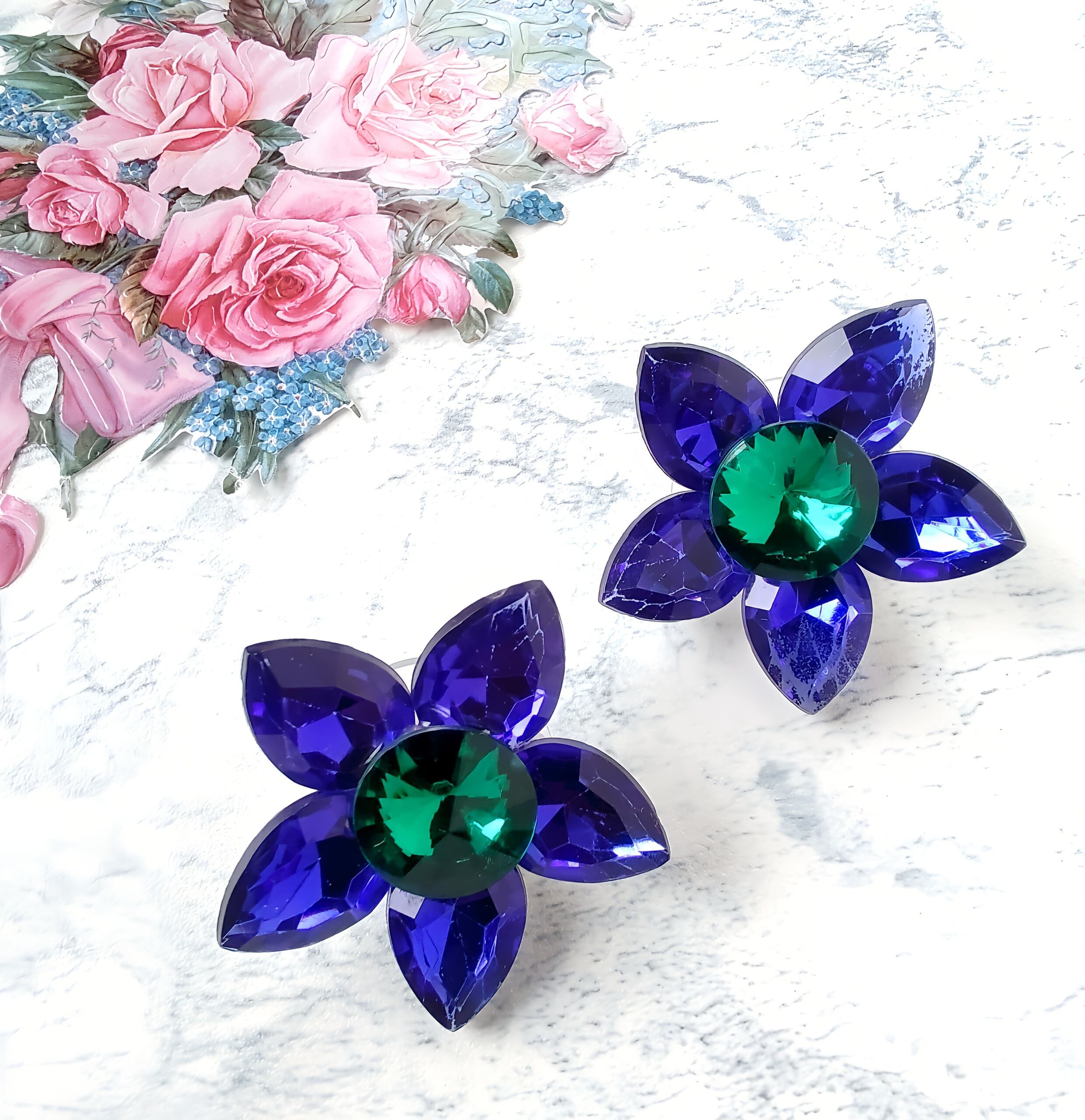 中央にグリーンのリヴォリ、花びらにブルーのティアドロップのプラスチックで大ぶりなフラワーがデザインされたヴィンテージイヤリングです。