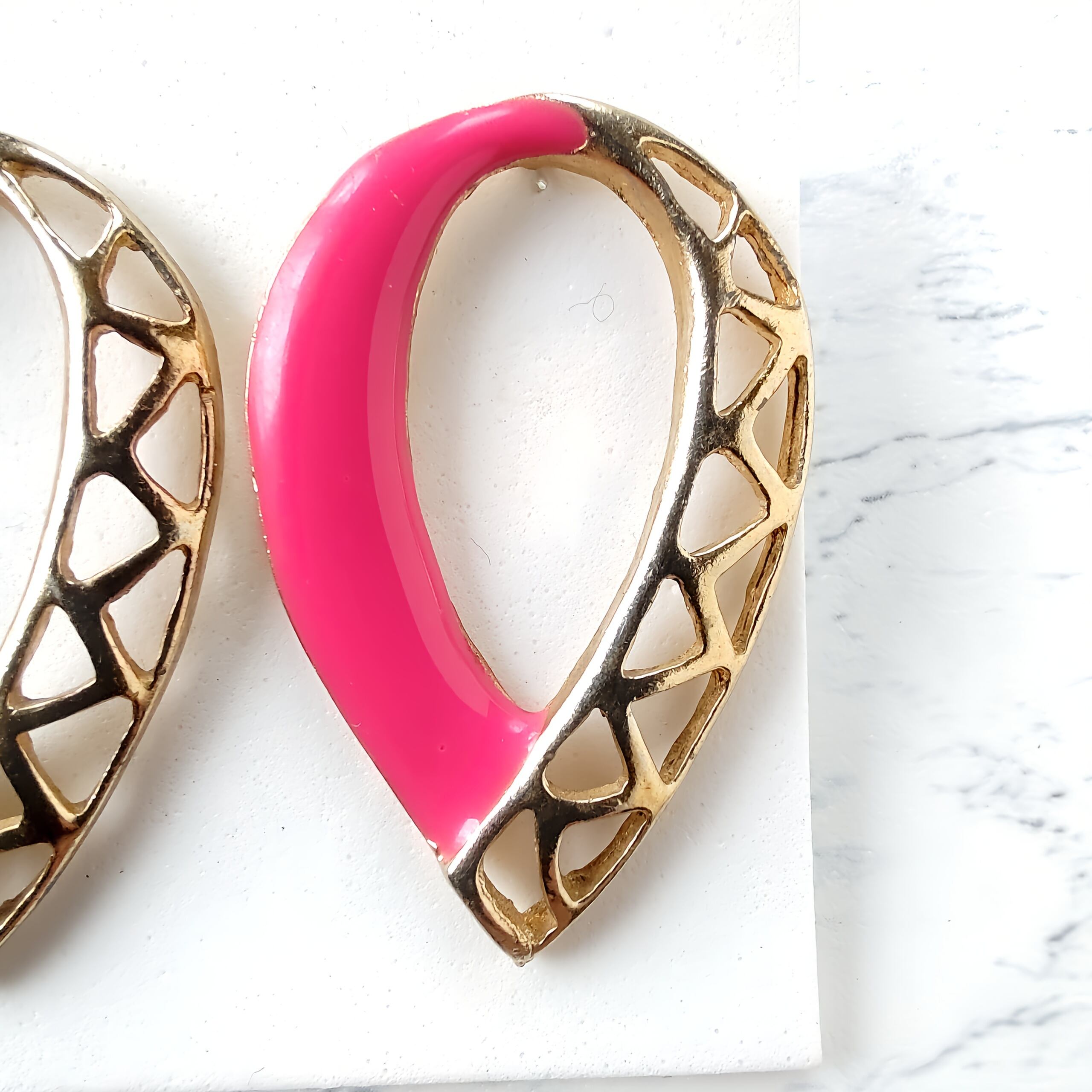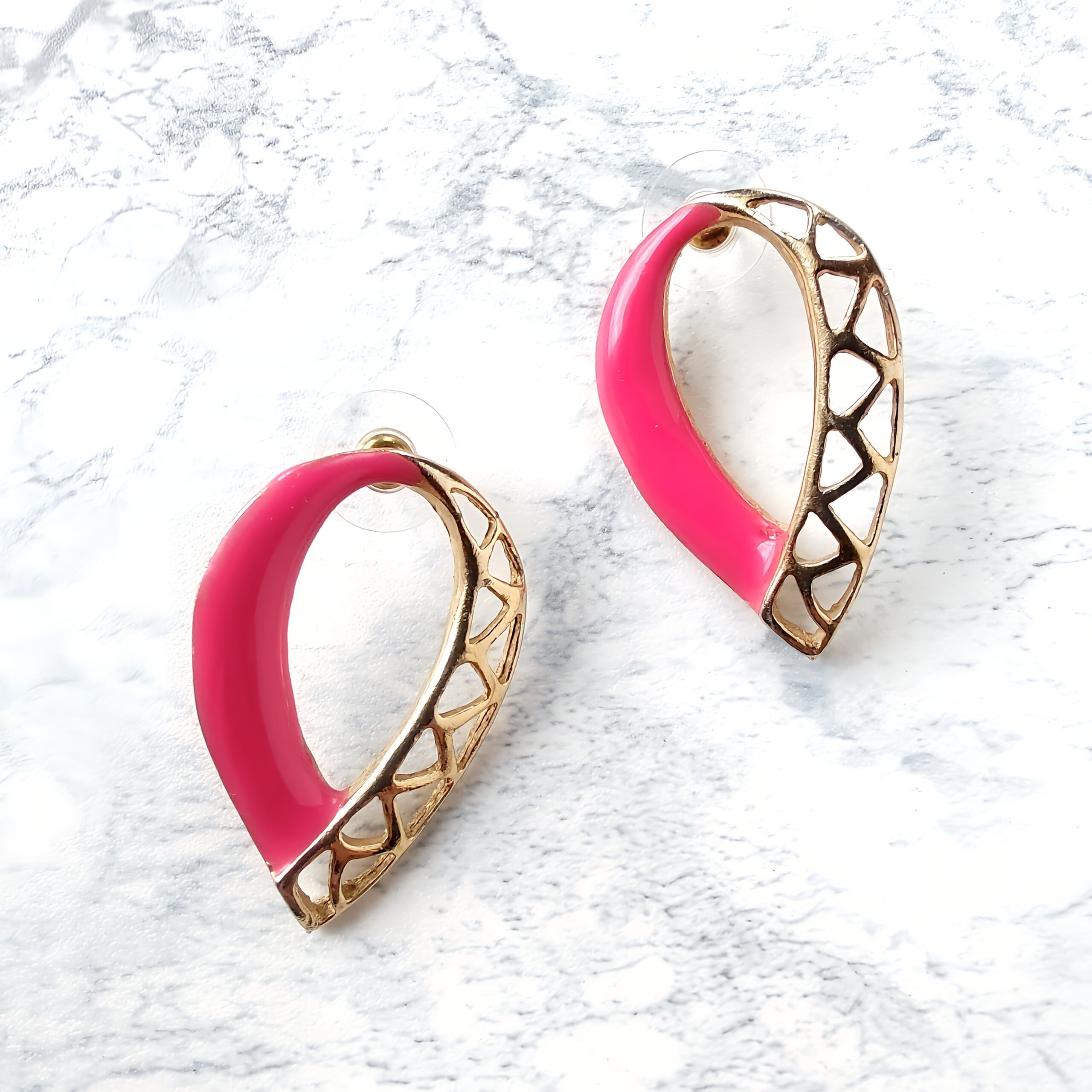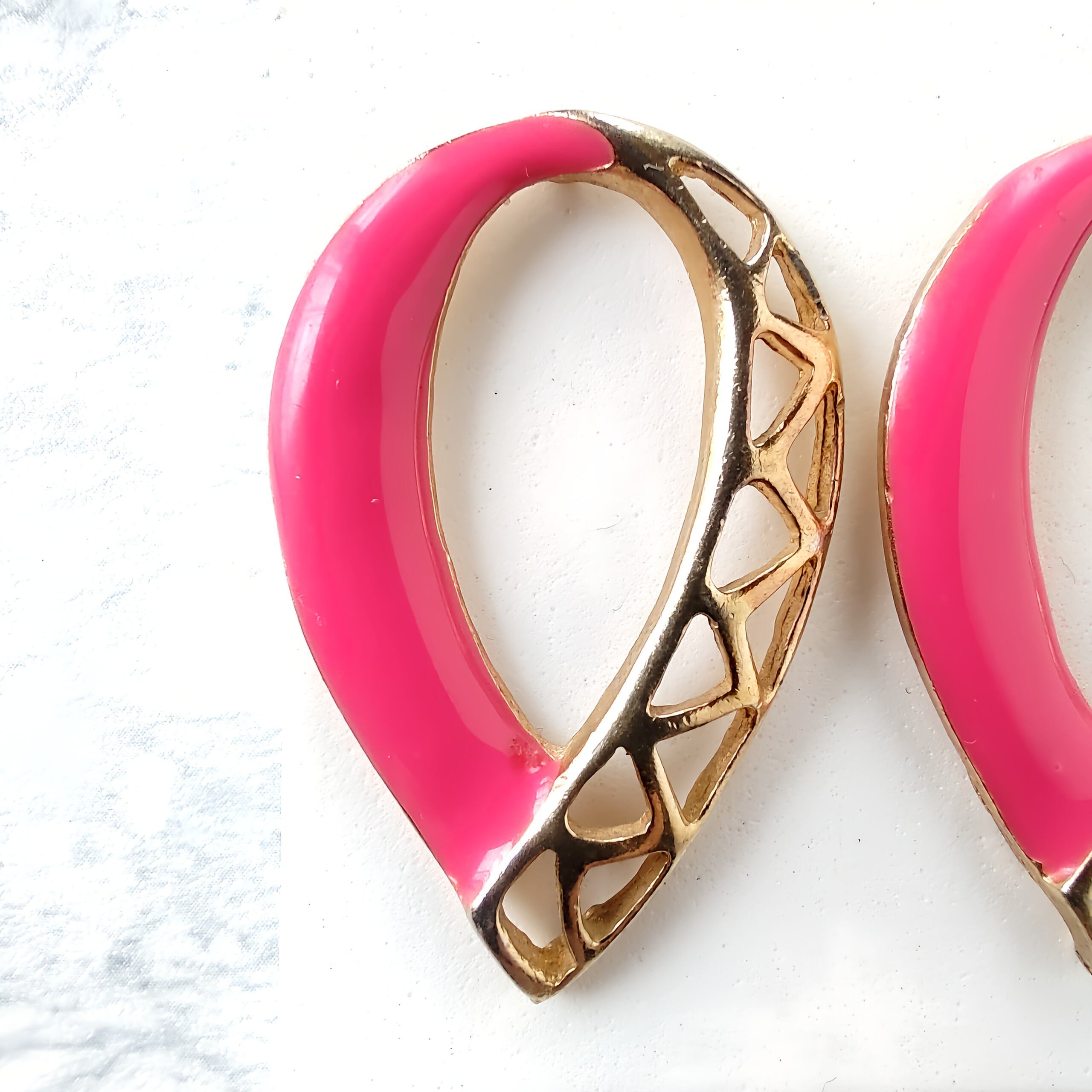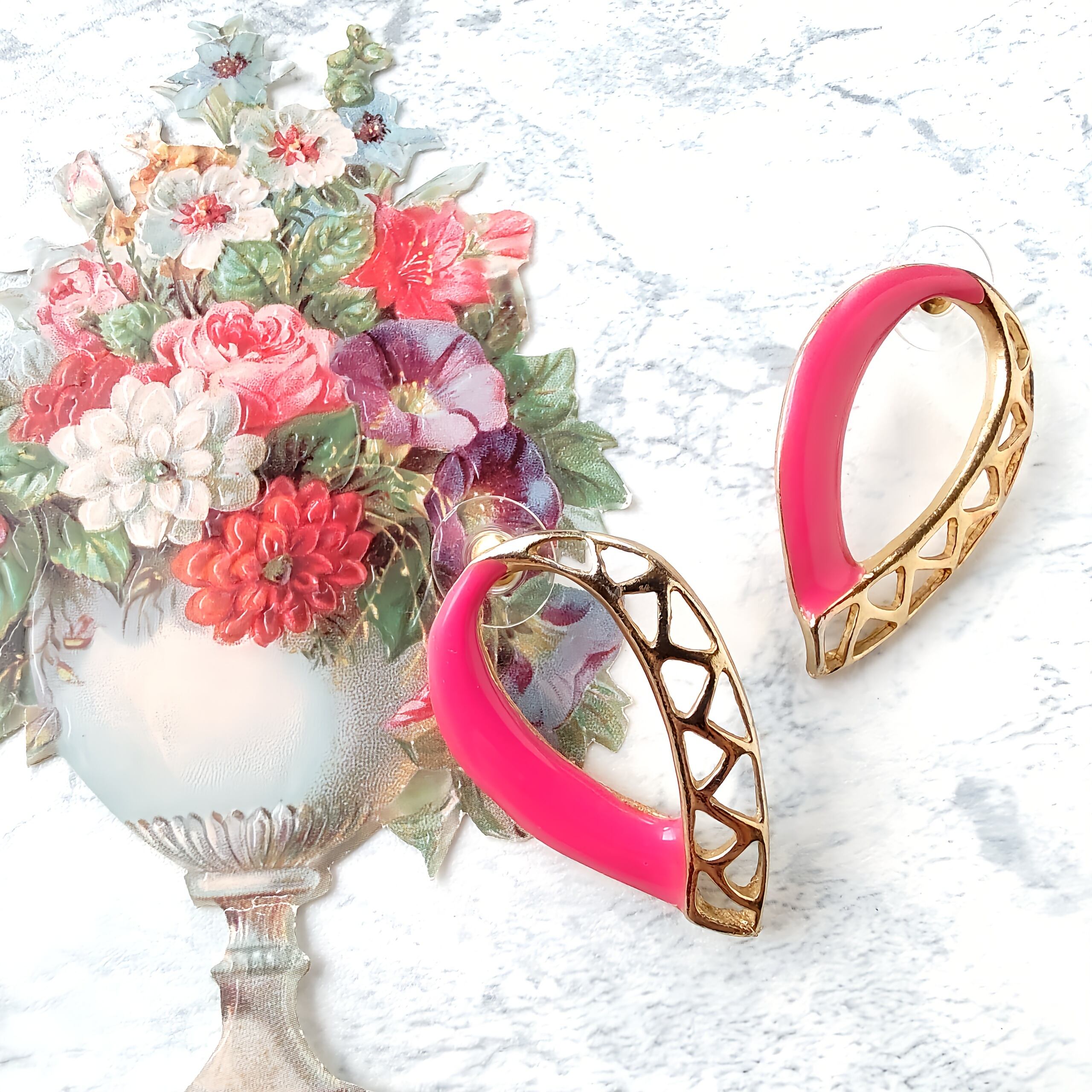 片側がオープンワーク、もう片側がビビッドピンクのエナメルで色付けされたティアドロップ型のヴィンテージピアスです。