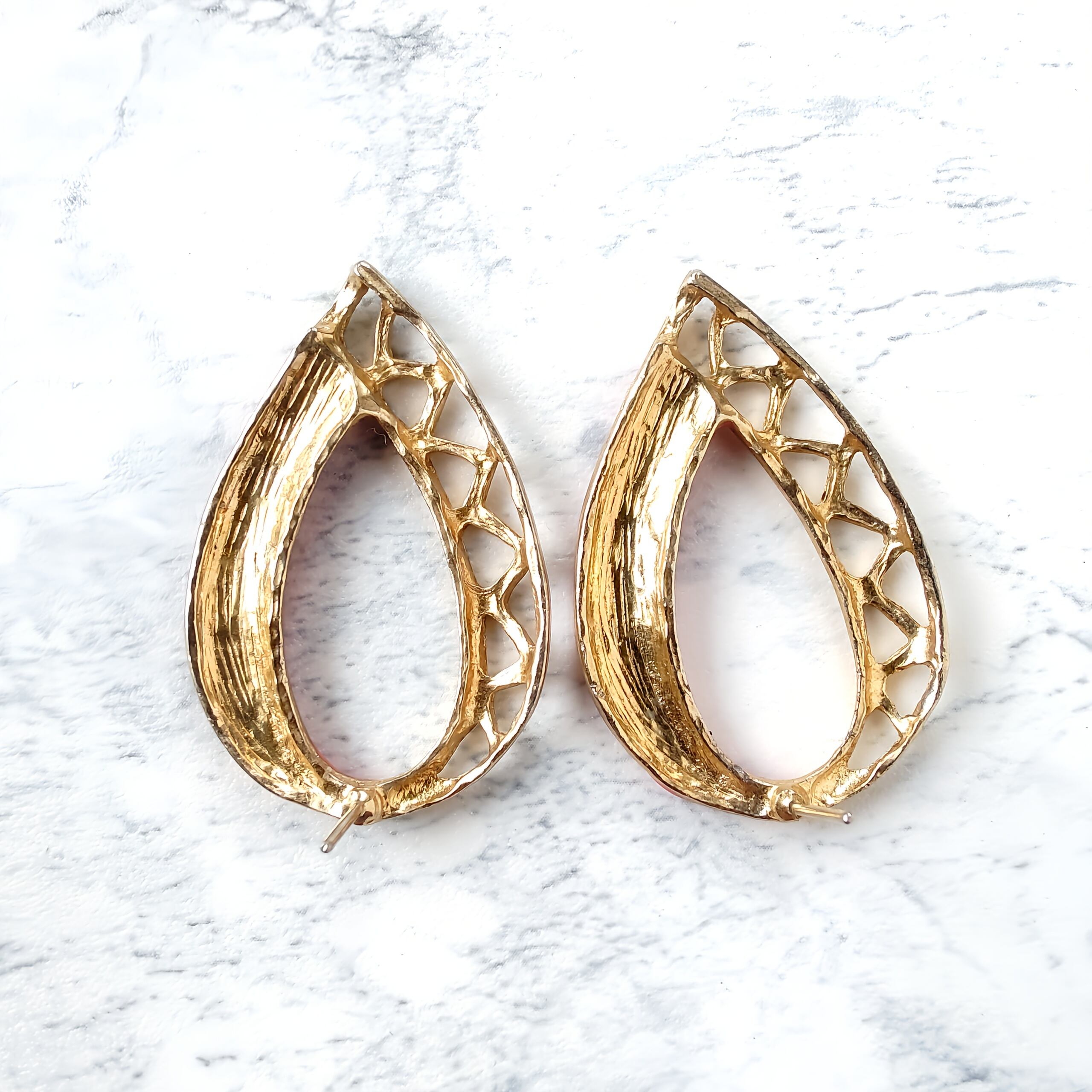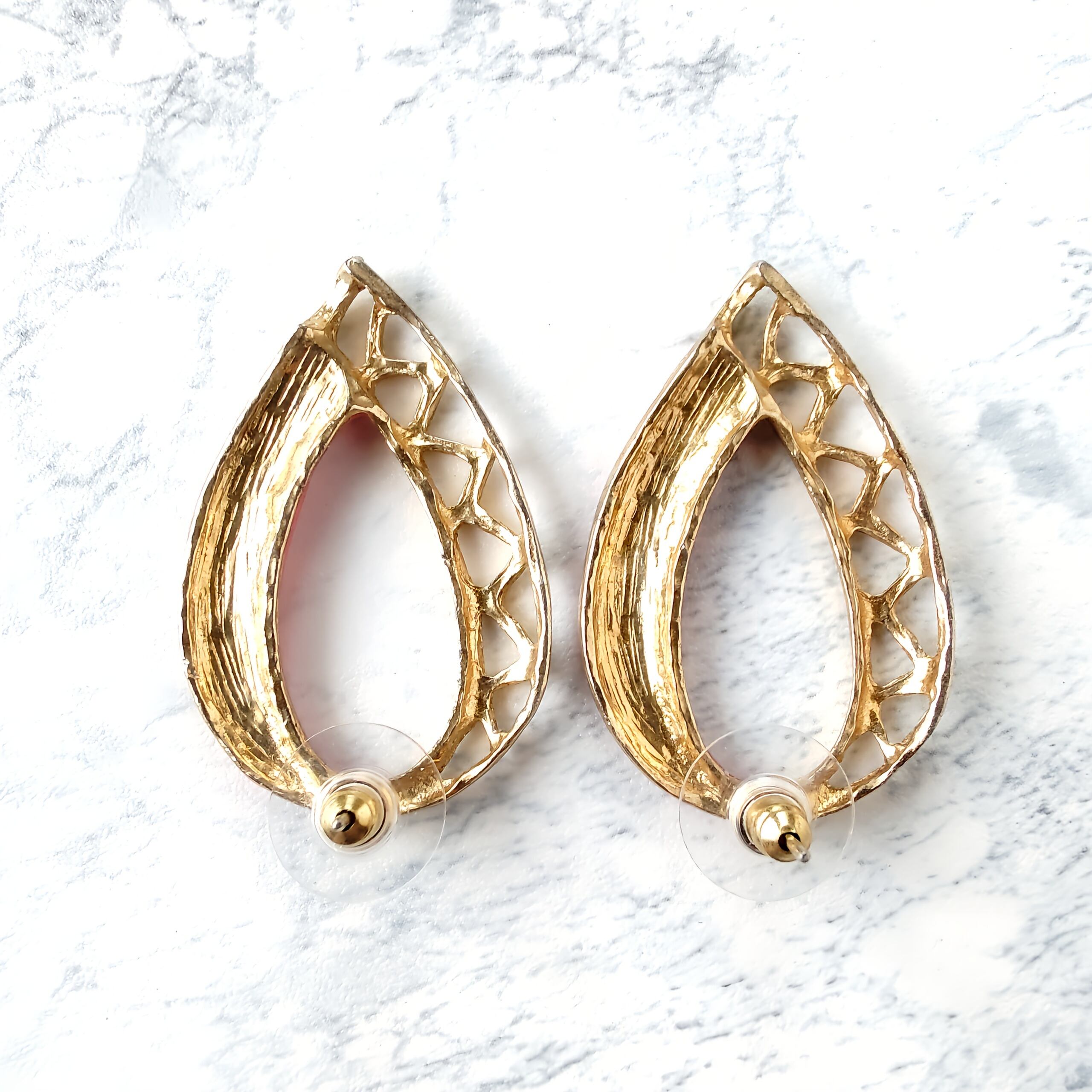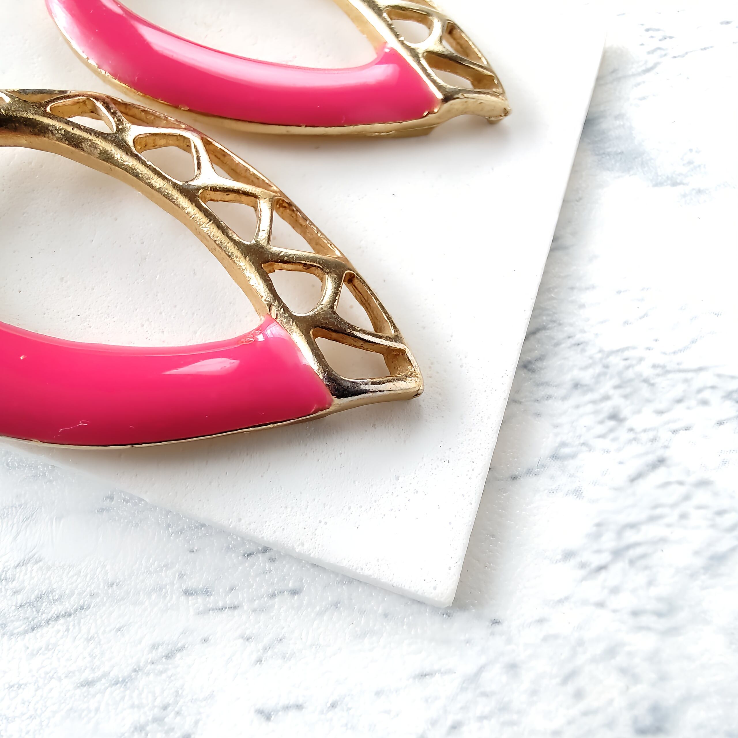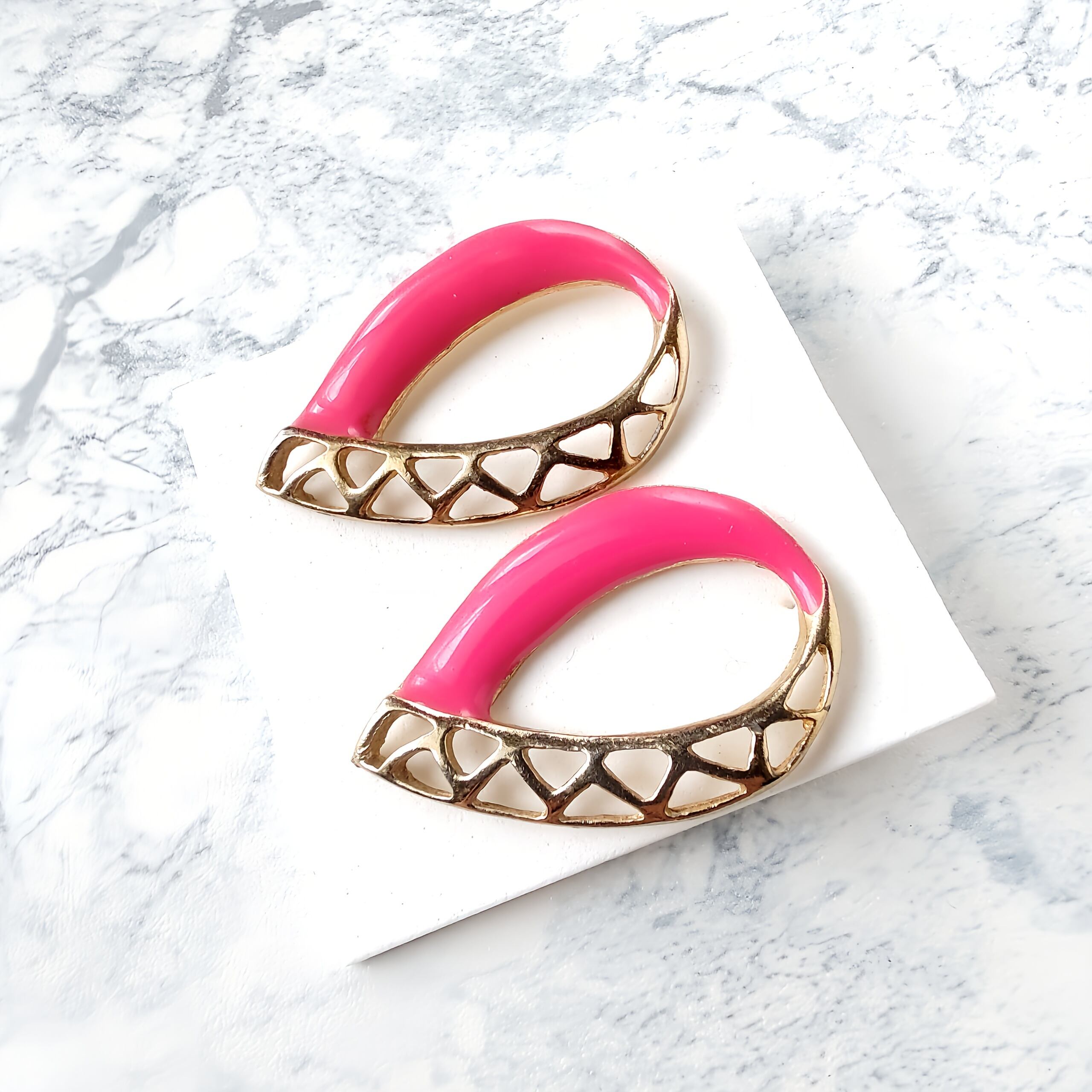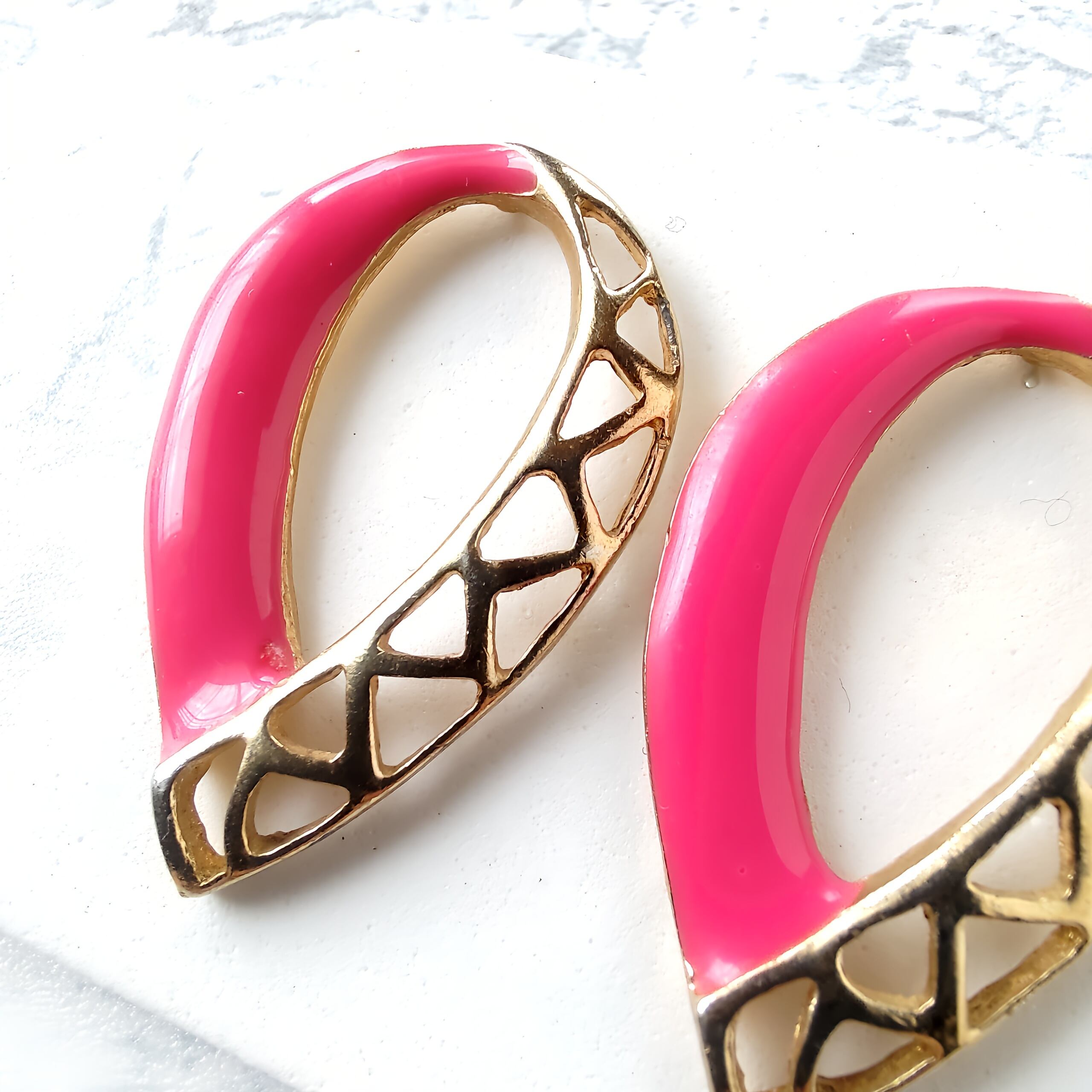片側がオープンワーク、もう片側がビビッドピンクのエナメルで色付けされたティアドロップ型のヴィンテージピアスです。