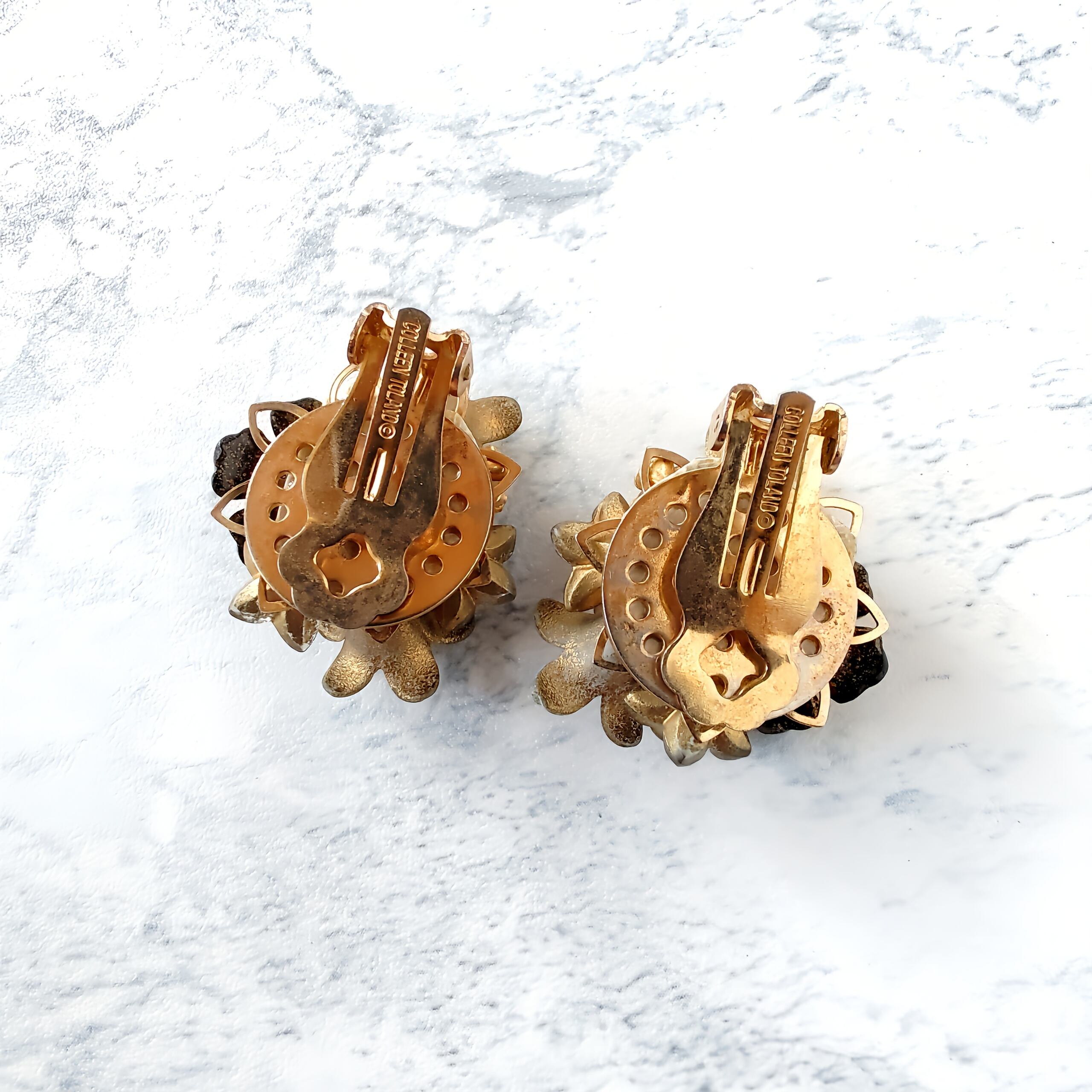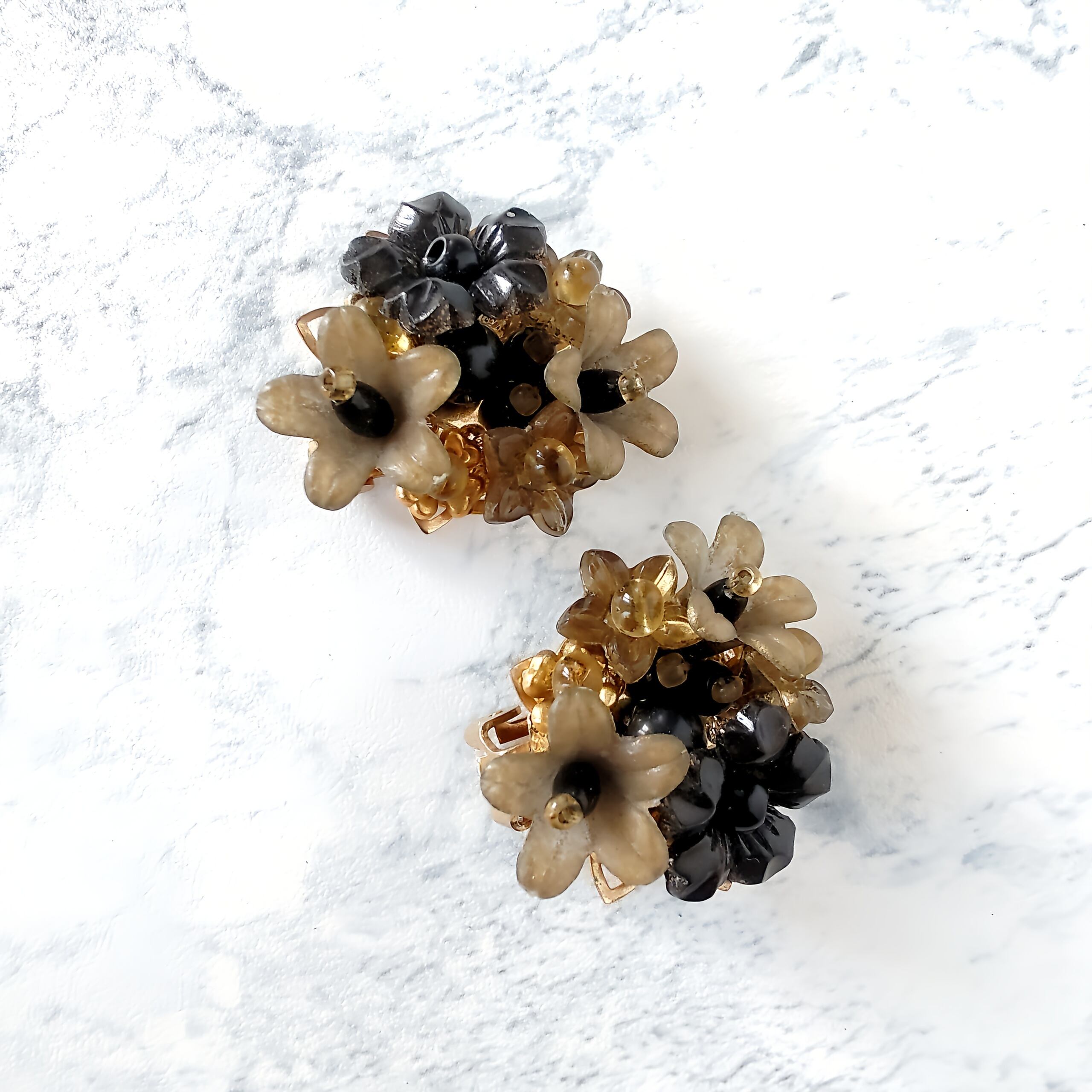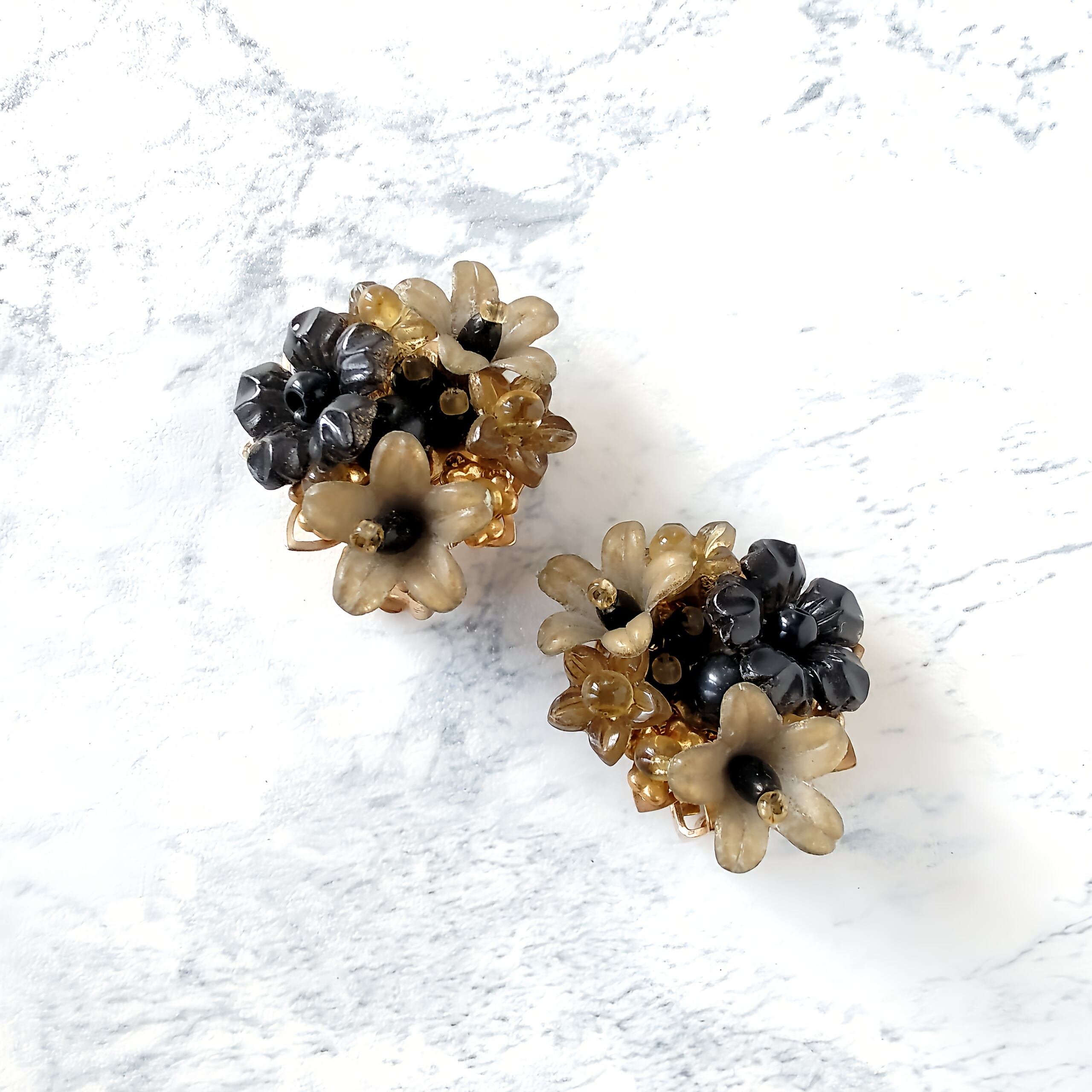 1980年代にニットウェアを製作、80年代後半にジュエリーの製作を開始したColleen Toland(コリン トーランド)のブラック、ベージュ、アンバーのフラワーパーツを使用して造られたクラスターデザインのヴィンテージイヤリングです。