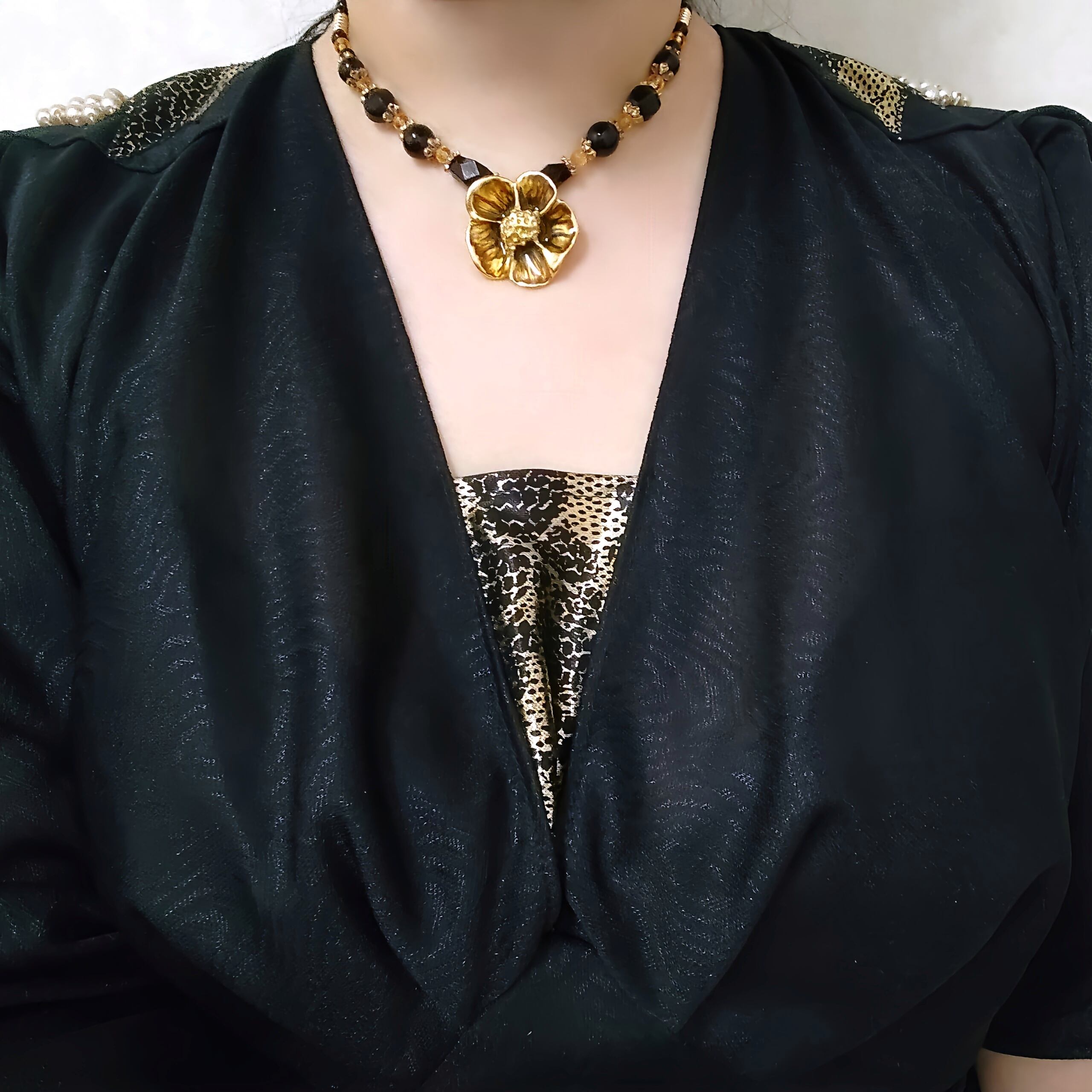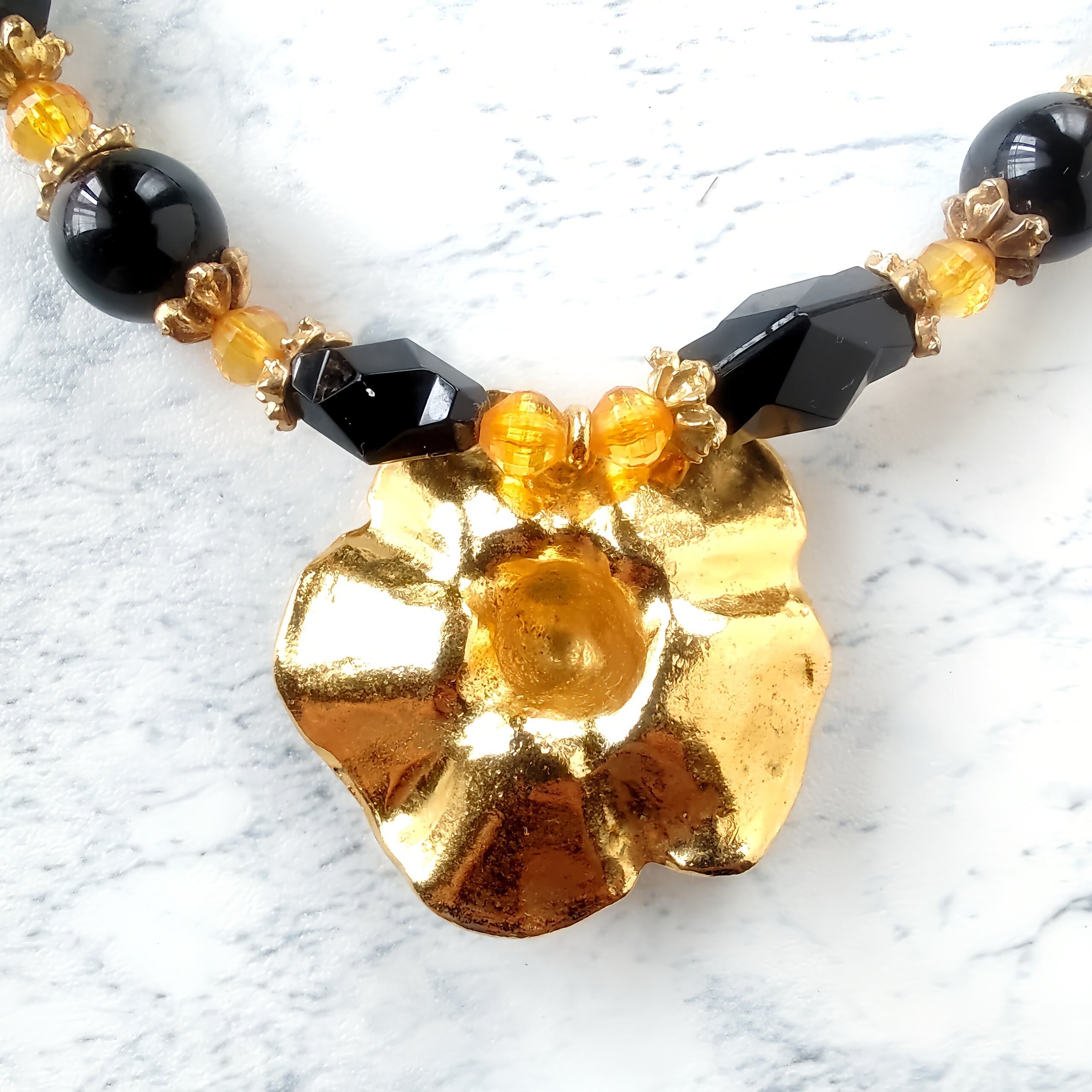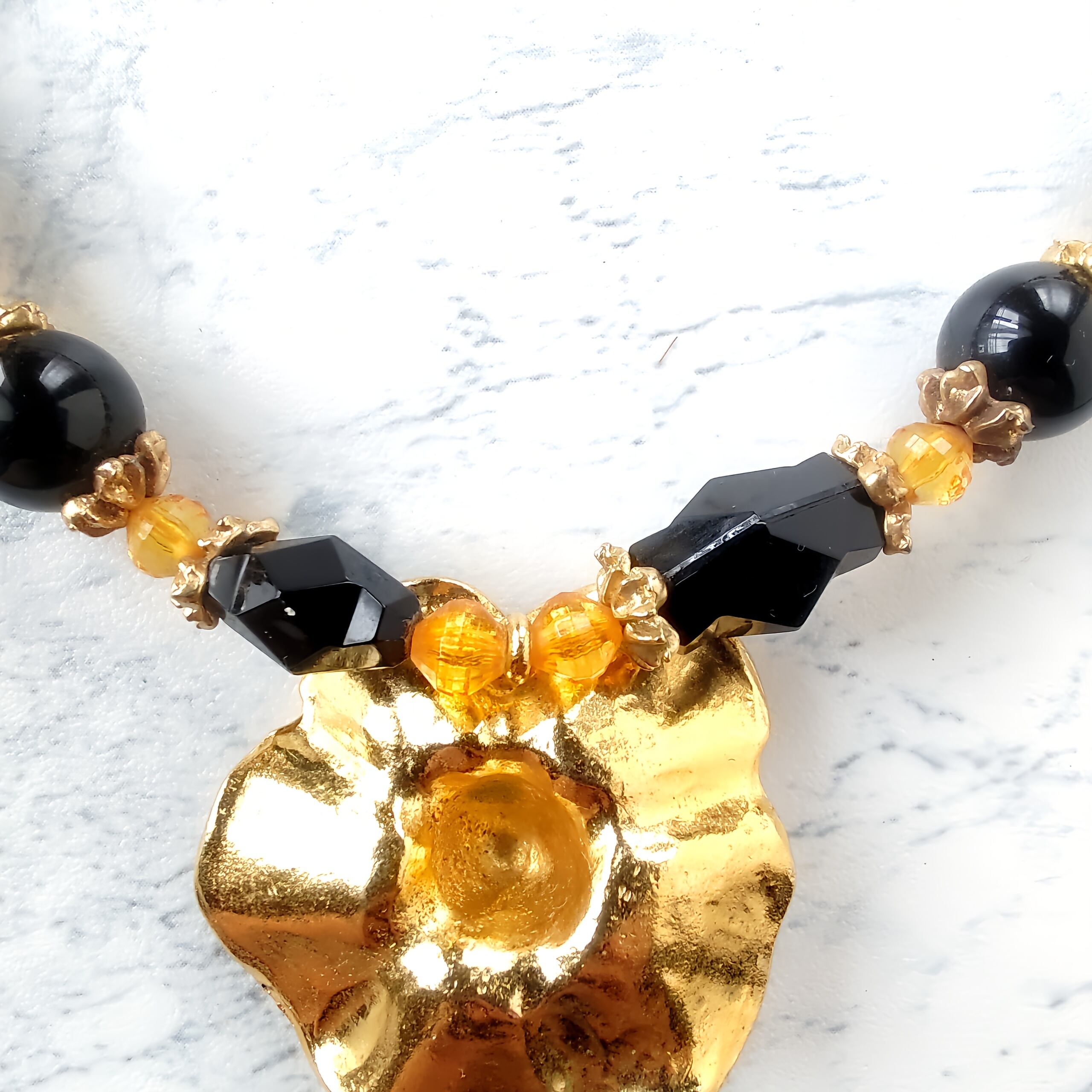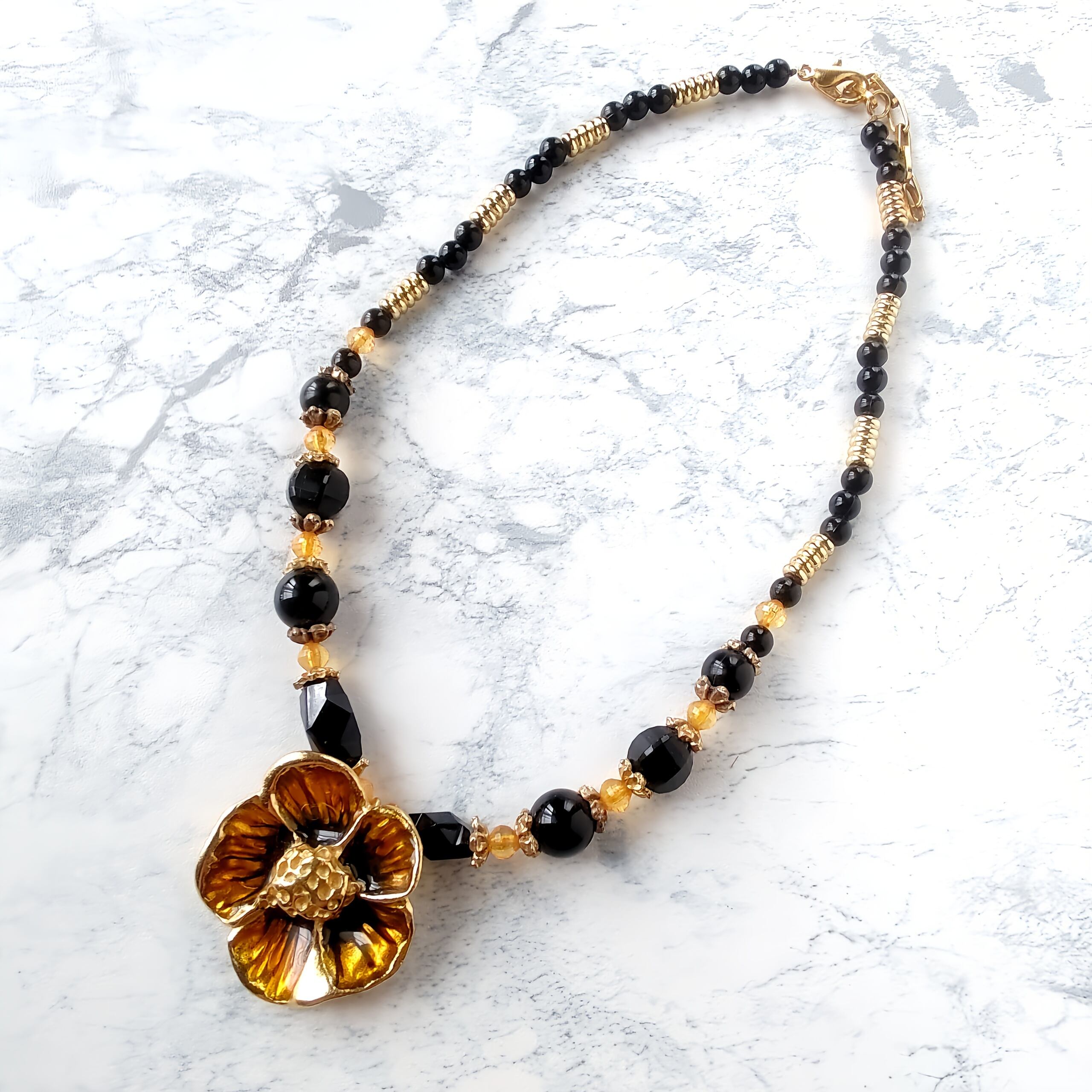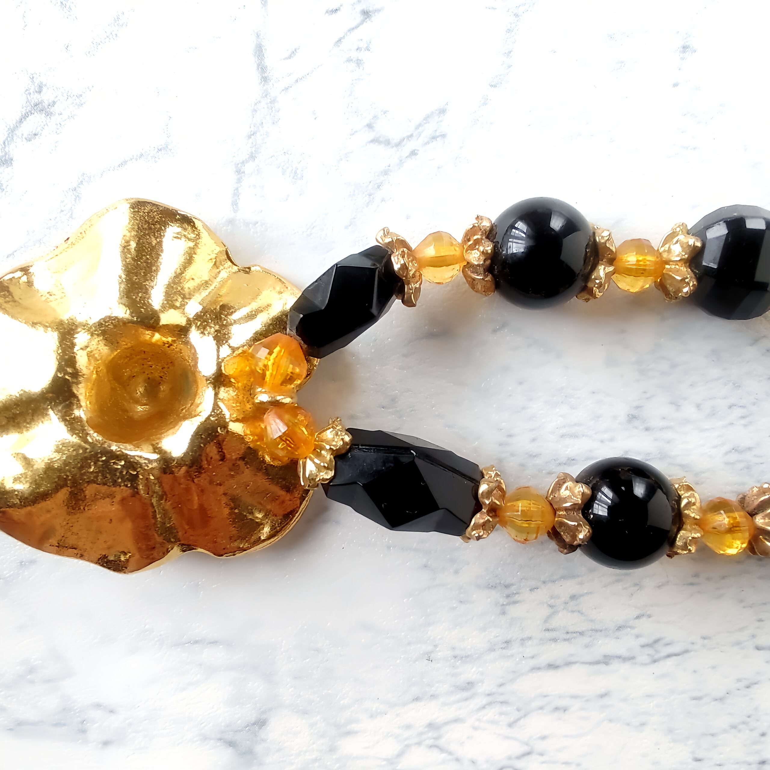 ゴールドとブラックのビーズにゴールドメタルにクリアイエローとブラックのエナメルで色付けされたフラワーがあしらわれたヴィンテージネックレスです。