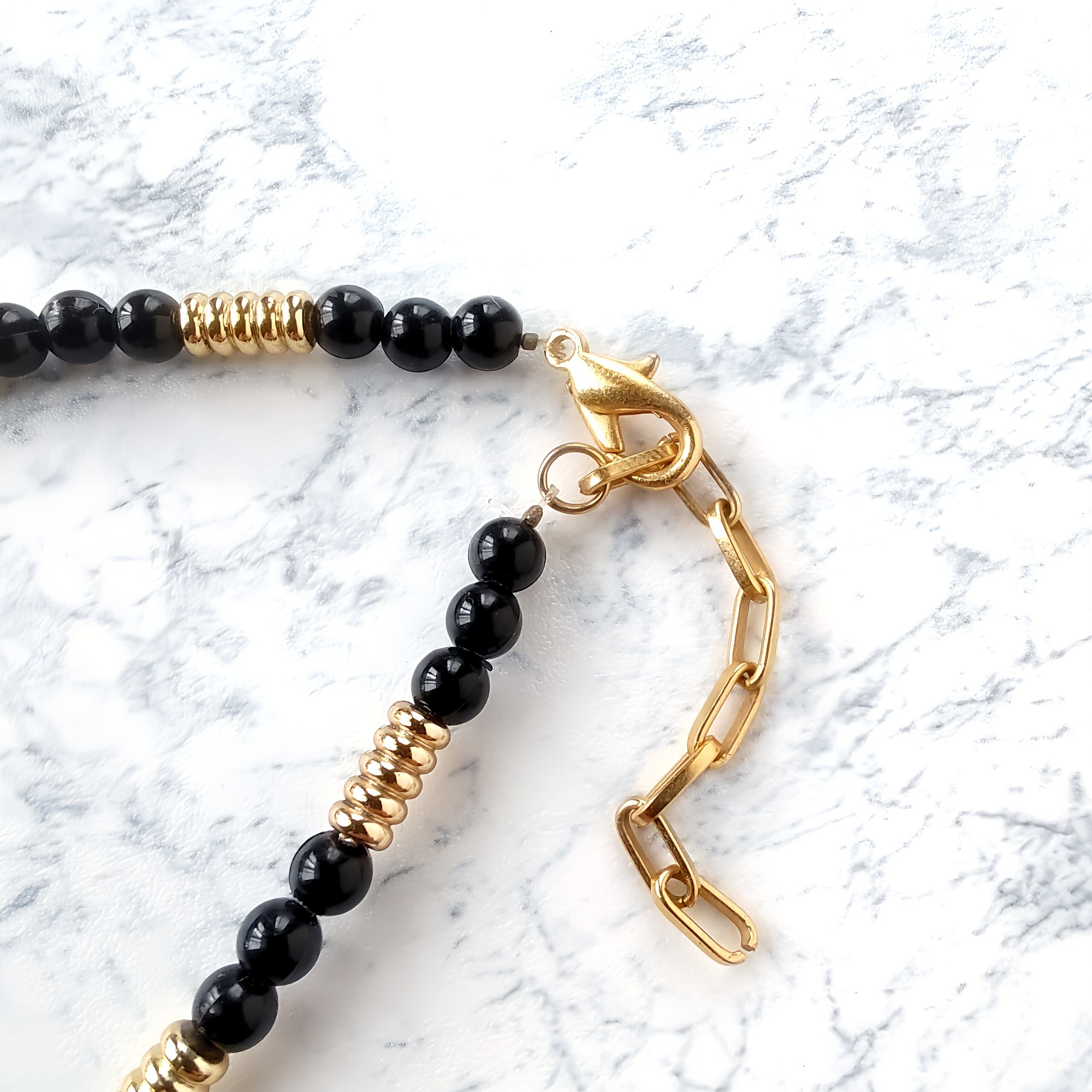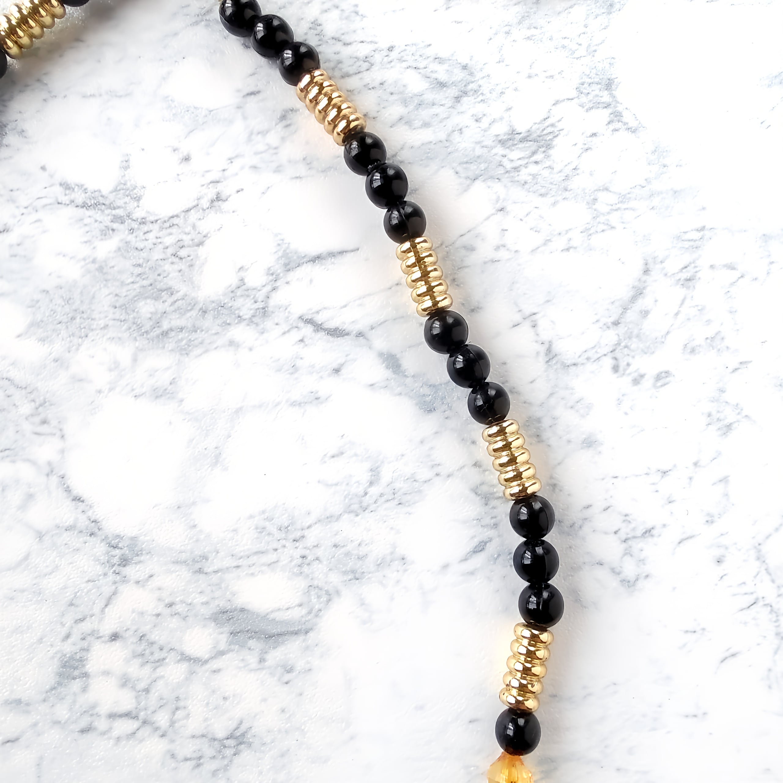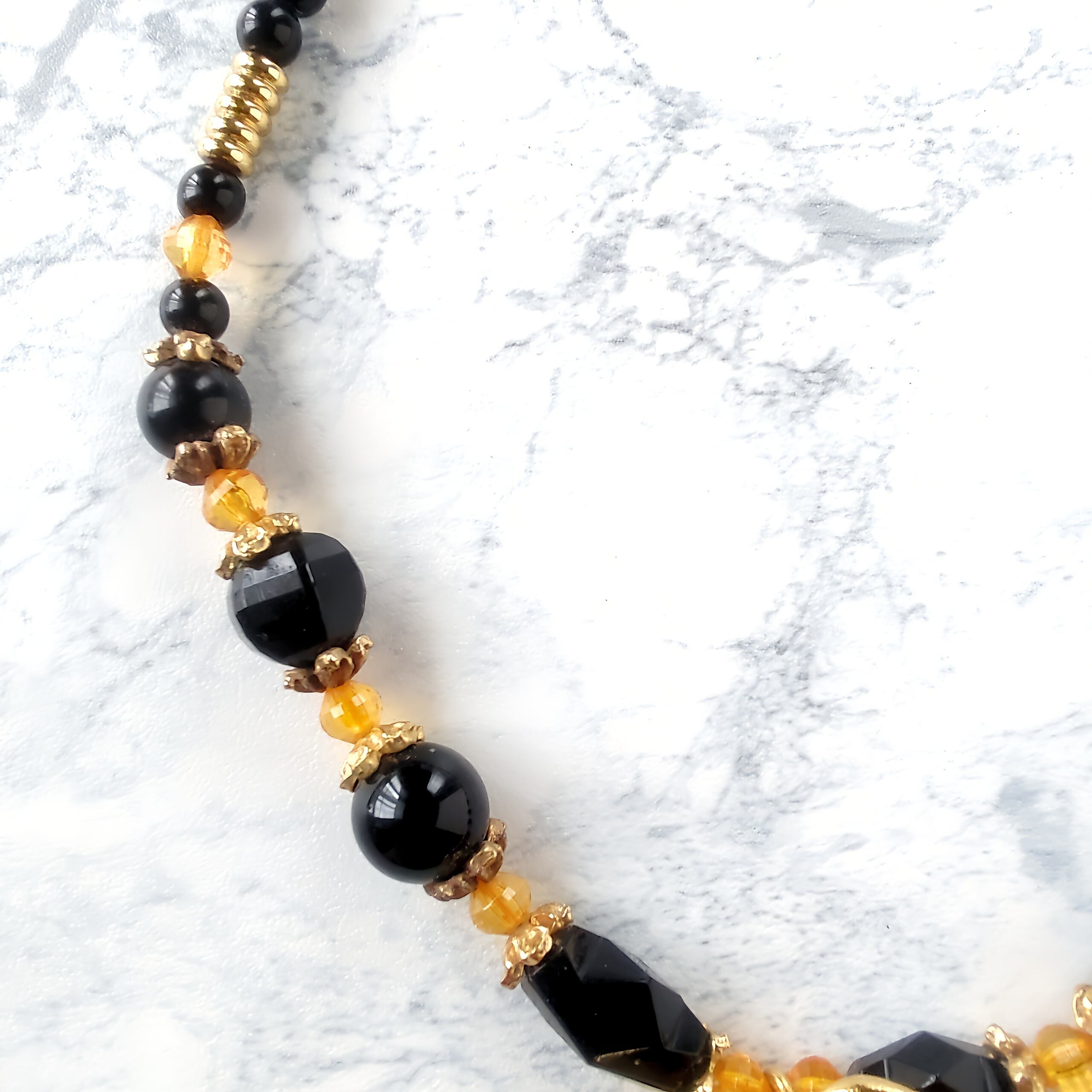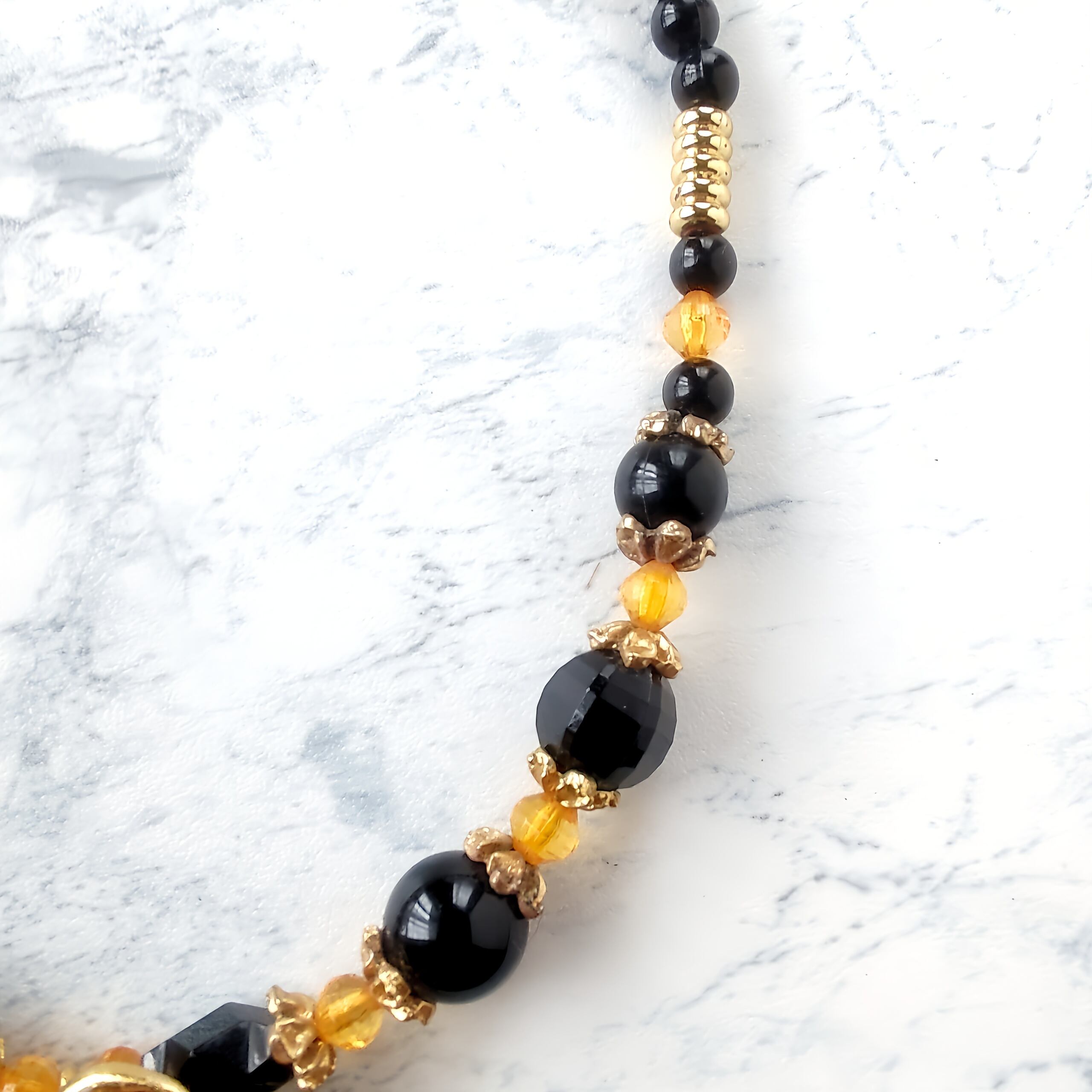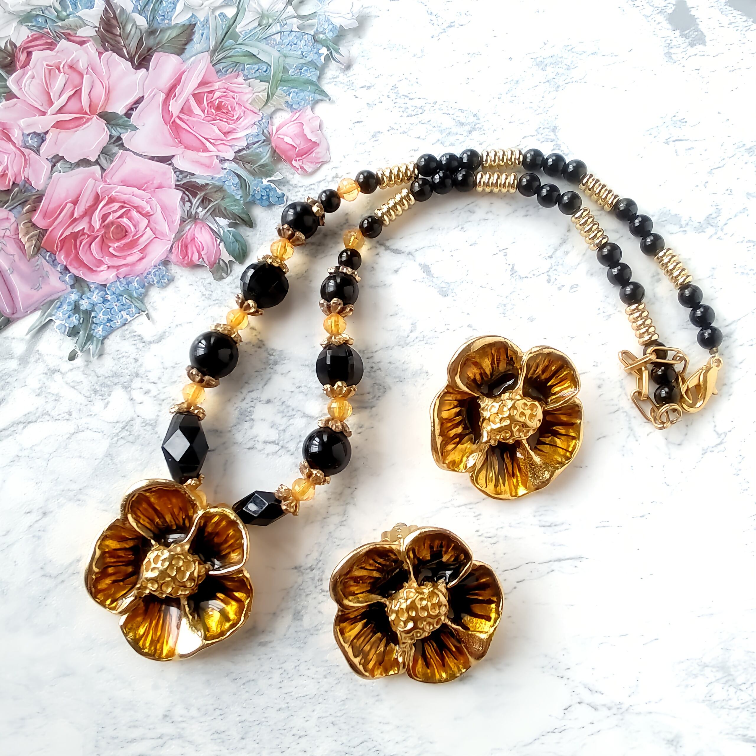 ゴールドとブラックのビーズにゴールドメタルにクリアイエローとブラックのエナメルで色付けされたフラワーがあしらわれたヴィンテージネックレスです。