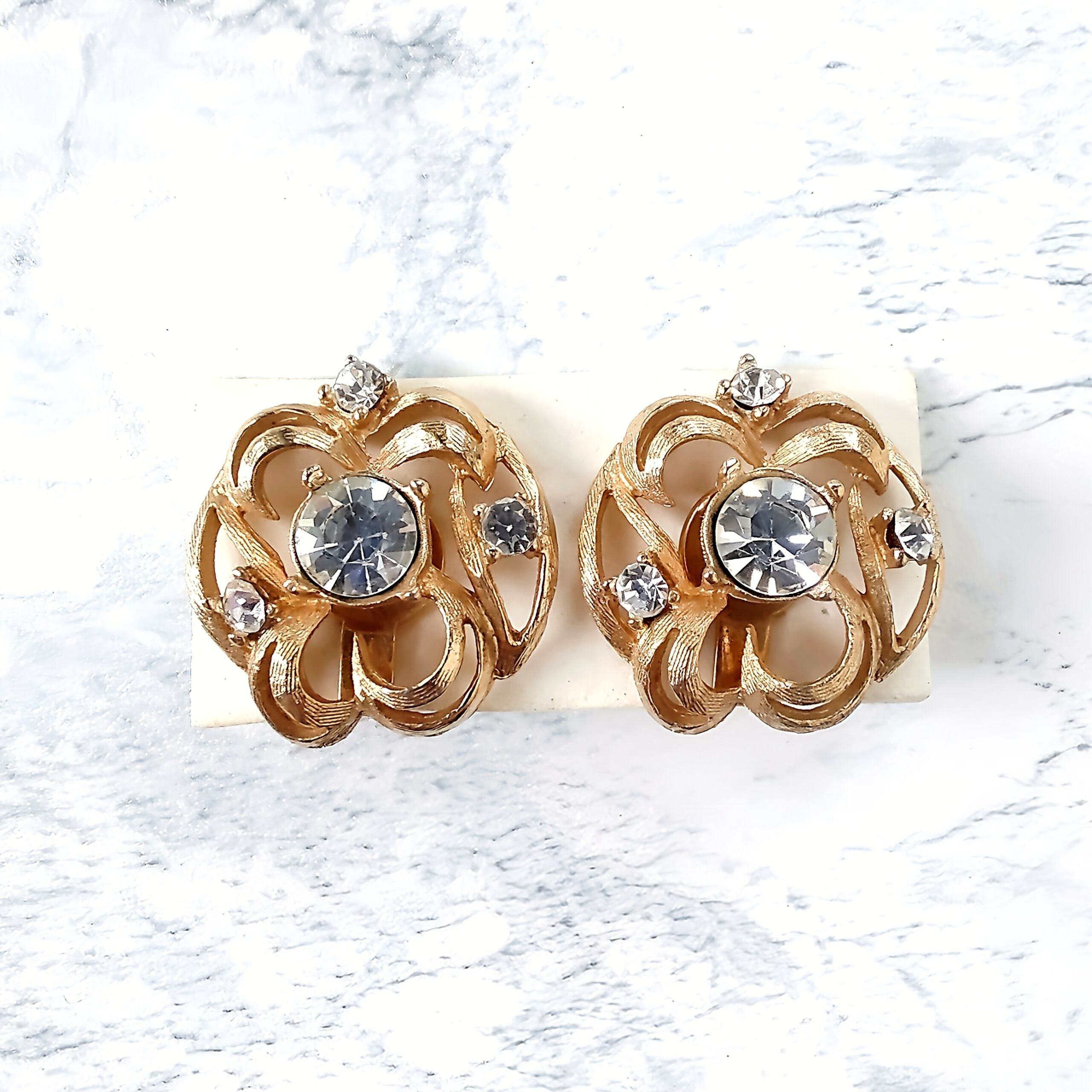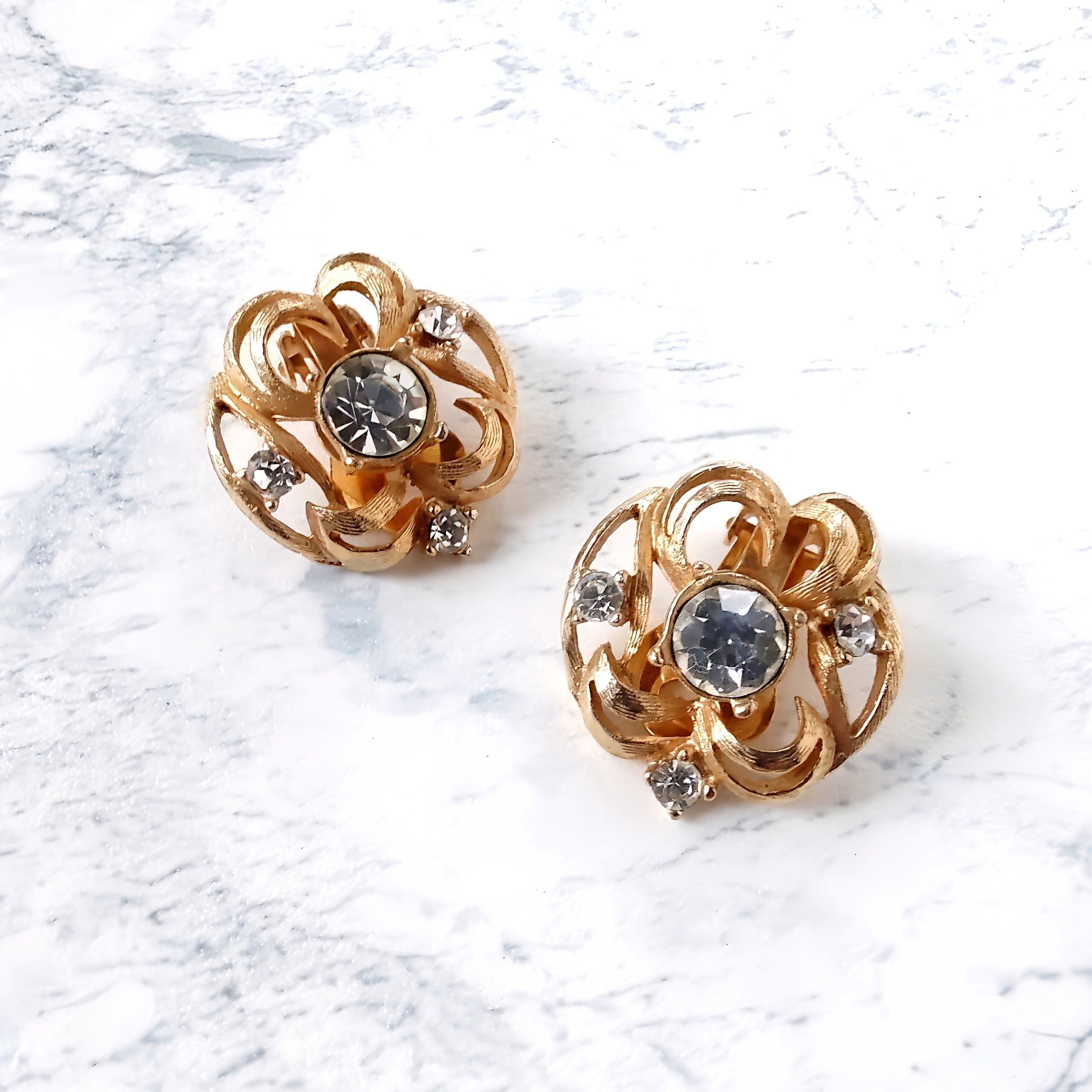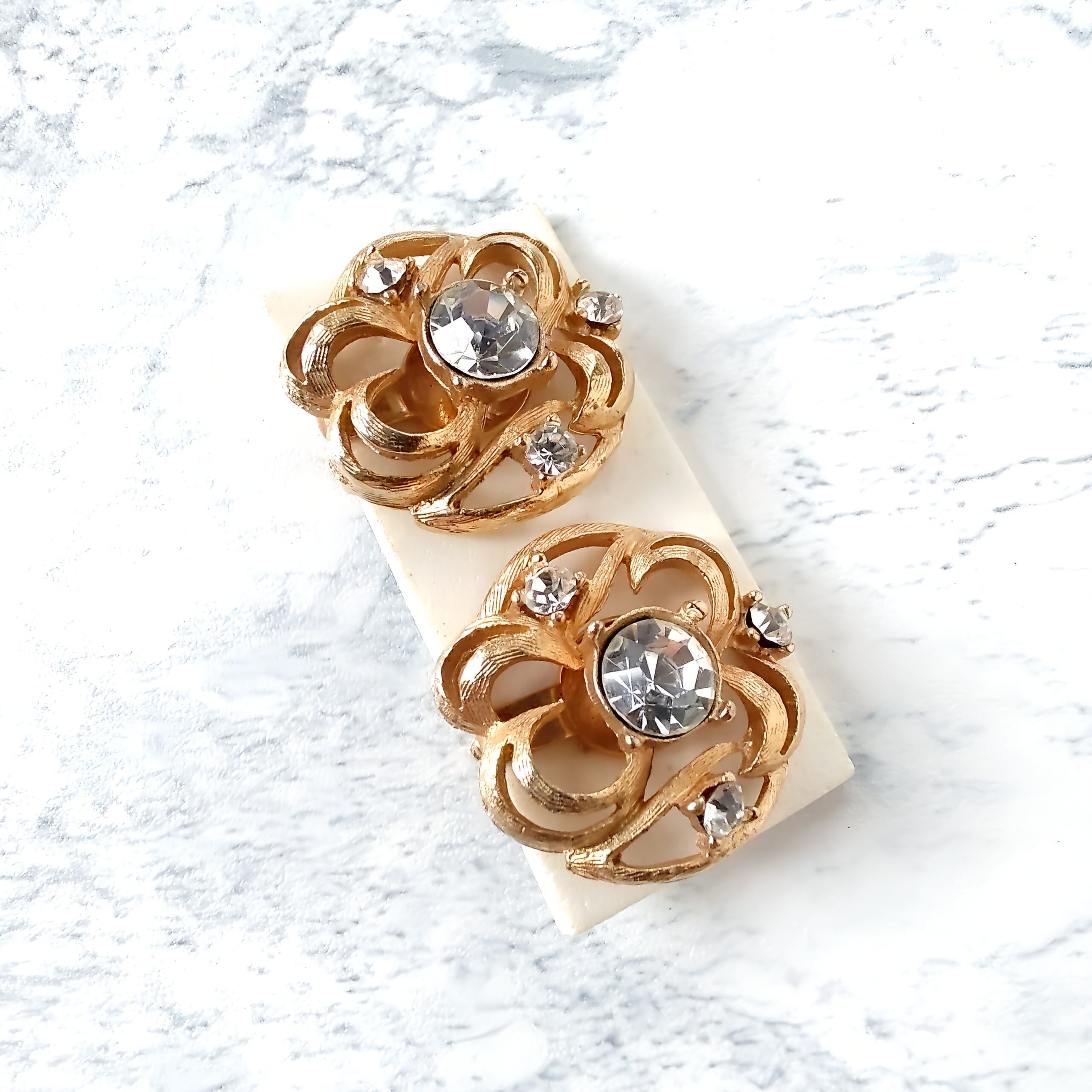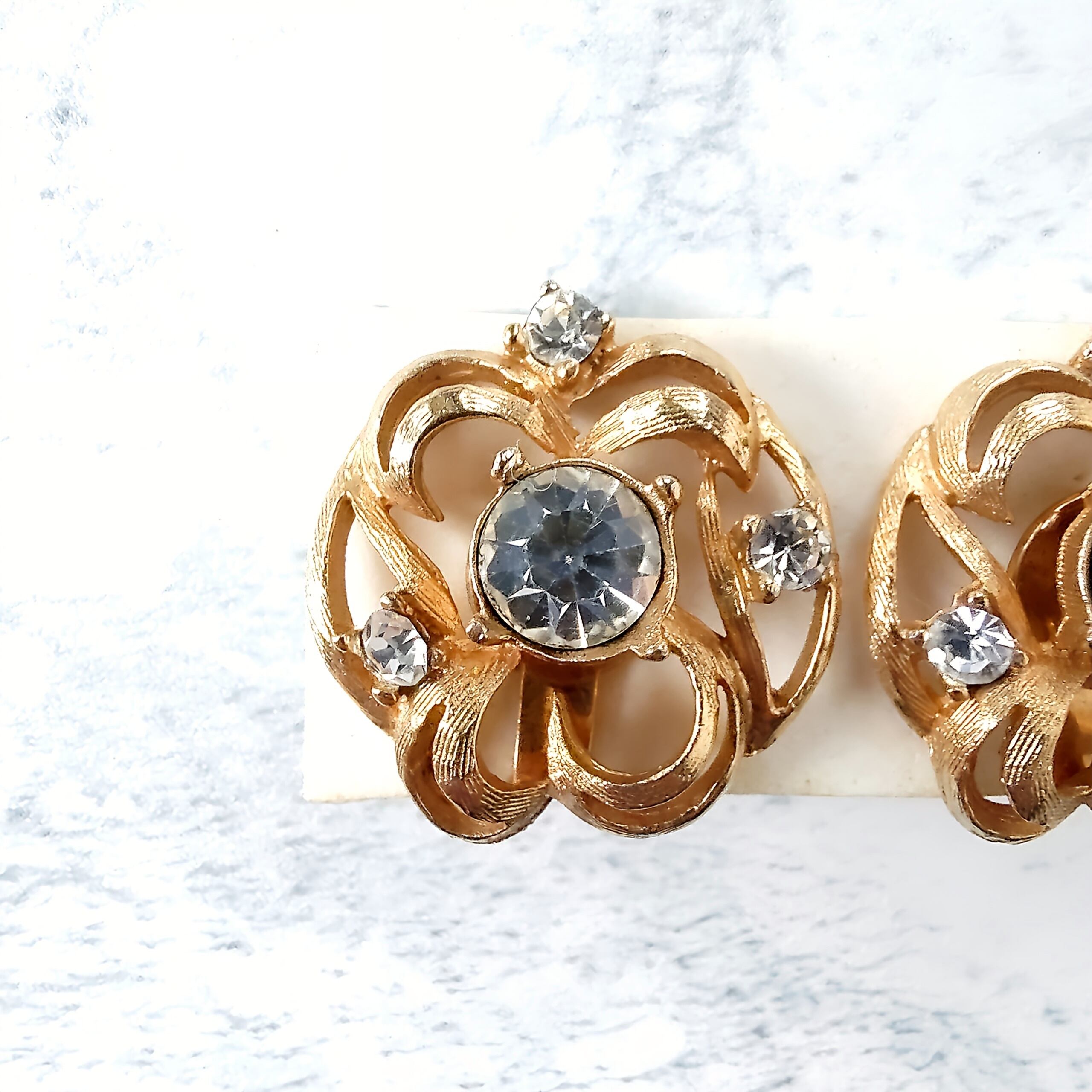 オープンワークのスワール状にデザインされたゴールドメタルのリーフにクリアラインストーンがあしらわれたヴィンテージイヤリングです。