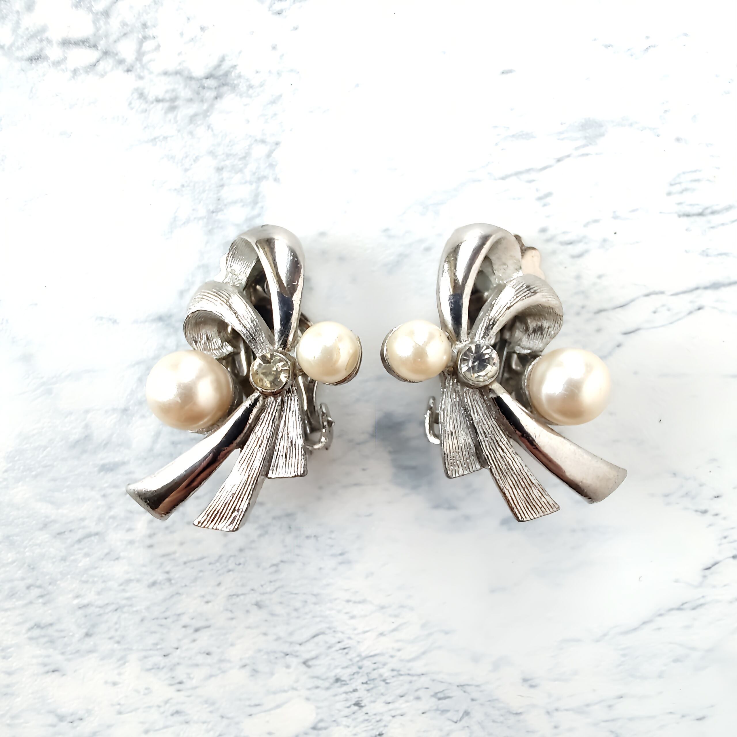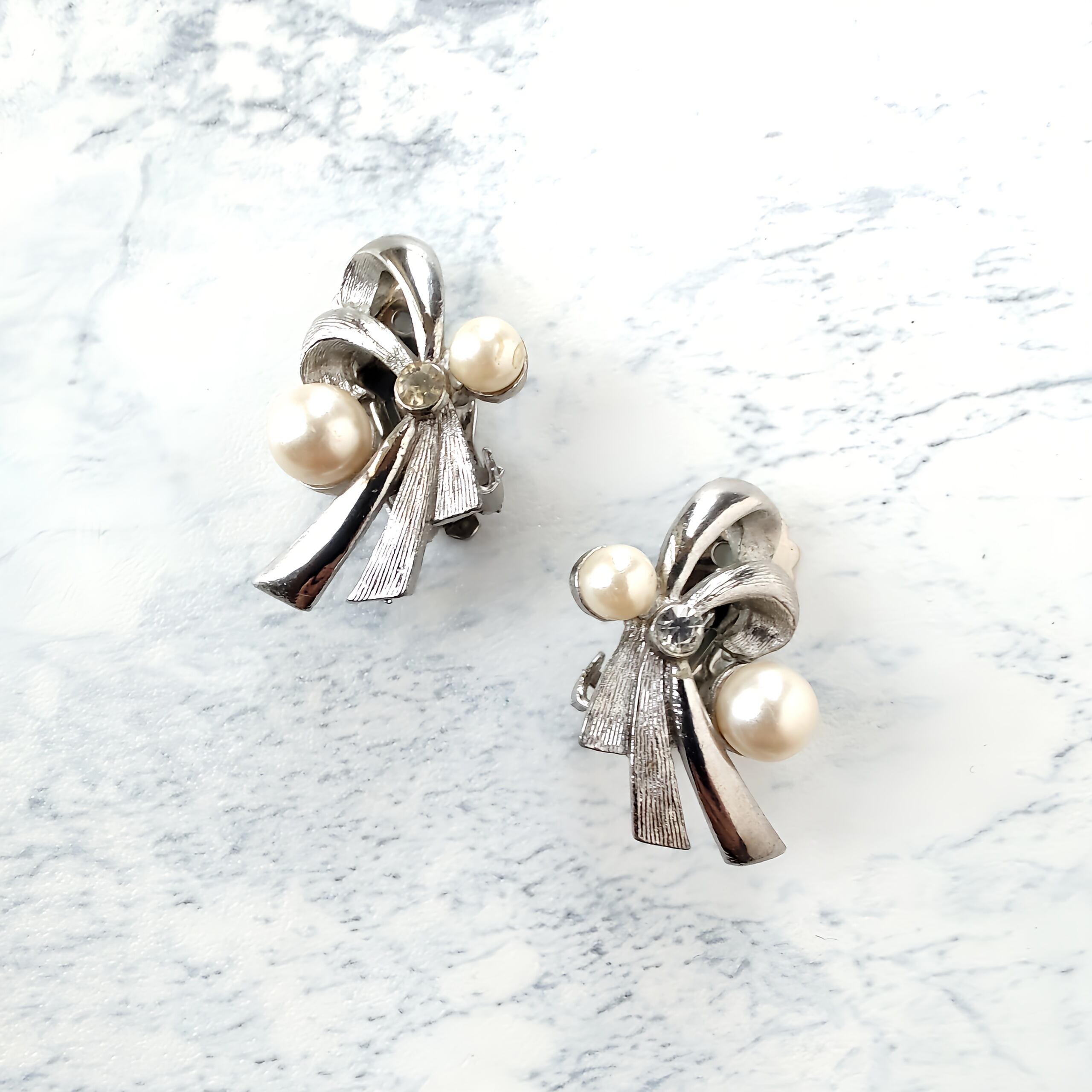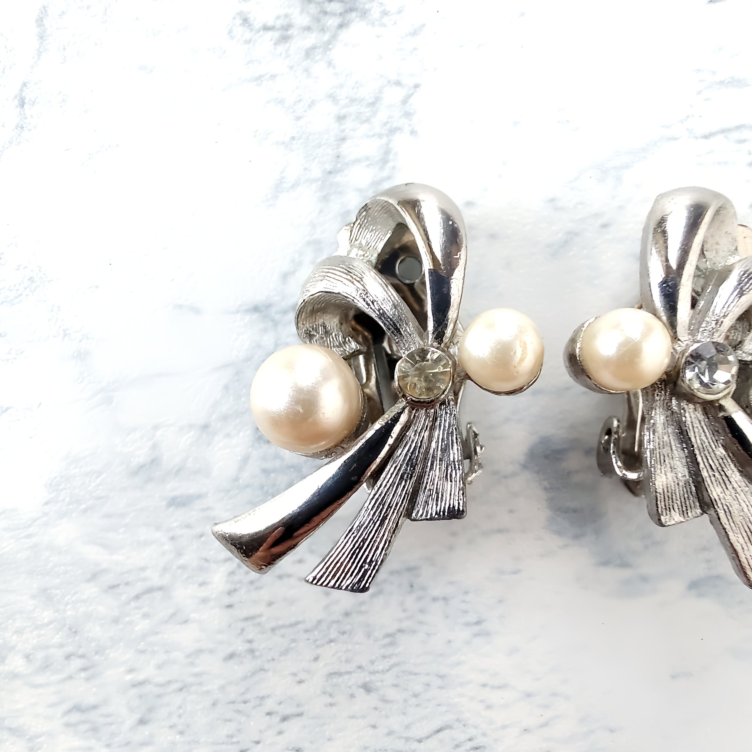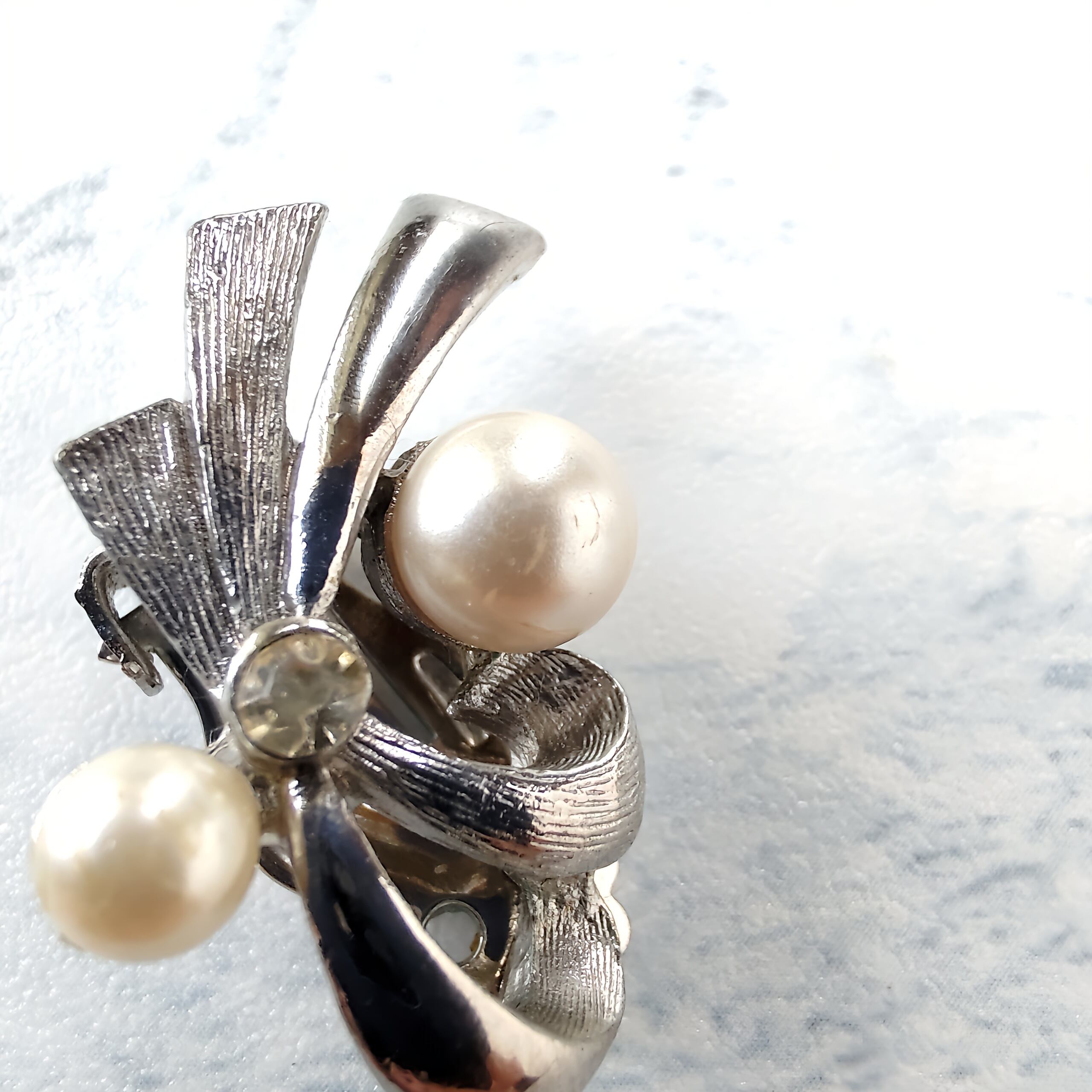 ブラッシュ加工が施されたシルバーメタルとツヤのあるシルバーメタルの流れる様にデザインされたリボンにフェイクパールとクリアラインストーンがあしらわれたヴィンテージイヤリングです。
