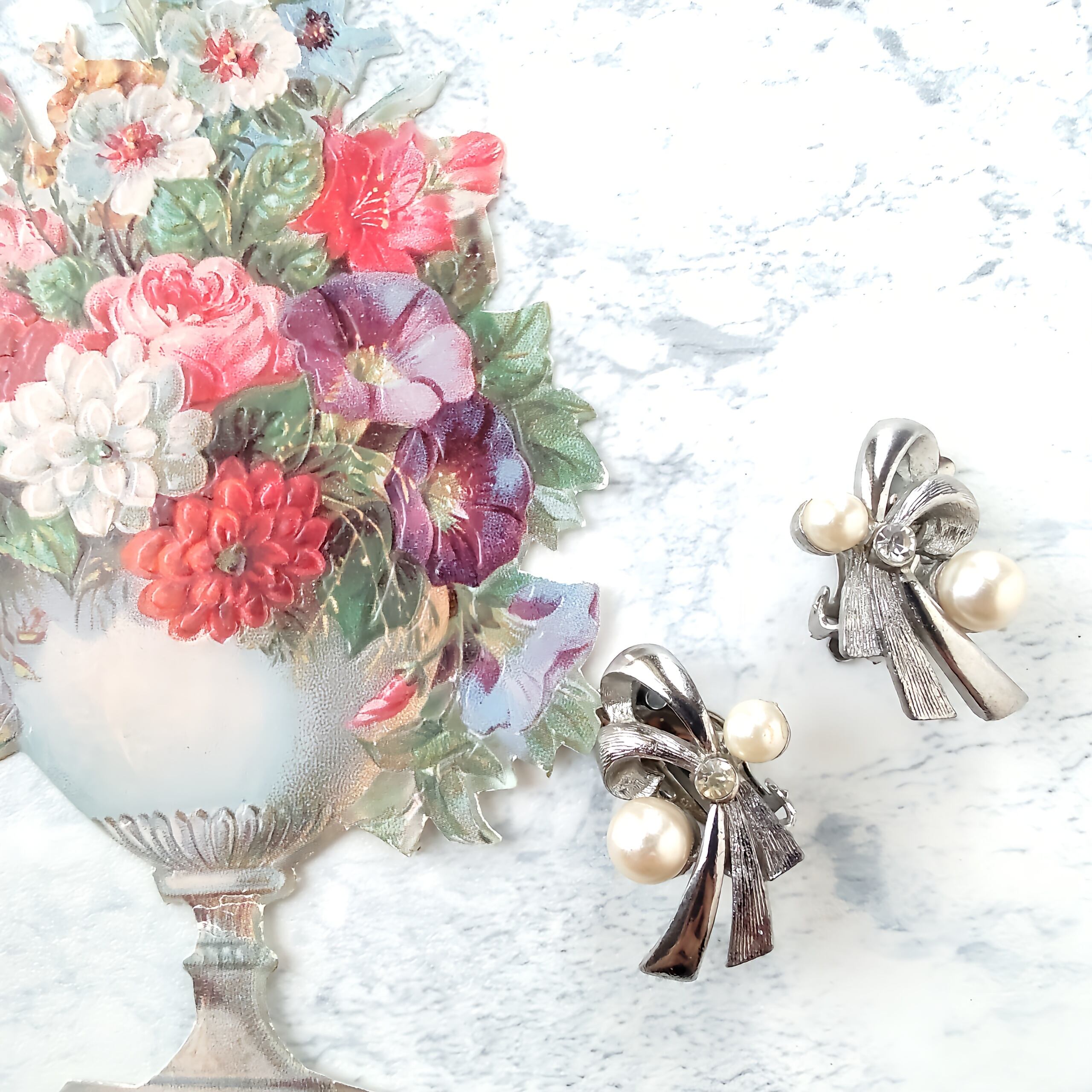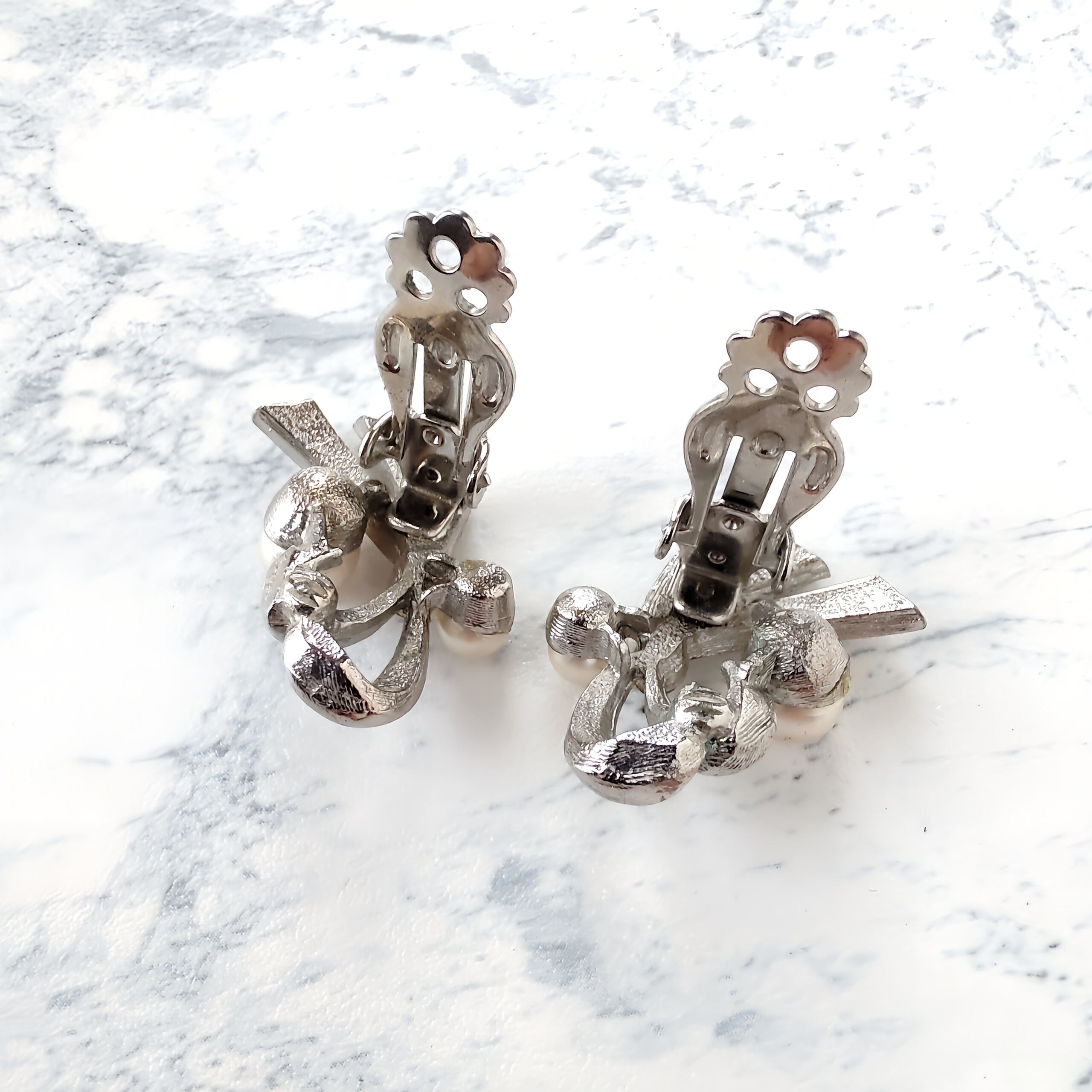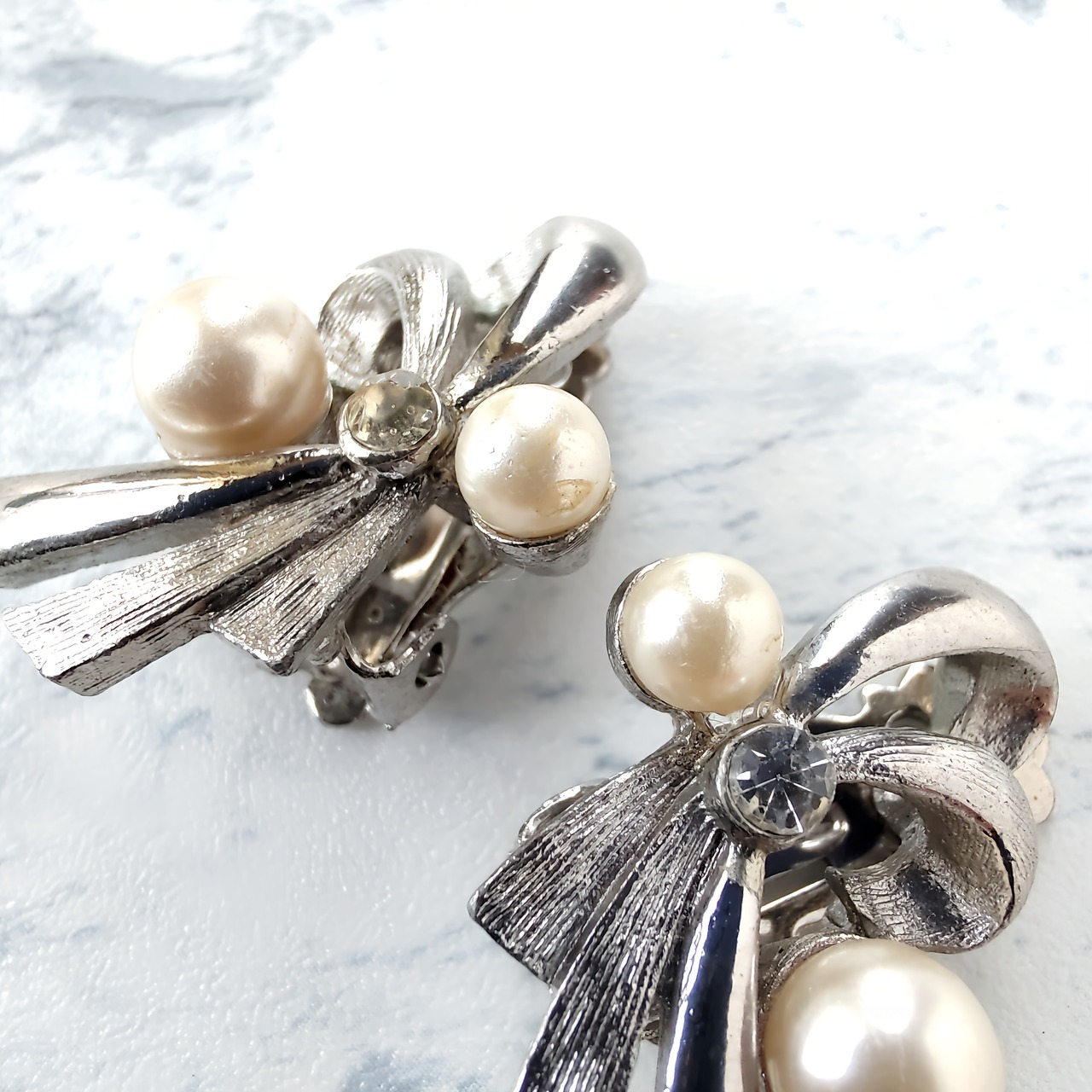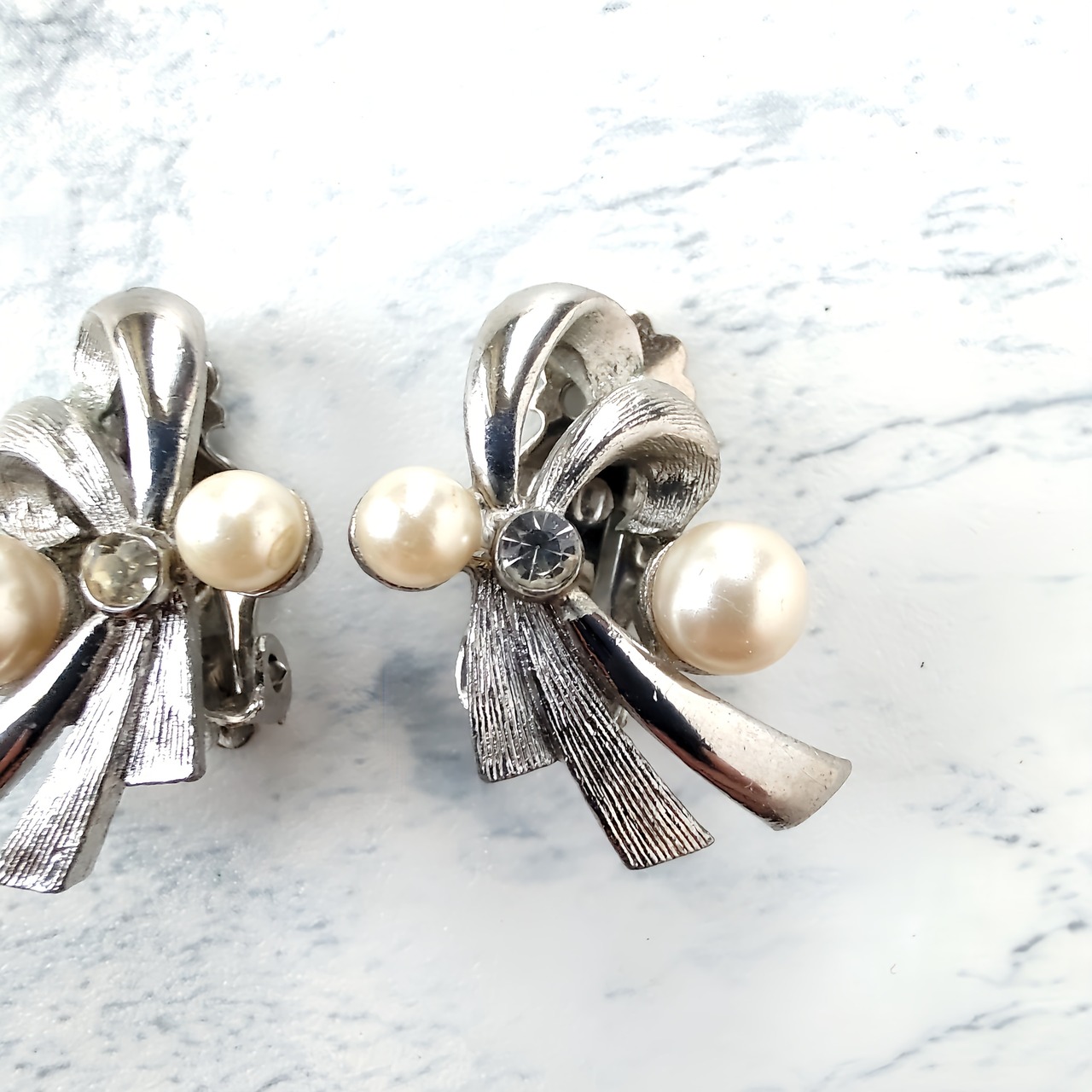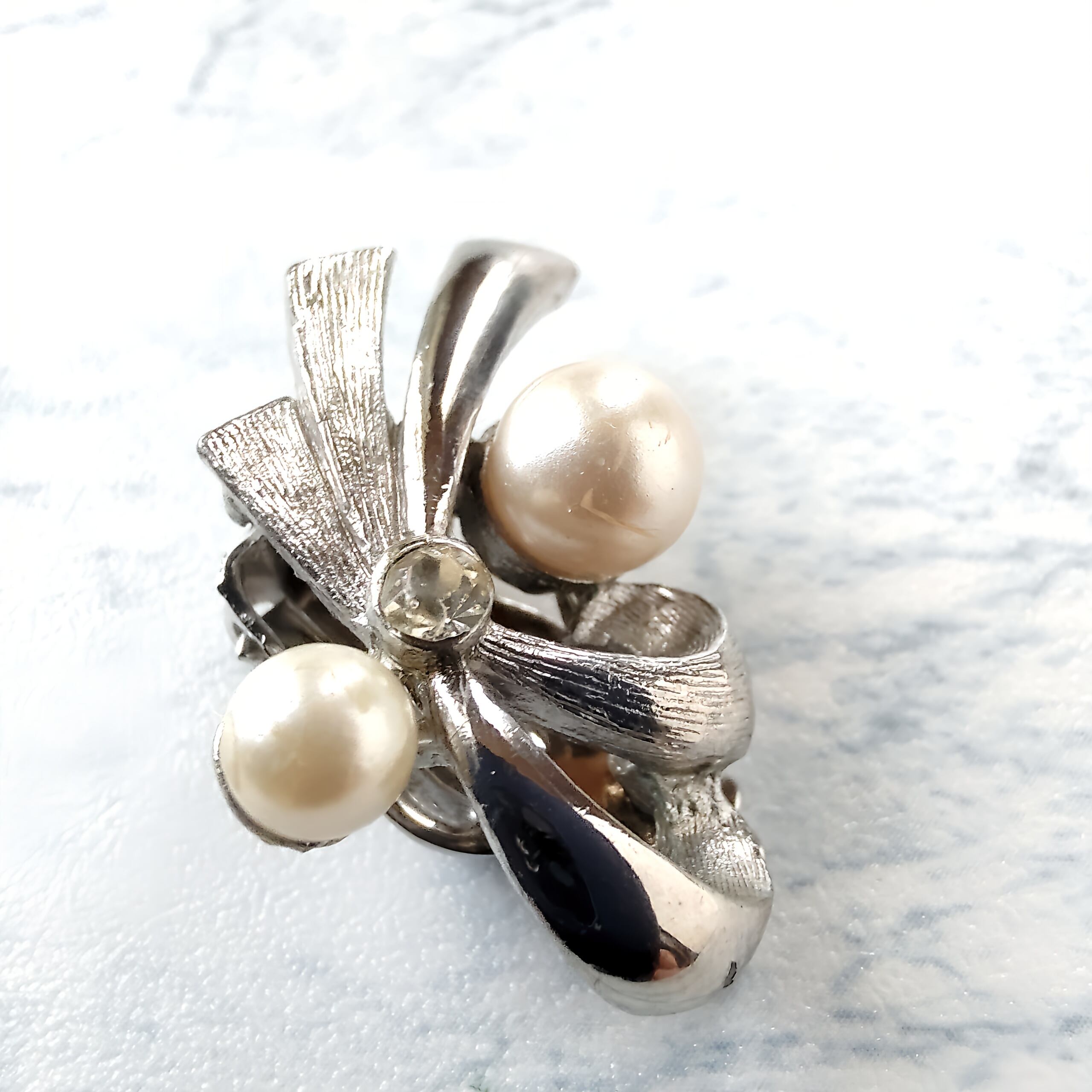 ブラッシュ加工が施されたシルバーメタルとツヤのあるシルバーメタルの流れる様にデザインされたリボンにフェイクパールとクリアラインストーンがあしらわれたヴィンテージイヤリングです。