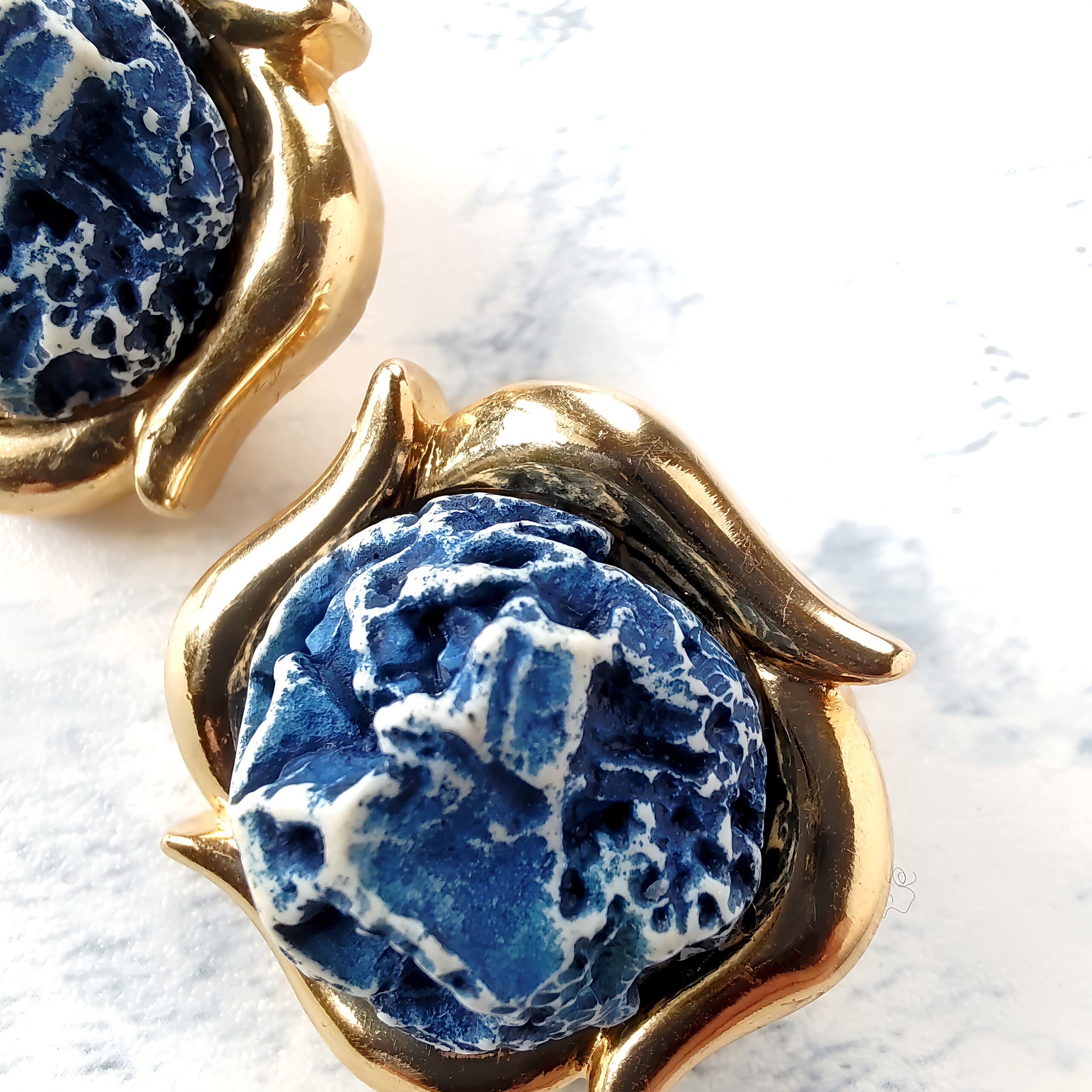 1970年代後半にスペインのバルセロナにて設立されたLERITZ(レリッツ)のスクエア型に流れるようにデザインされたゴールドメタルに、ホワイトにブルーで斑に色付けされたゴツゴツとした重量感のあるプラスチックのフェイクストーンがあしらわれたヴィンテージイヤリングです。